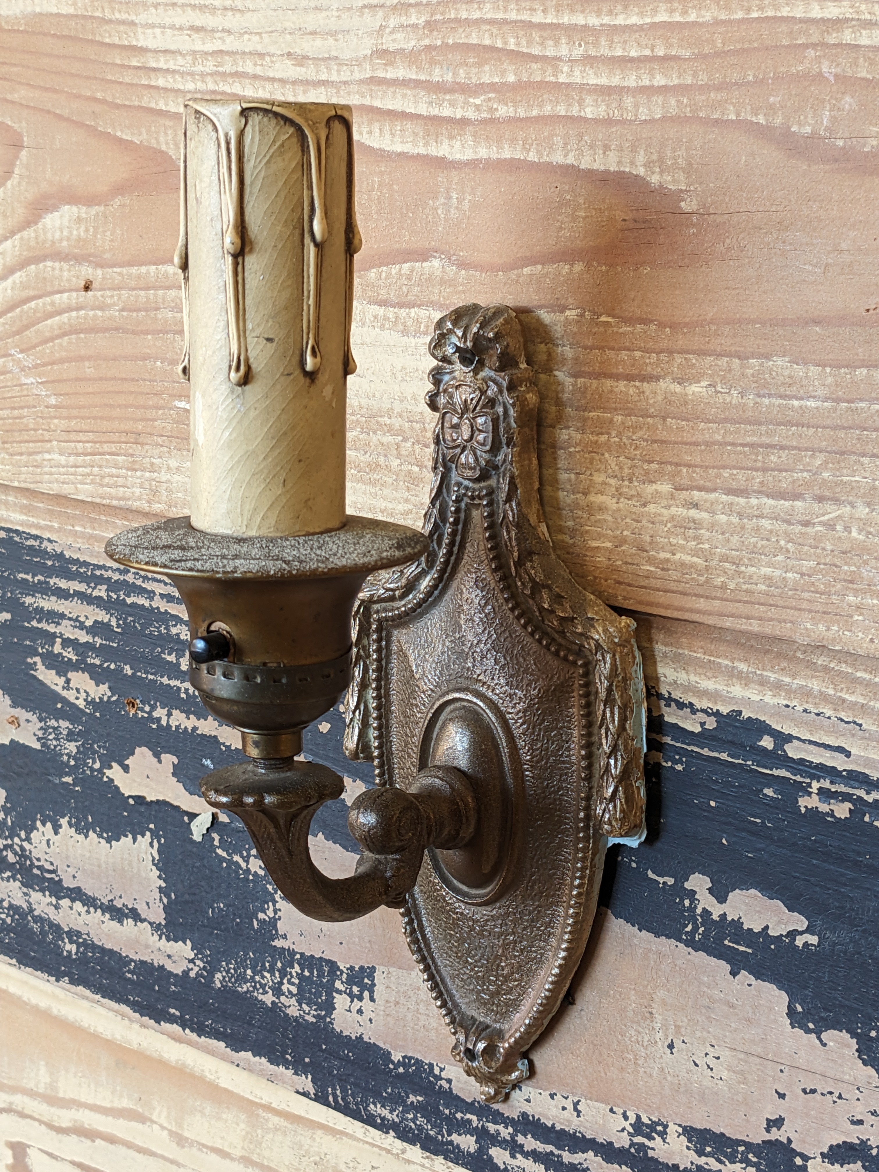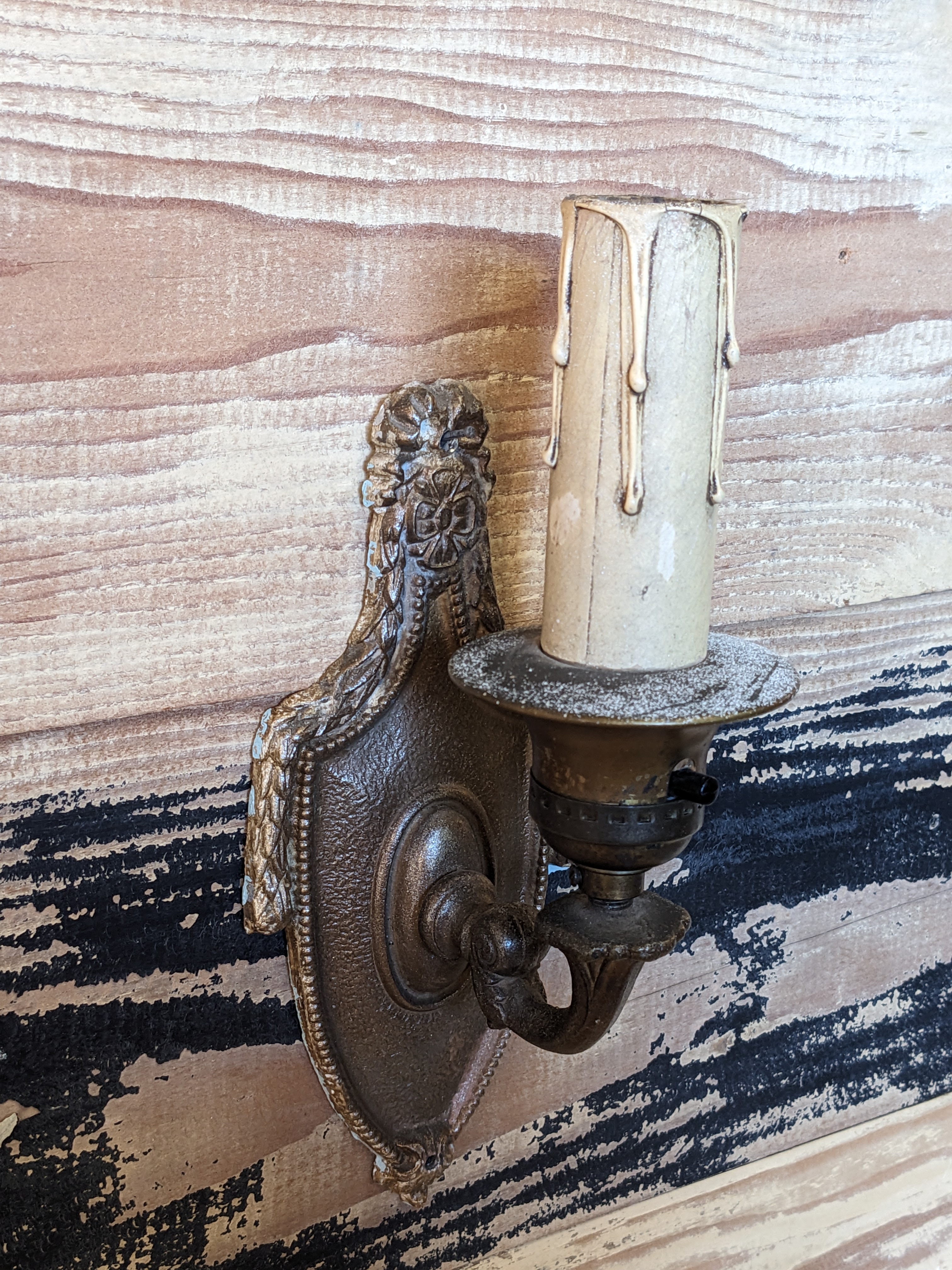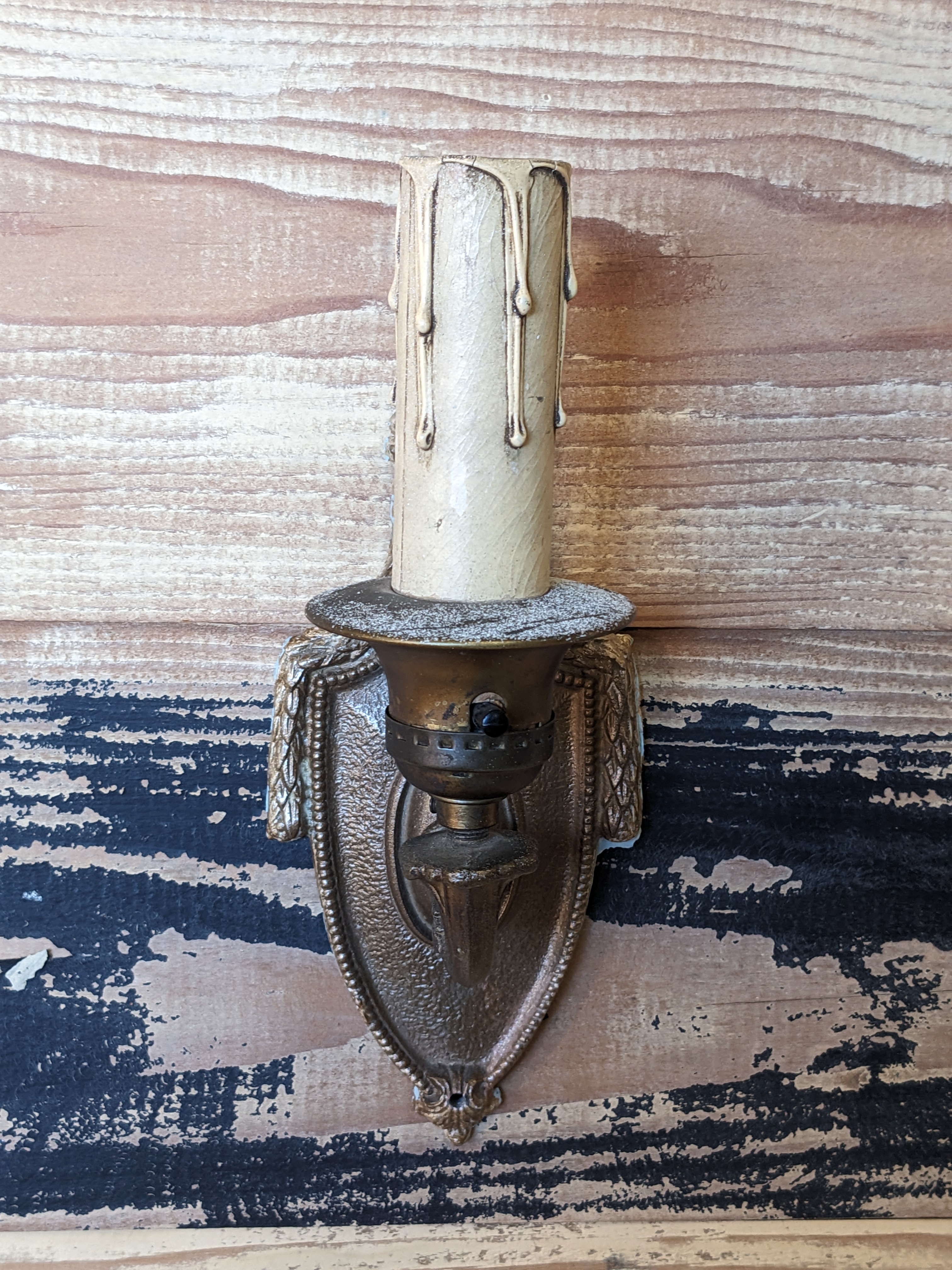 Illuminate your walls with style! This wall sconce has a lovely patina. There's some old paint on the edges and some over spray that adds an aged look but could also been cleaned up. It appears to have the original or very old rewiring done to it.