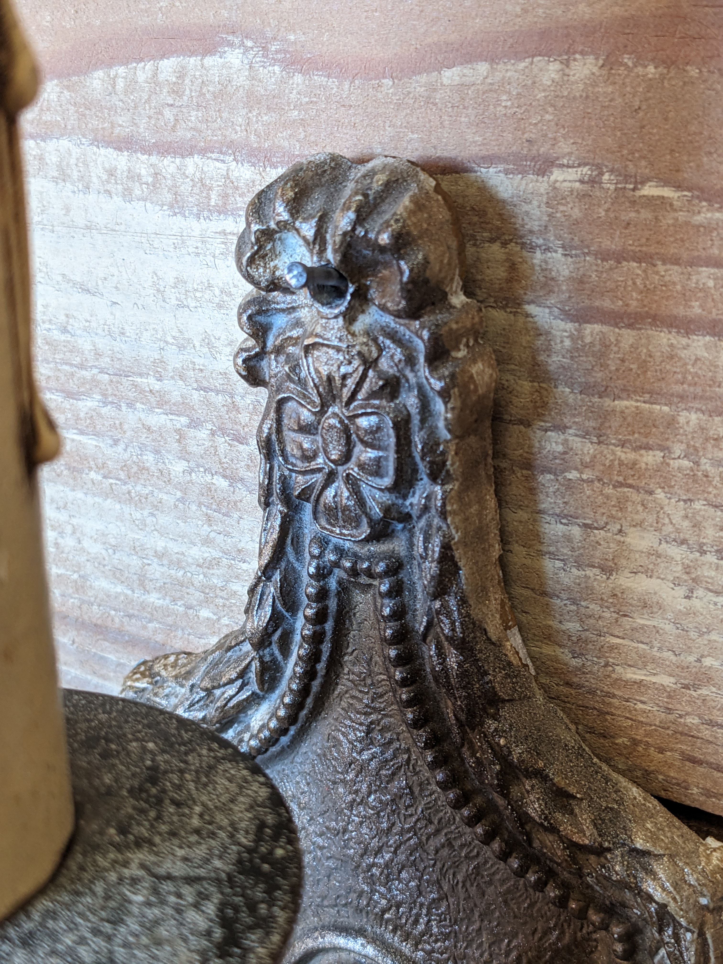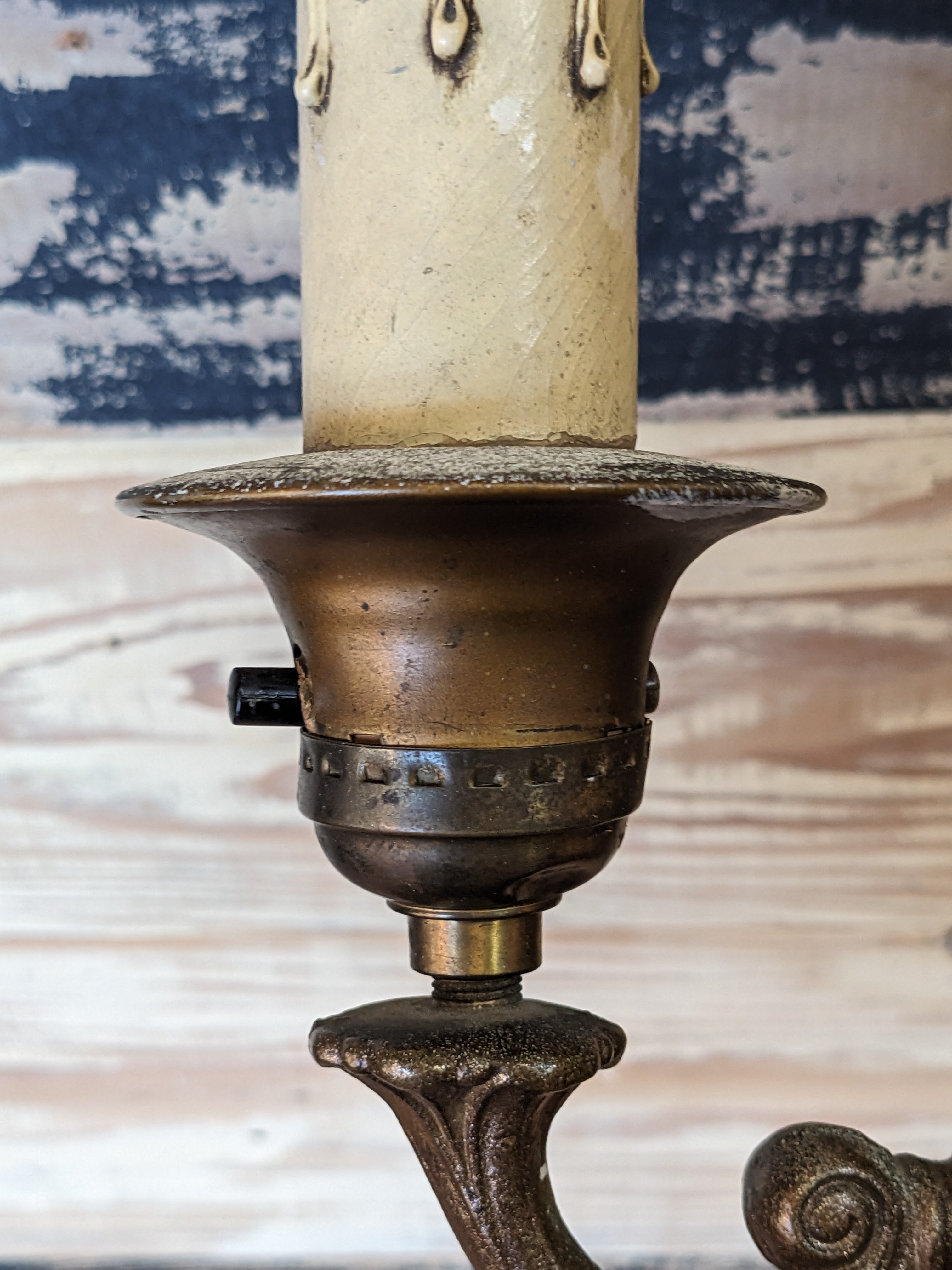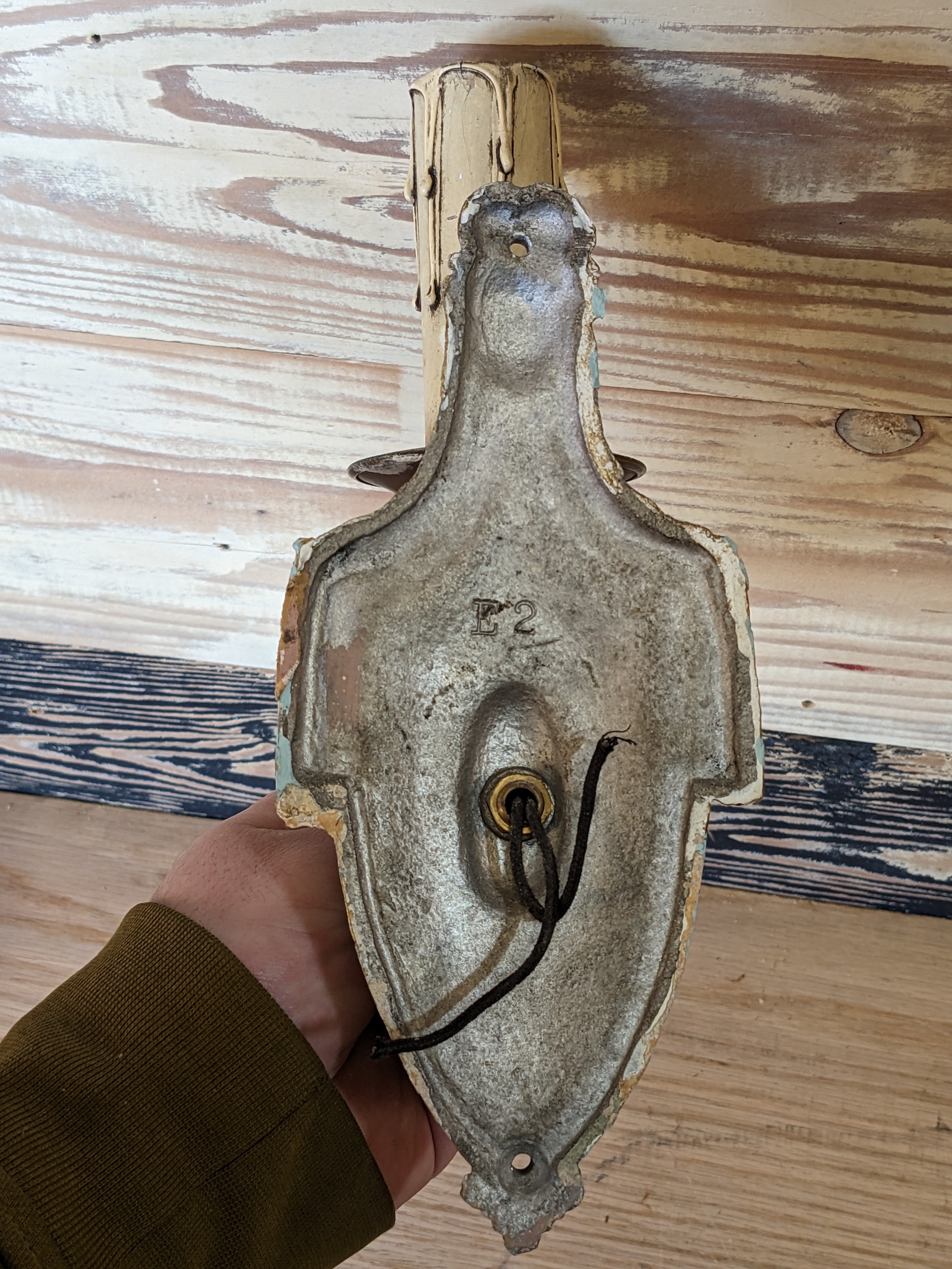 Illuminate your walls with style! This wall sconce has a lovely patina. There's some old paint on the edges and some over spray that adds an aged look but could also been cleaned up. It appears to have the original or very old rewiring done to it.
