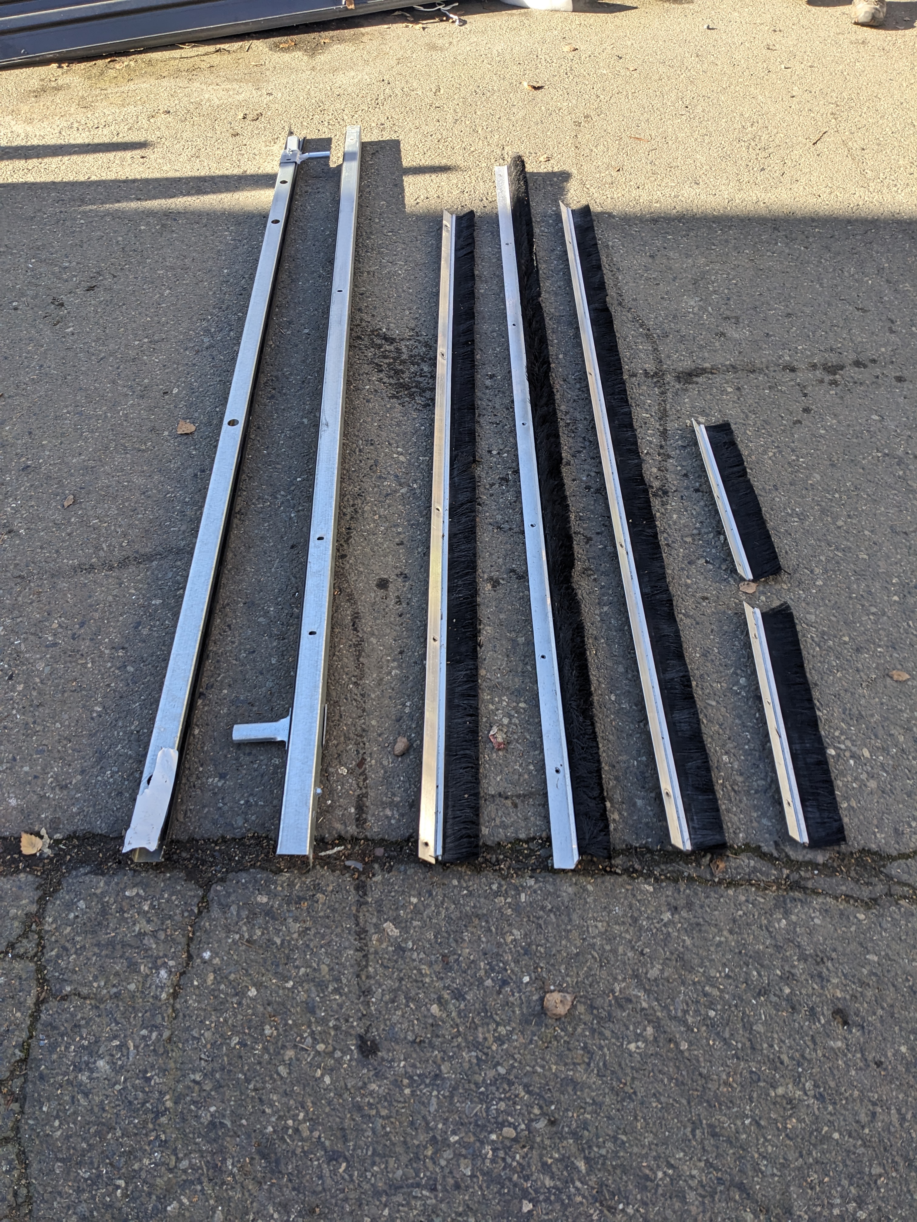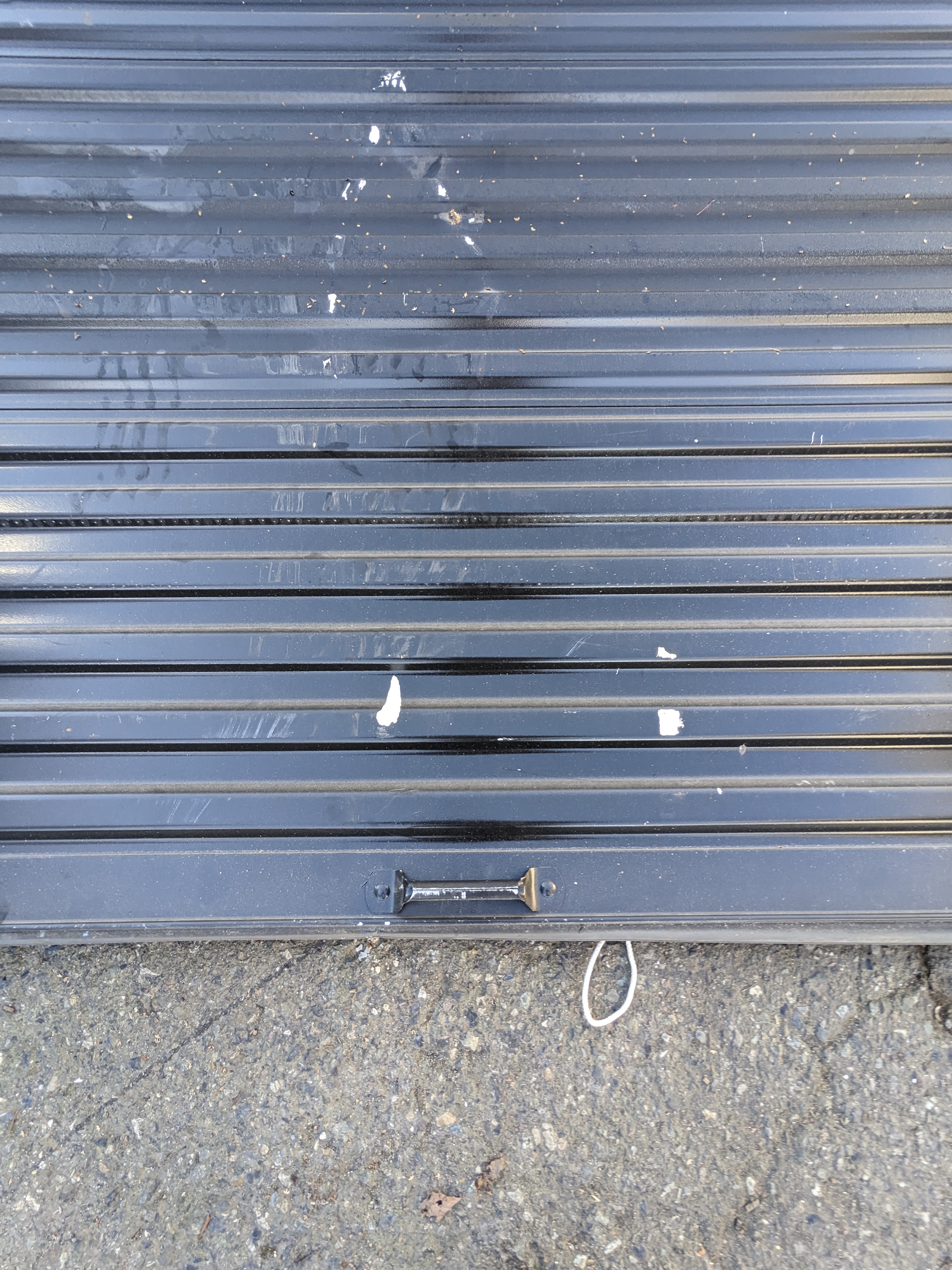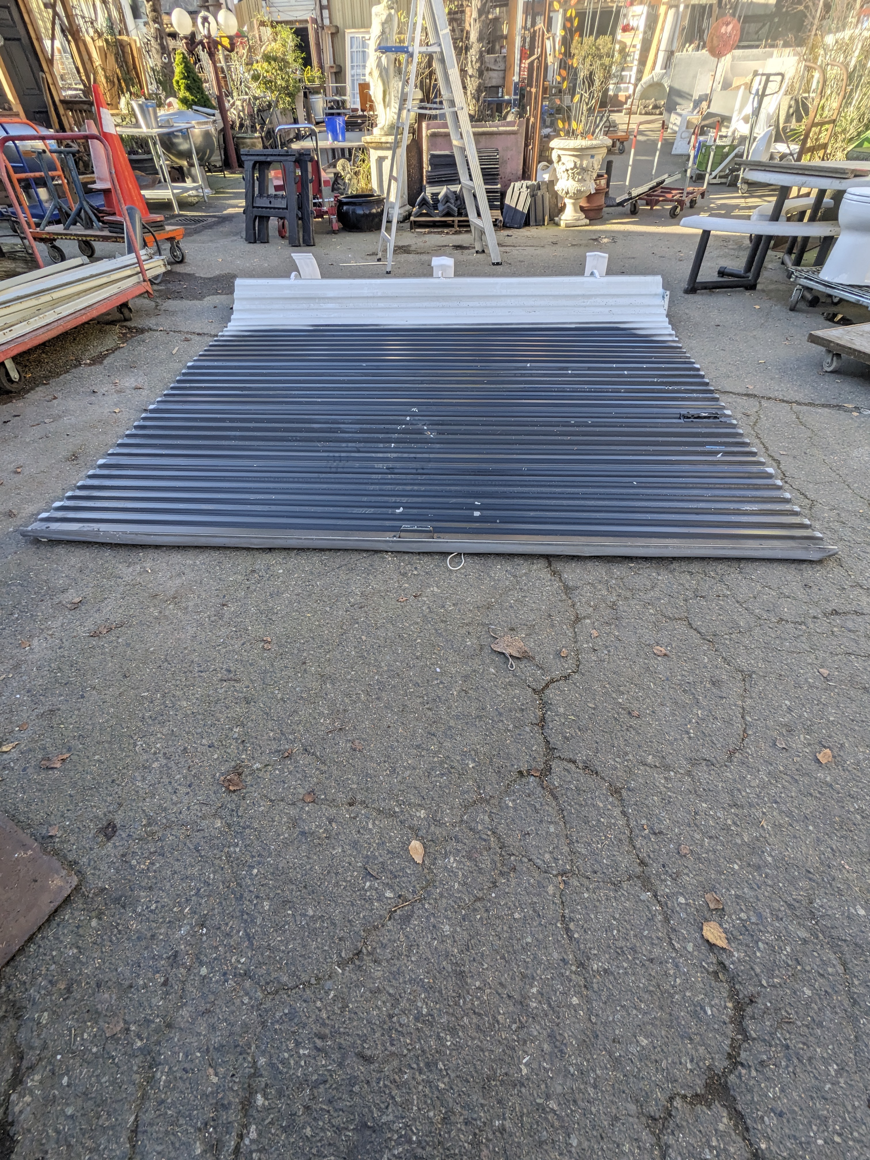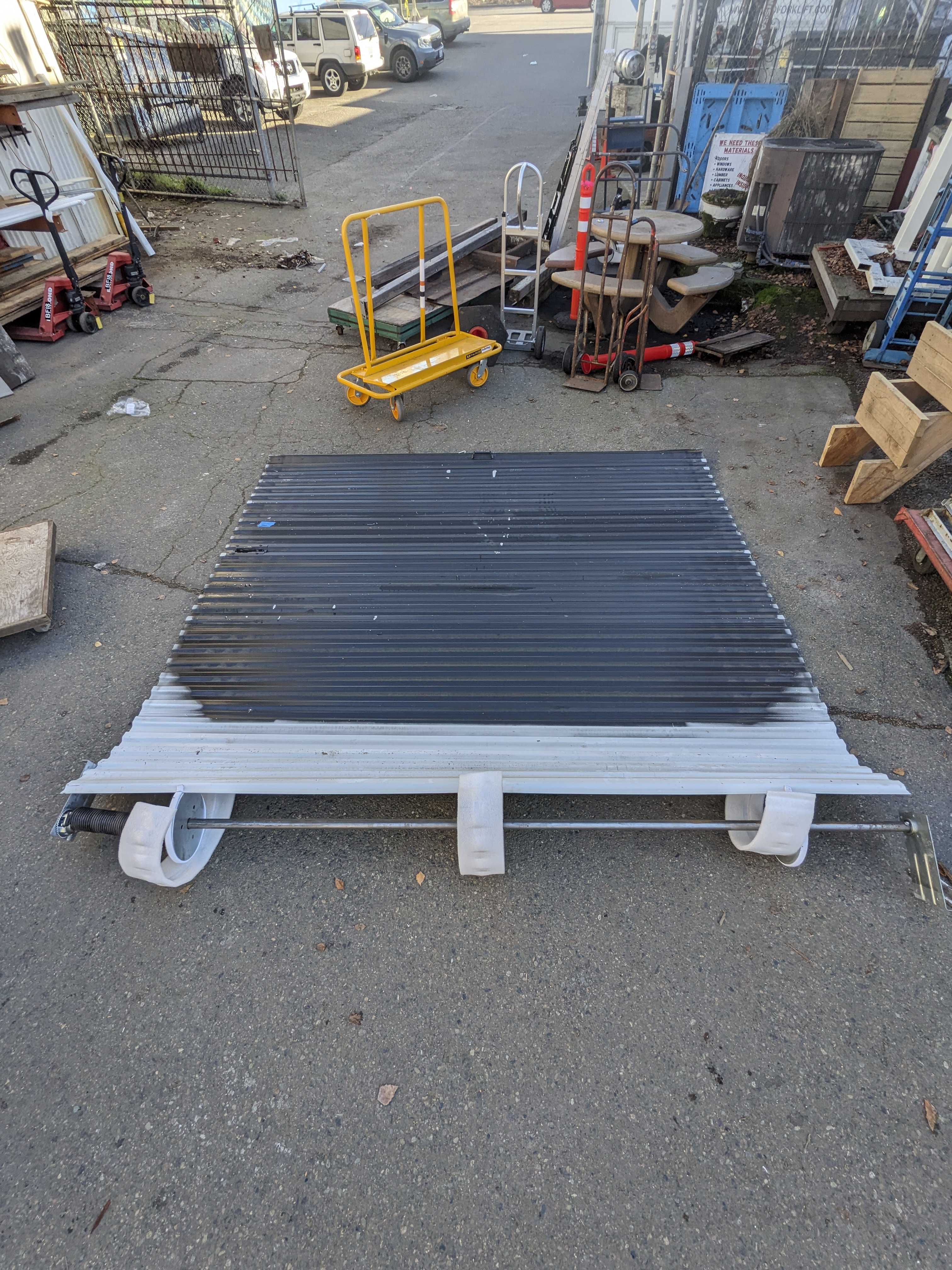 Garage door that rolls up, in good condition, has all the parts. It's partially painted black on the facade of the door. Could use a repaint or as is for a garage or work space.