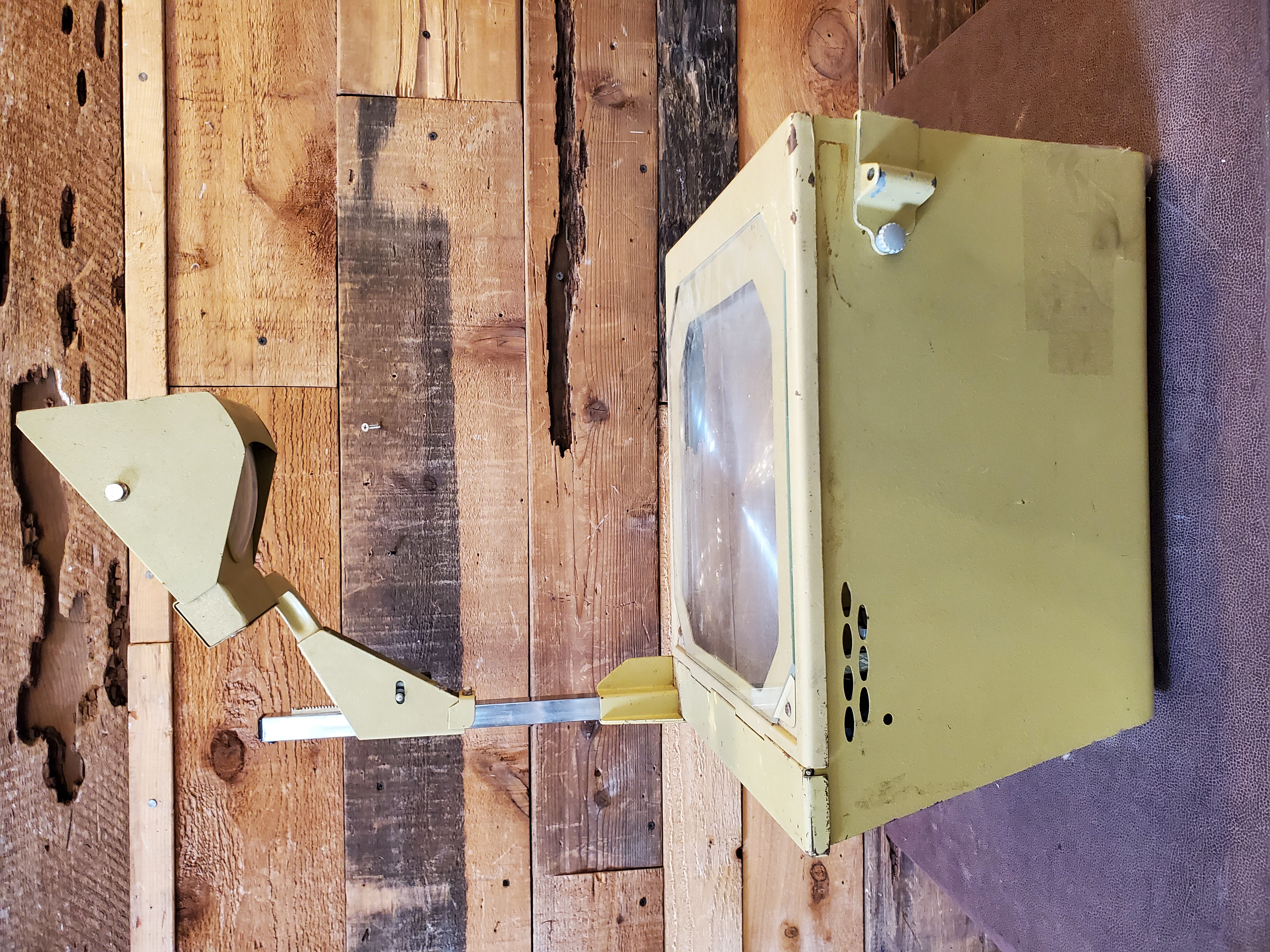 This vintage Buhl overhead projector is in great condition. It is functioning and waiting for a classroom that needs a break from all the new tech. Whether for nostalgia or actual use this projector is the one for you. The fan inside is easily replaceable but still works.