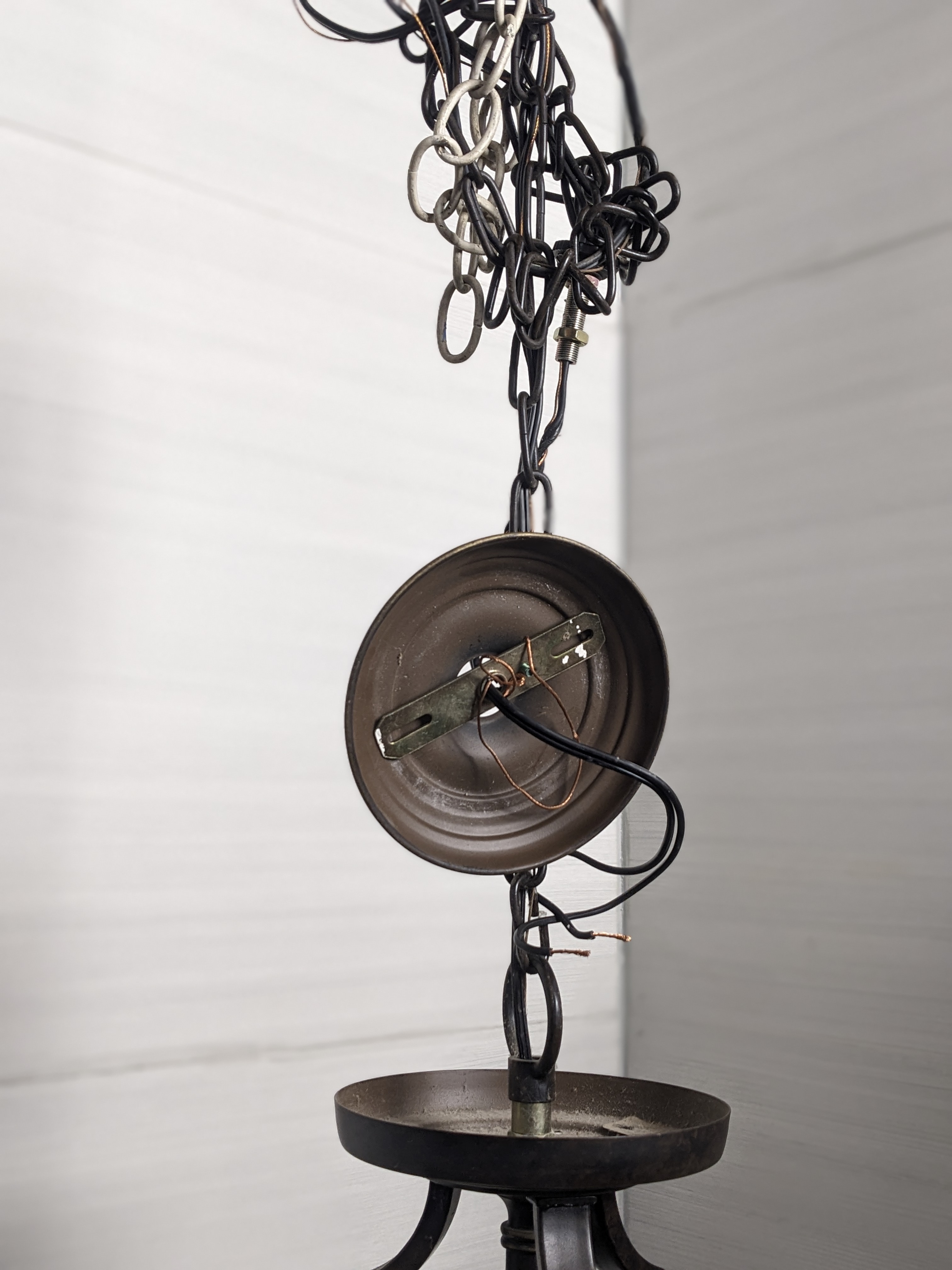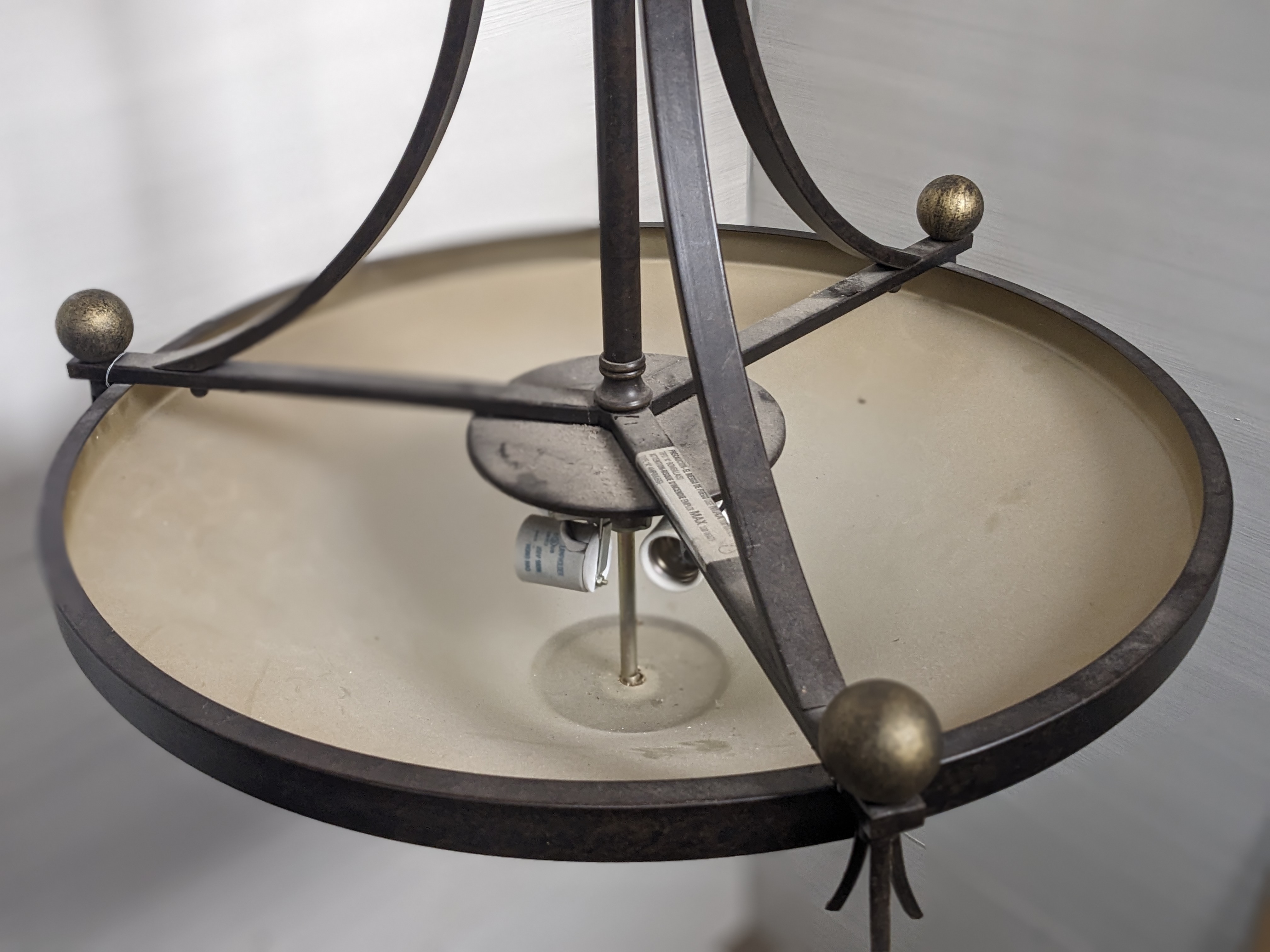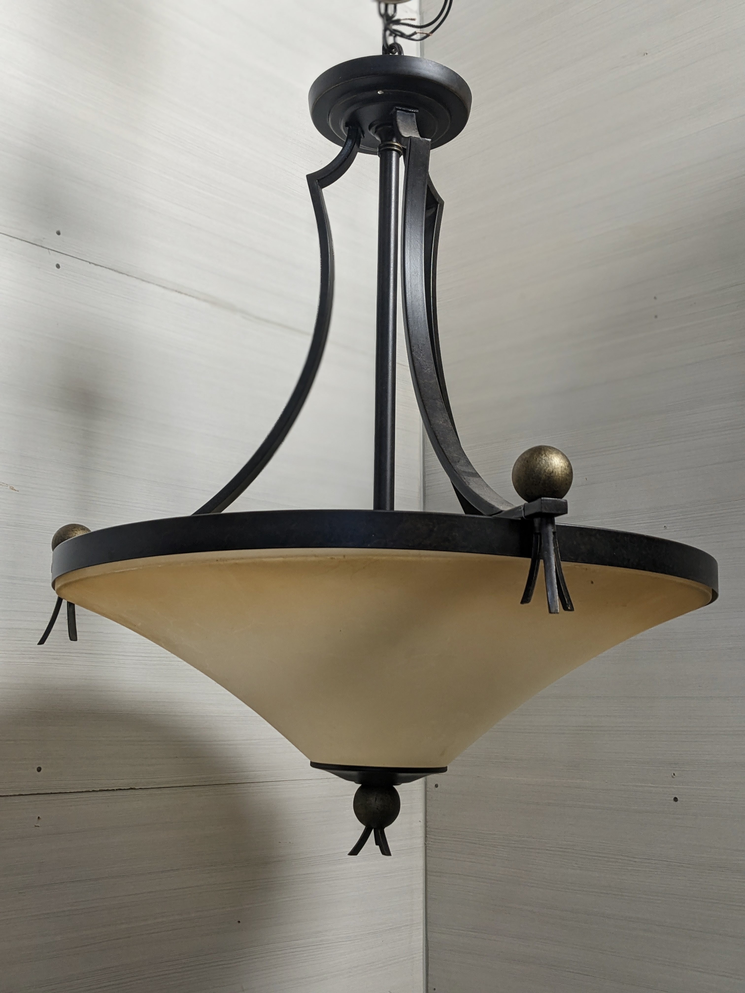 This ceiling fixture is likely from the mid 2000s and has an aged bronze finish with warm hued shade.
