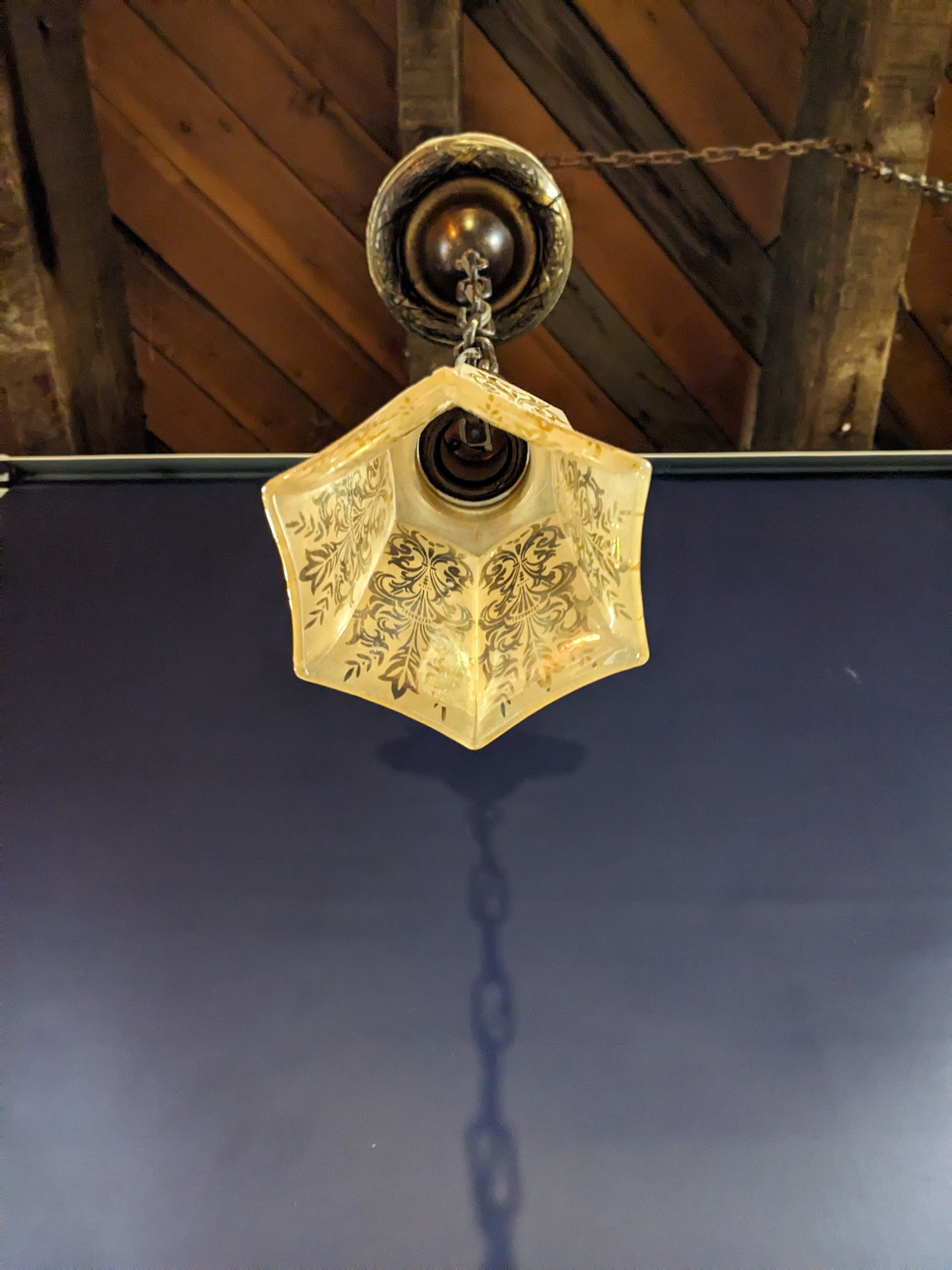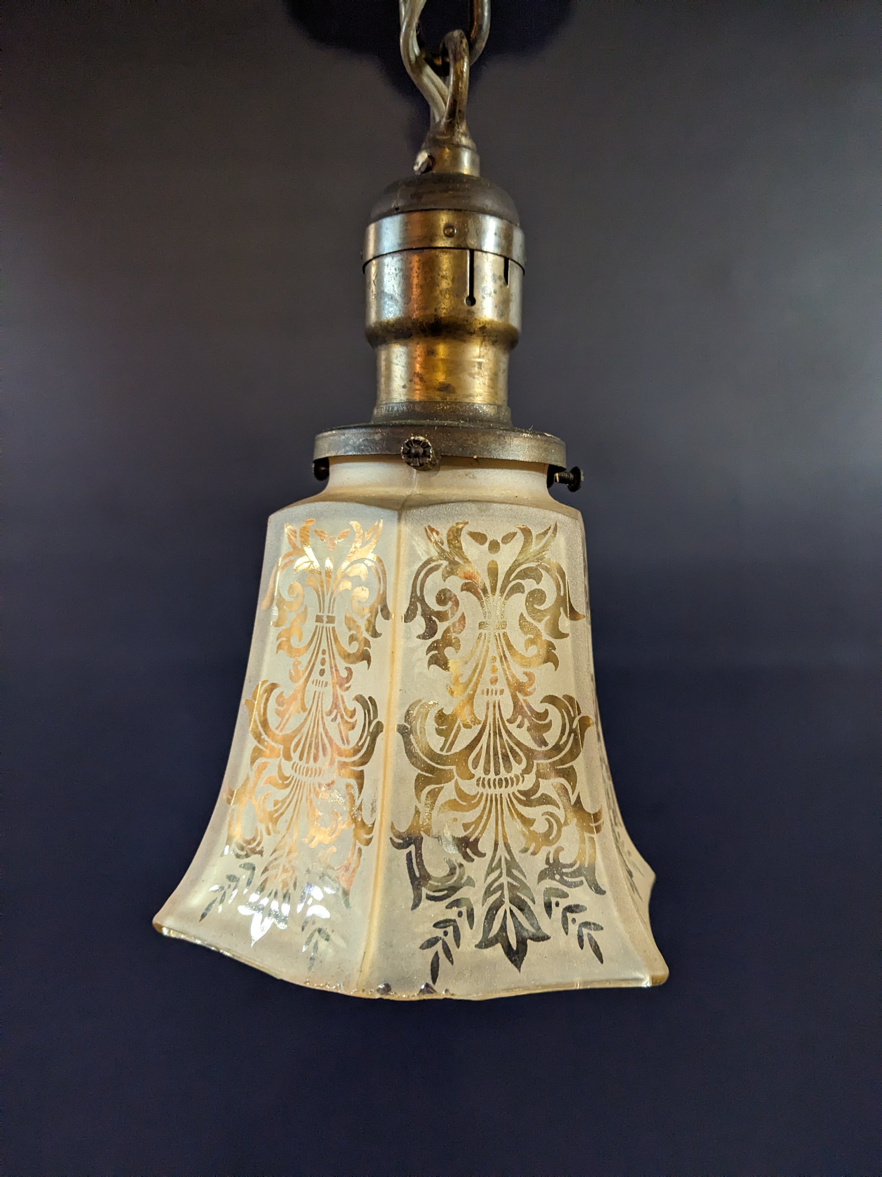 A vintage pendant light with a semi frosted shade. This light is in good condition, with a bit of leftover paint and some wear to the shade. It measures 5 x 21 inches.