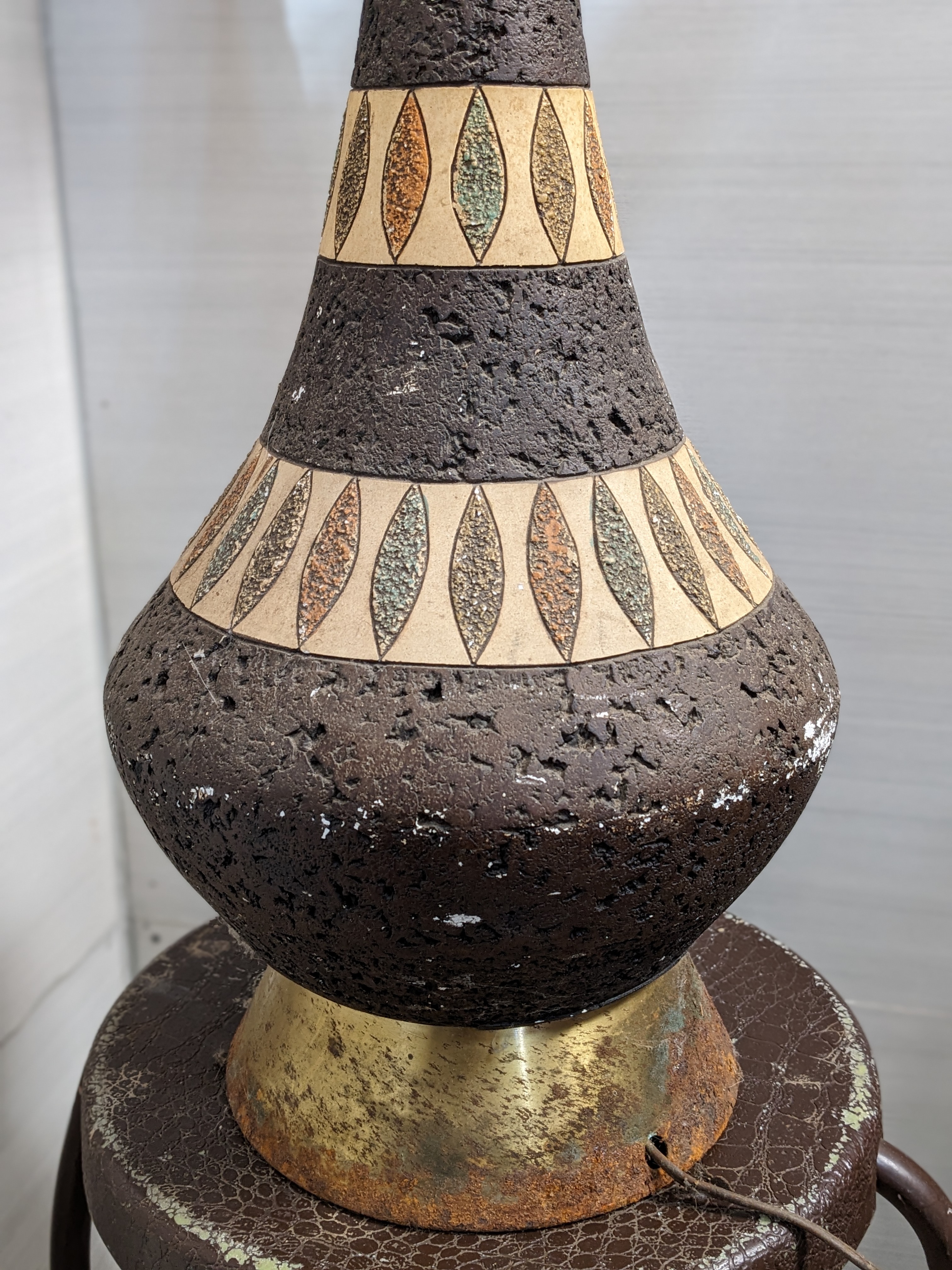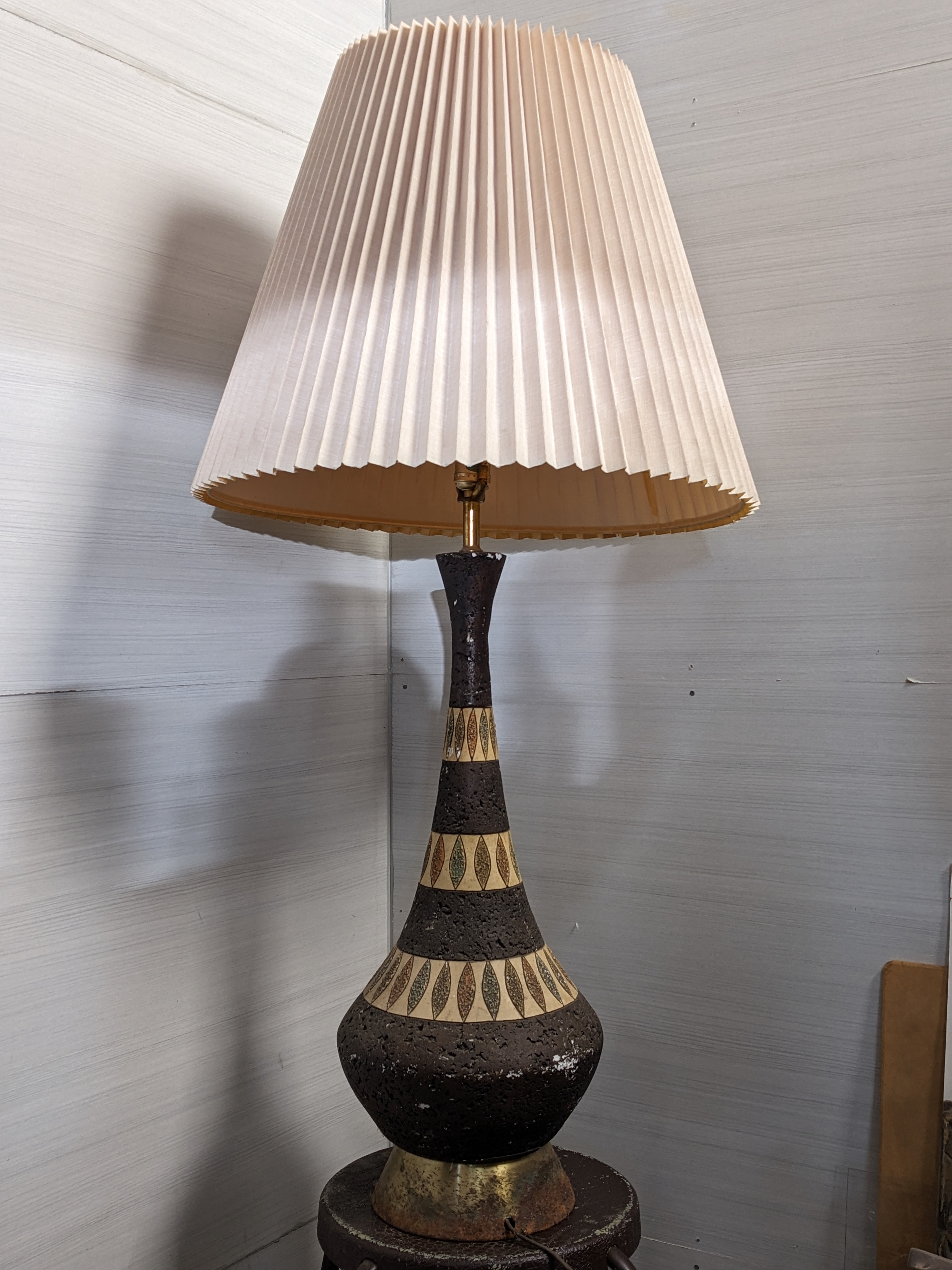 This vintage Mid-Century Modern table lamp is a stunner! It features a textured, dark ceramic base with a decorated band of leaf-like motifs in an earth-tone color scheme paired with a cream, pleated fabric shade. This one is in great shape for its age - add some classic MCM flair to your place! Likely manufactured by Quartite Creative Corp, a U.S. company known for plaster lamp bases in the 1950s-1970s.