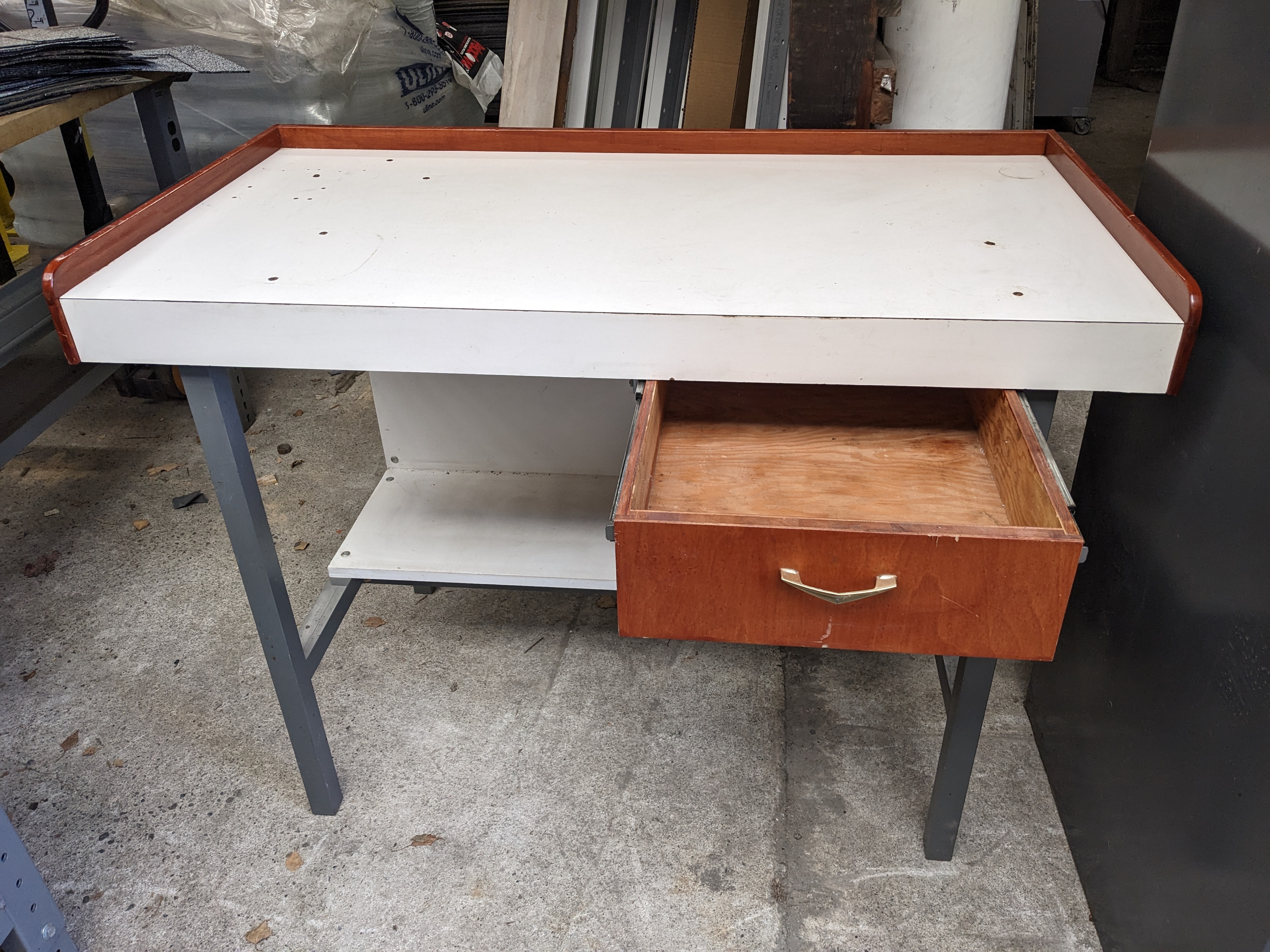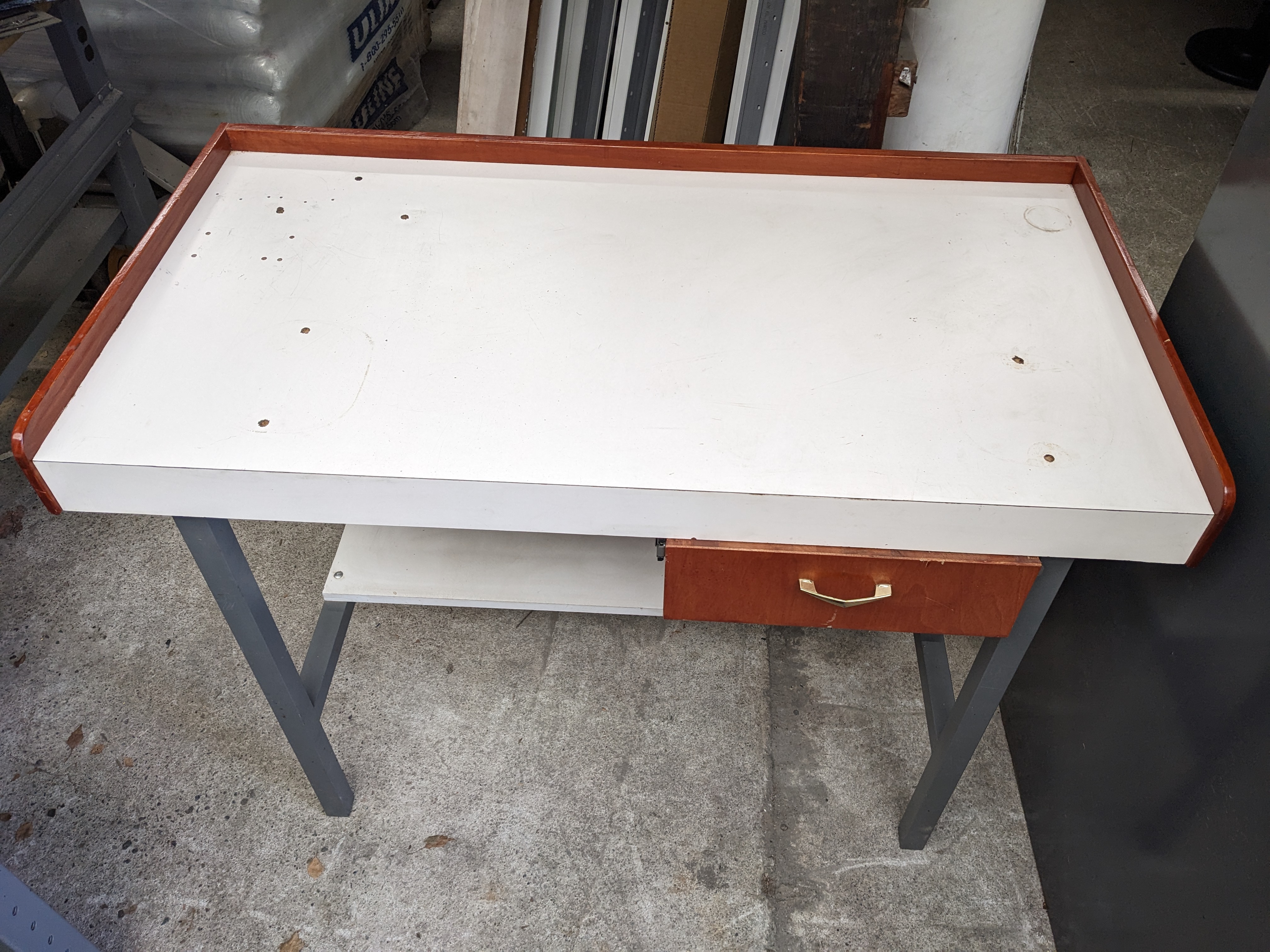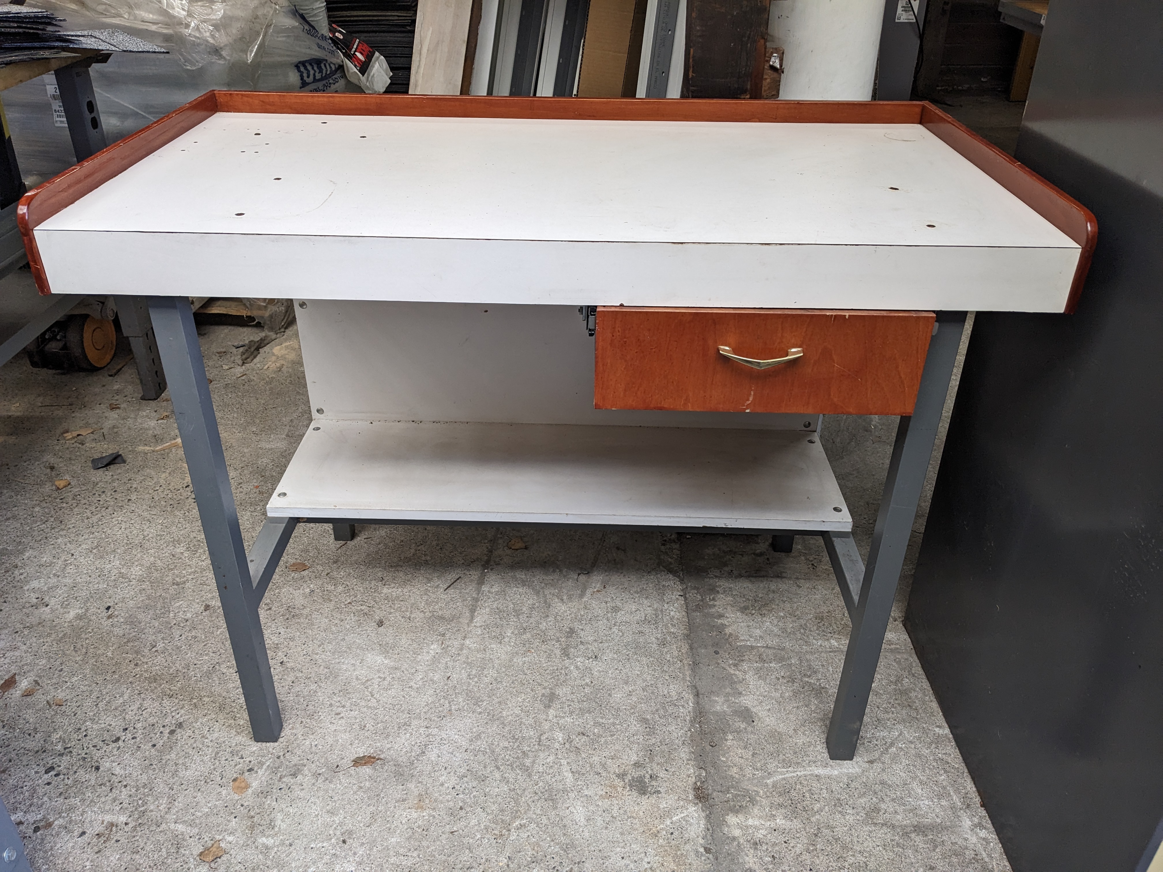 This work table is in pretty decent shape and features a drawer with a vintage pull. This would be great for a garage or workshop area in your home.
