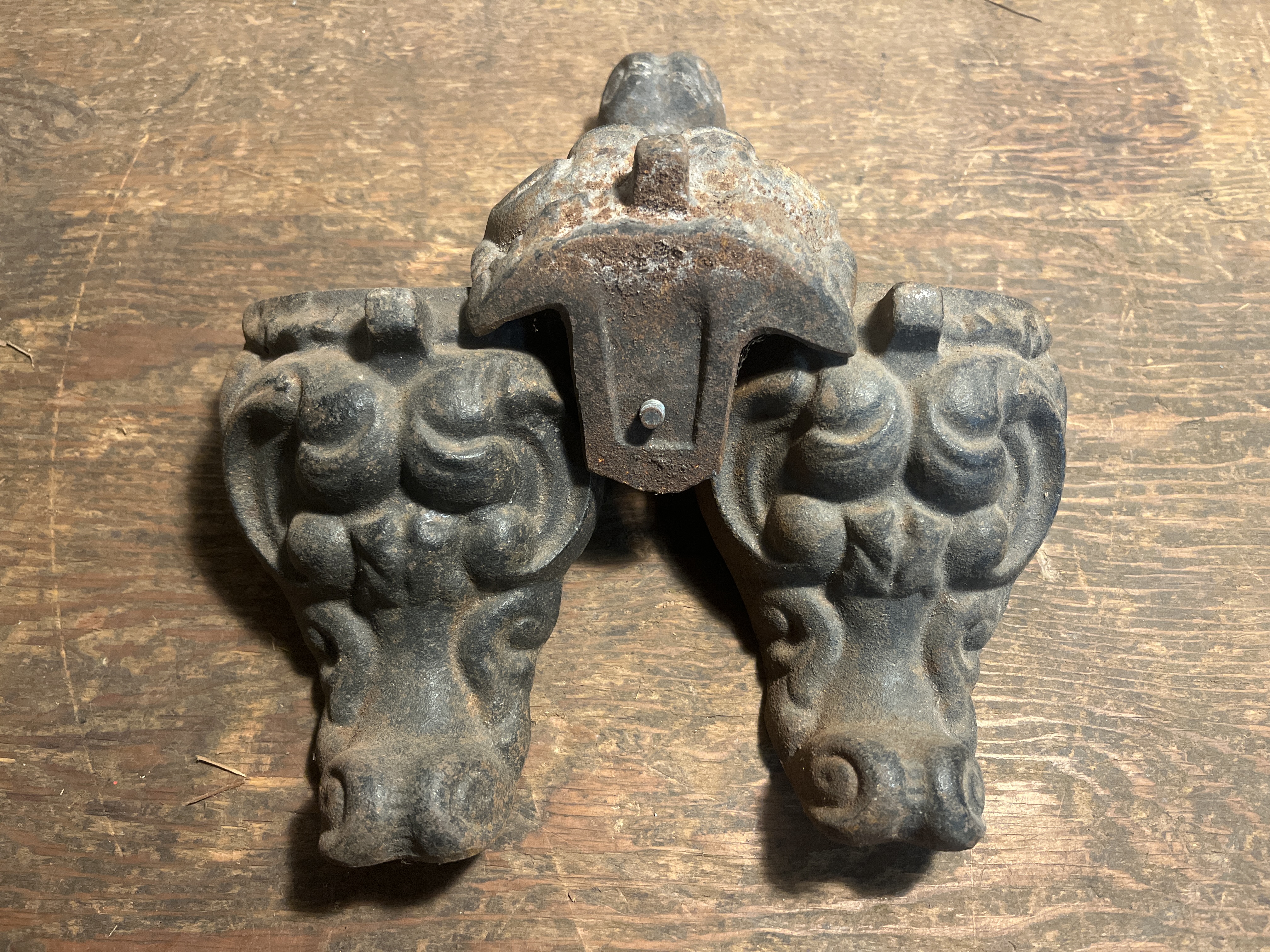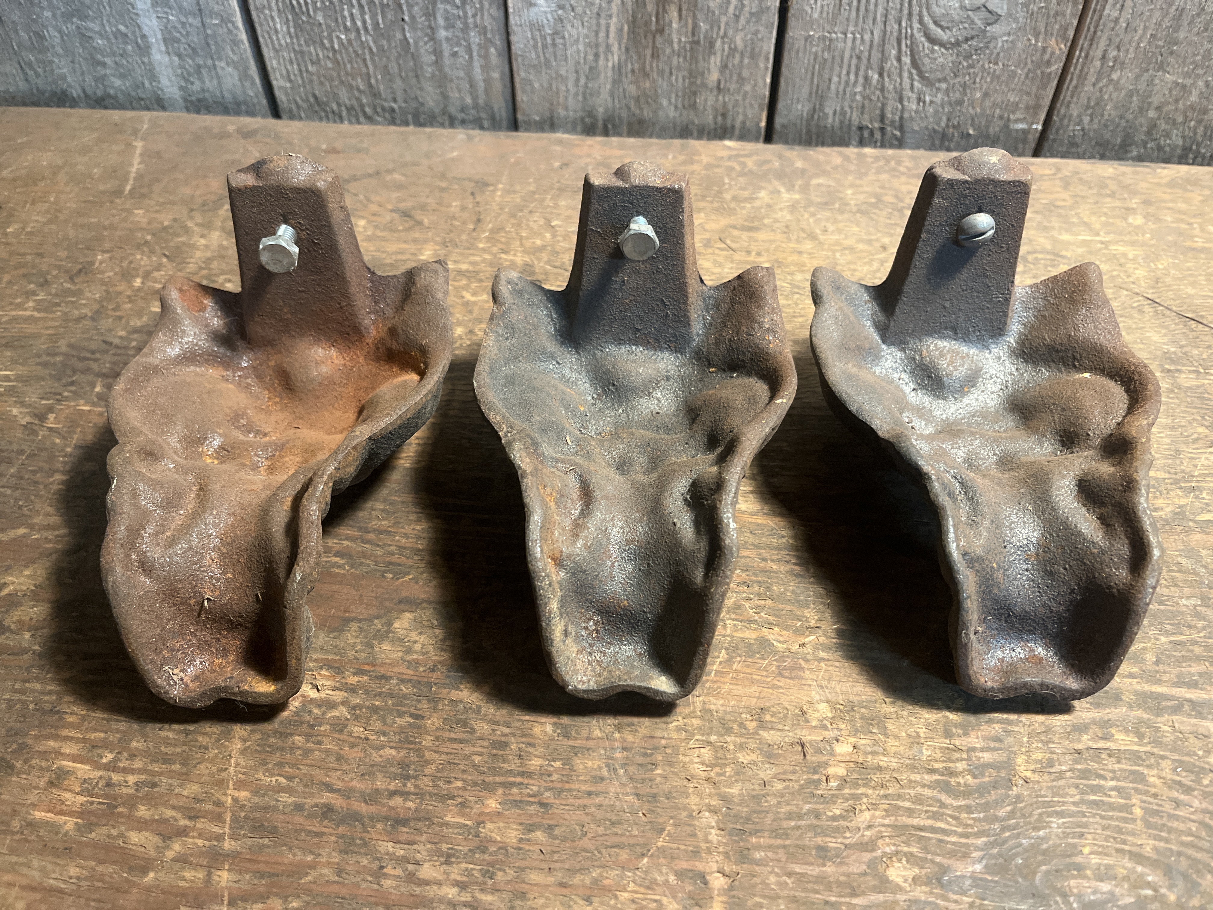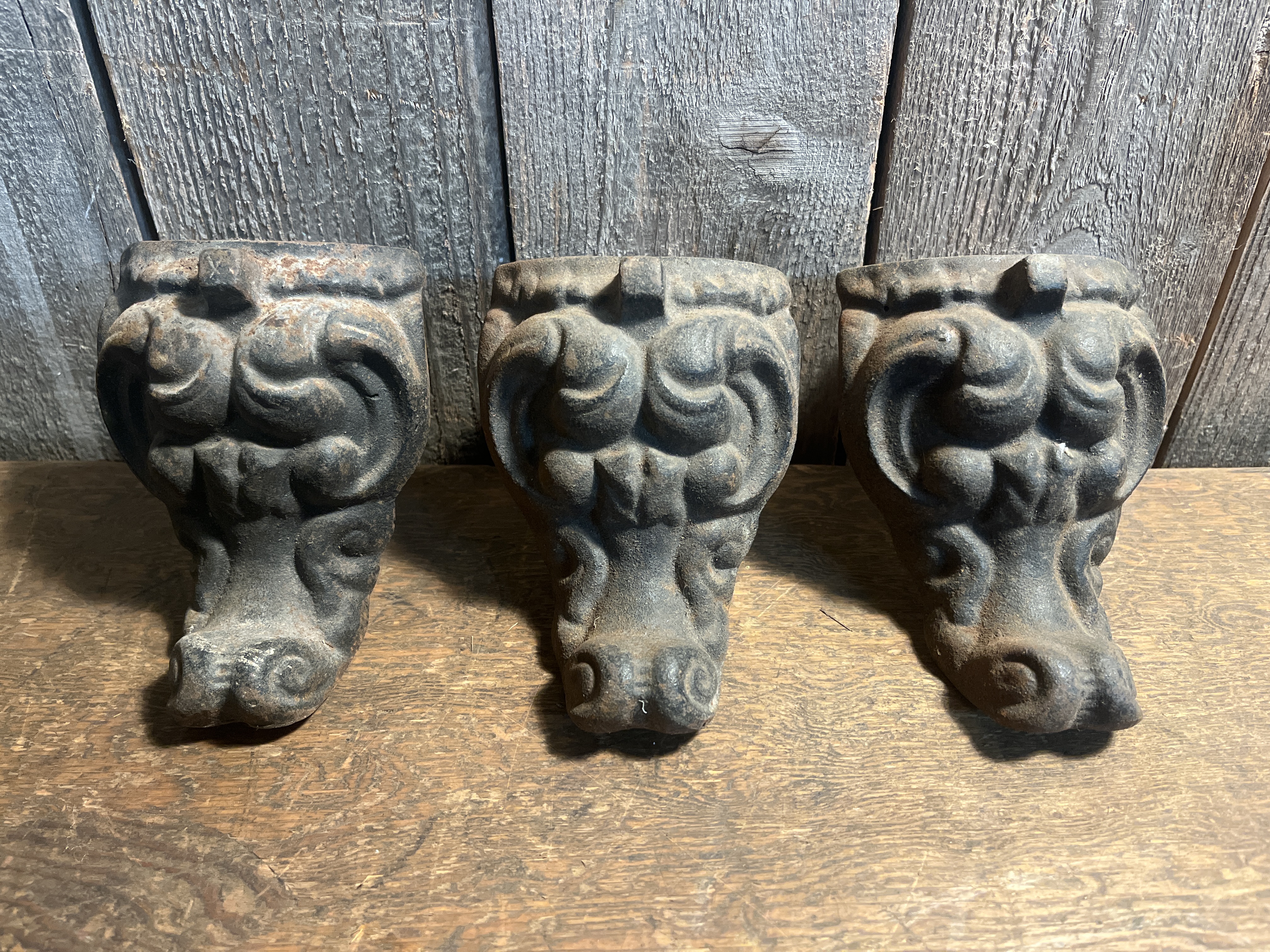 A trio of beautifully designed cast iron feet, assumed to be from a heating stove or similar antique appliance. They are in great shape and ready to be repurposed for something new! Each one measures 4 x 5 x 4.25 inches.