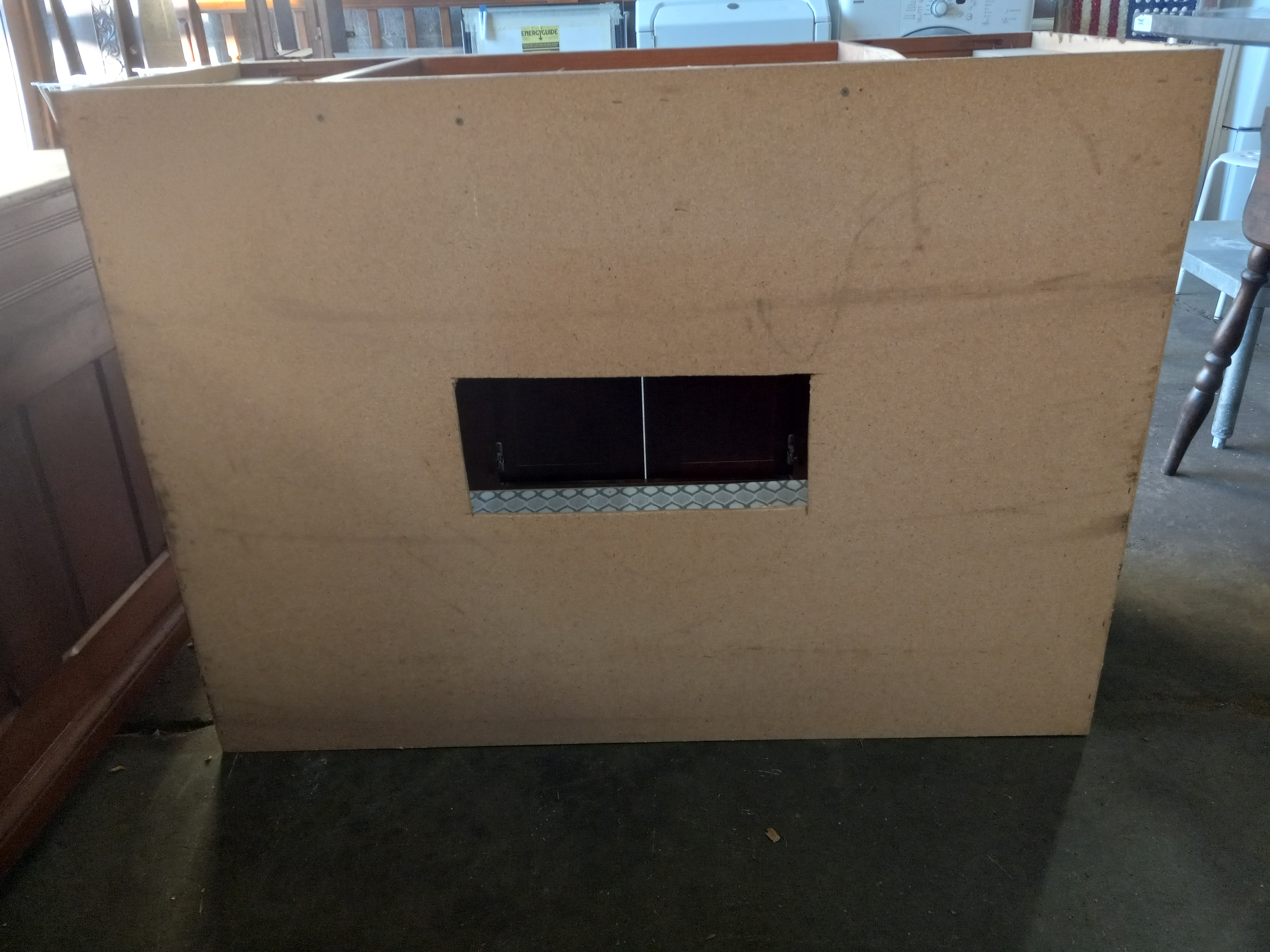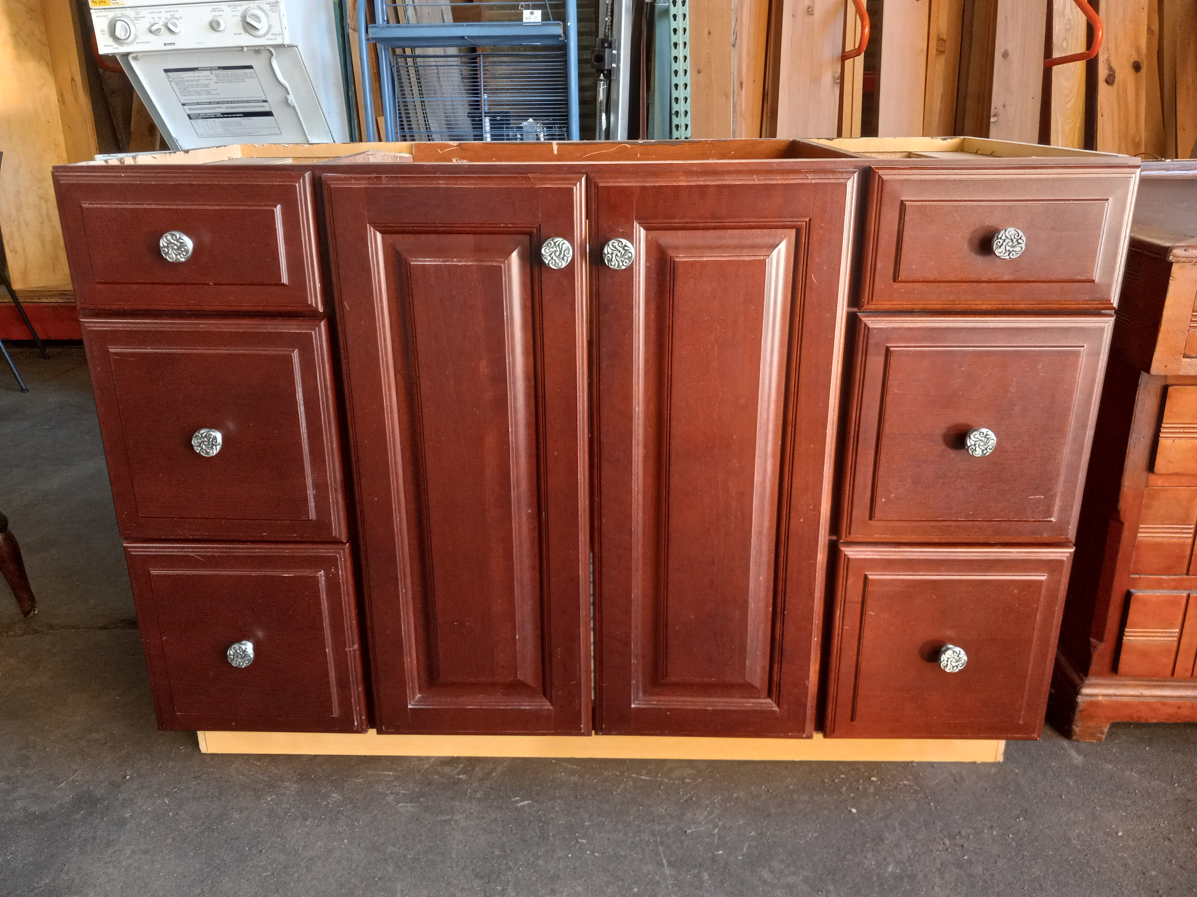 It has slight wear and a piece of one of the cross sections is damaged but is not structural and will be covered with whatever countertop is used. It is a nice dark Cherry wood color and is made out of plywood and particleboard.