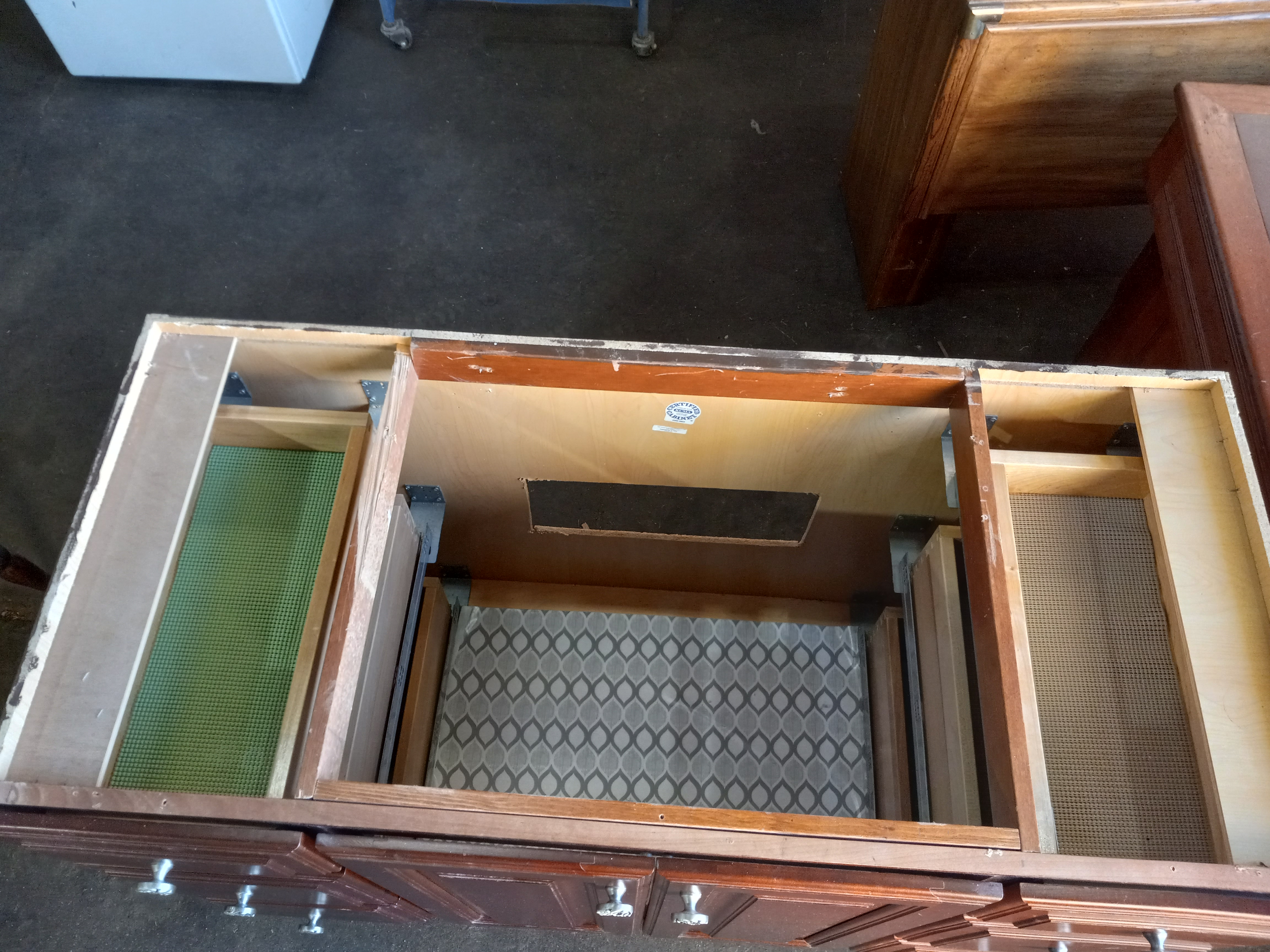 This cabinet features dove tail and soft close drawers and is in good condition.