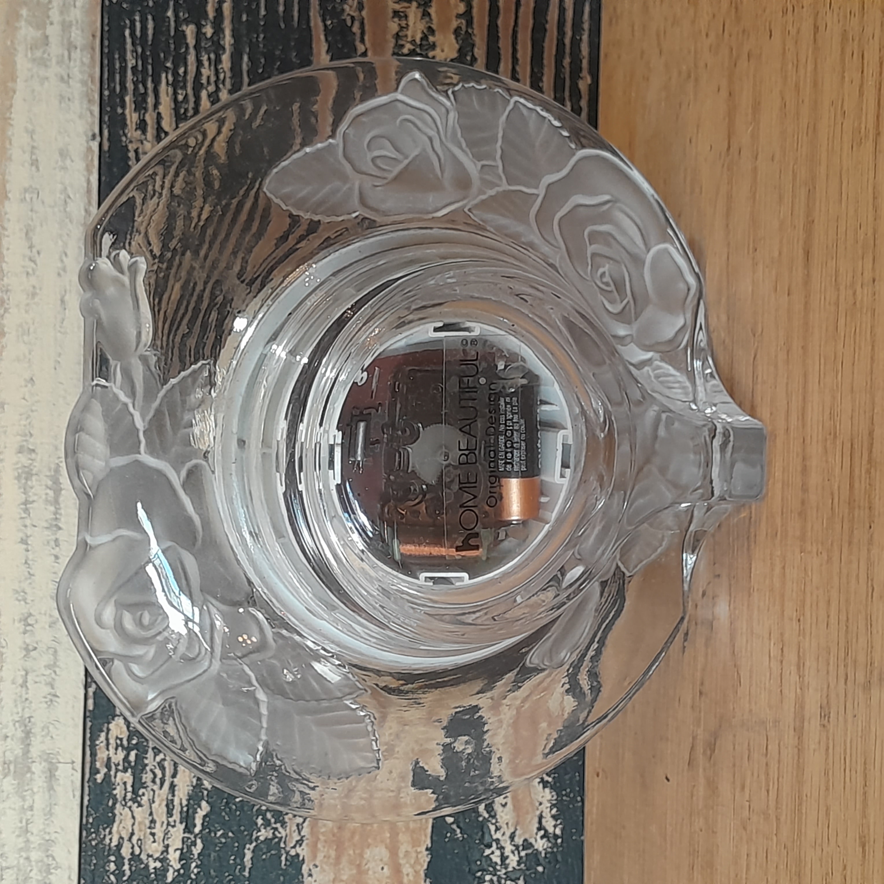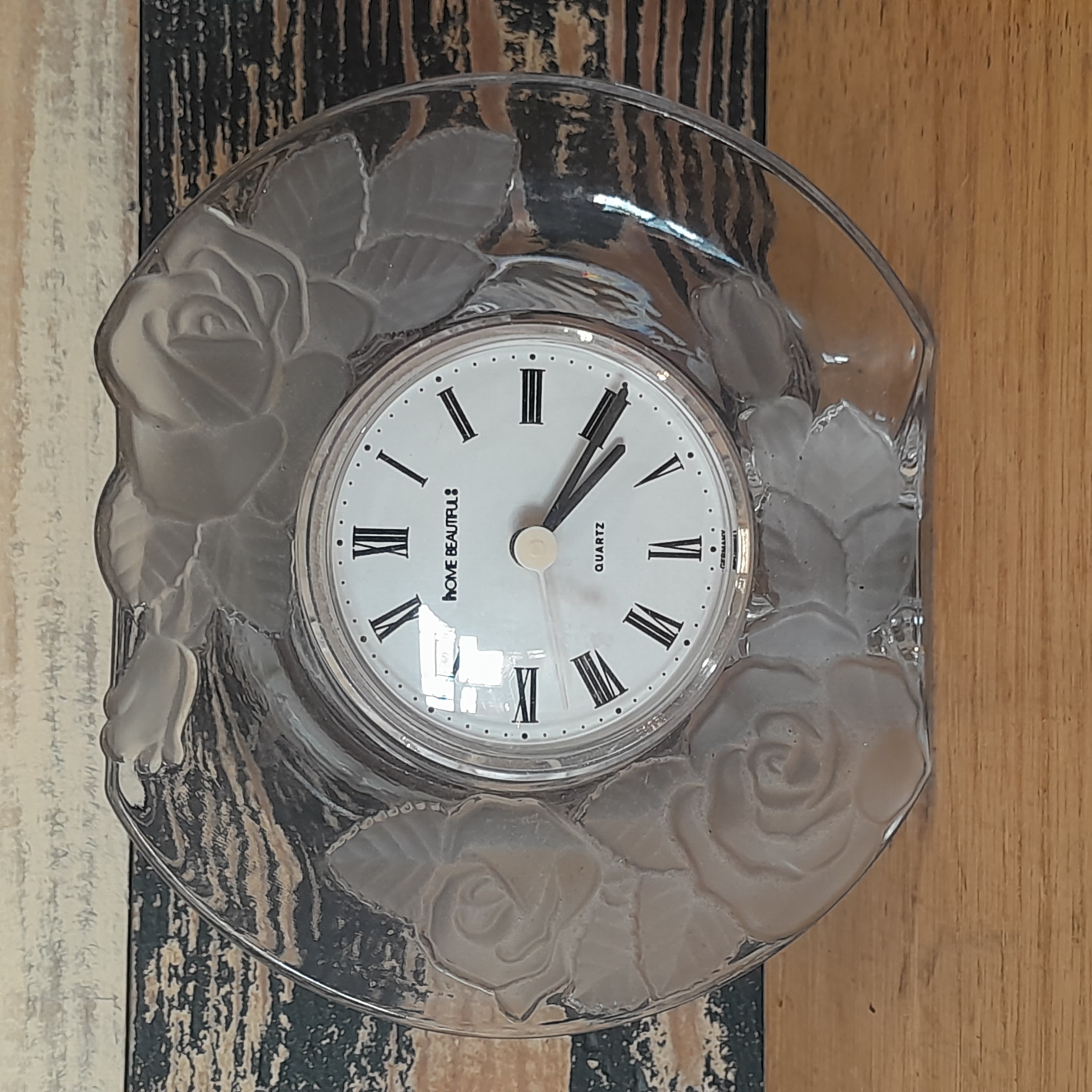 Features frosted roses around the time piece. Has a quartz clock in it. Appears to just need a new battery.