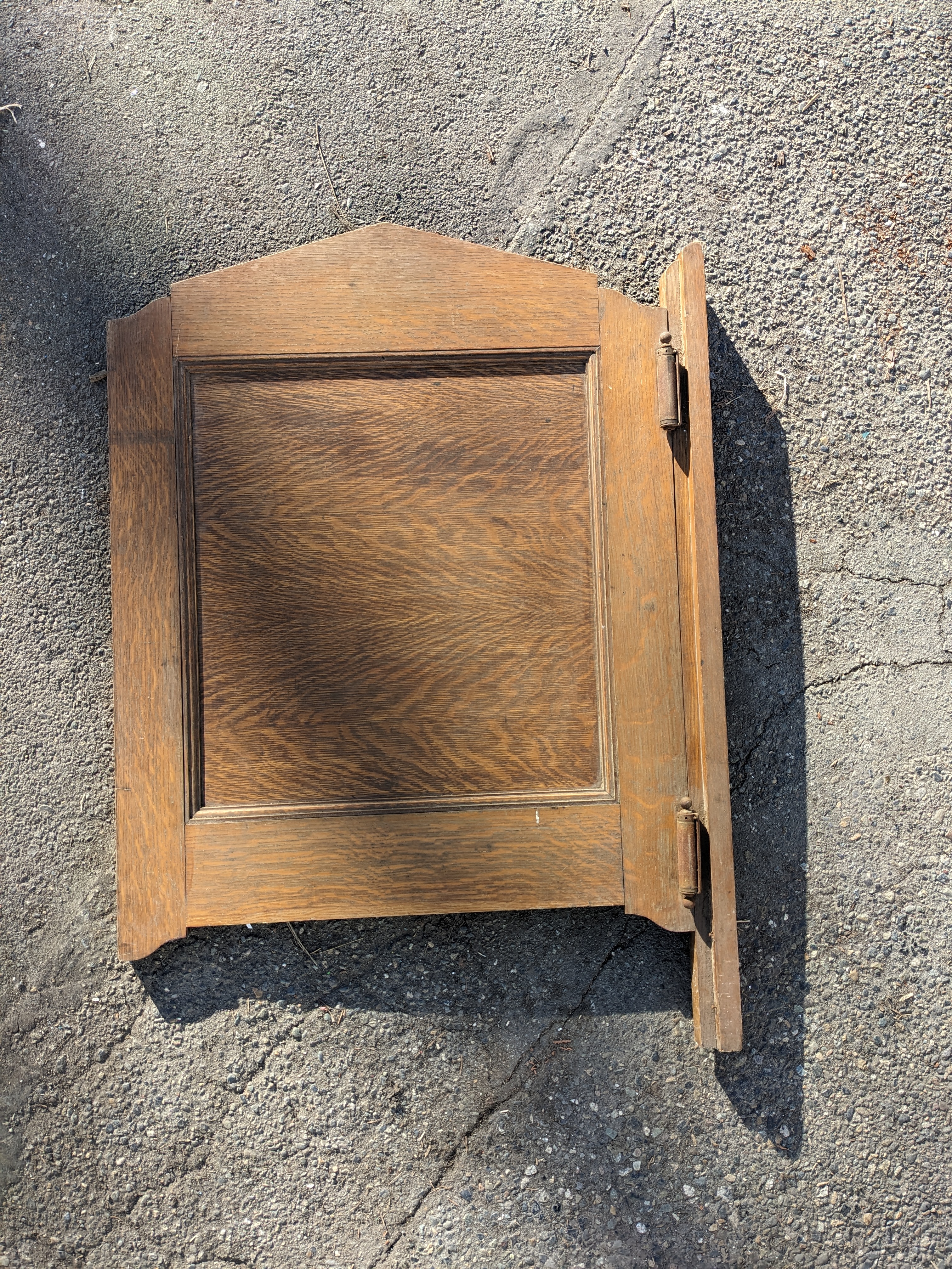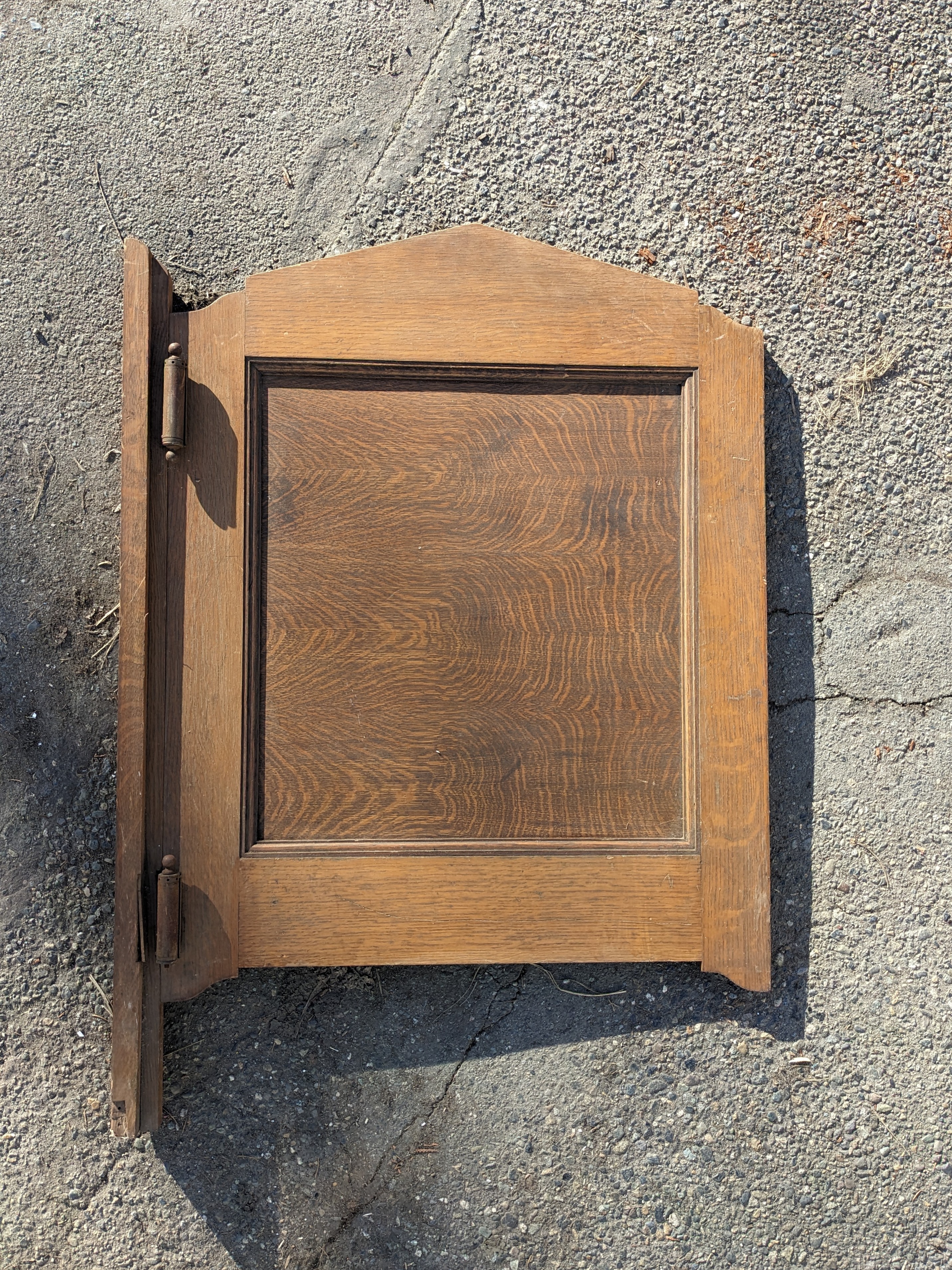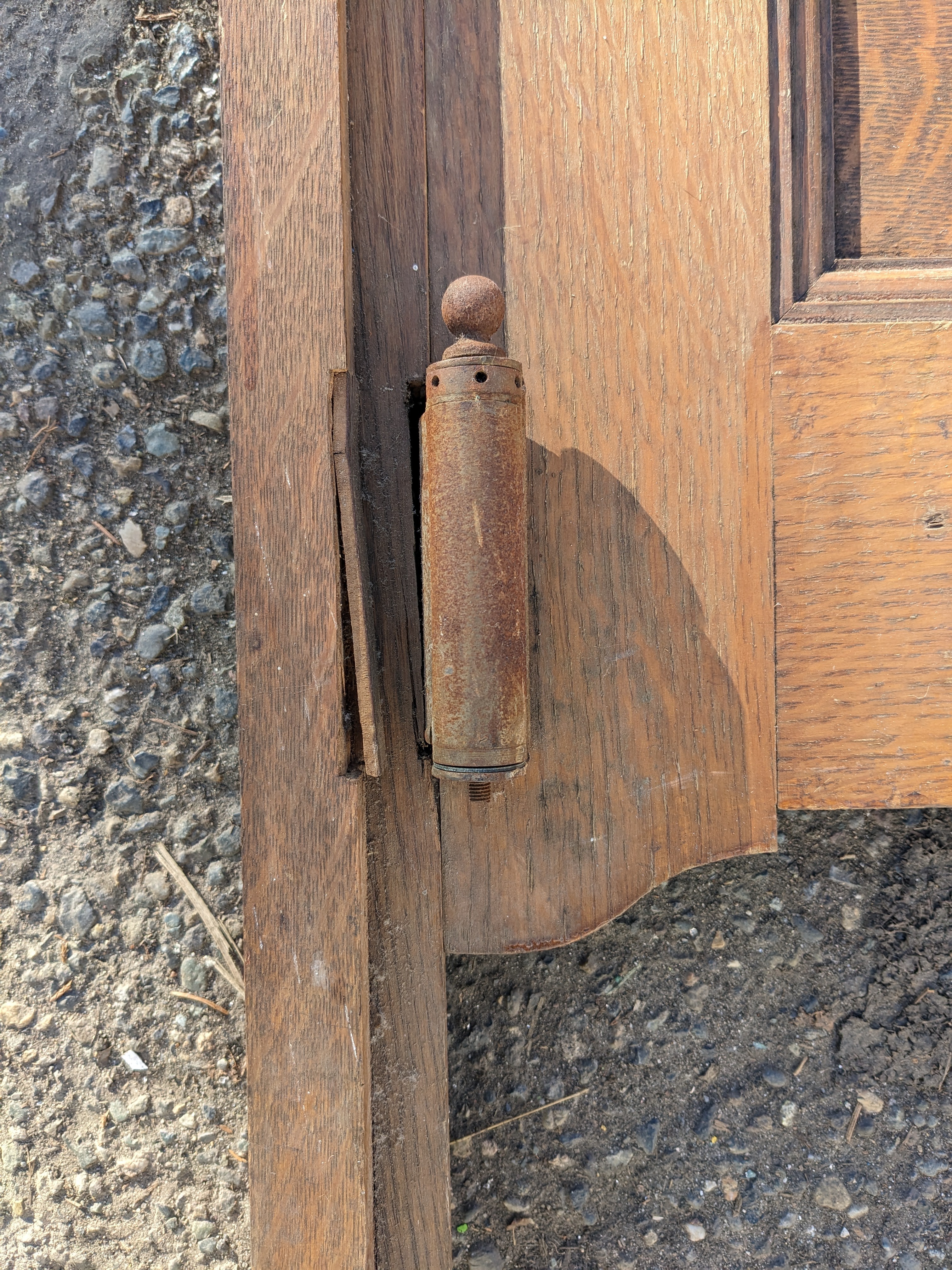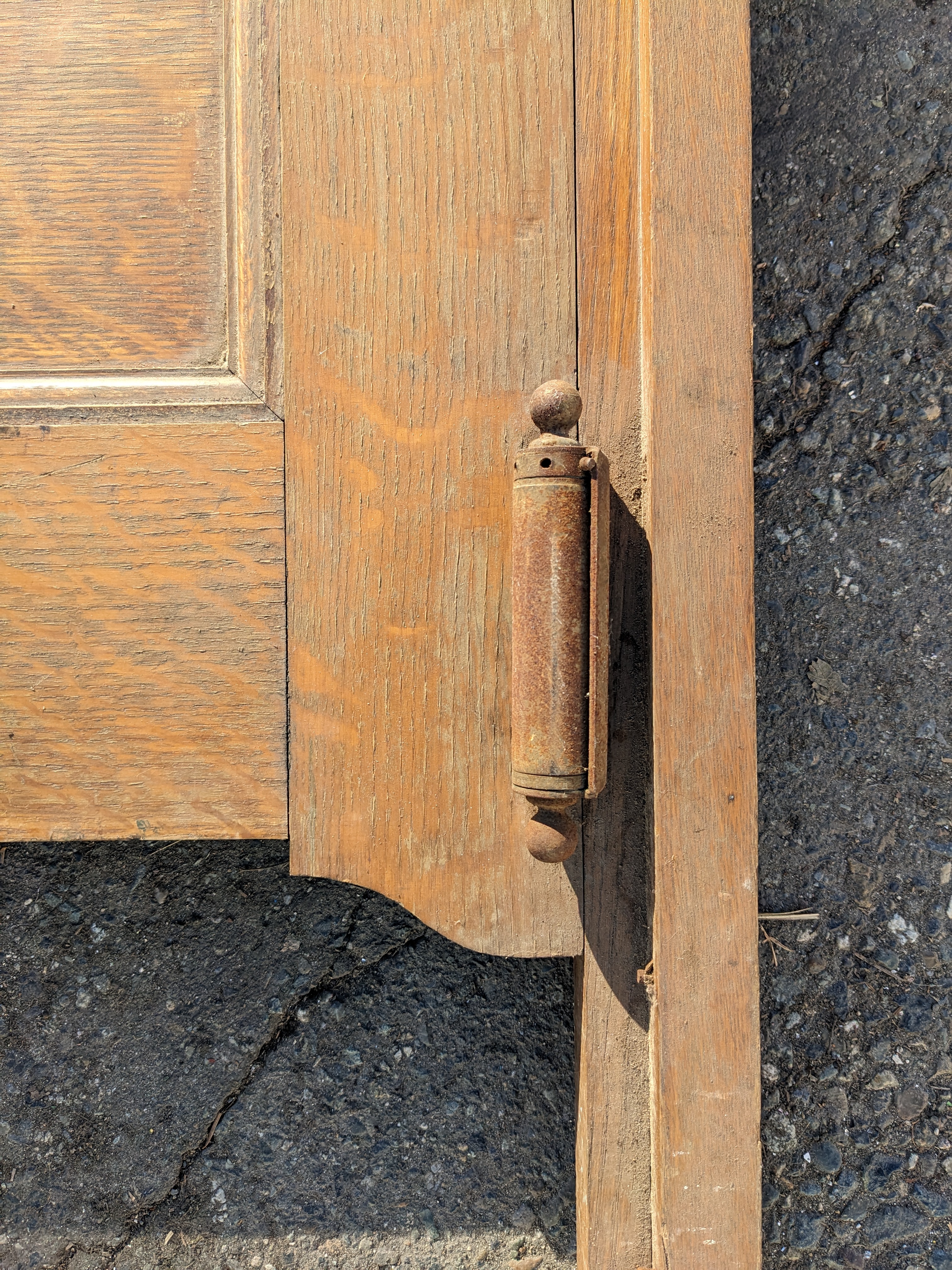 Everybody knock off your boots and hang up your hats, we have got a spiffy looking single panel oak saloon door. It comes to us with some double action vintage saloon springs attached meaning this guy is basically ready to be mounted! One ball is missing on the bottom side of one of the springs, barely noticeable when it's standing upright. Mounting wood attached. Note that it does have some knicks and scratches from being used, it is not perfect but it sure is close!