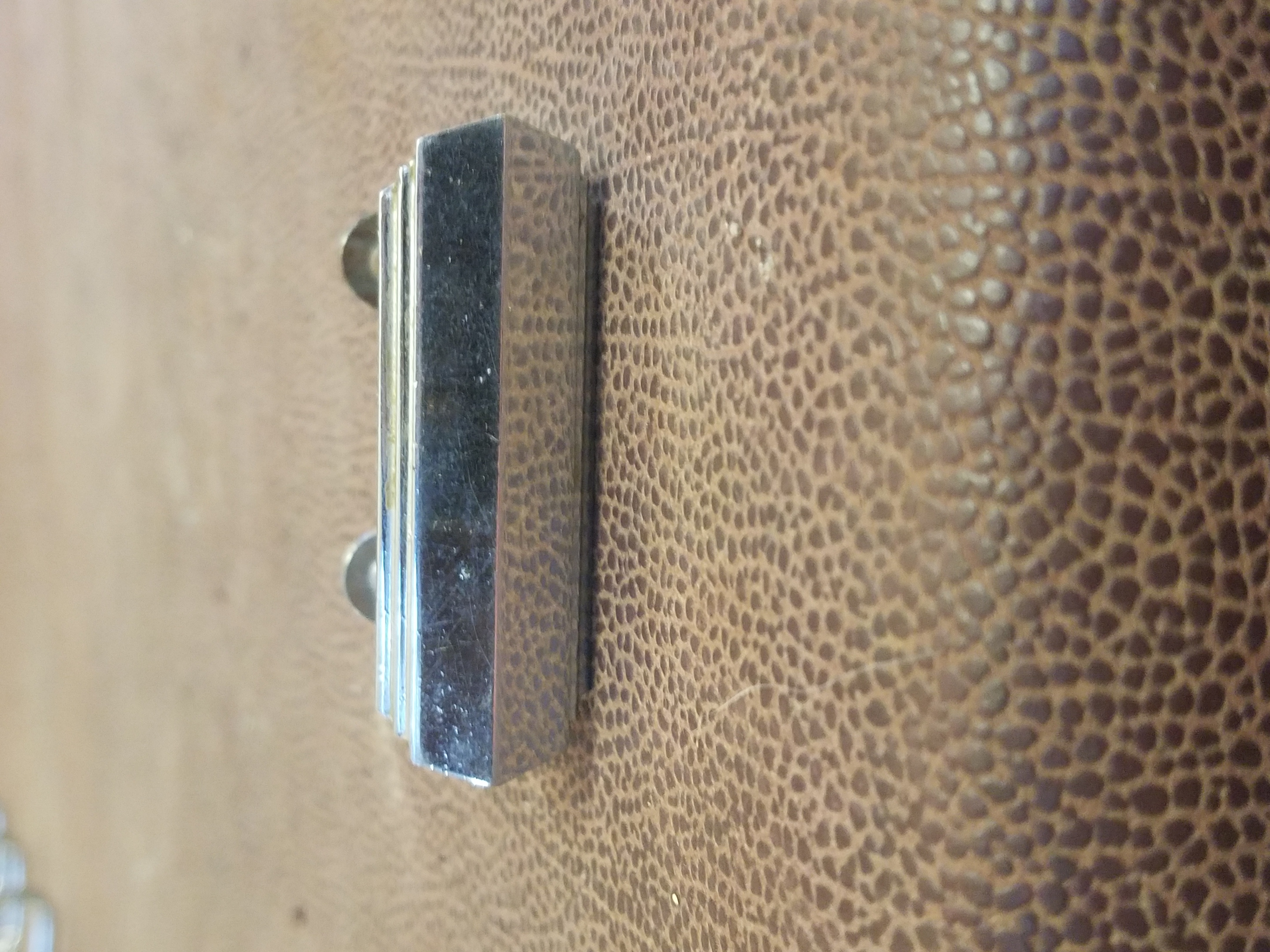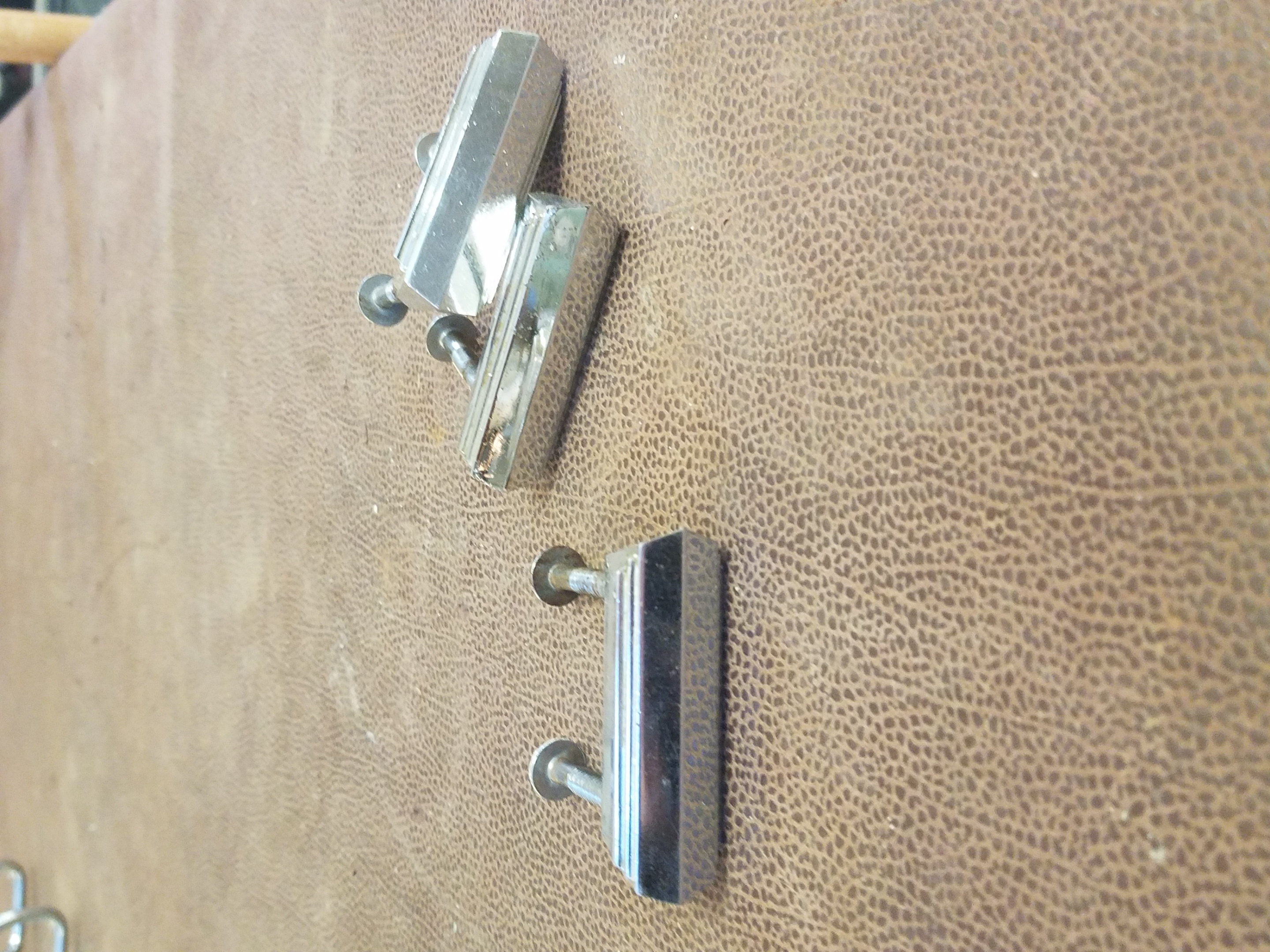 Vintage stainless steel cabinet pulls with a chrome finish and a mid-century modern geometric style.