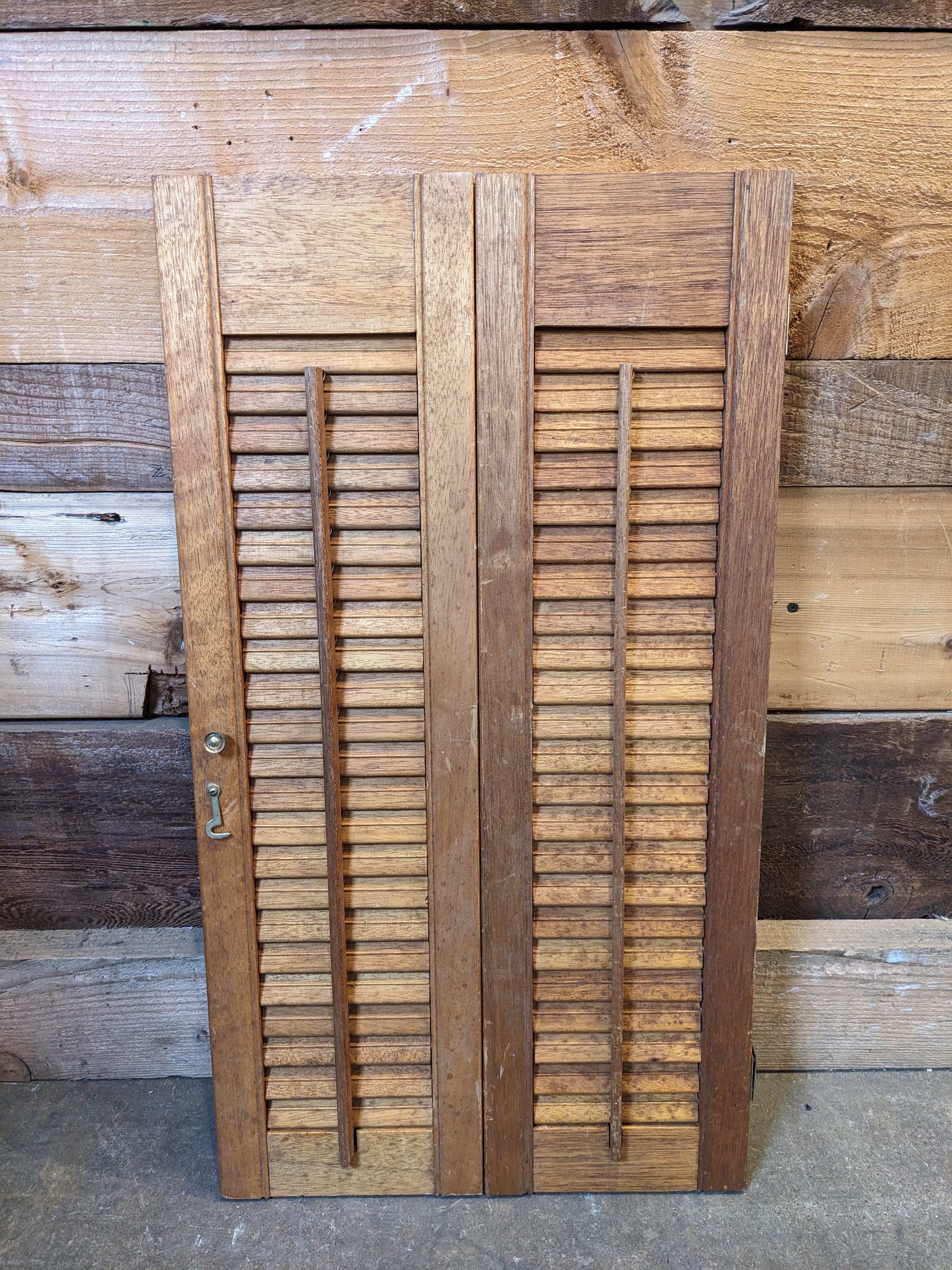 Louvered right-hand bi-fold shutters crafted from mahogany wood.