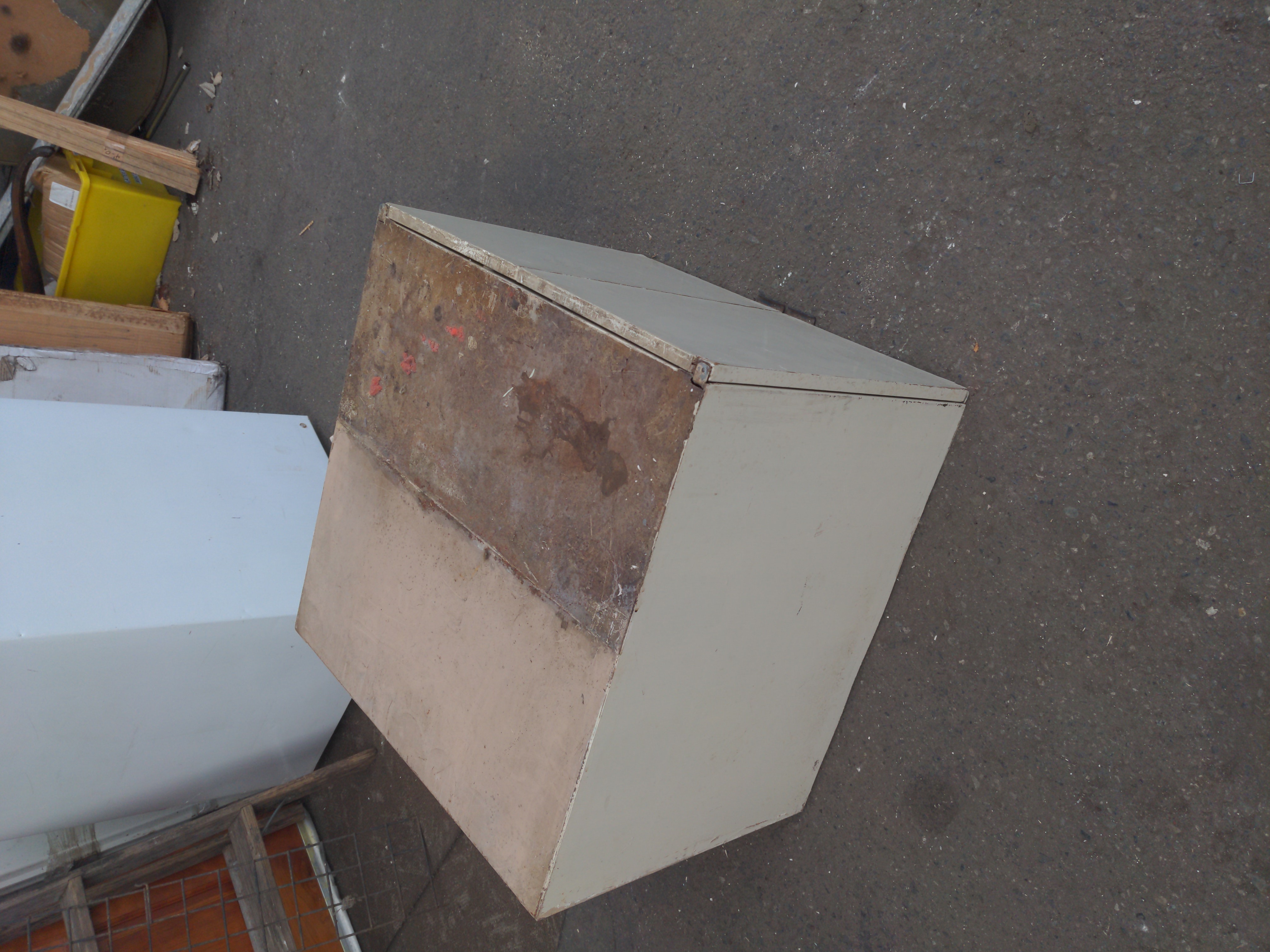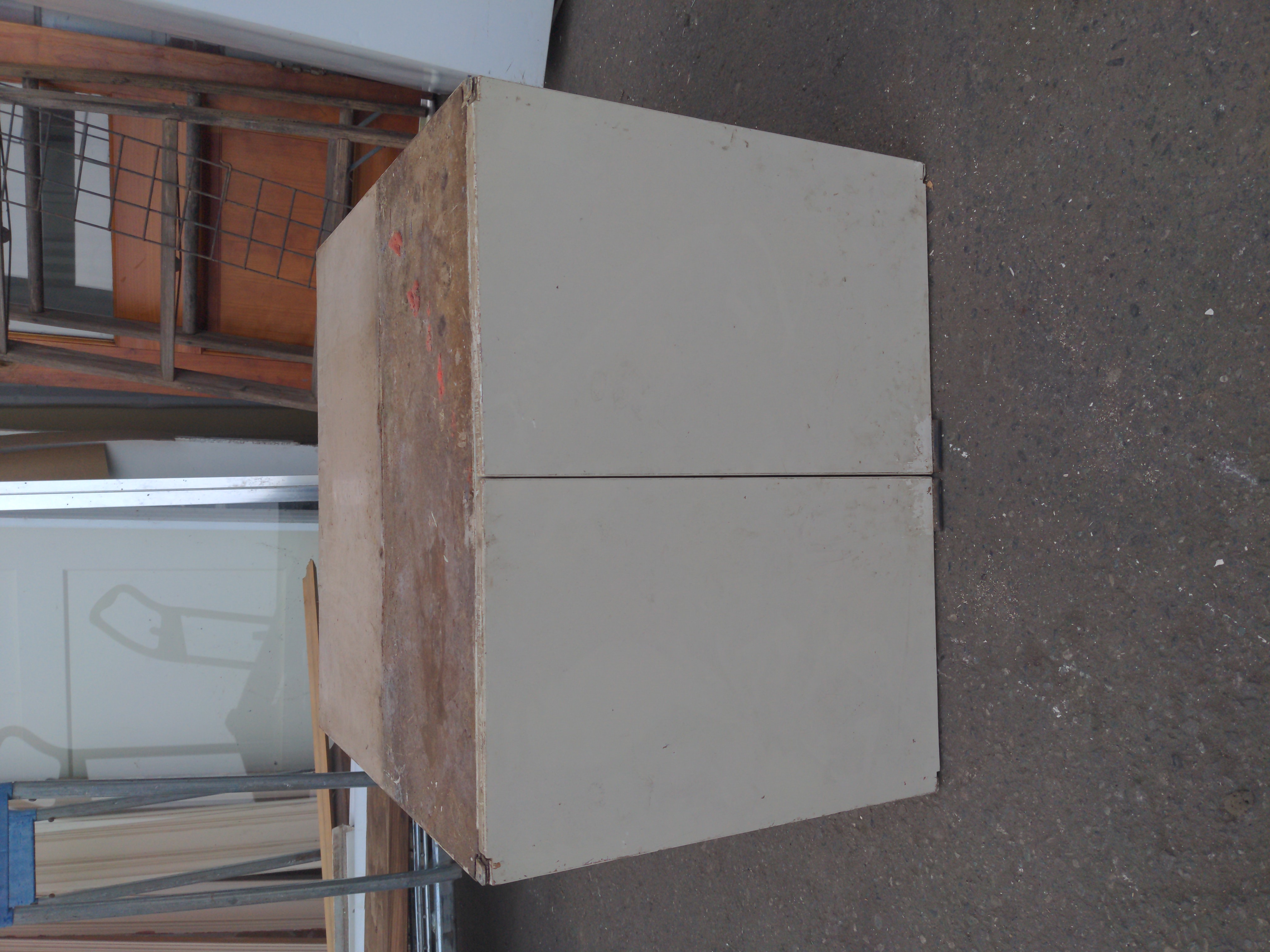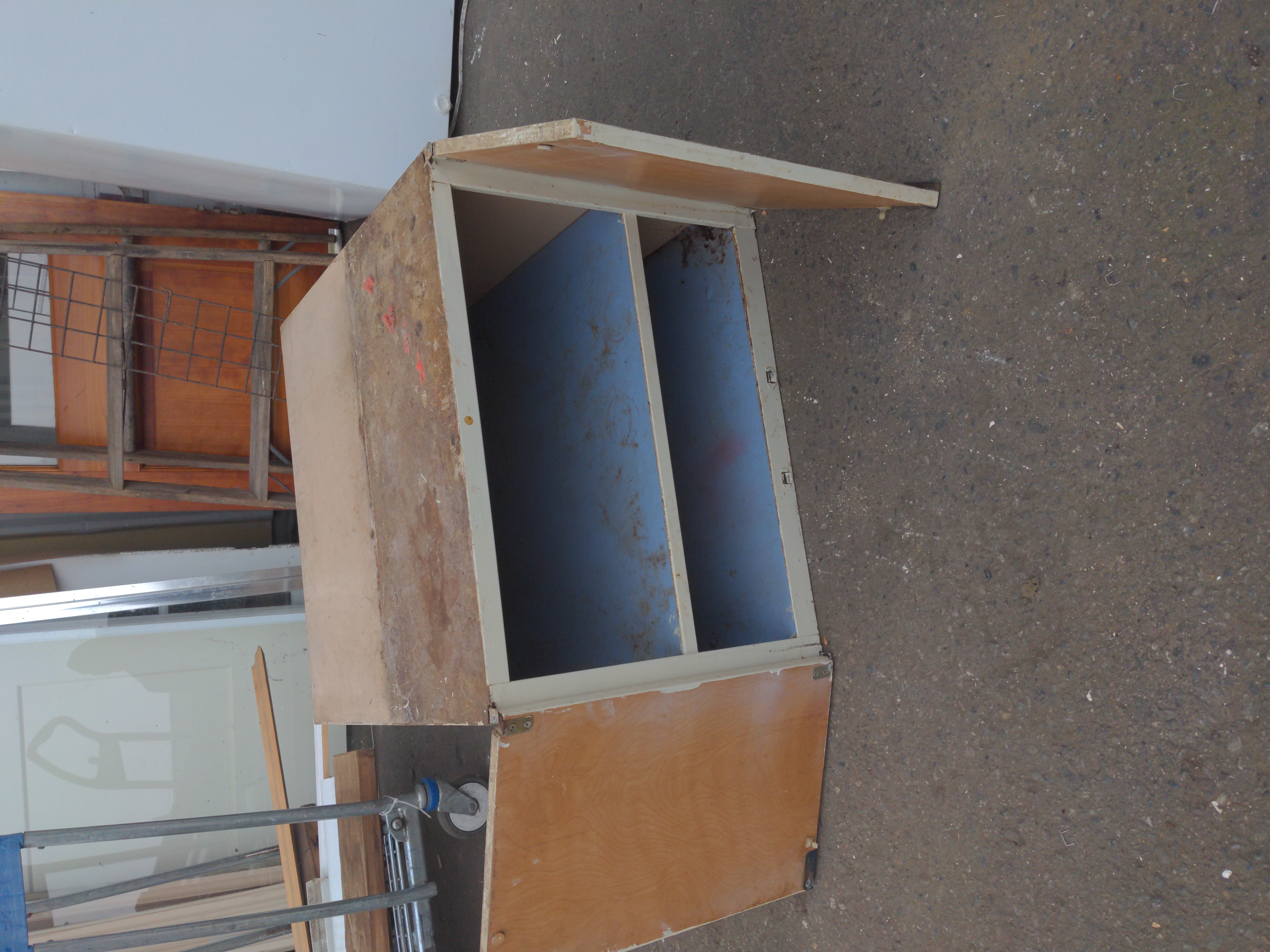 Simple metal cabinet, great for storage in a workspace or garage. Has some minor rust and paint chipping but otherwise in good condition.