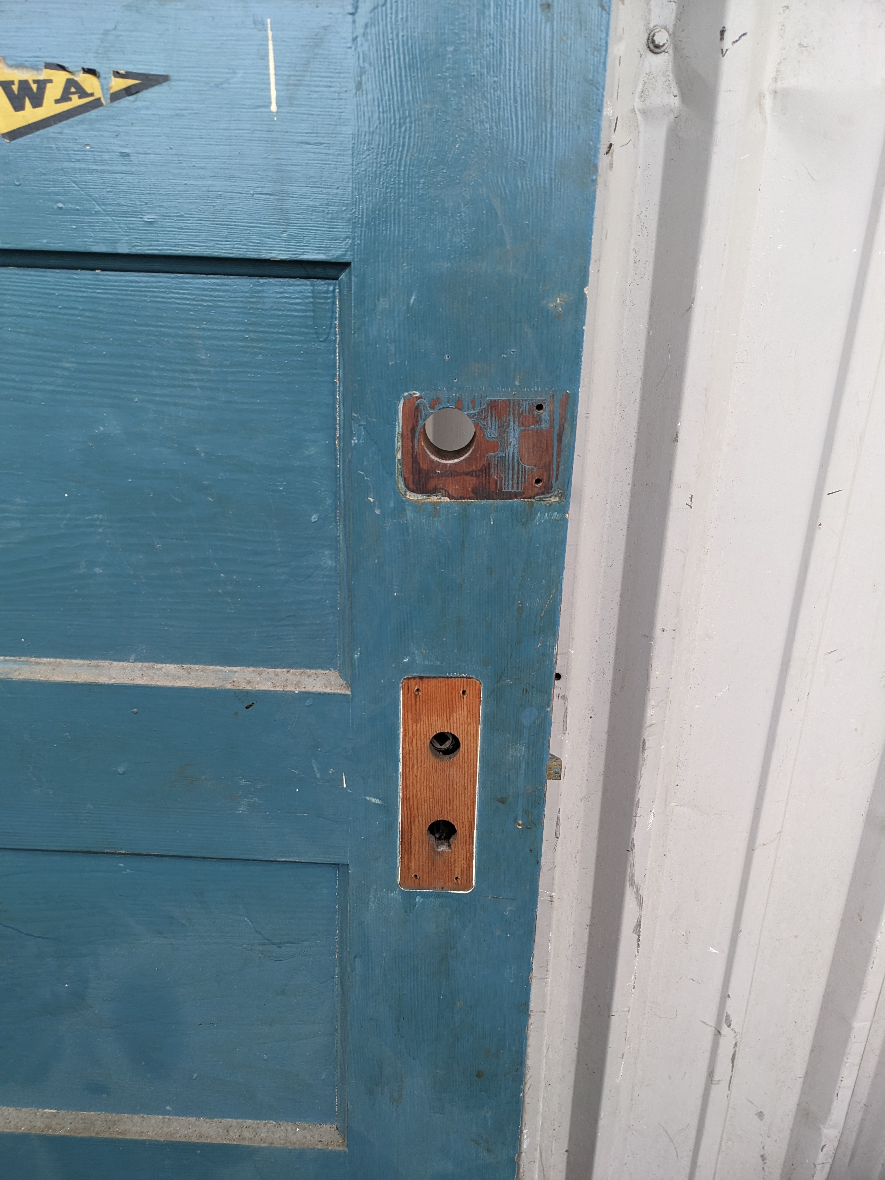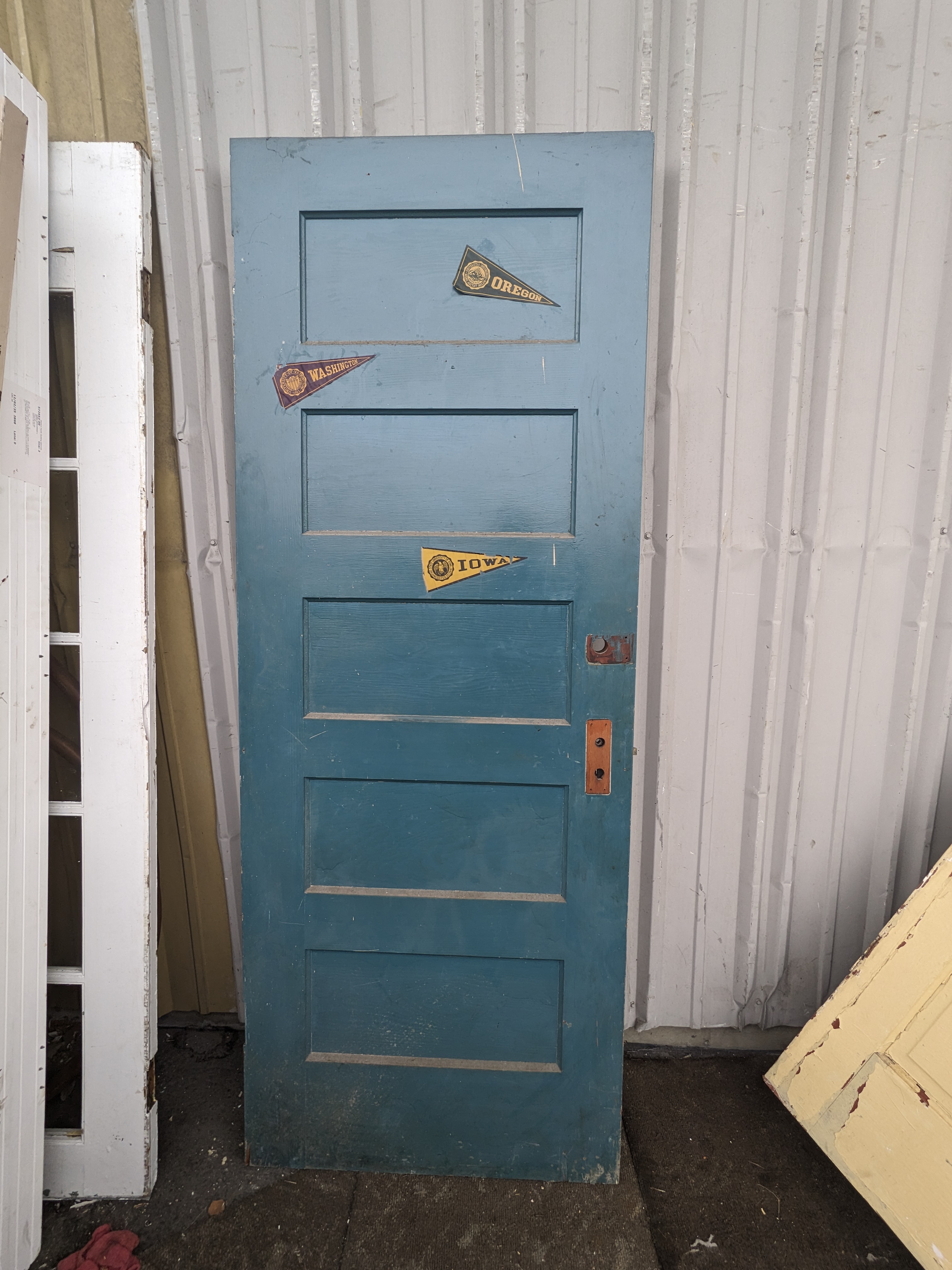 Right swing solid wood 5 panel interior slab door. Painted on both sides, teal on one and a blue toned white on the other. In good condition but will need a stripping or upgrade of paint. Measures 30 x 78.25. Comes with some school spirit.