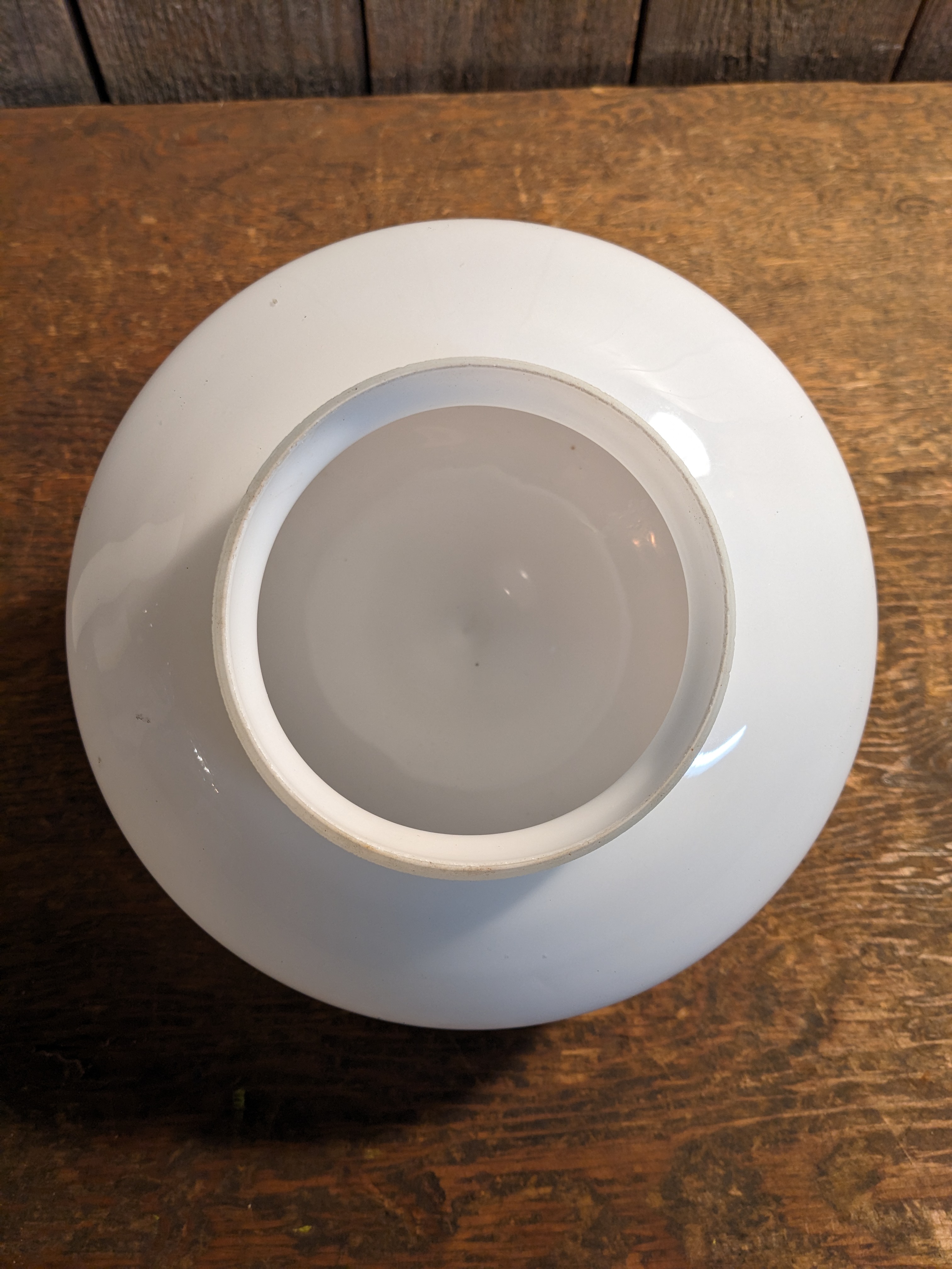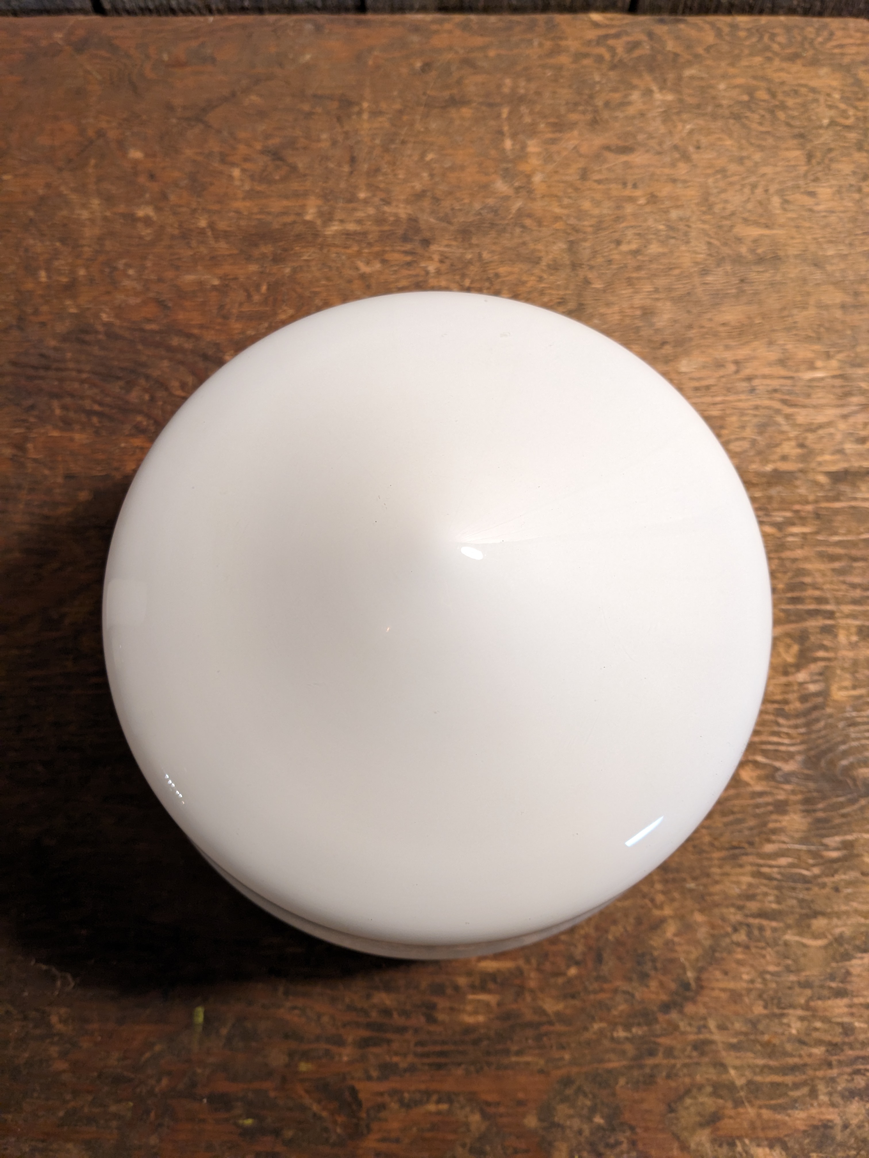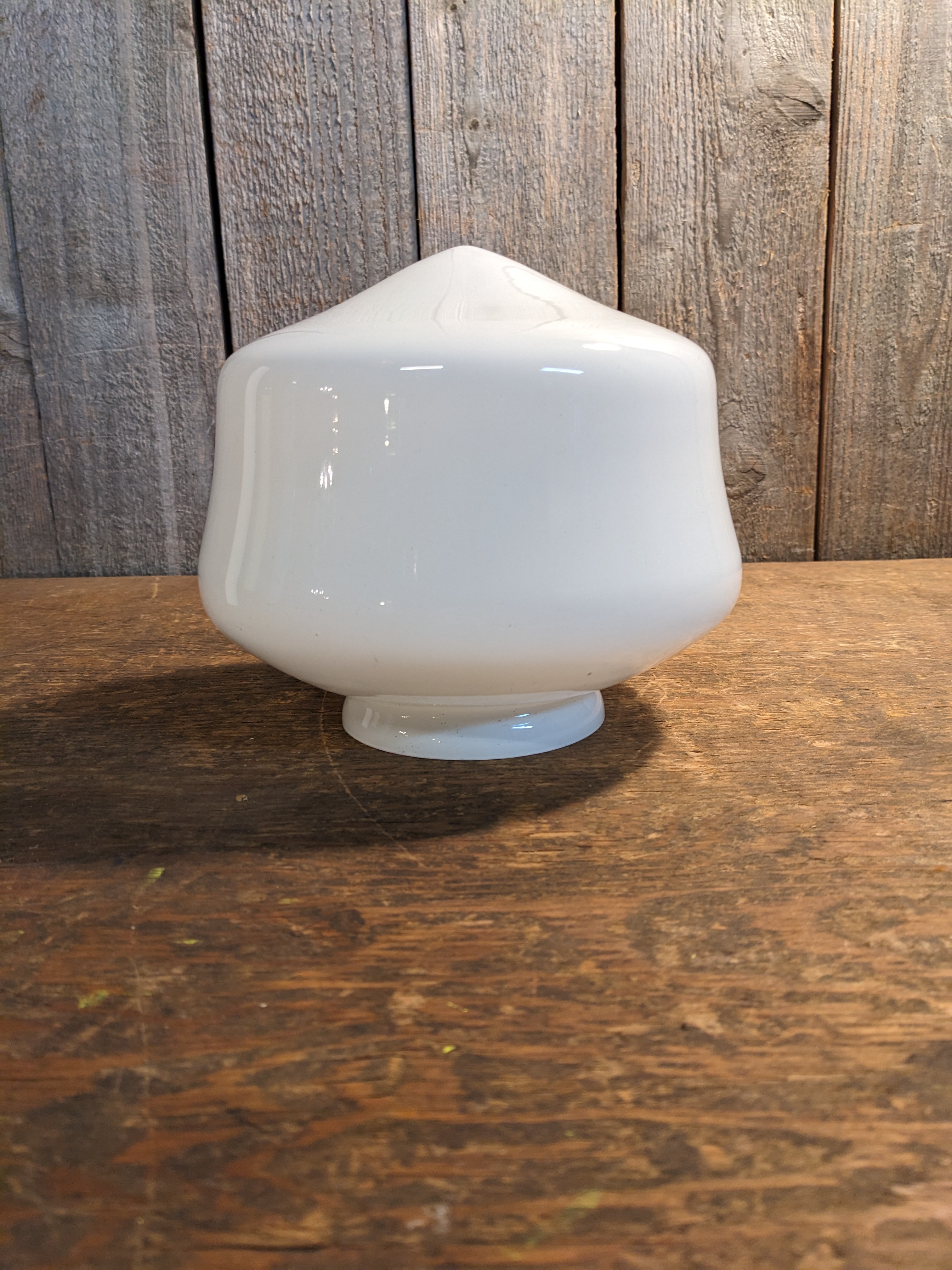 A small schoolhouse shade. It's in good condition with very little wear. It measures roughly 7 x 6.5 inches.