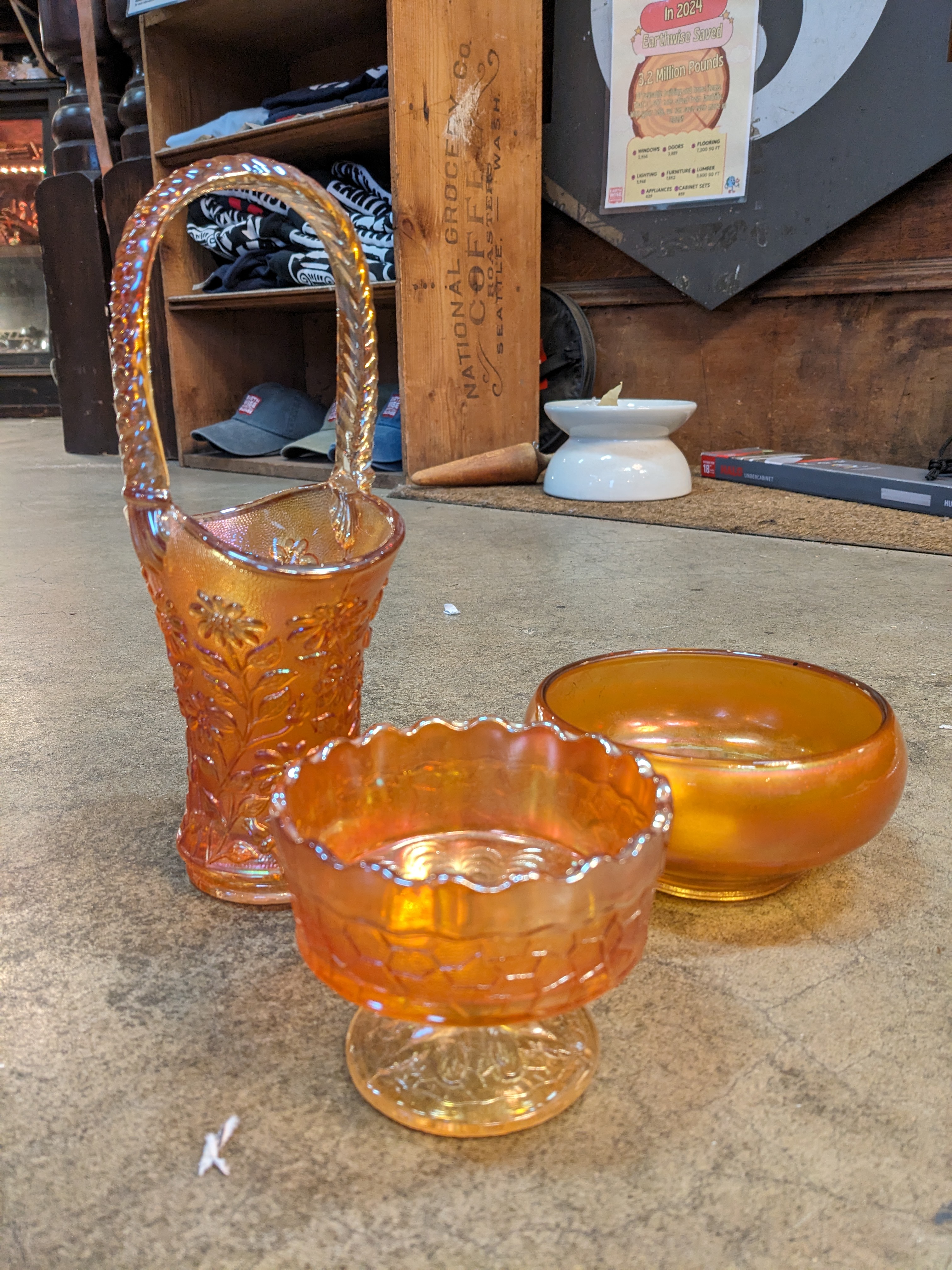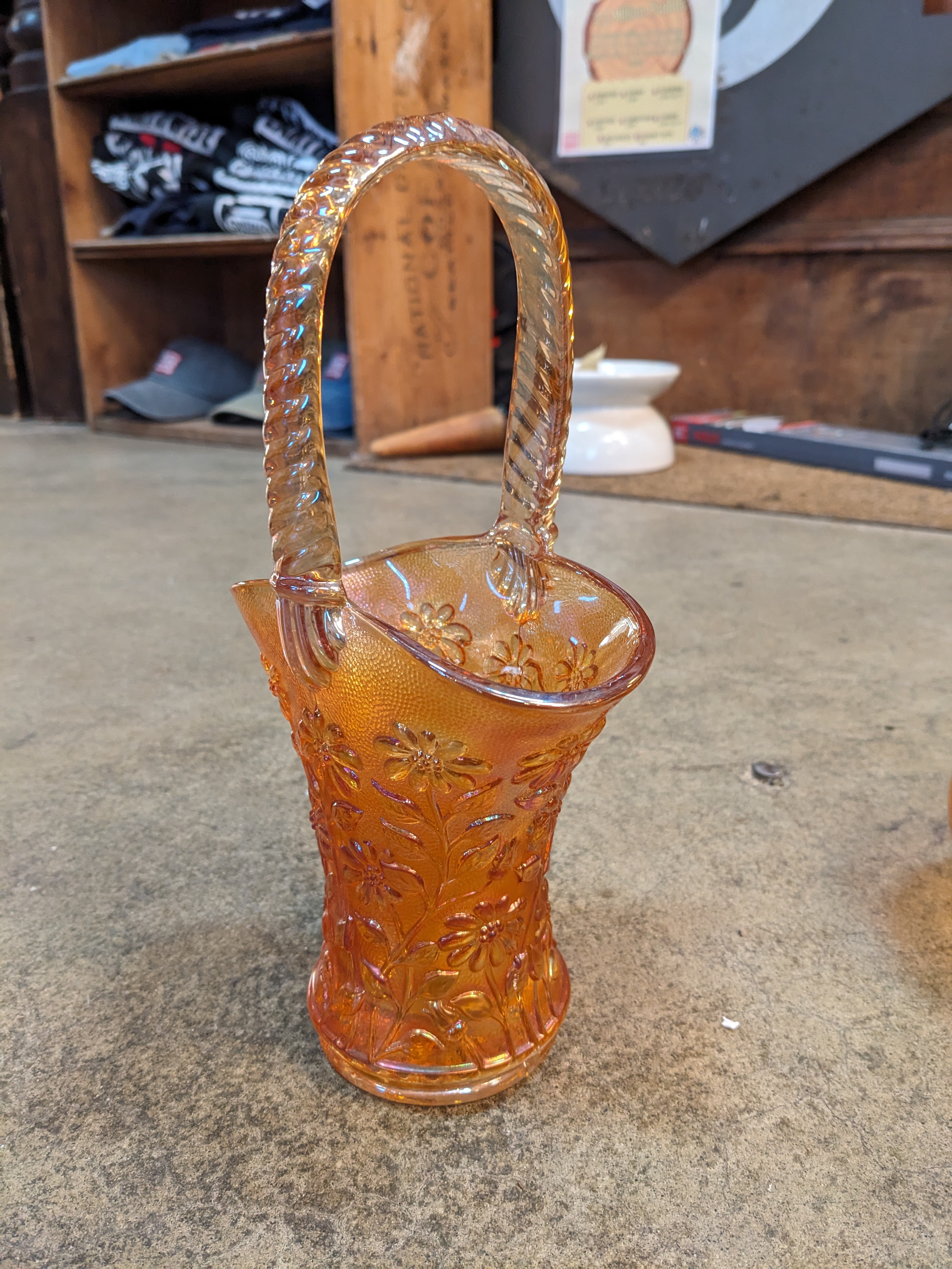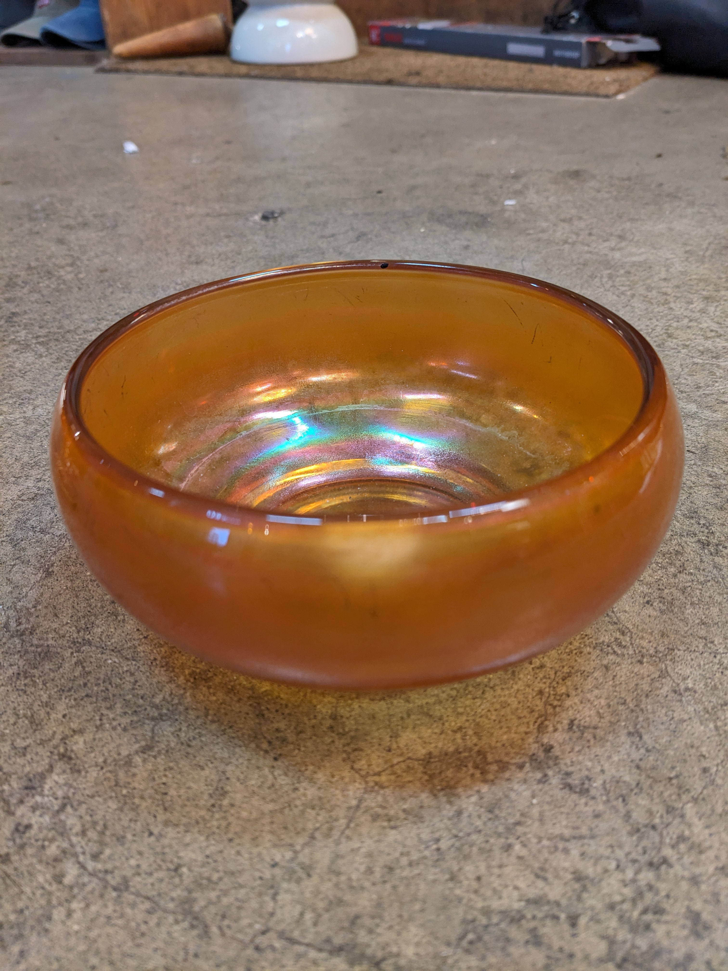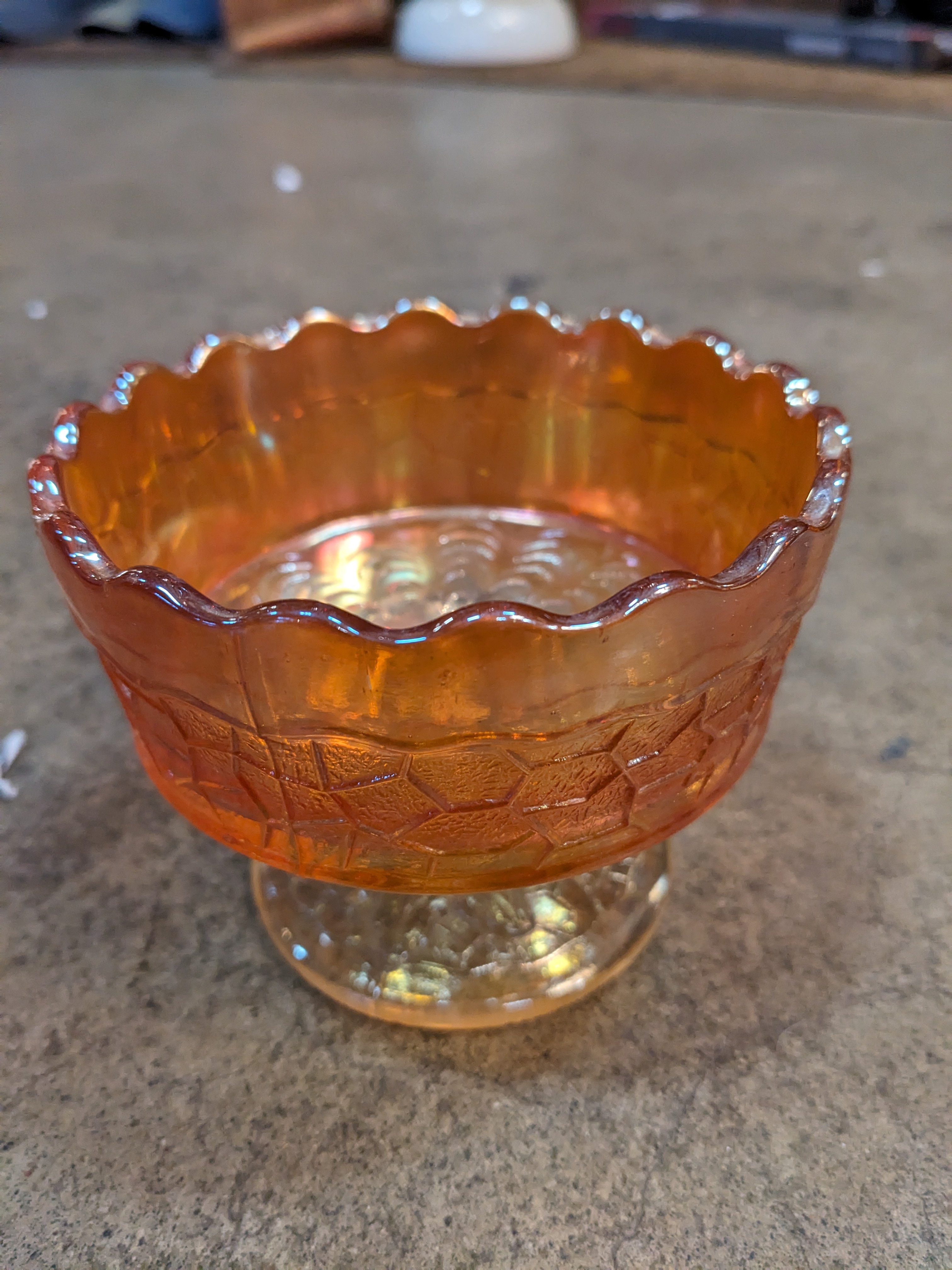 A beautiful rose toned carnival glass. Each piece is unique, making for a great table scape or to add to the collection of glassware. In good condition. No chips or cracking.