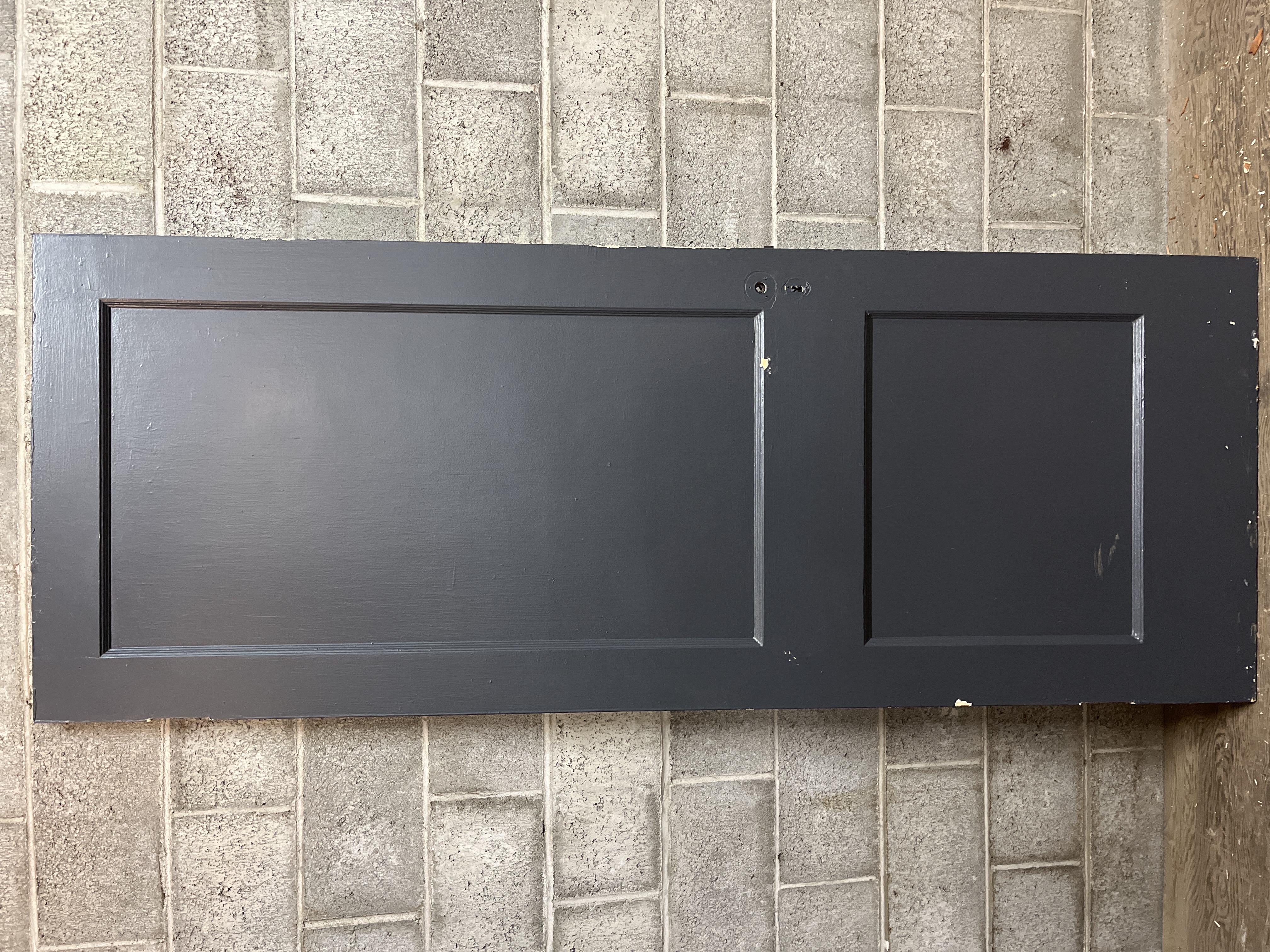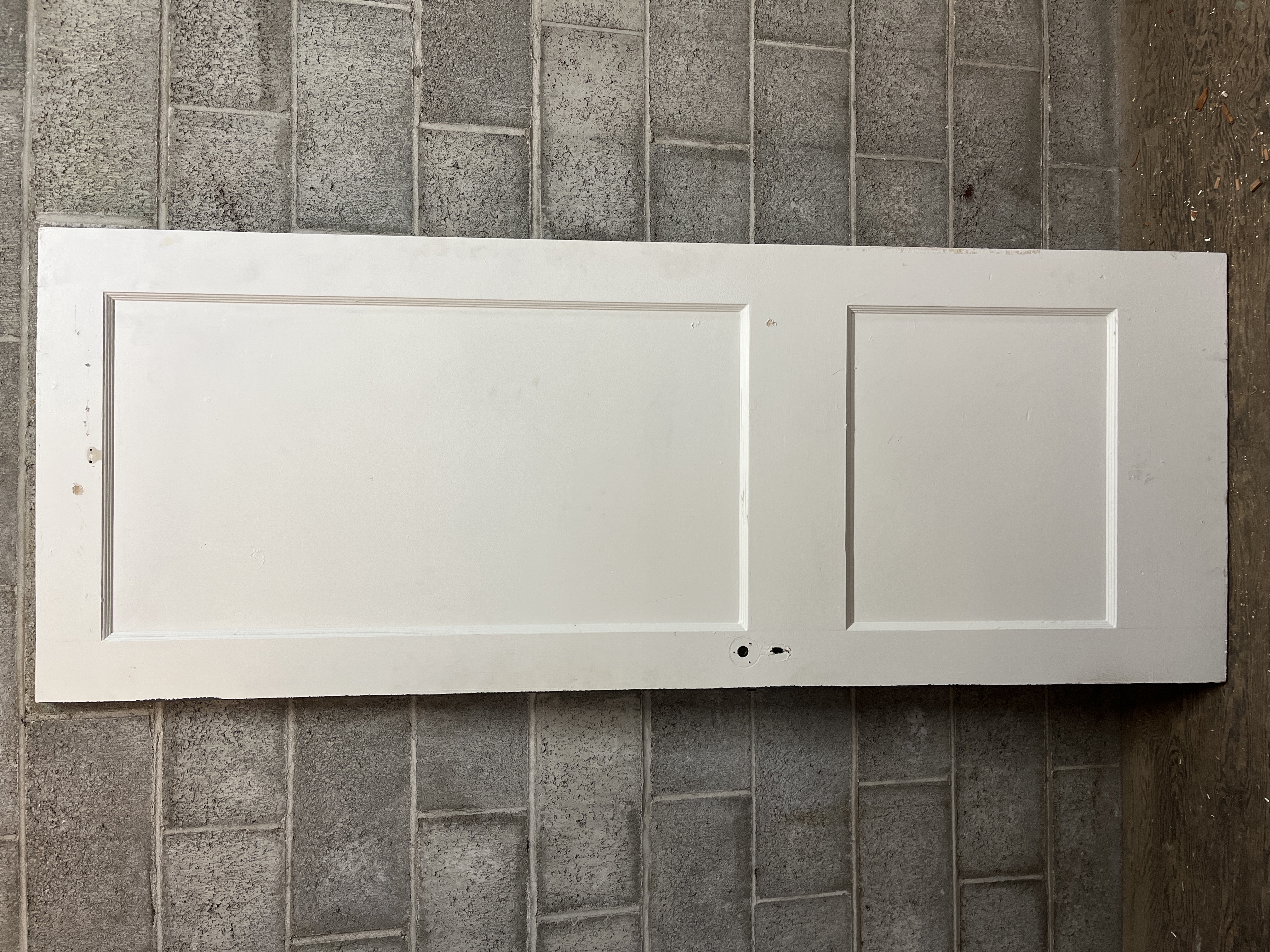 A simple vintage 2 panel door in good shape. This door is a right hand swing, painted white on one side and dark grey on the other. Measures 30 x 78.875 x 1.375 inches.