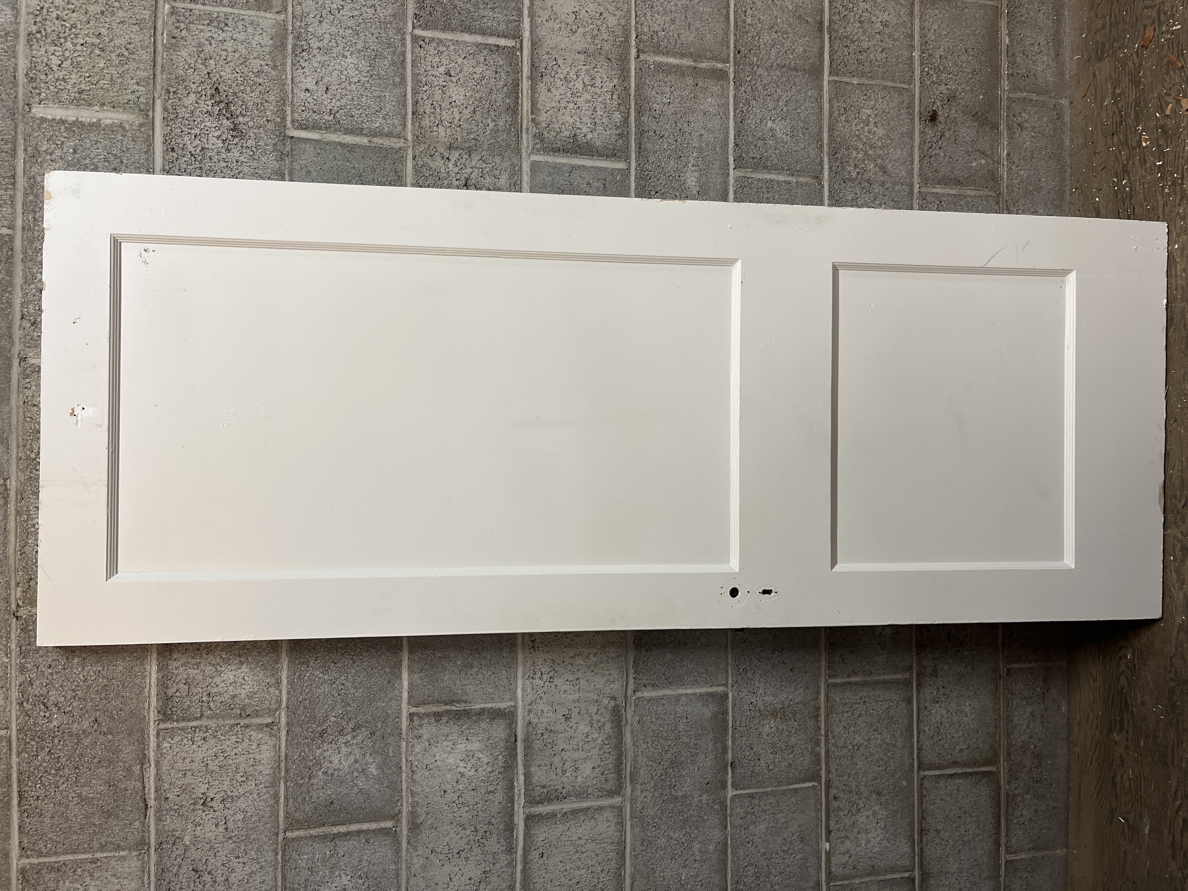 A simple old 2 panel door in pretty nice shape. Door is a right hand swing painted white on both sides. Measures 29.75 x 78.125 x 1.375 inches.
