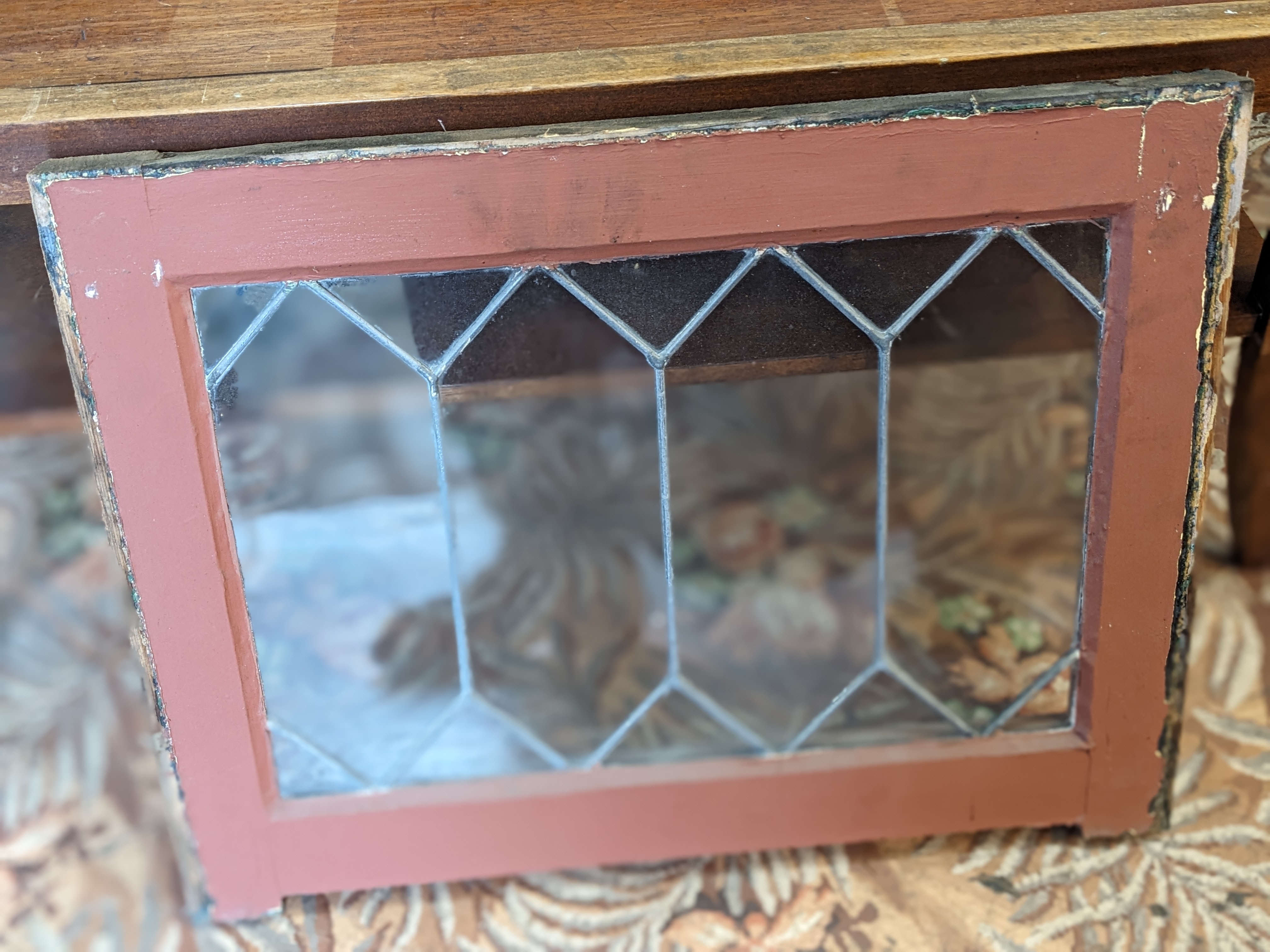The leading and solid fir frame on this window is in tact and in good condition for the age. There are some great imperfections and wavyness in the glass.