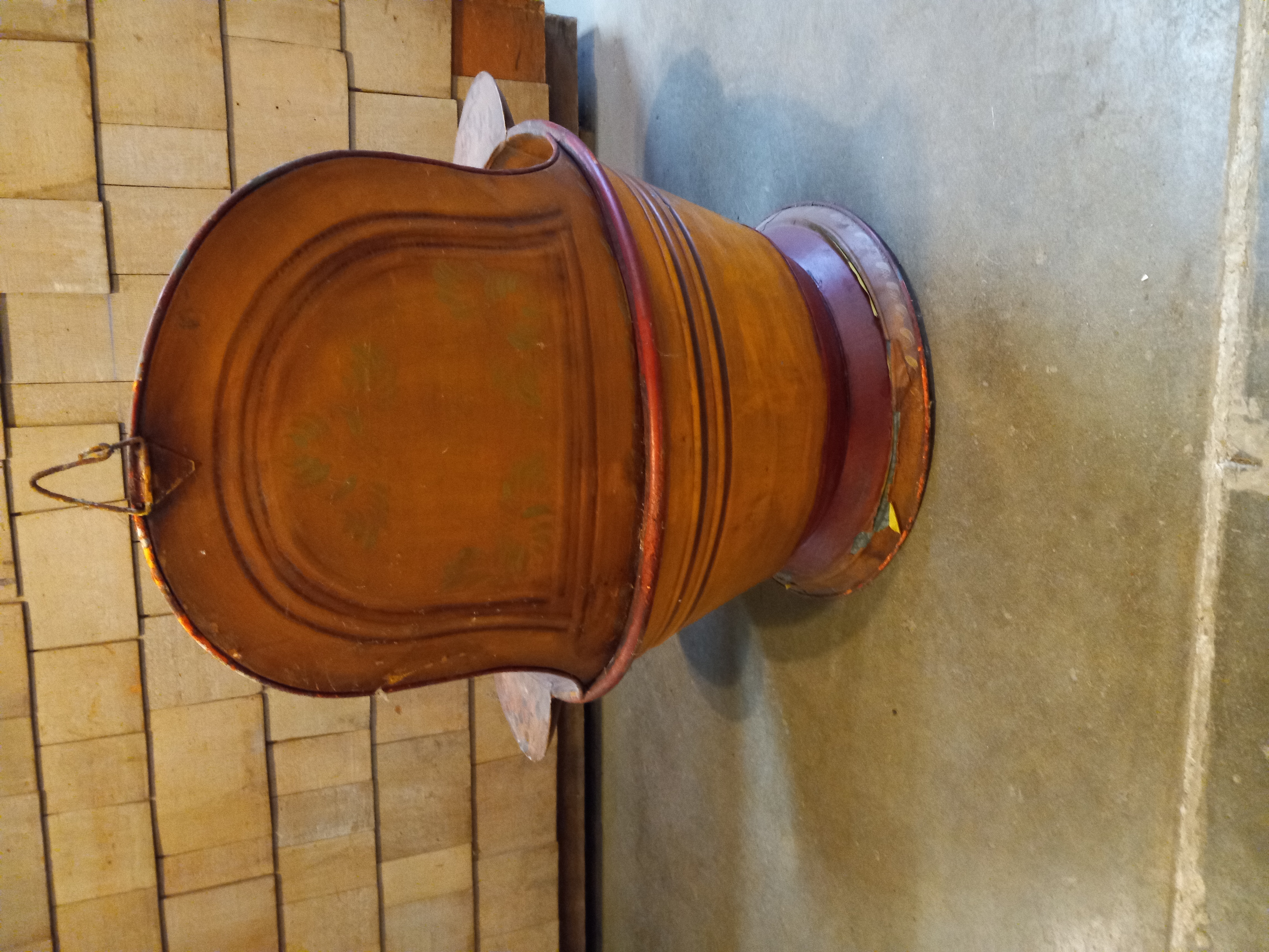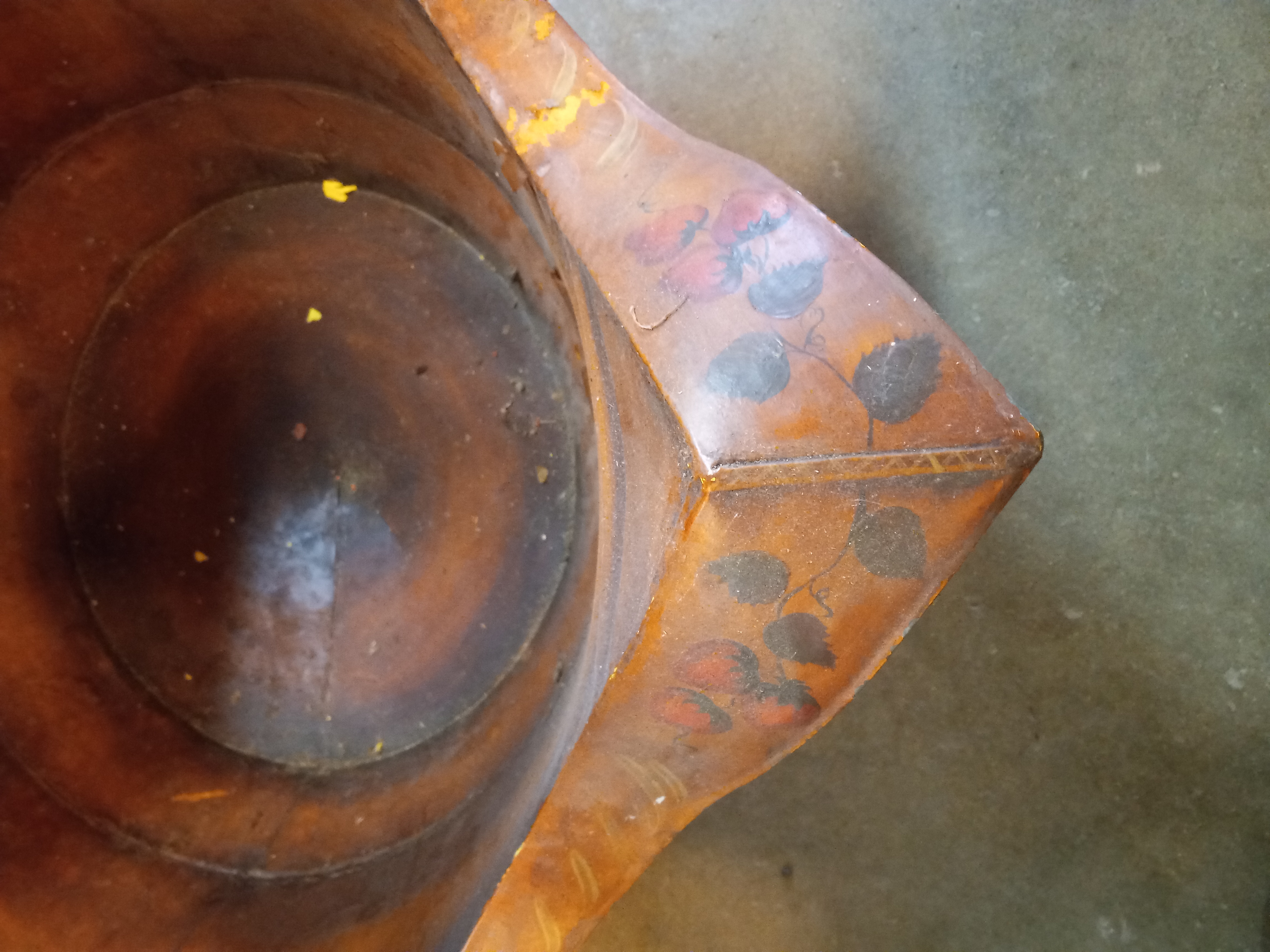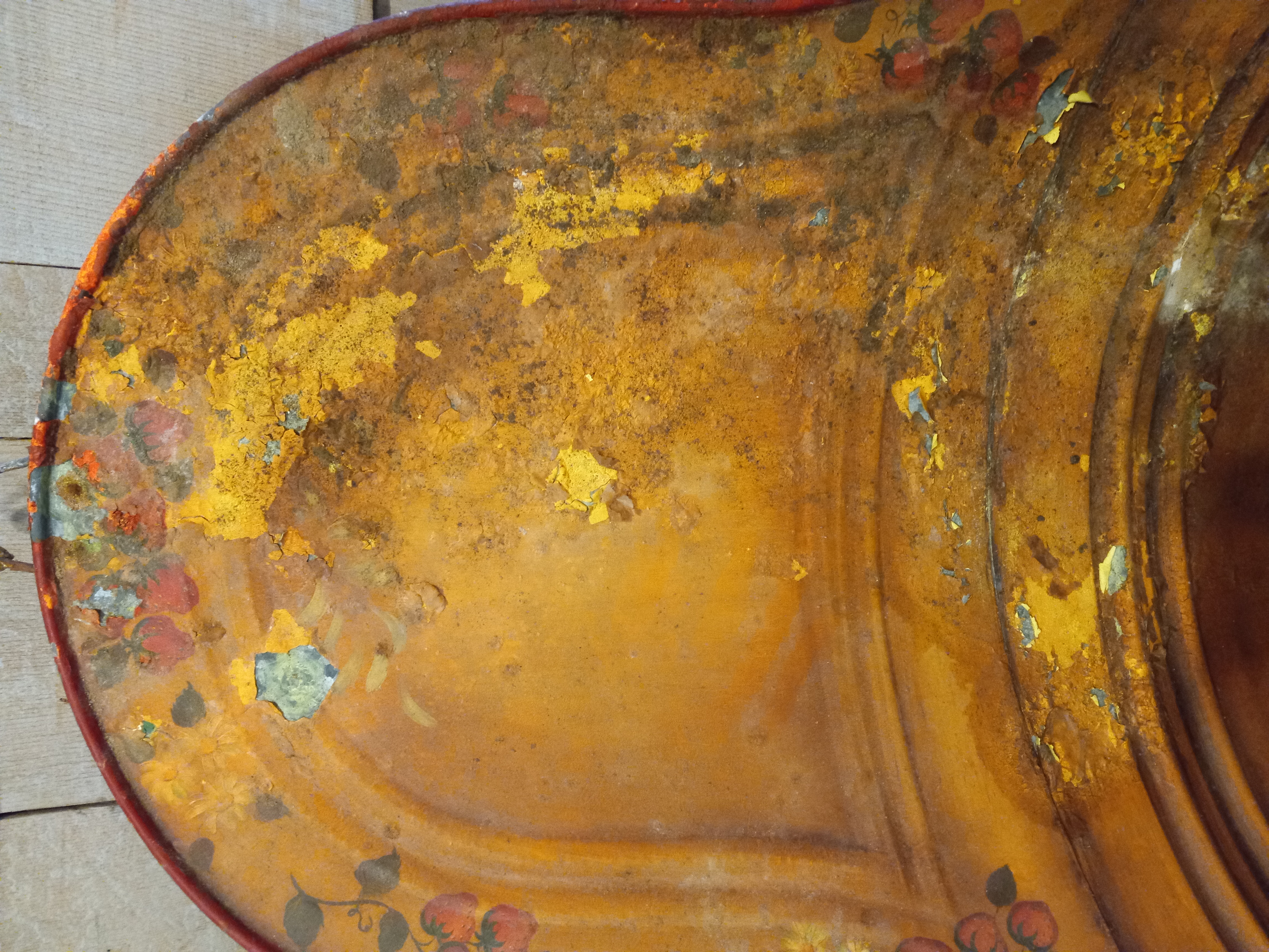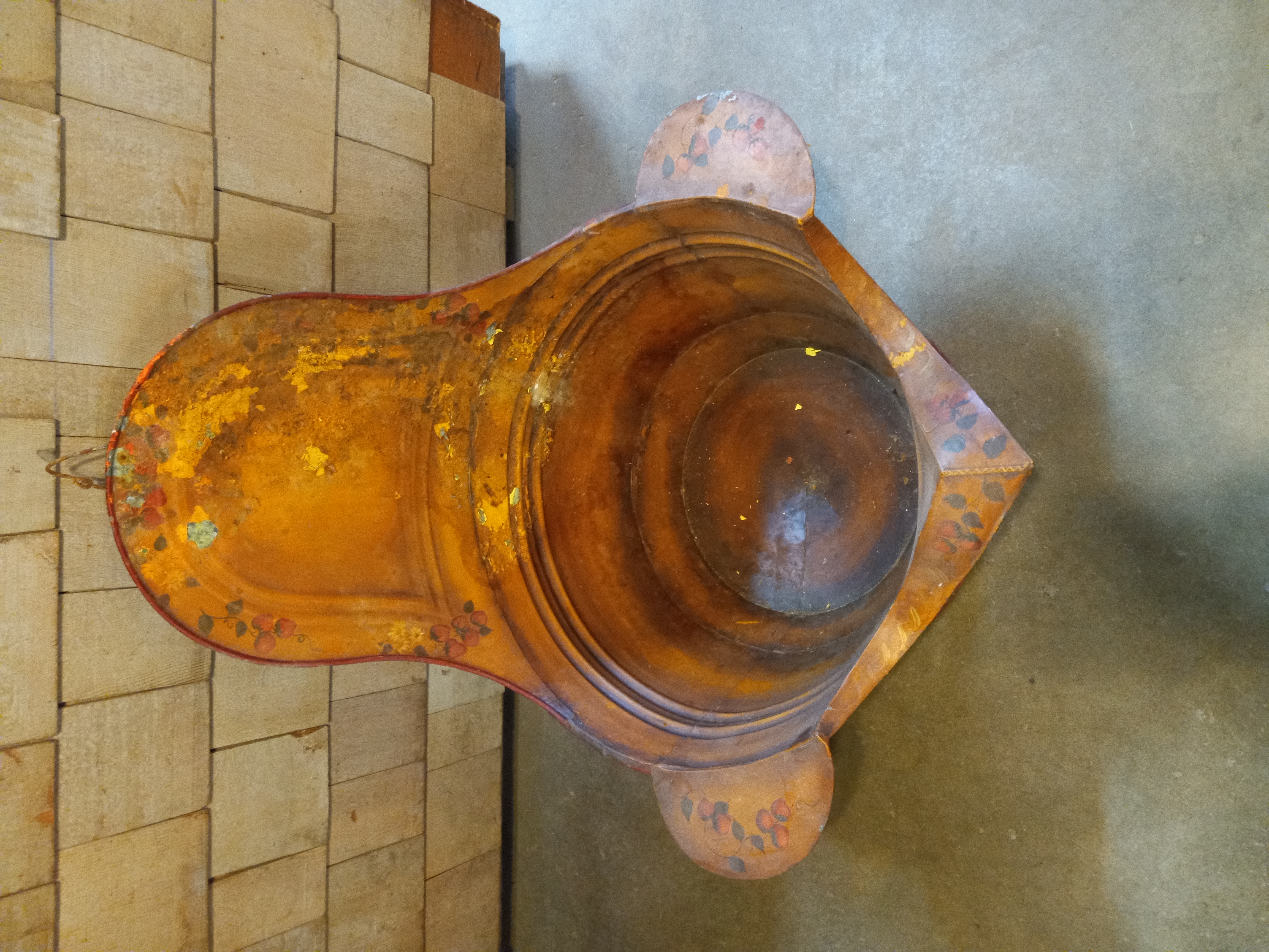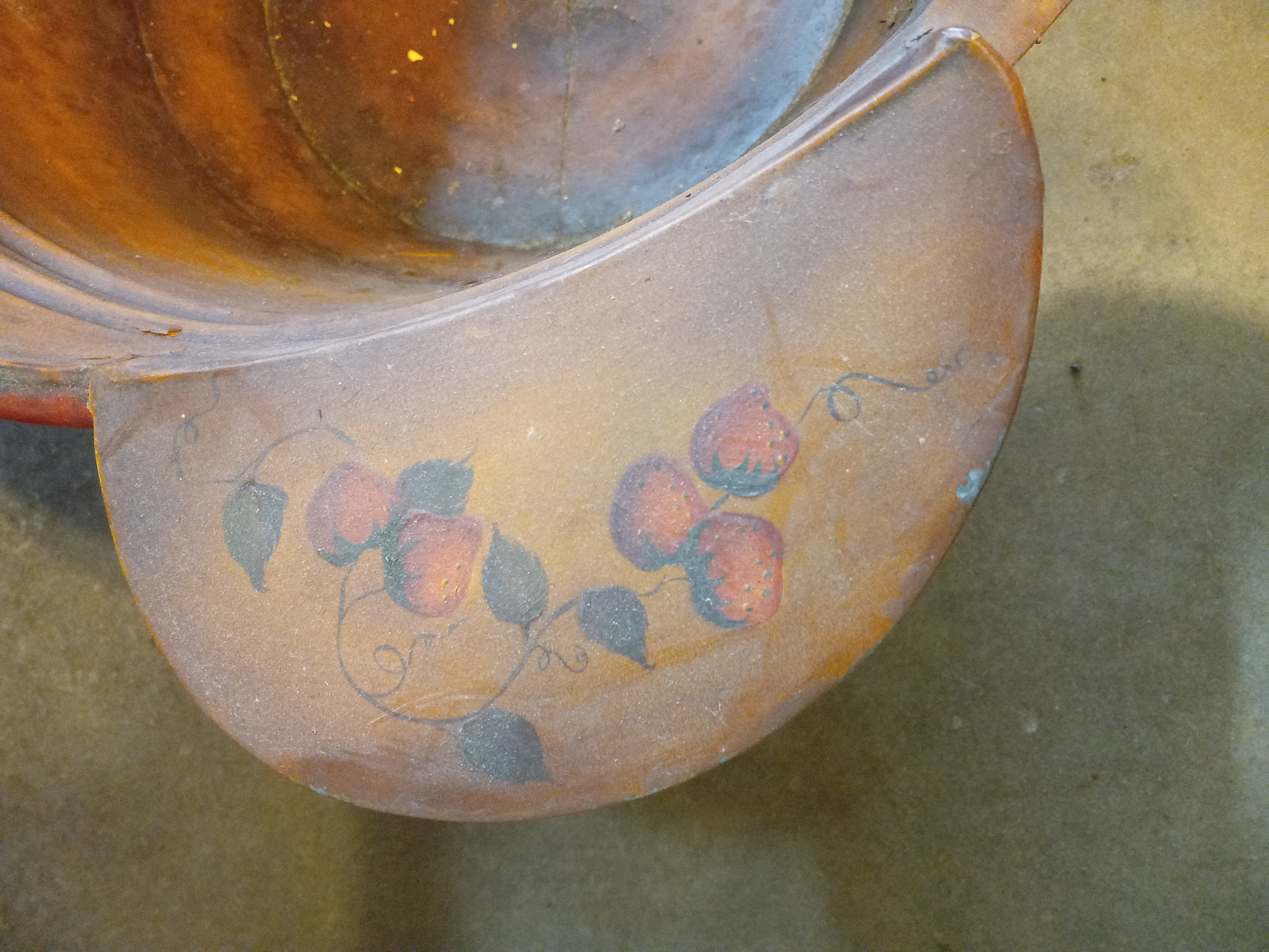 A rare find that'll make your neighbors jealous! It has been hand painted with strawberries and a copper color. It has a lot of patina and paint flaking off, but that just adds to its country charm. It has a hook welded to it, so it may have been used as a planter or could be. Take it home before someone else does! It measures 31.75 inches at the widest point and 29.75 inches high.