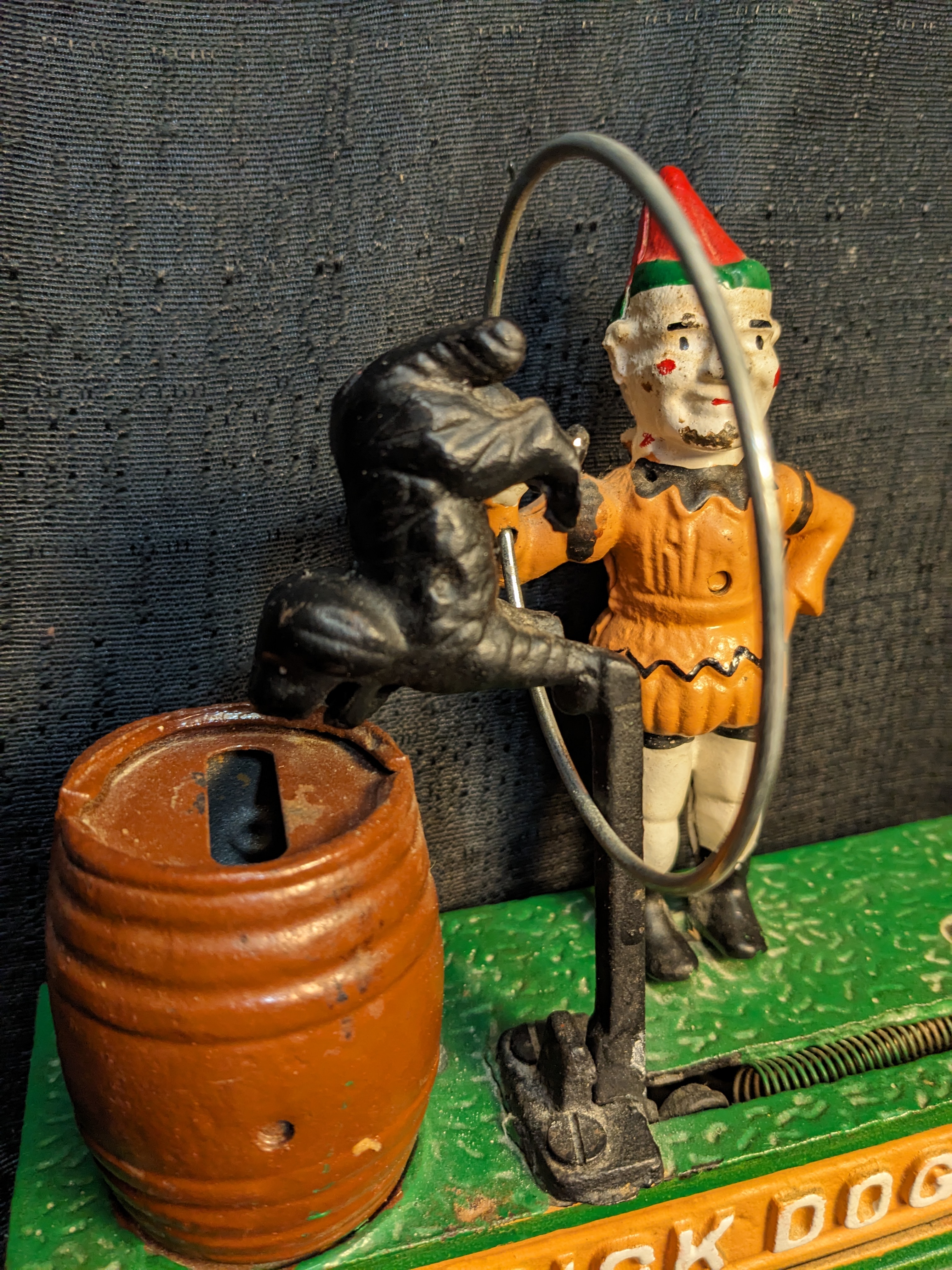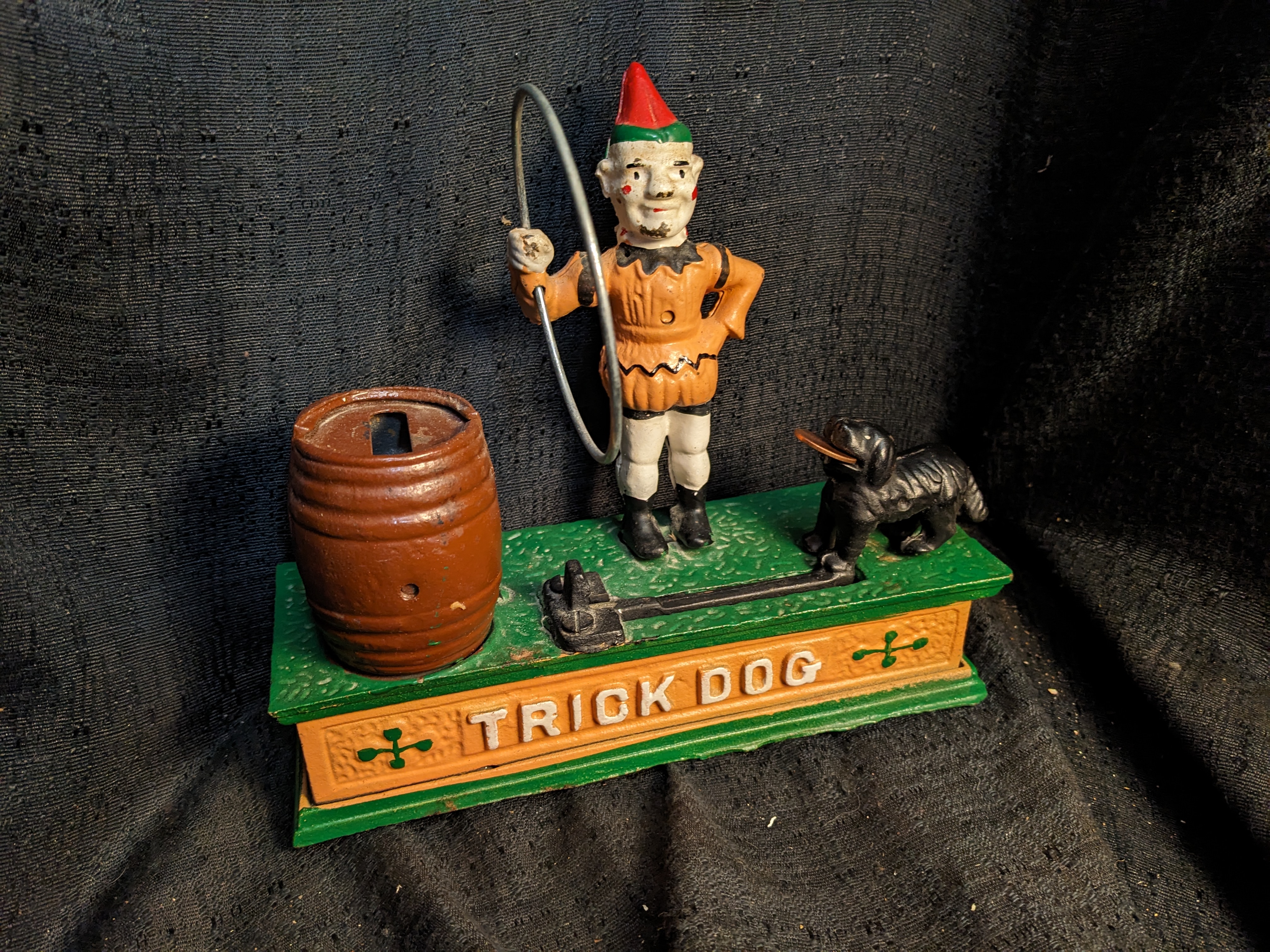 This Vintage B & P Trick Dog Mechanical Bank is a collectible item made of cast iron. This bank is fully functional; push a button and watch the little iron dog jump through the hoop! Makes saving your no-longer-in-circulation pennies fun! The B & P brand adds to the authenticity and charm of this particular piece, making it a sought-after item for collectors of cast iron mechanical banks.