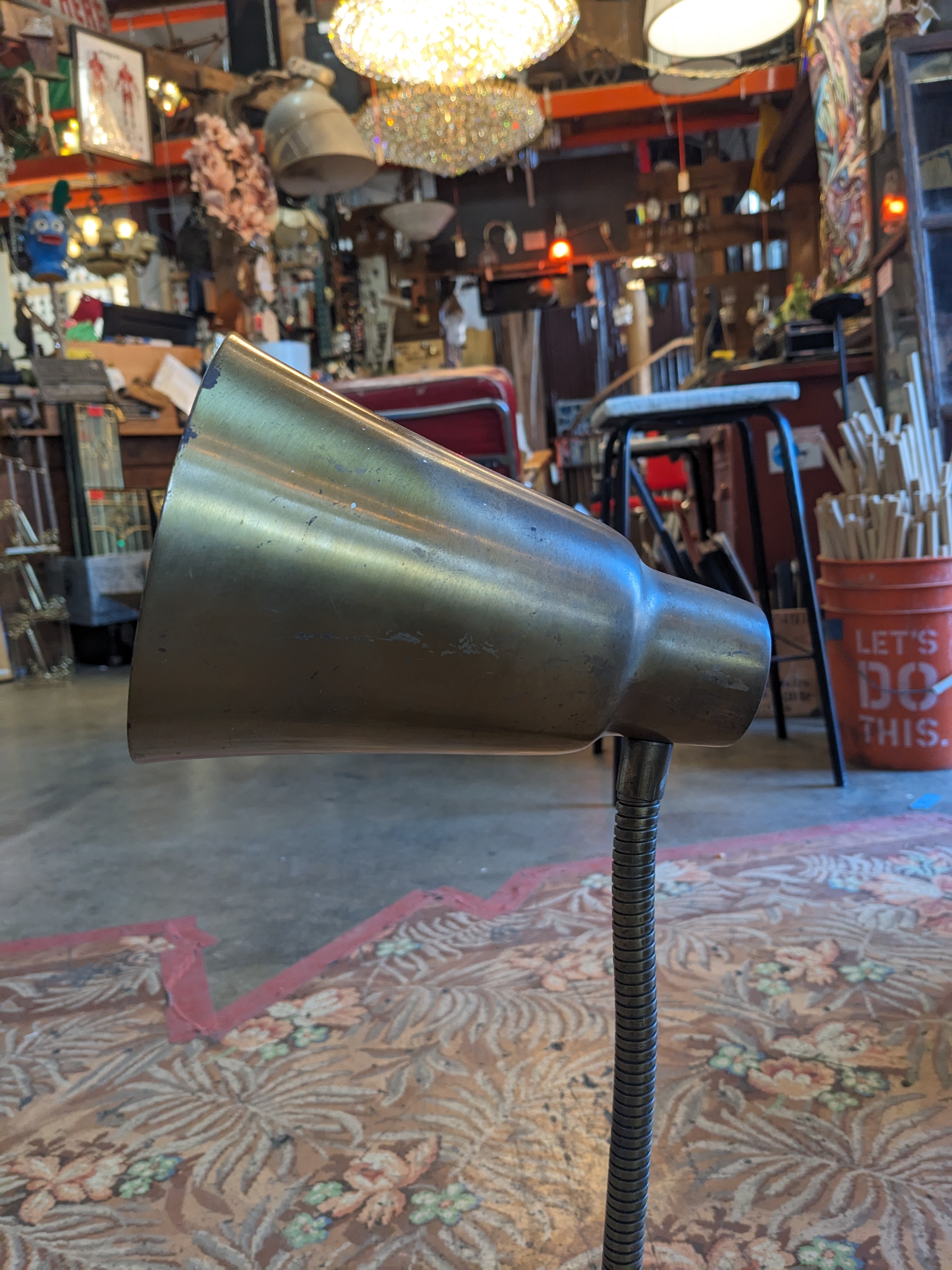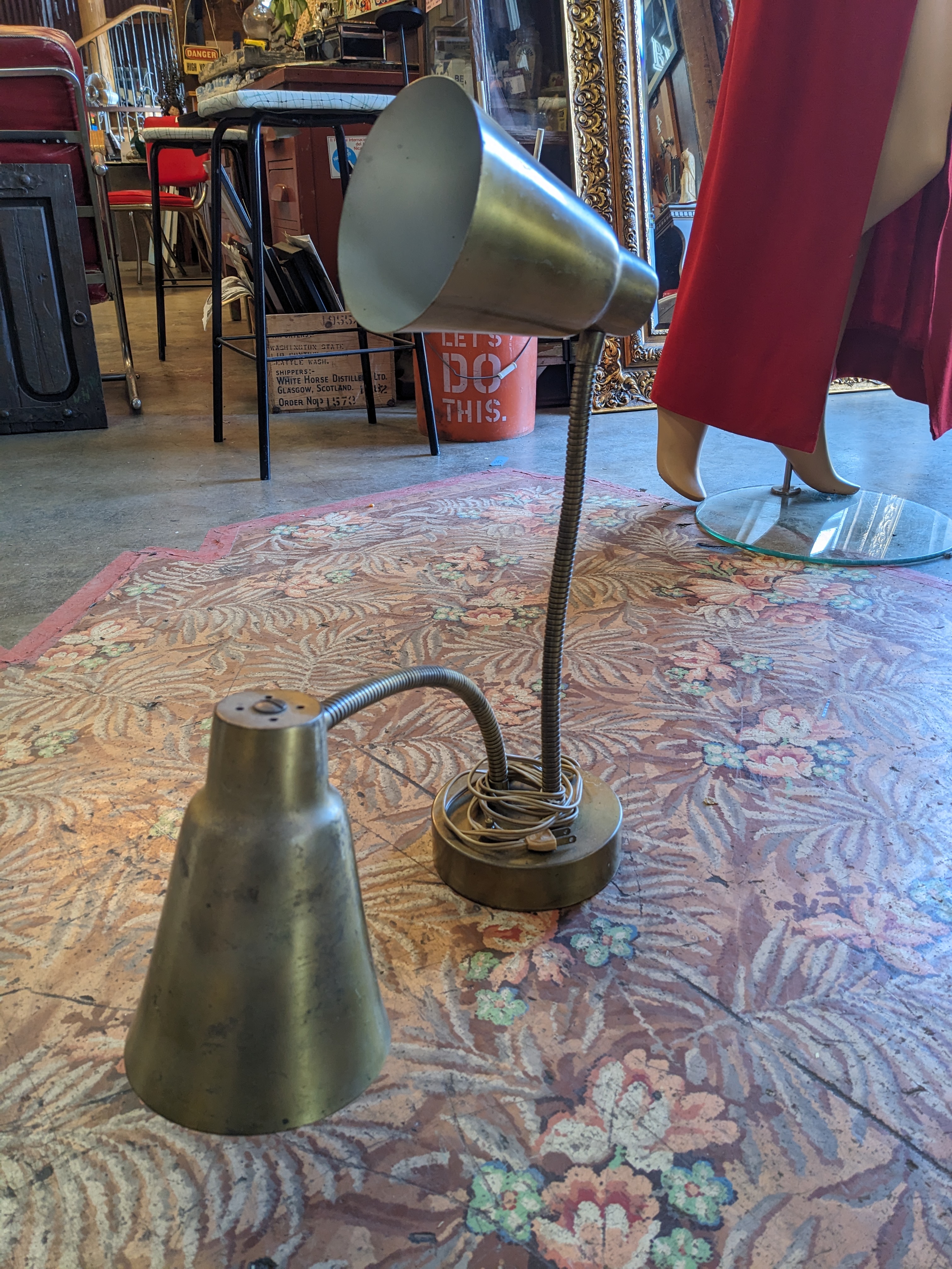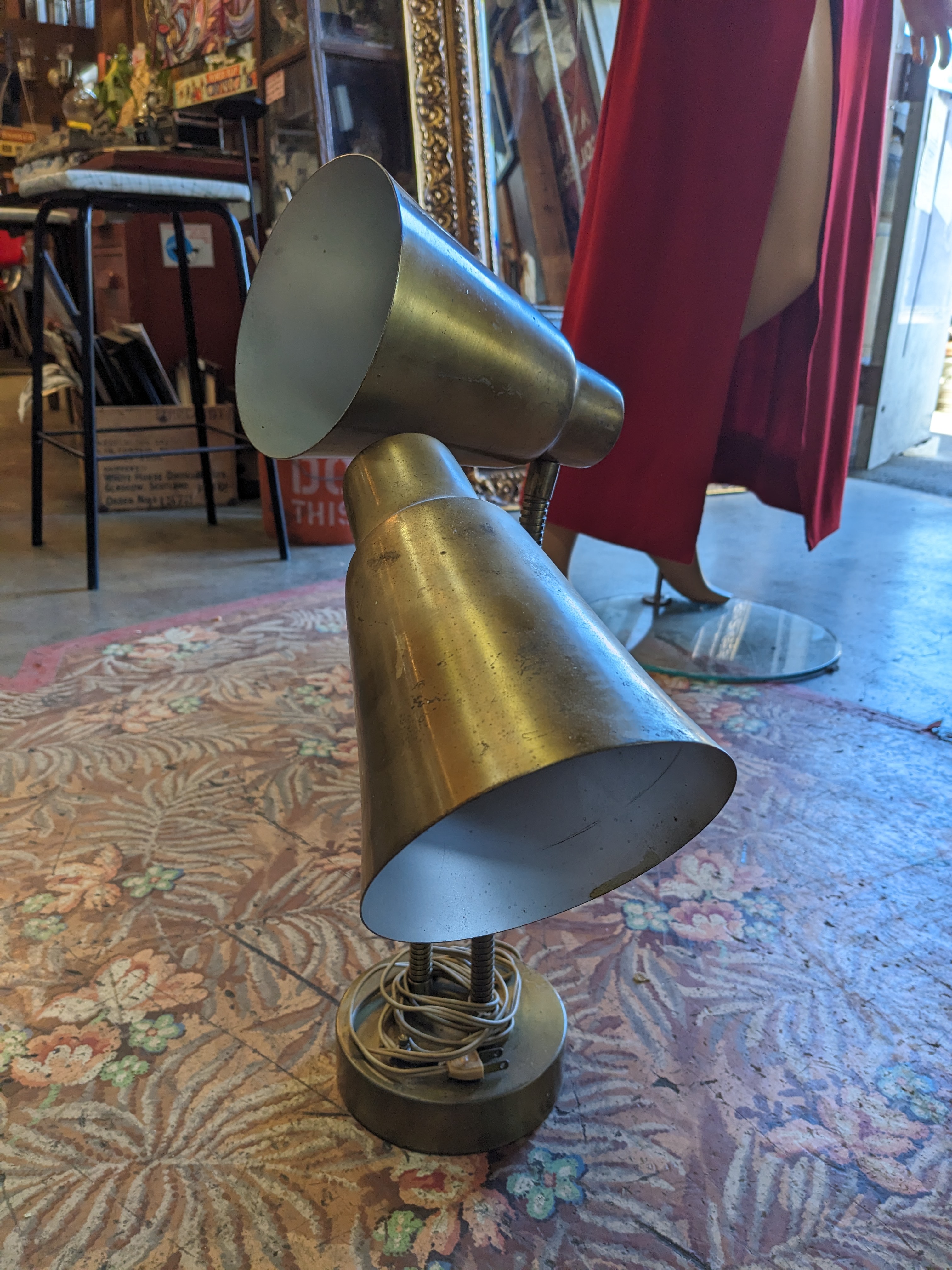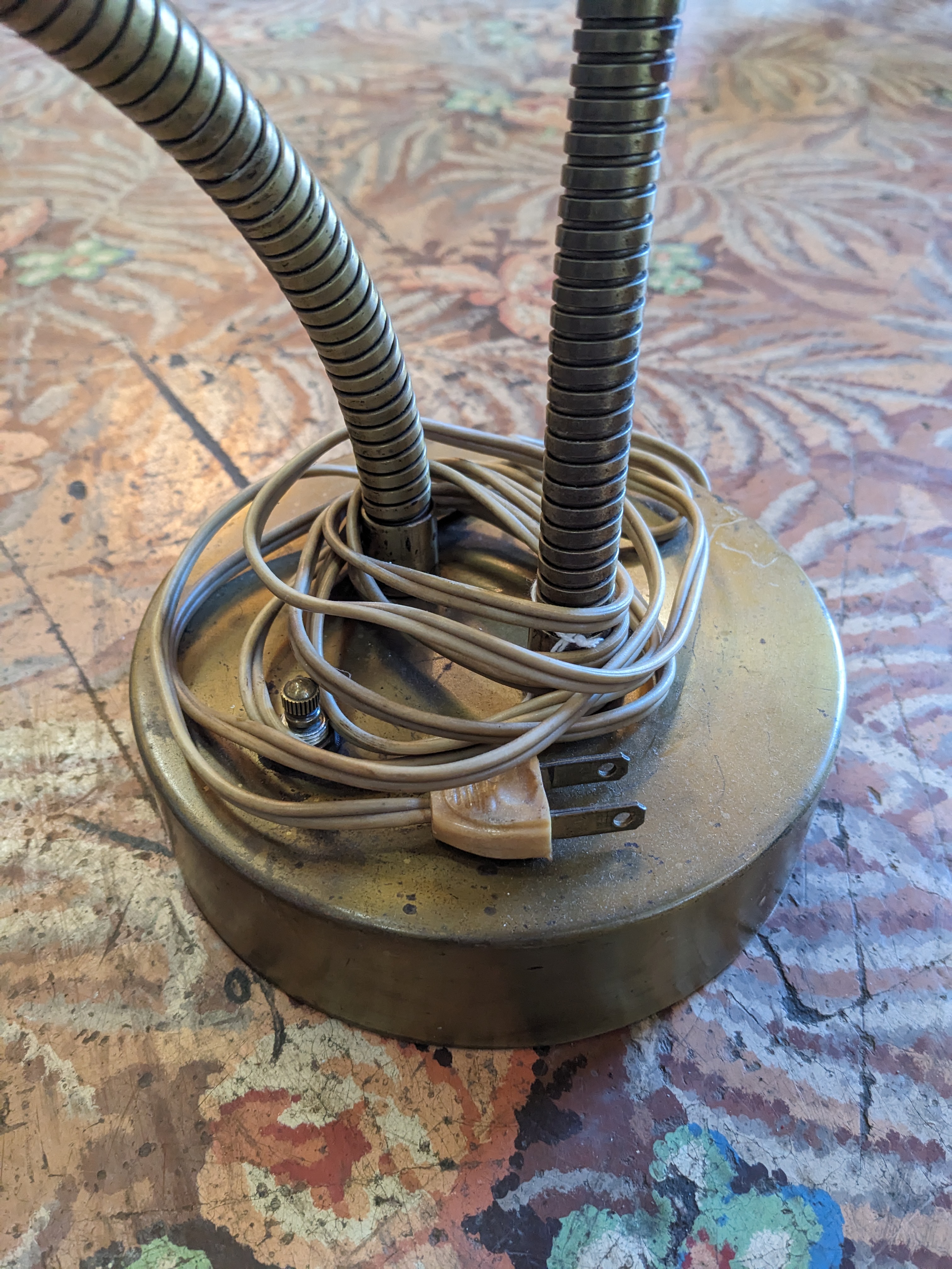 A great vintage double good neck table lamp, great for any desk, perfect for the MCM home. A beautiful patina throughout. Can be polished to bring back its original shine. In good condition.