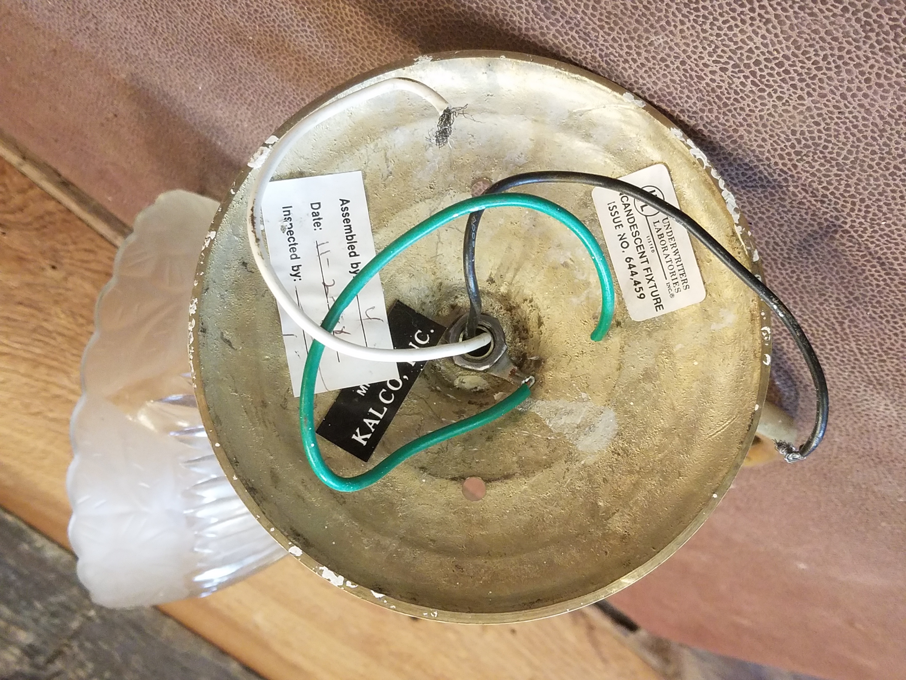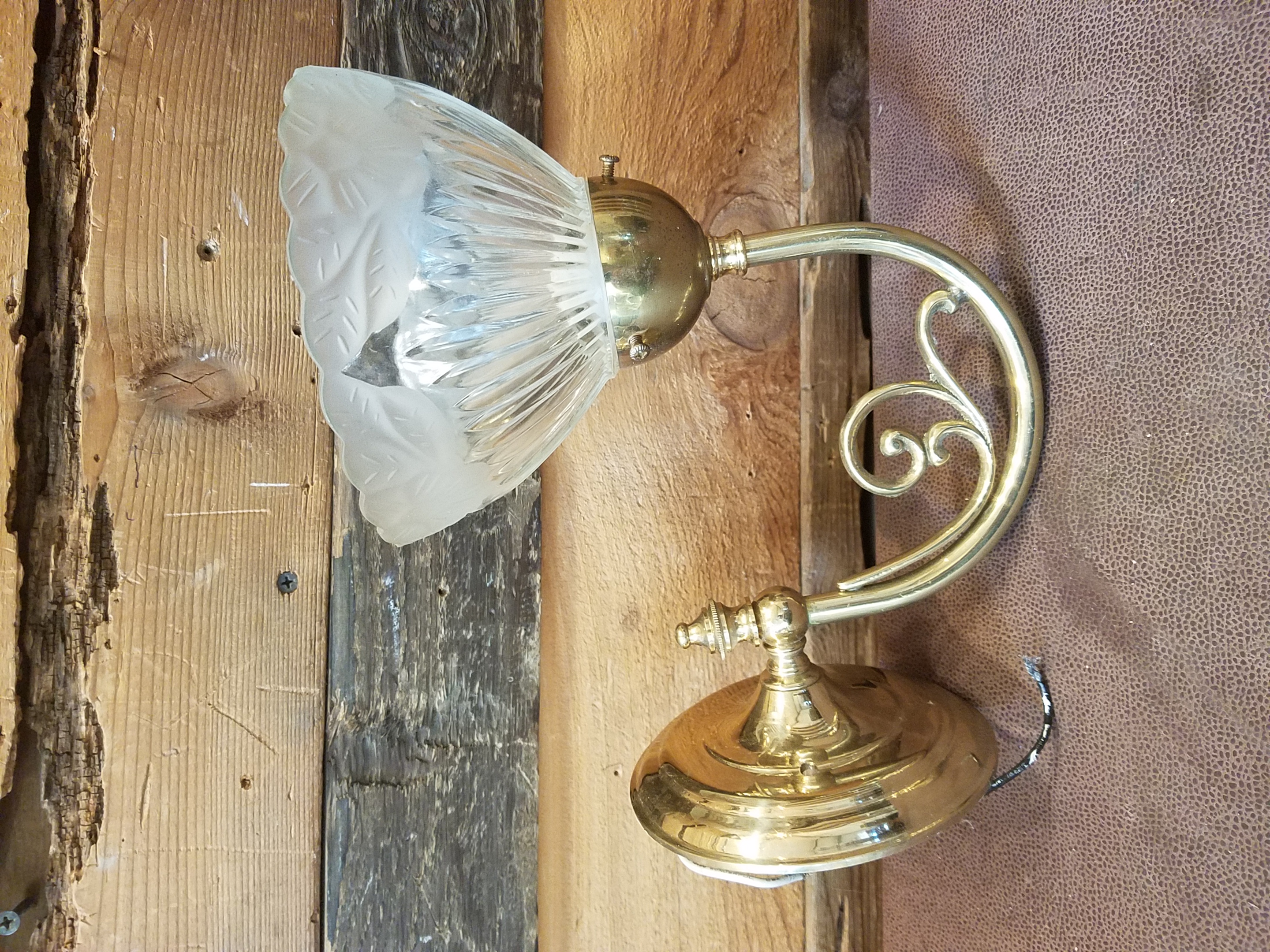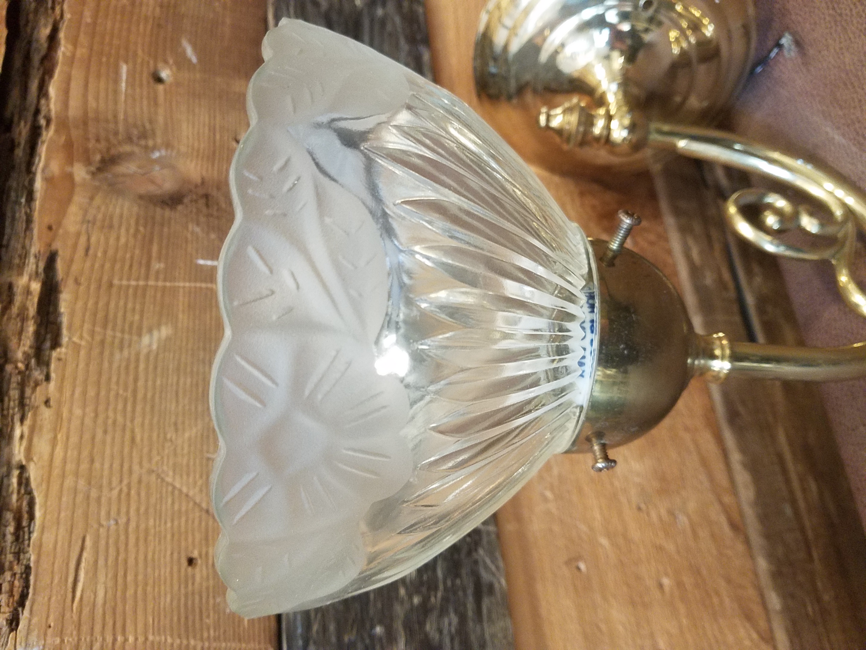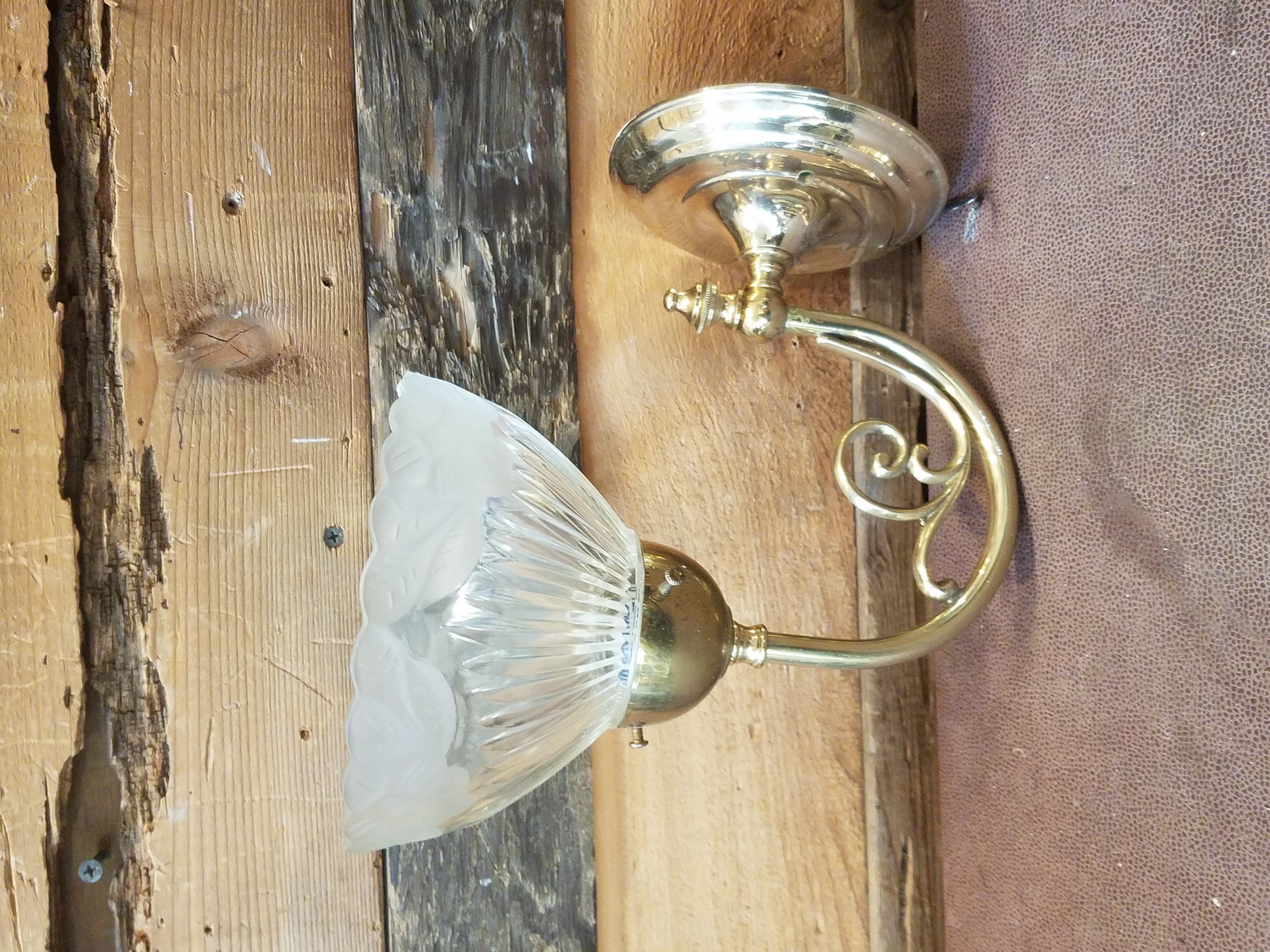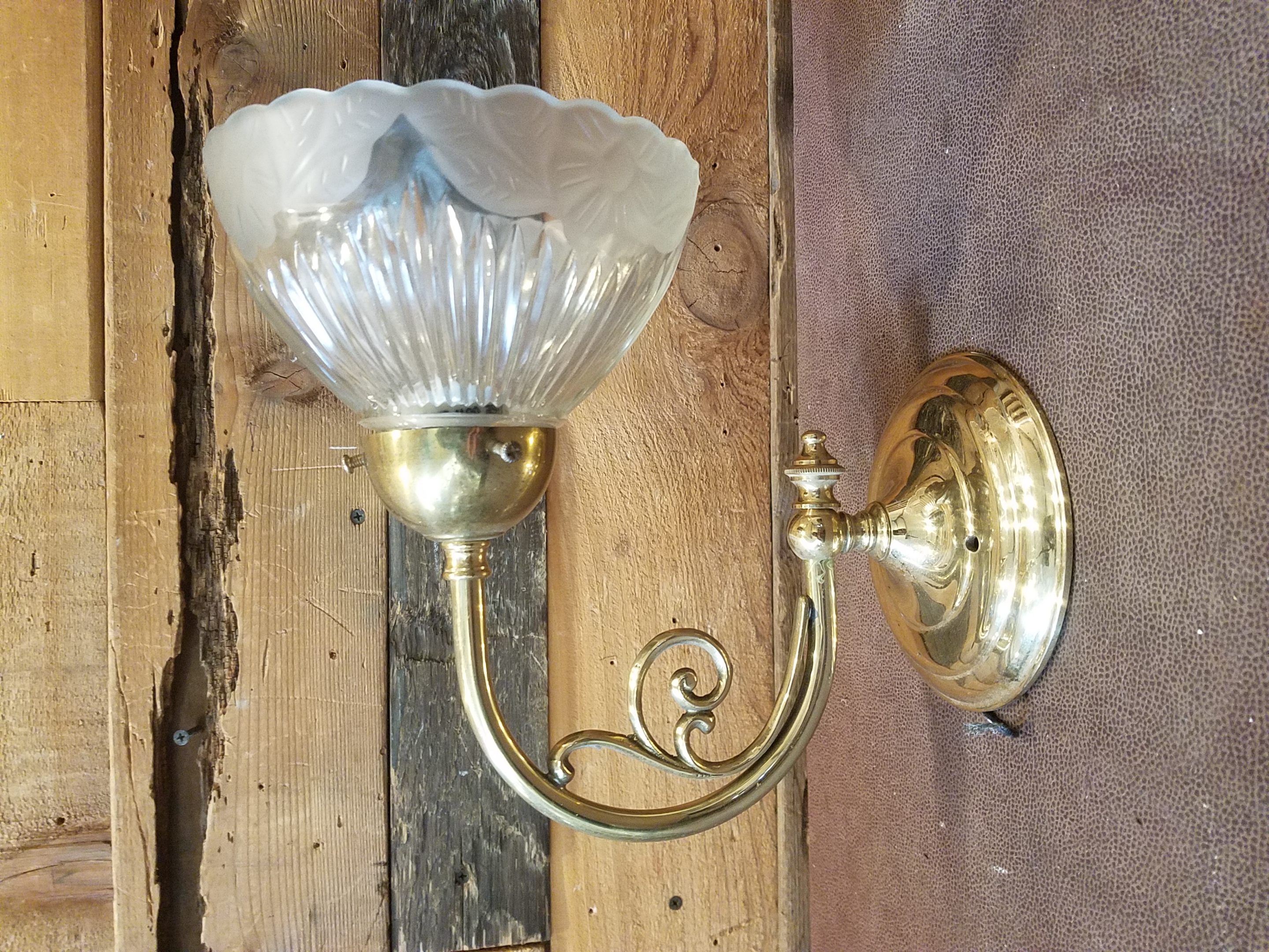 Lovely vintage sconce with an elegant, gleaming brass fixture adorned with beautiful shades with frosted floral designs.