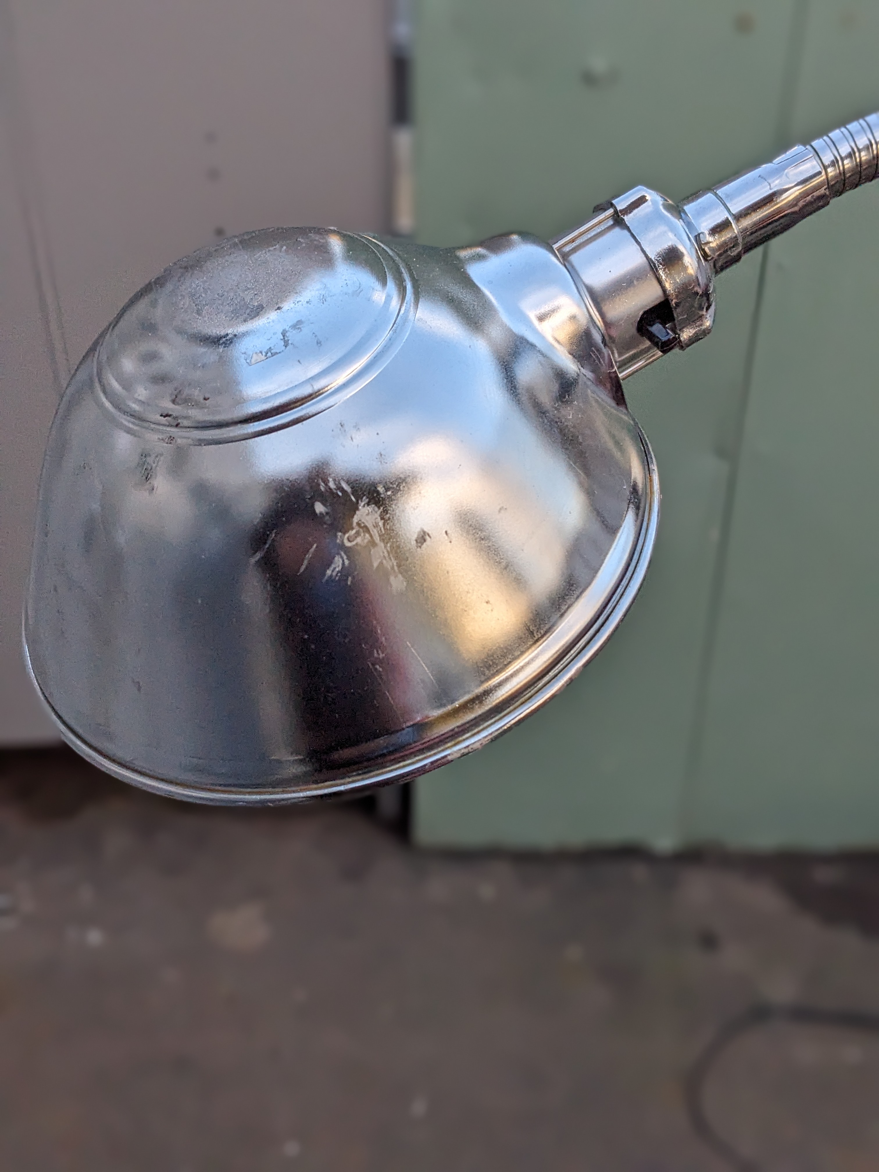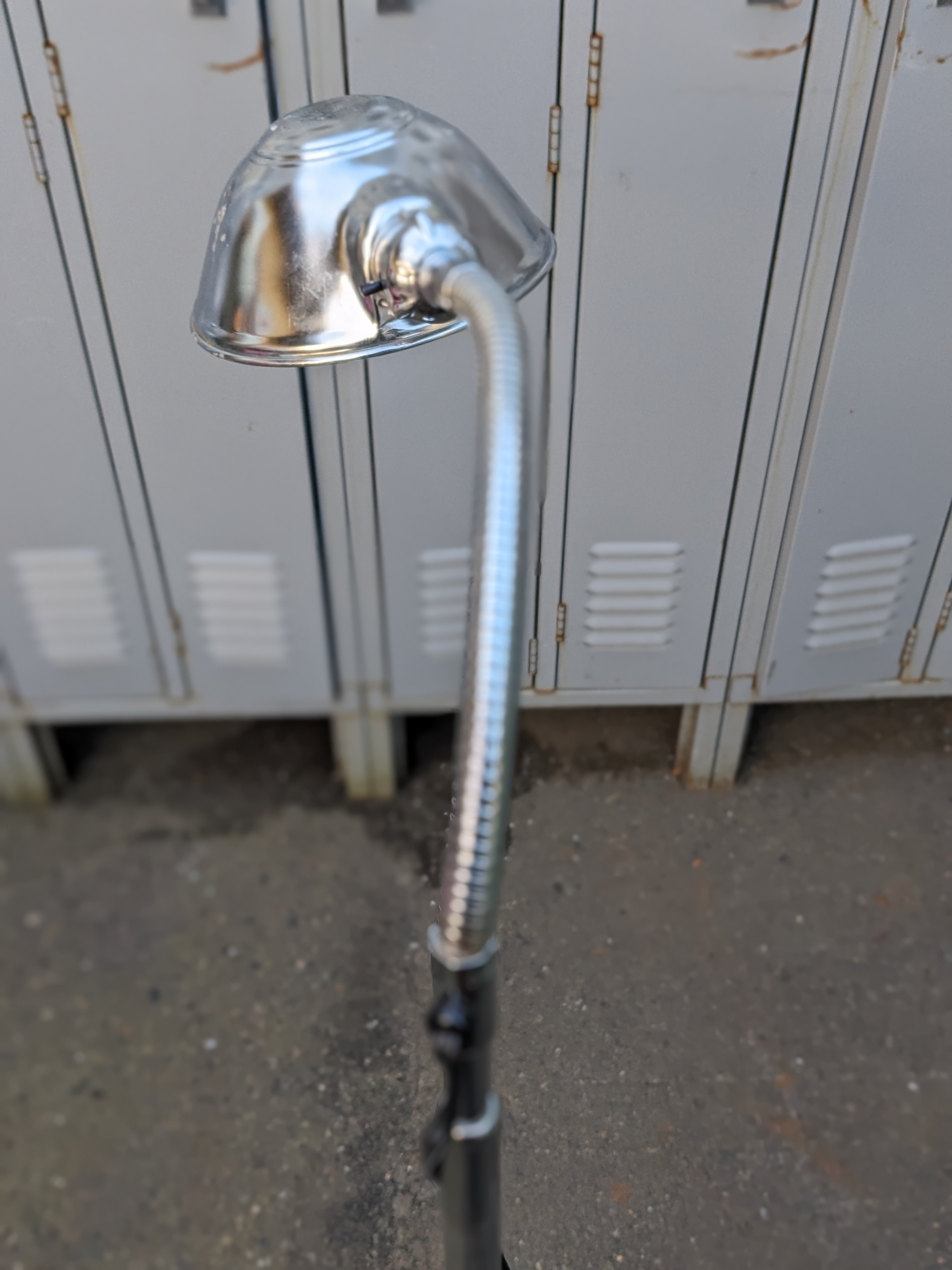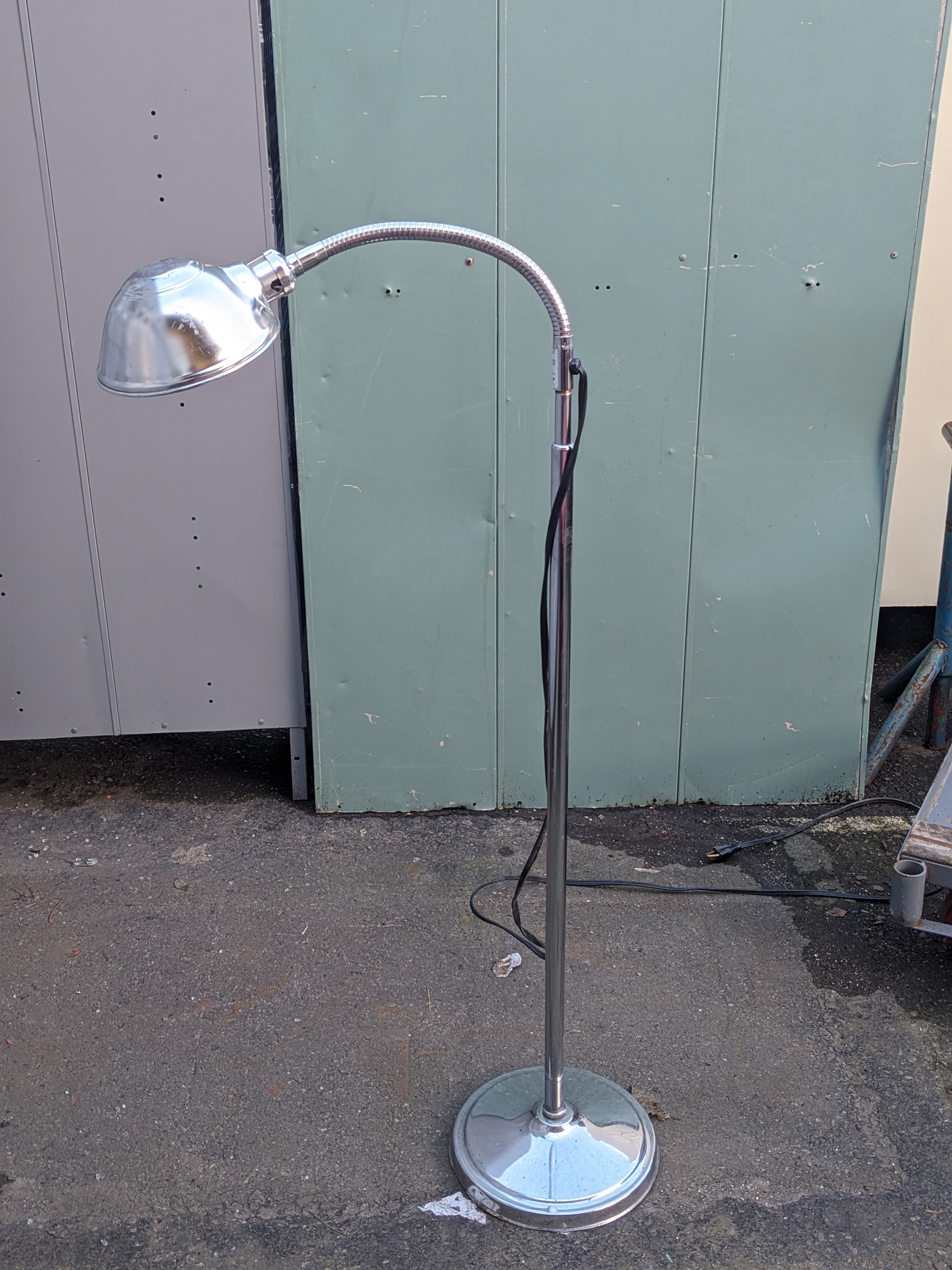 It adjusts up and down. Max extension is 66 inches. It's lowest is 35 inches. It has a bendable goose neck and a clamshell style shade. Perfect for putting light on a project or for reading, etc.