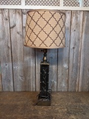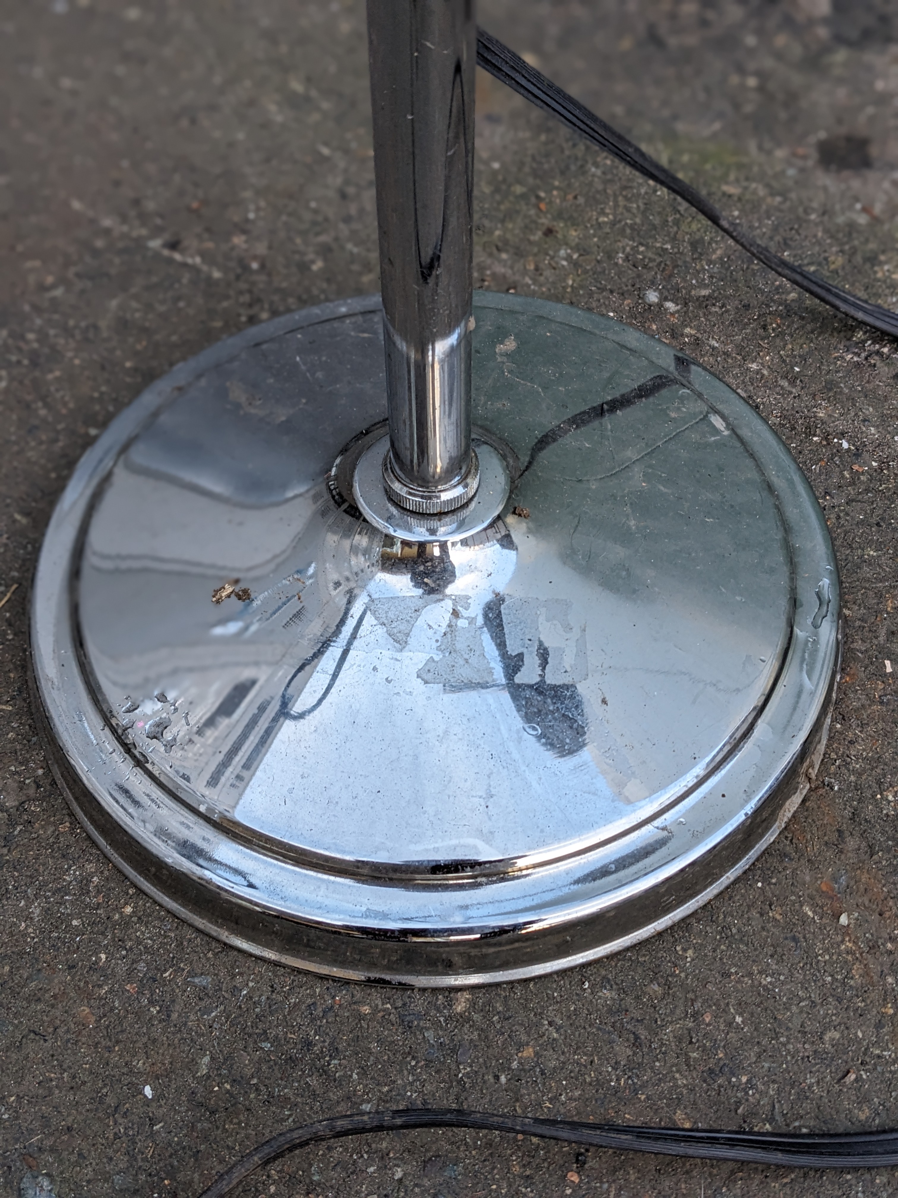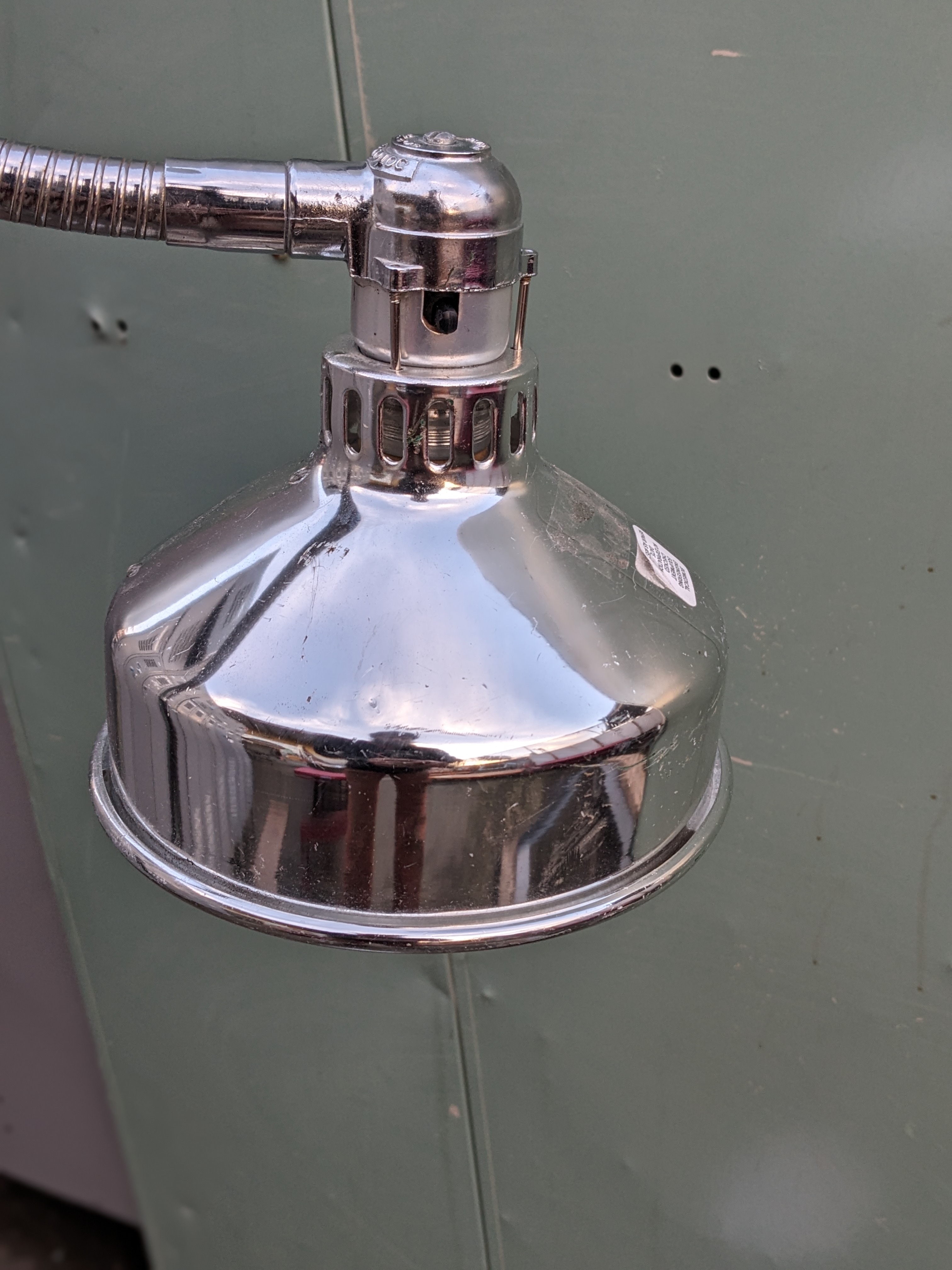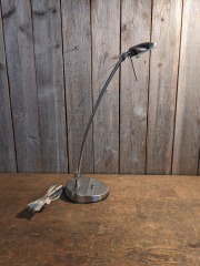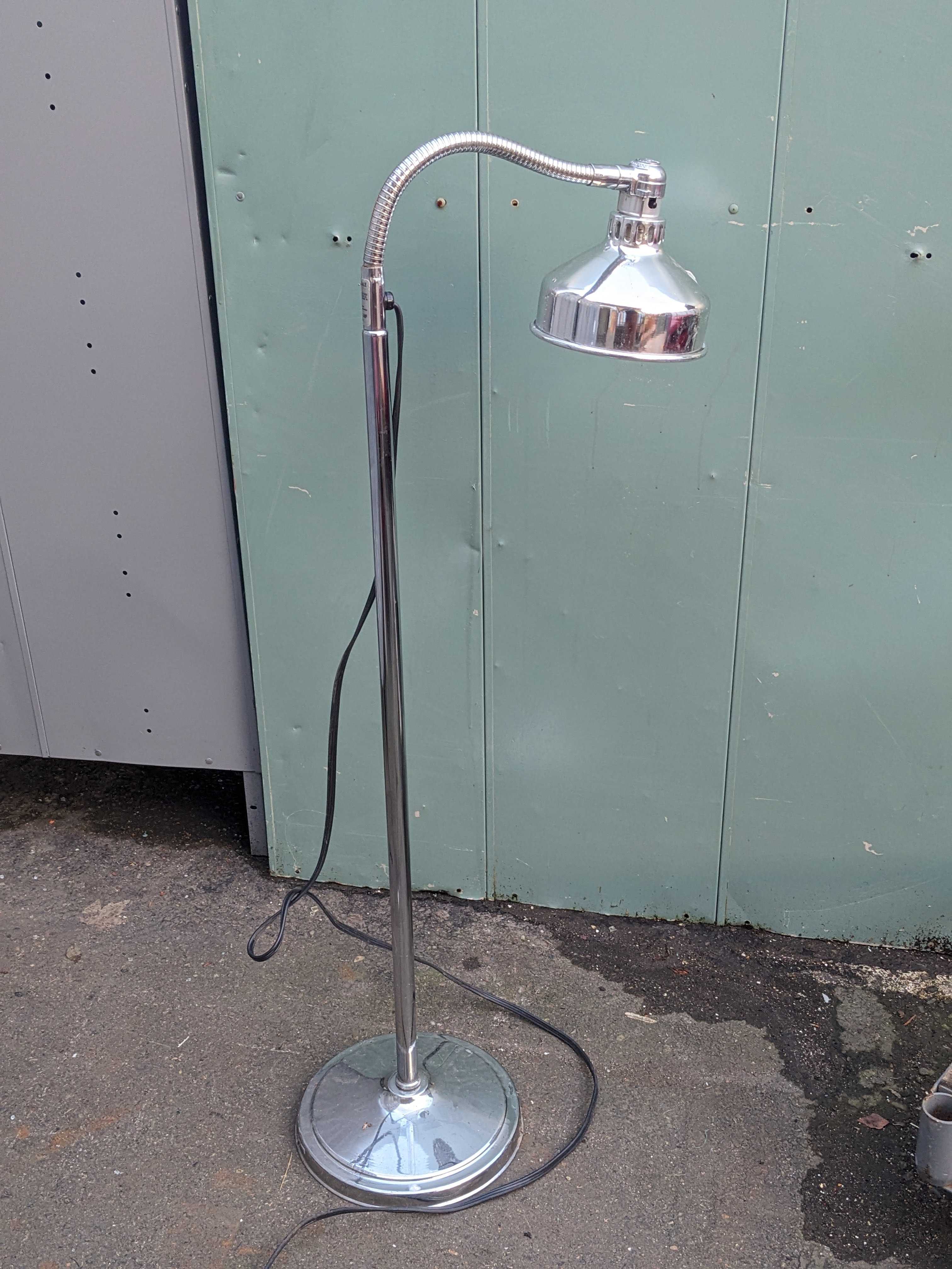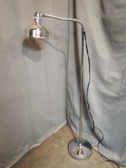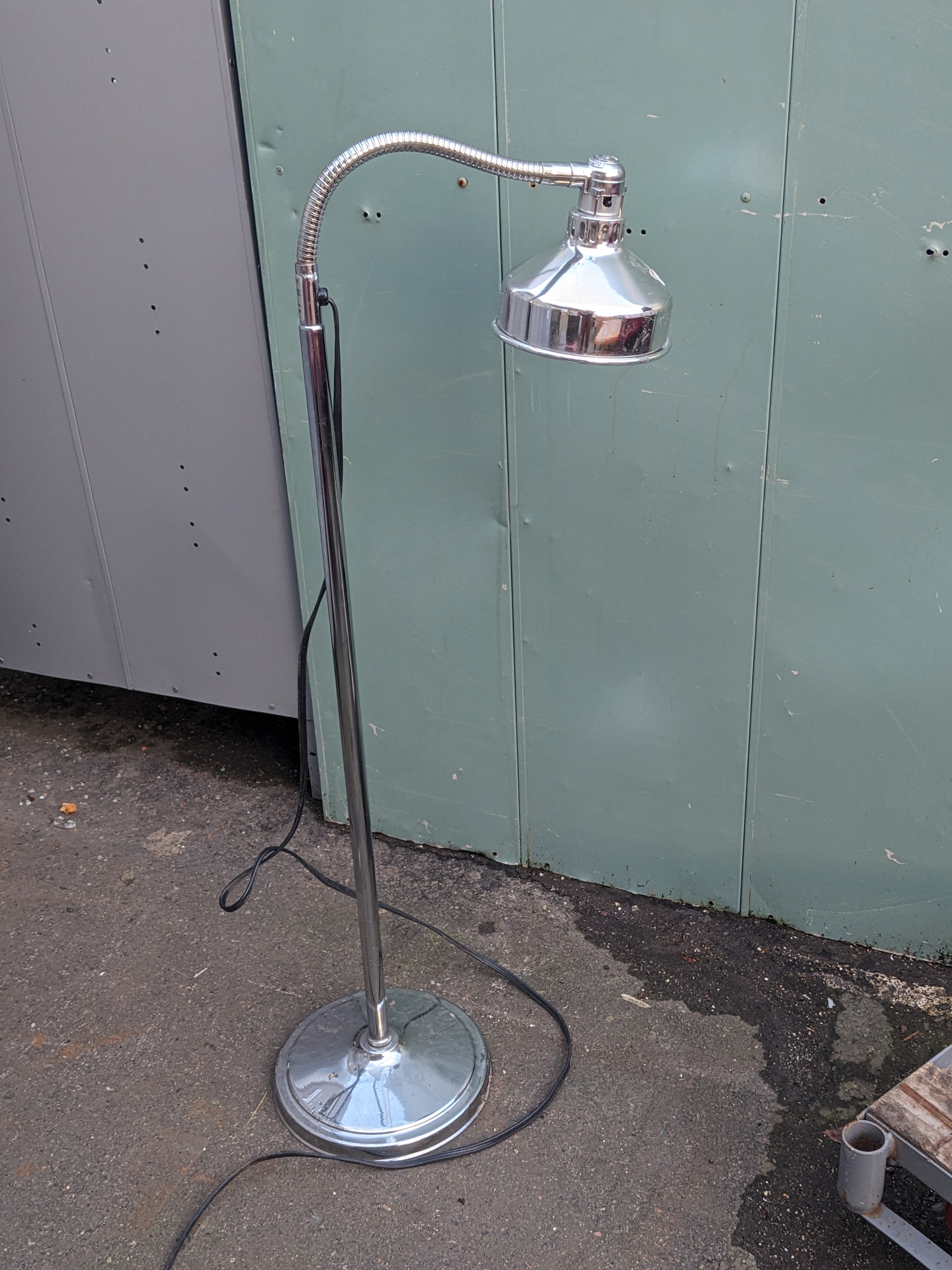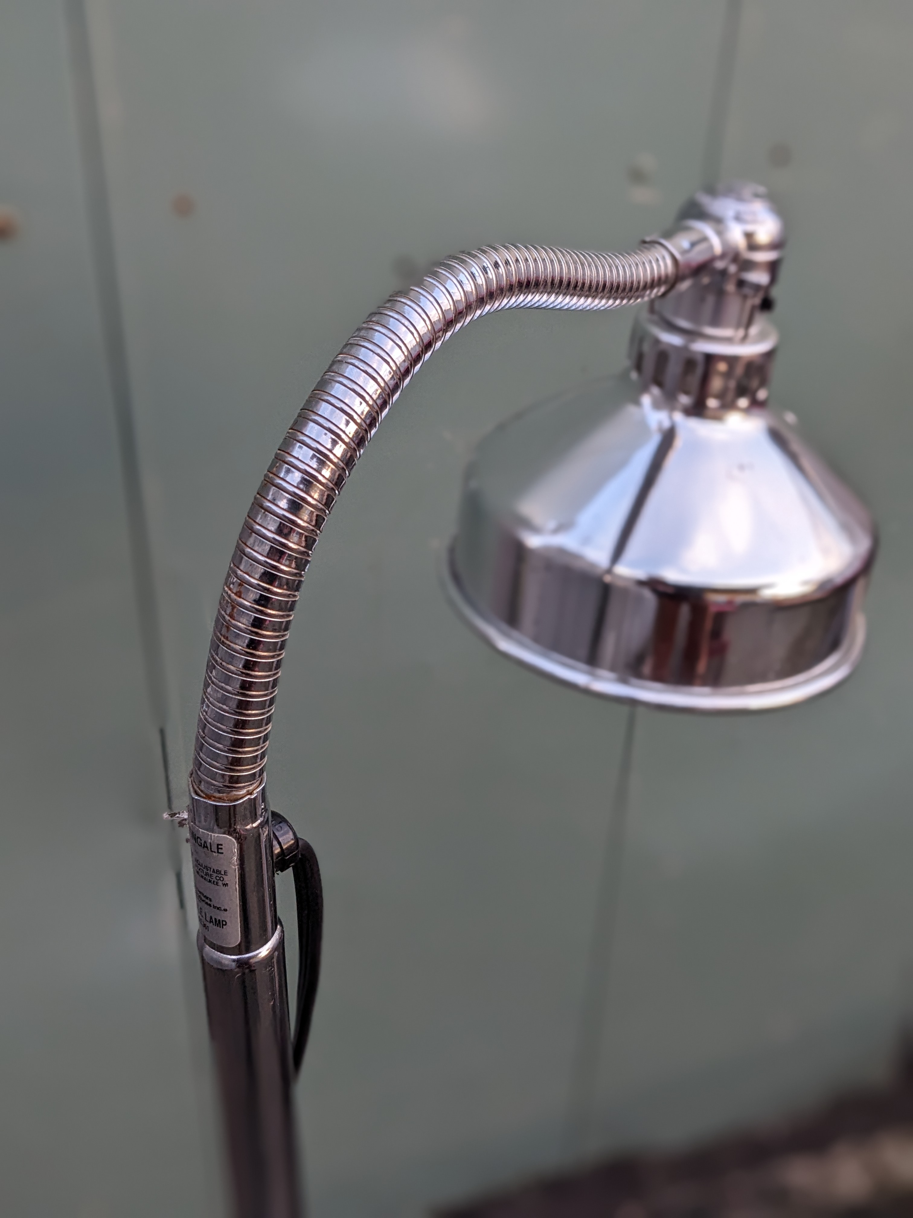 It adjusts up and down. Max extension is 66 inches. It's lowest is 35 inches. It has a bendable goose neck and a clamshell style shade. Perfect for putting light on a project or for reading, etc.
