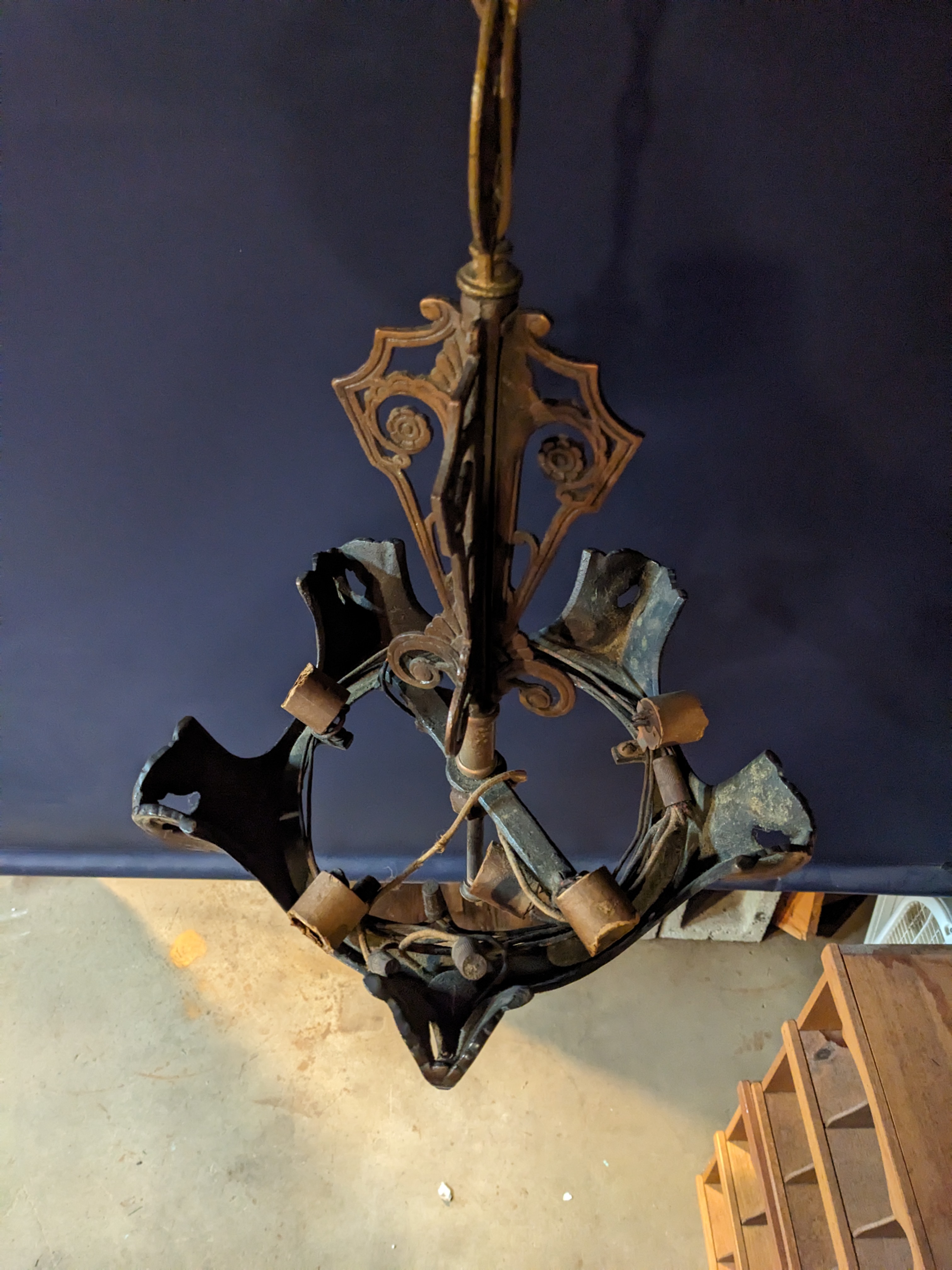 A vintage art deco style slip shade chandelier. It's in good condition, though it's missing its shades. It measures 13.25 x 19.5 inches.