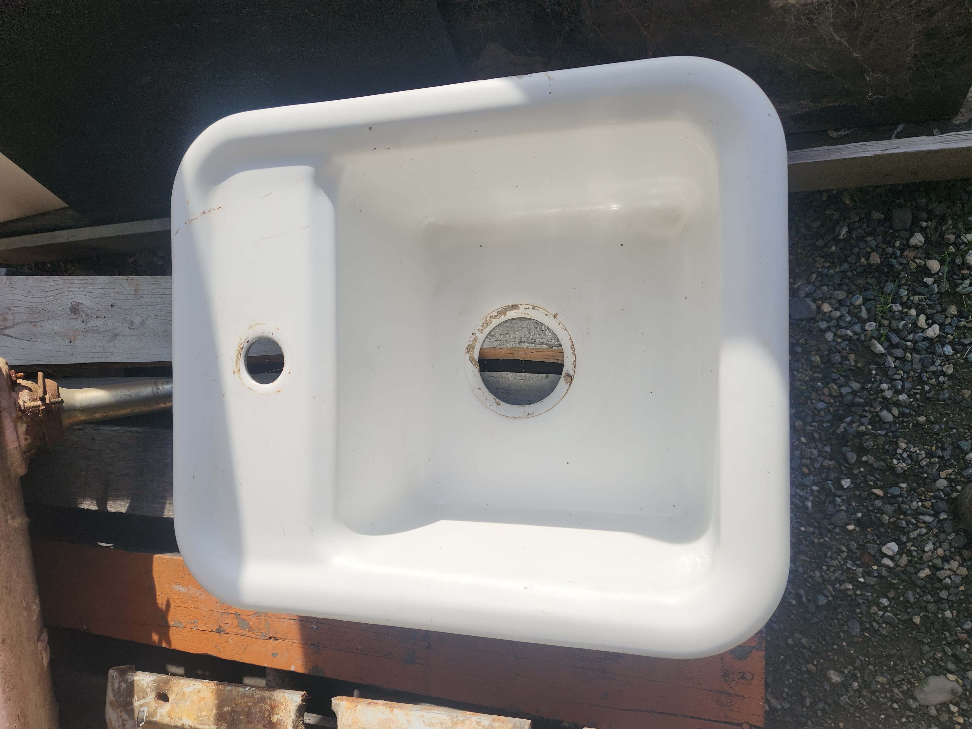 Vintage cast iron sink with a couple chips in the enamel. It is a little shallow, but it would make a nice, small utility sink. It measures 16 x 7.5 x 18.875. It is roughly 6.5 inches deep.