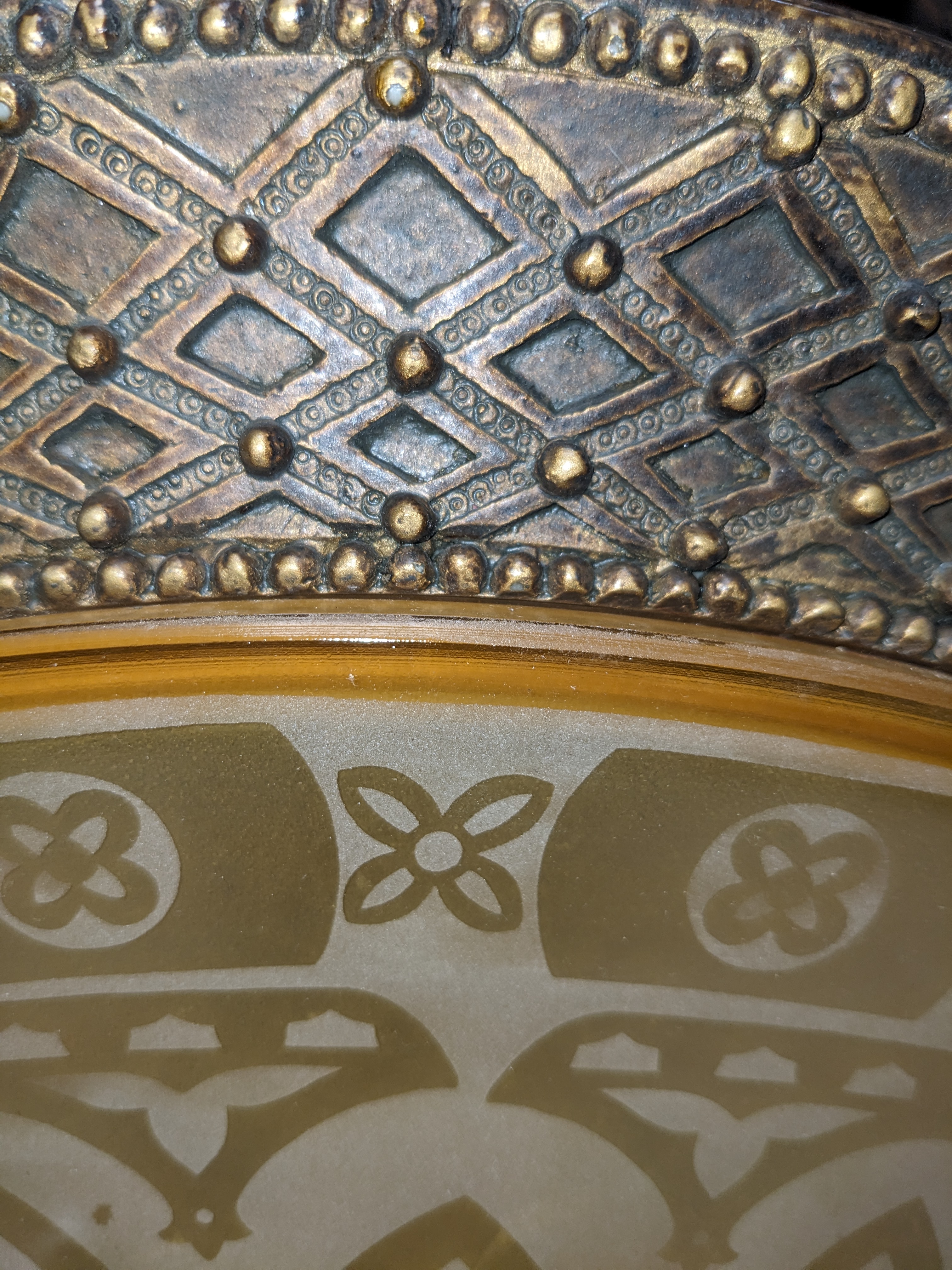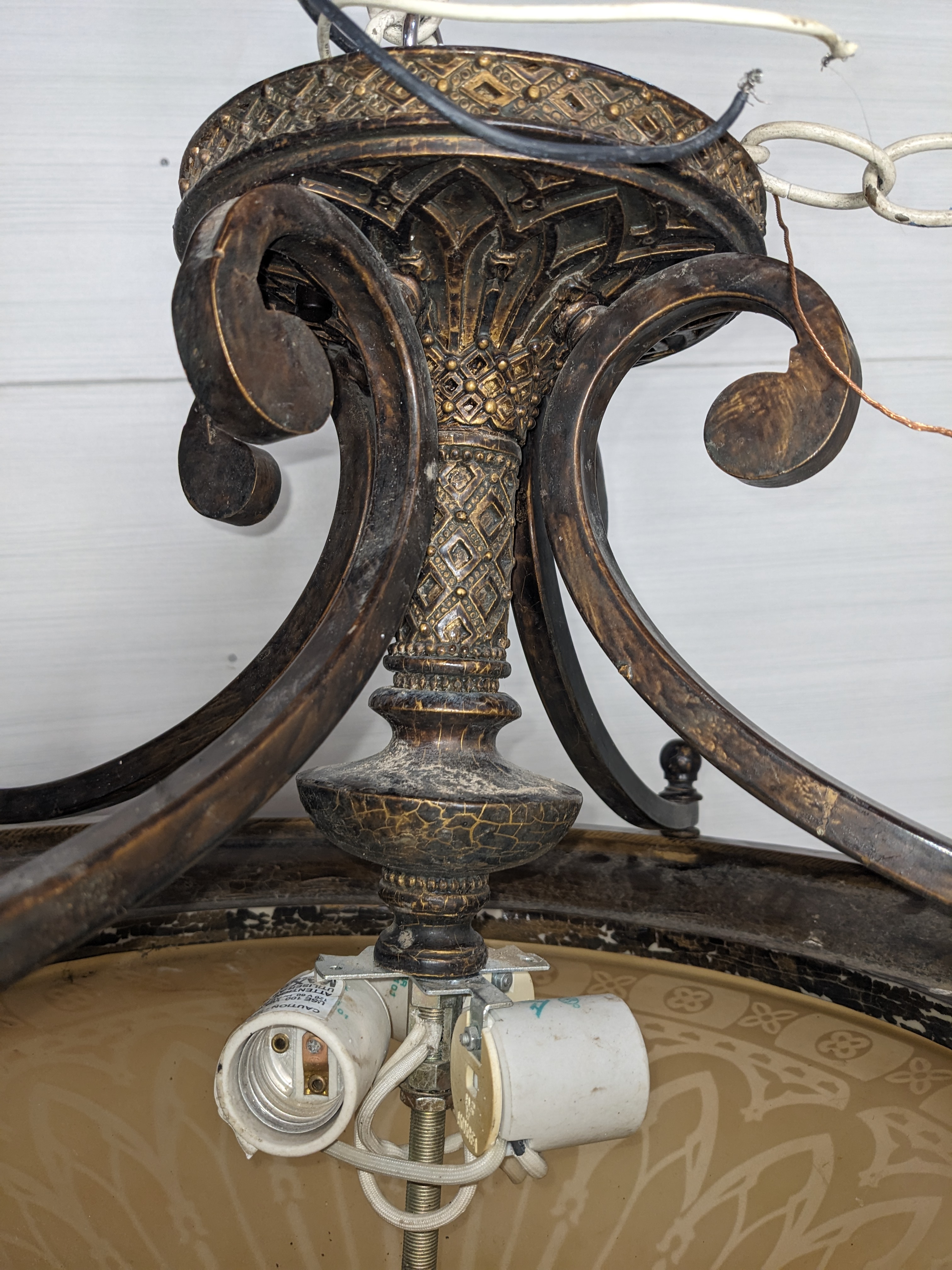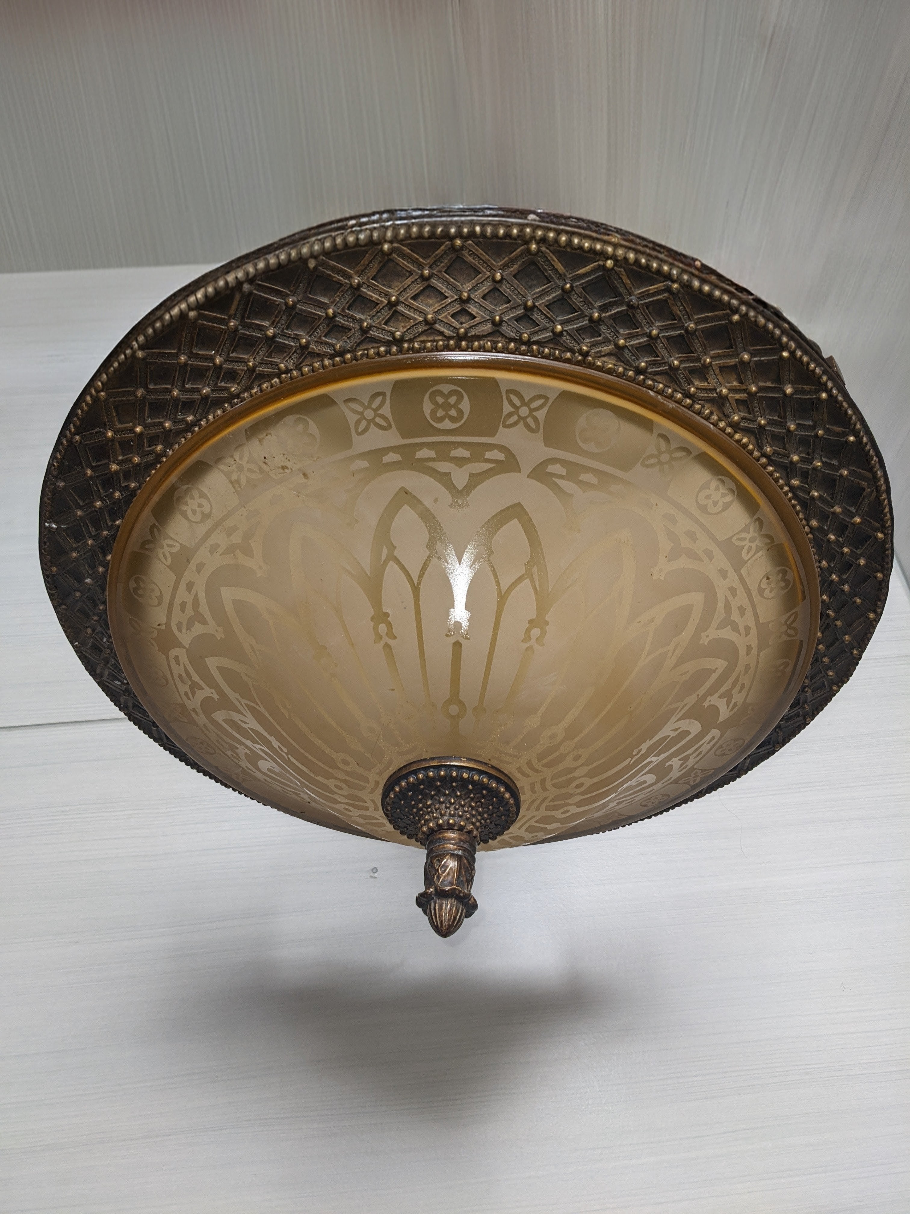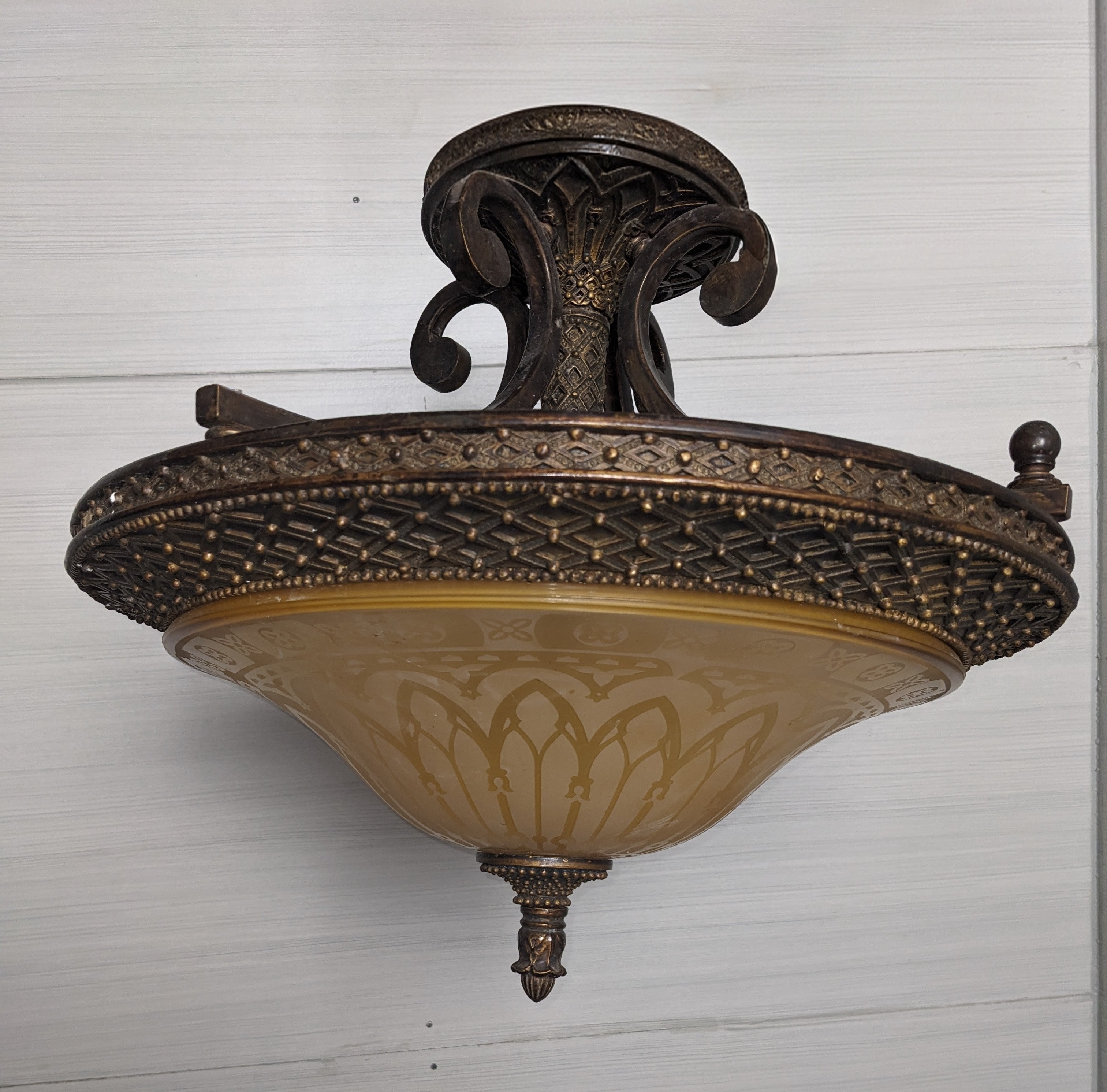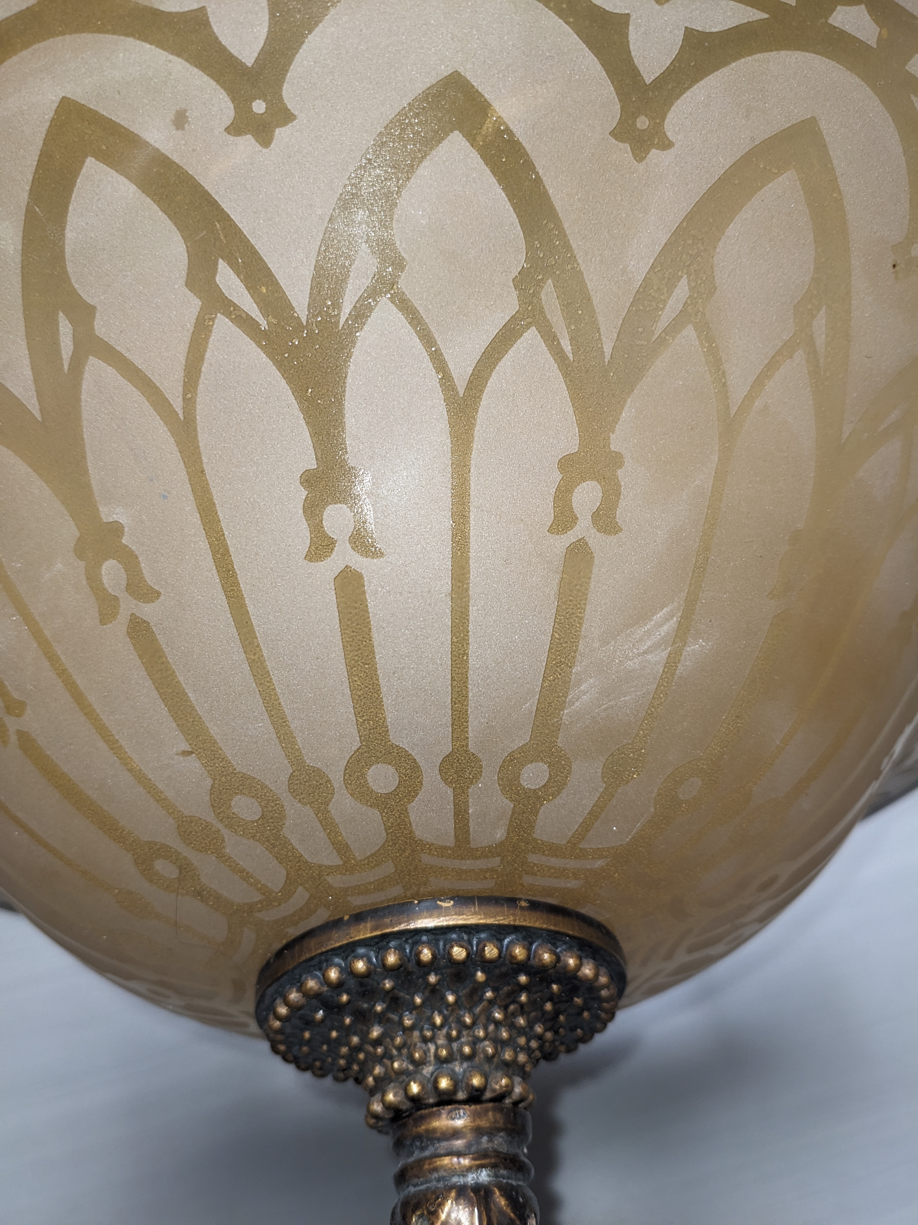 This is a newer fixture. Not an antique. Still a fancy one, very decorative and beautiful. The etched glass design is almost gothic. It holds 3 light bulbs for plenty of light. In good condition.