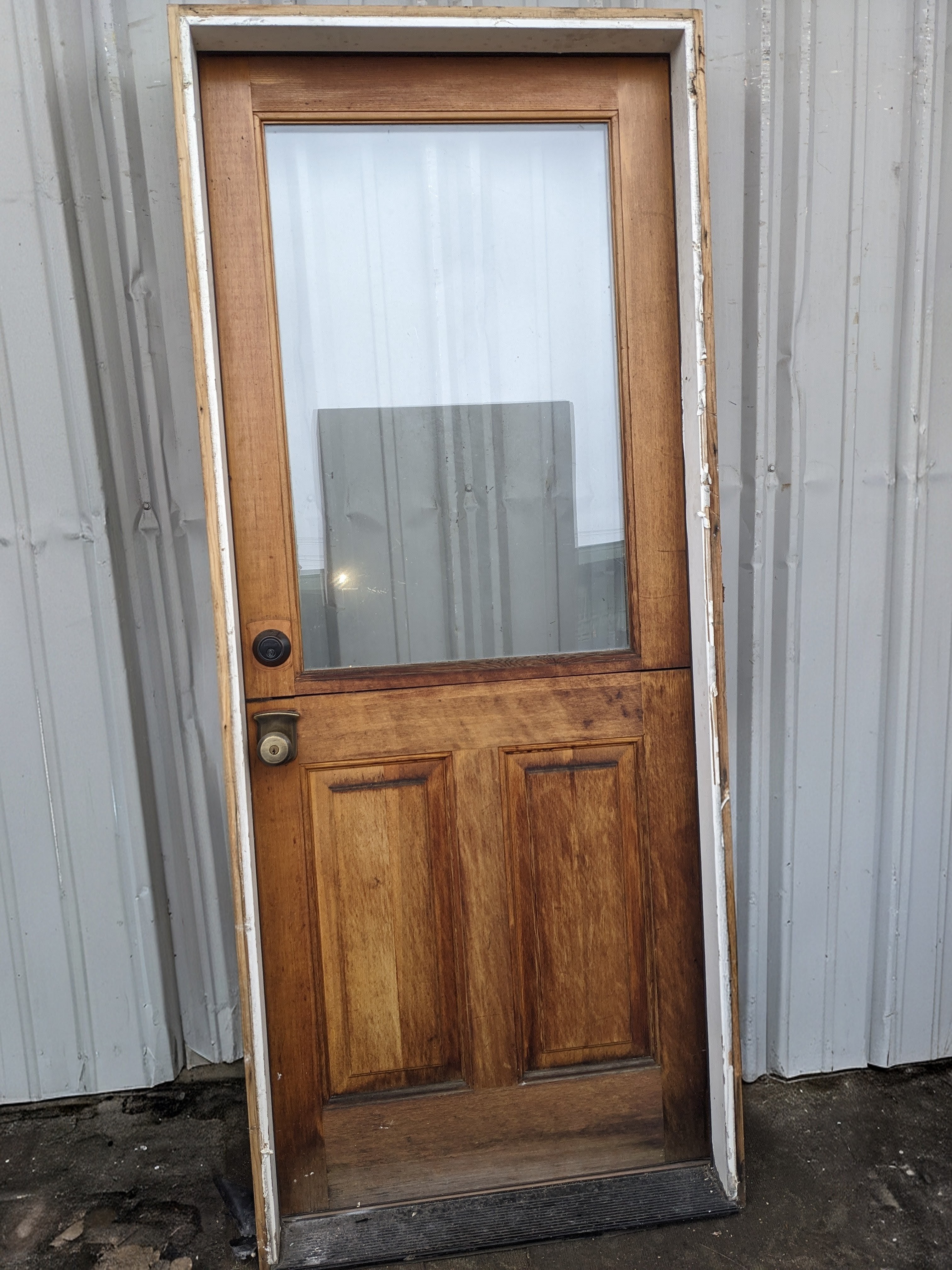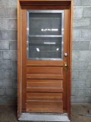 An awesome Dutch door! Awesome because it is a Dutch door!! Unfinished on both sides. Double paned glass on top, 2 vertical raised panels on the bottom. Comes with some funky brass hardware, sorry, we don't have the keys to the locks. This door comes in it's jamb, ready to hang. Hurry, these doors are highly sought after and may not be here long!