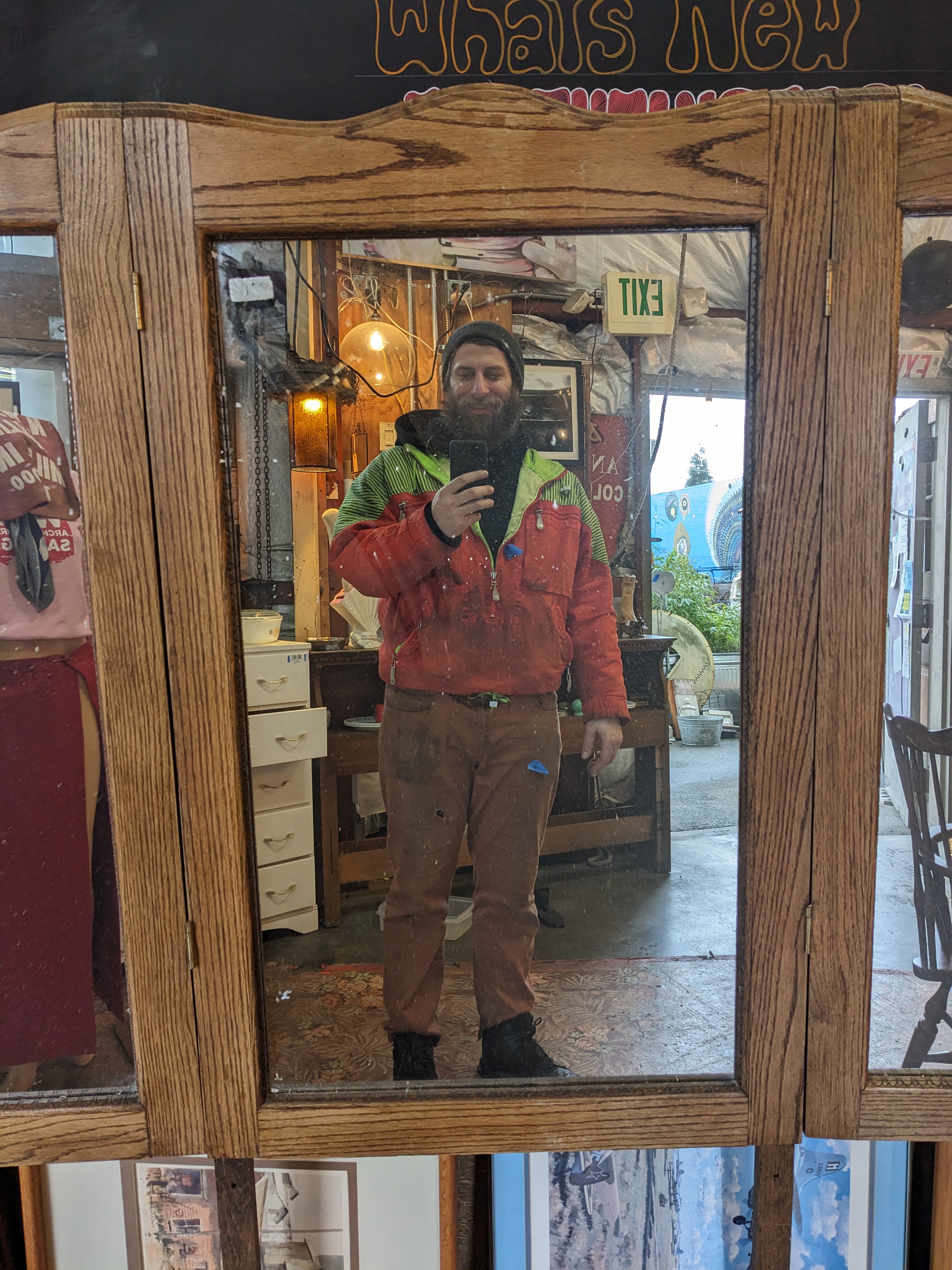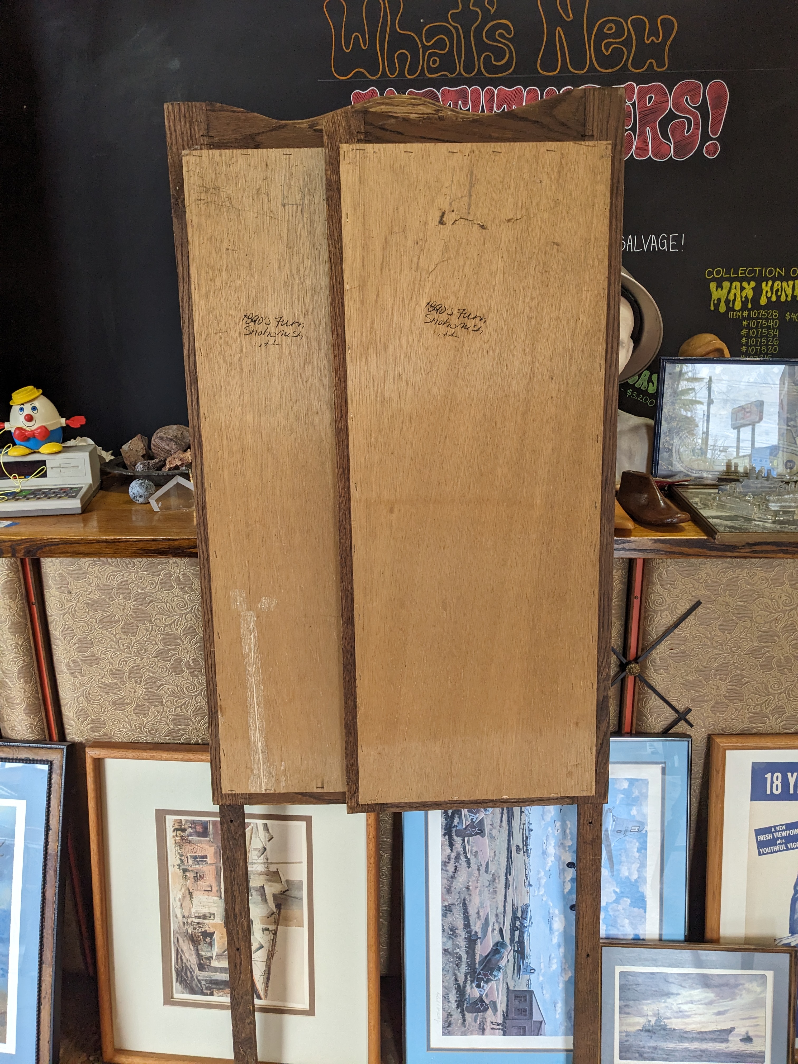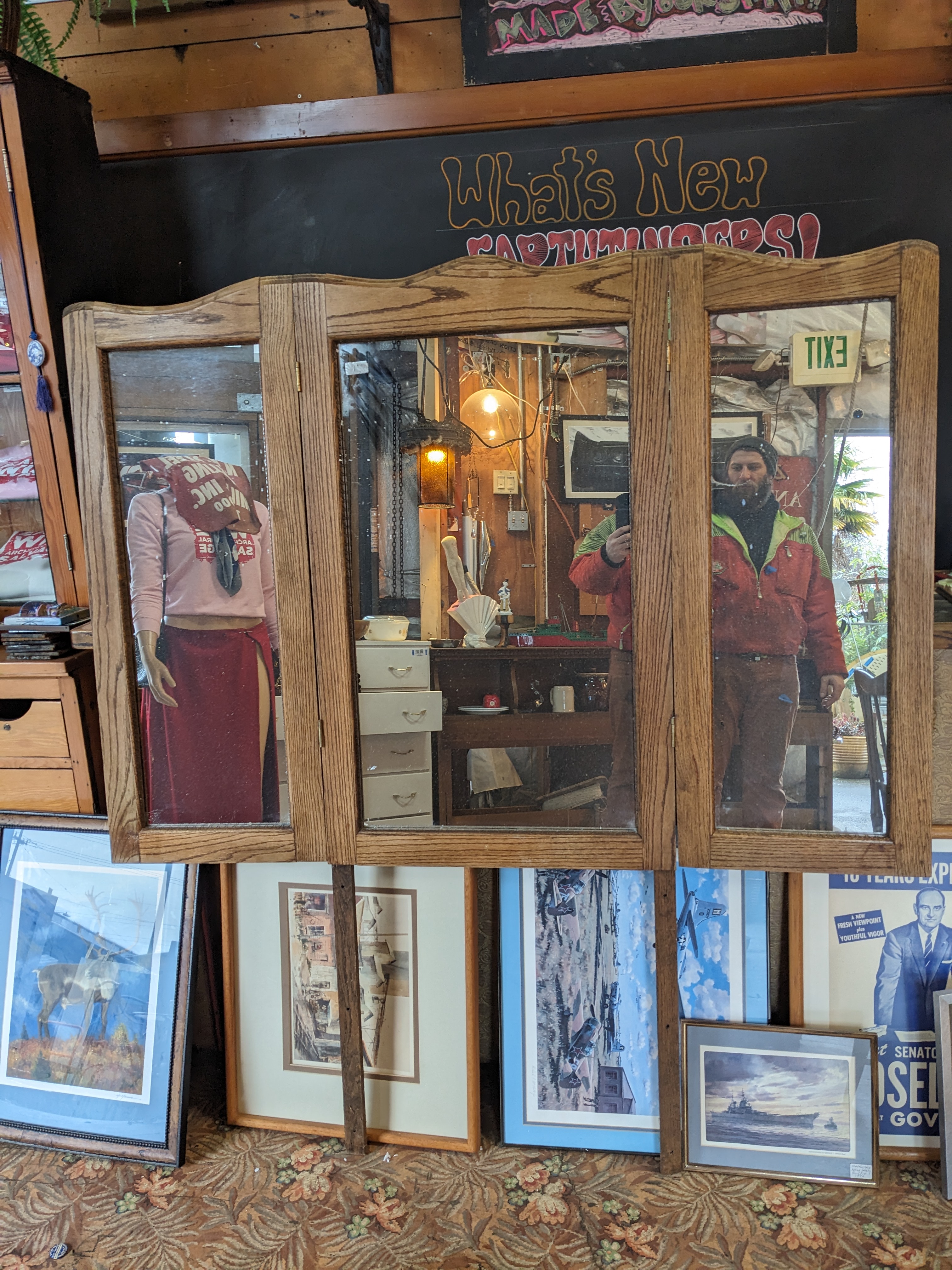 Beautiful tri fold oak mirror, can be mounted behind a dresser or hutch. In good condition, some sticker residue on the glass.