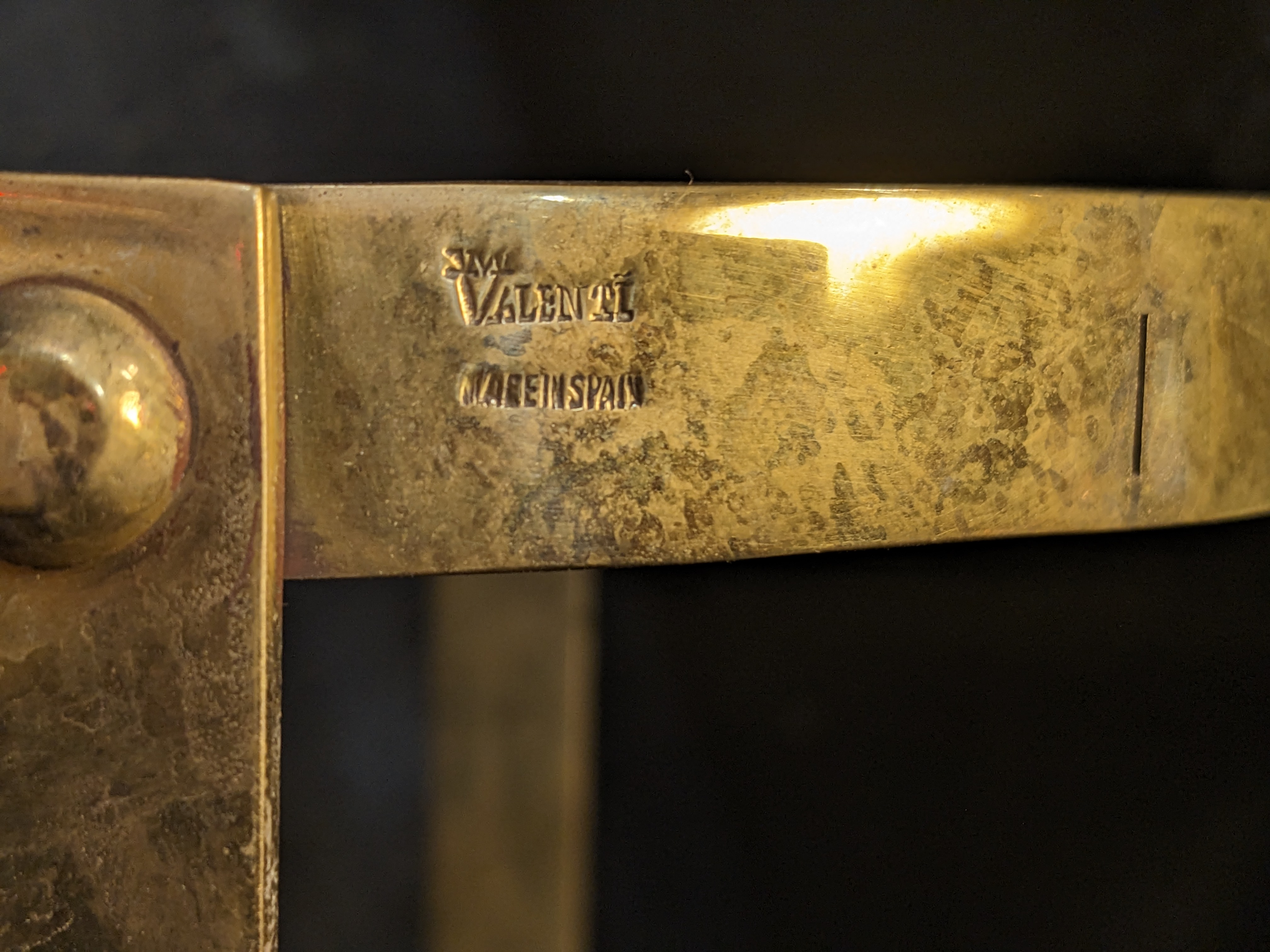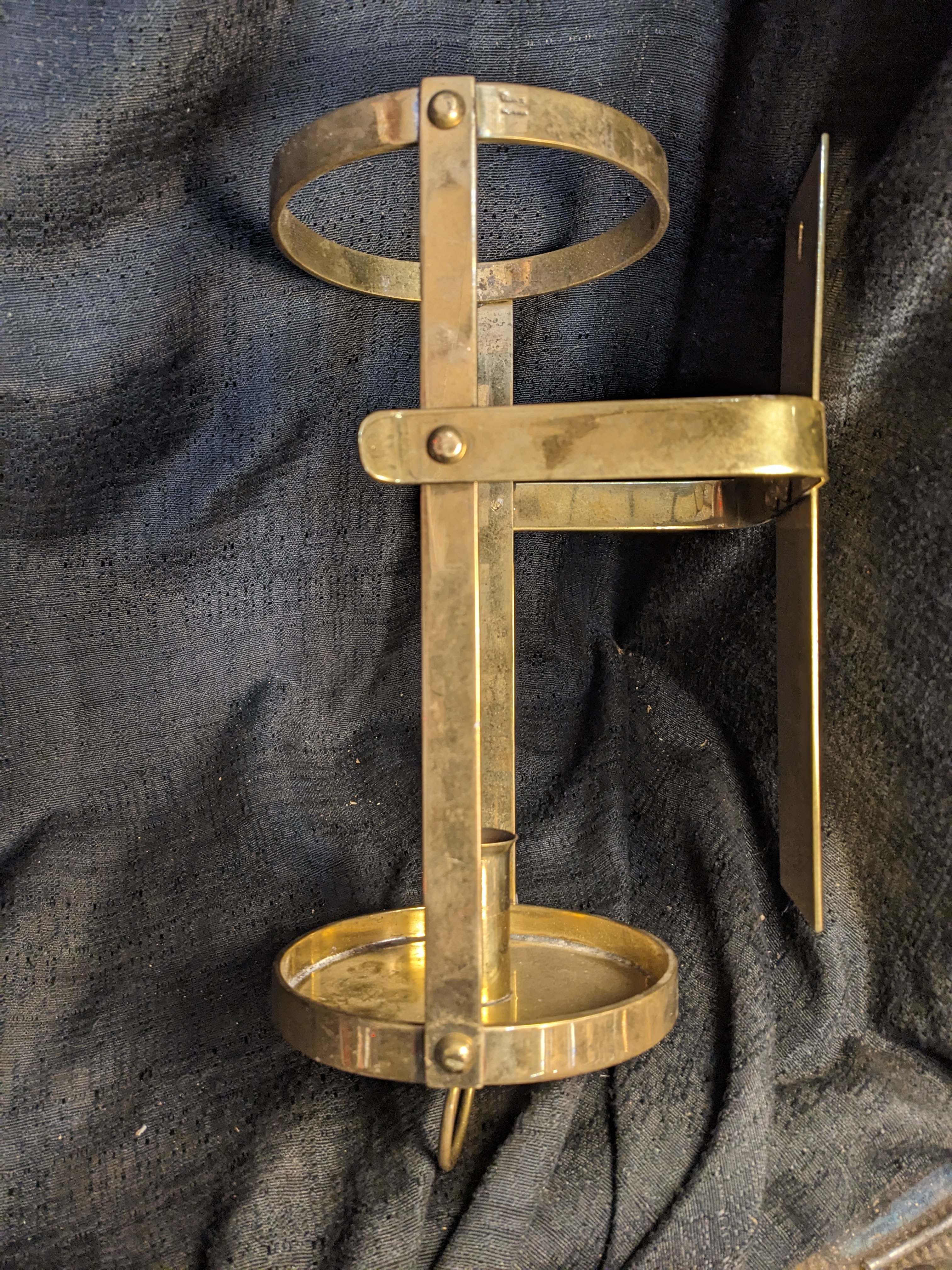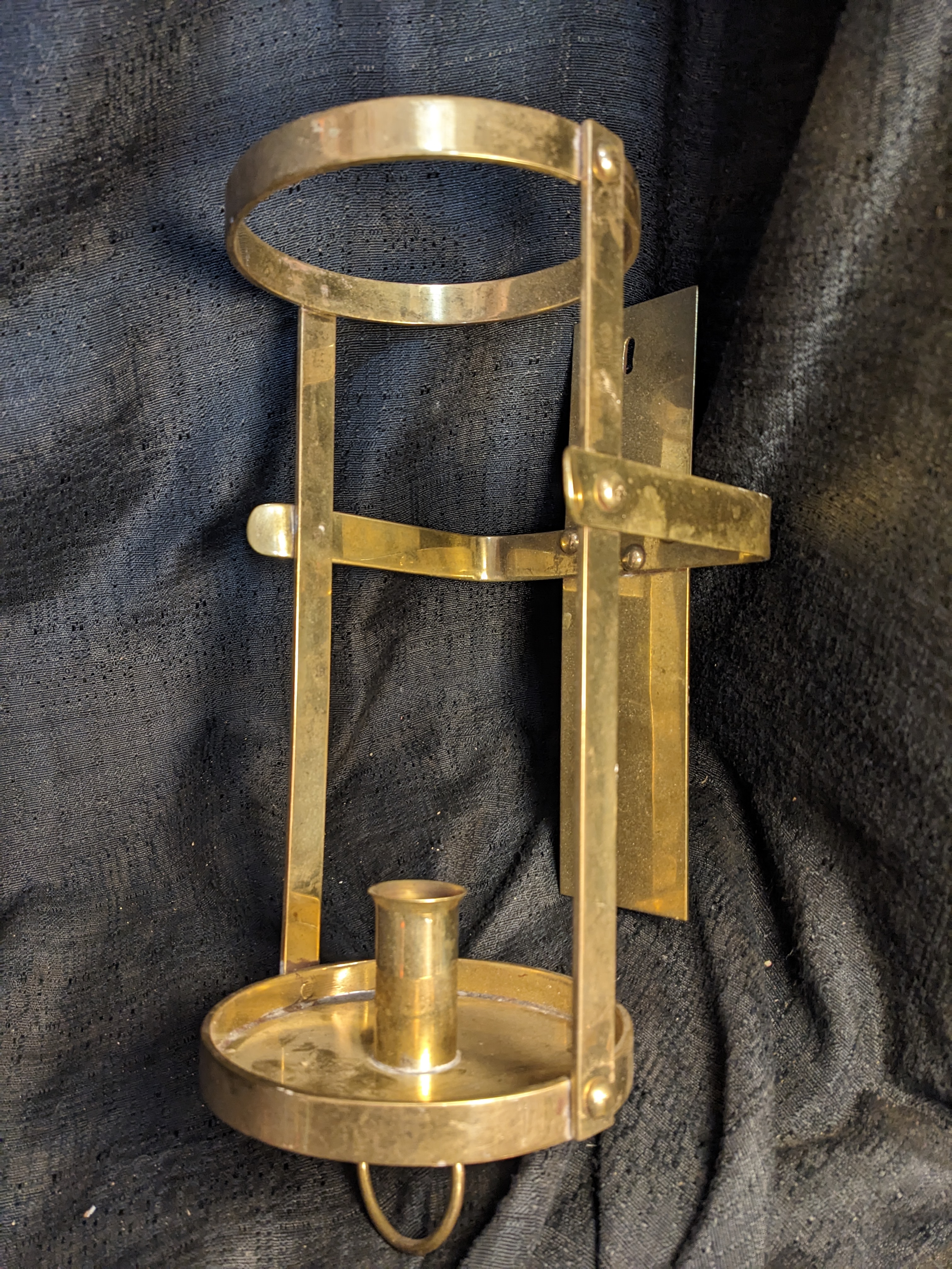 Solid brass and well made. It holds a single candle stick. It had a clear glass cylinder that got broken. Sold as is. Made in Spain by Bank & Office Interiors B & OI