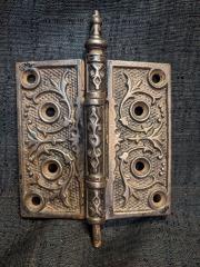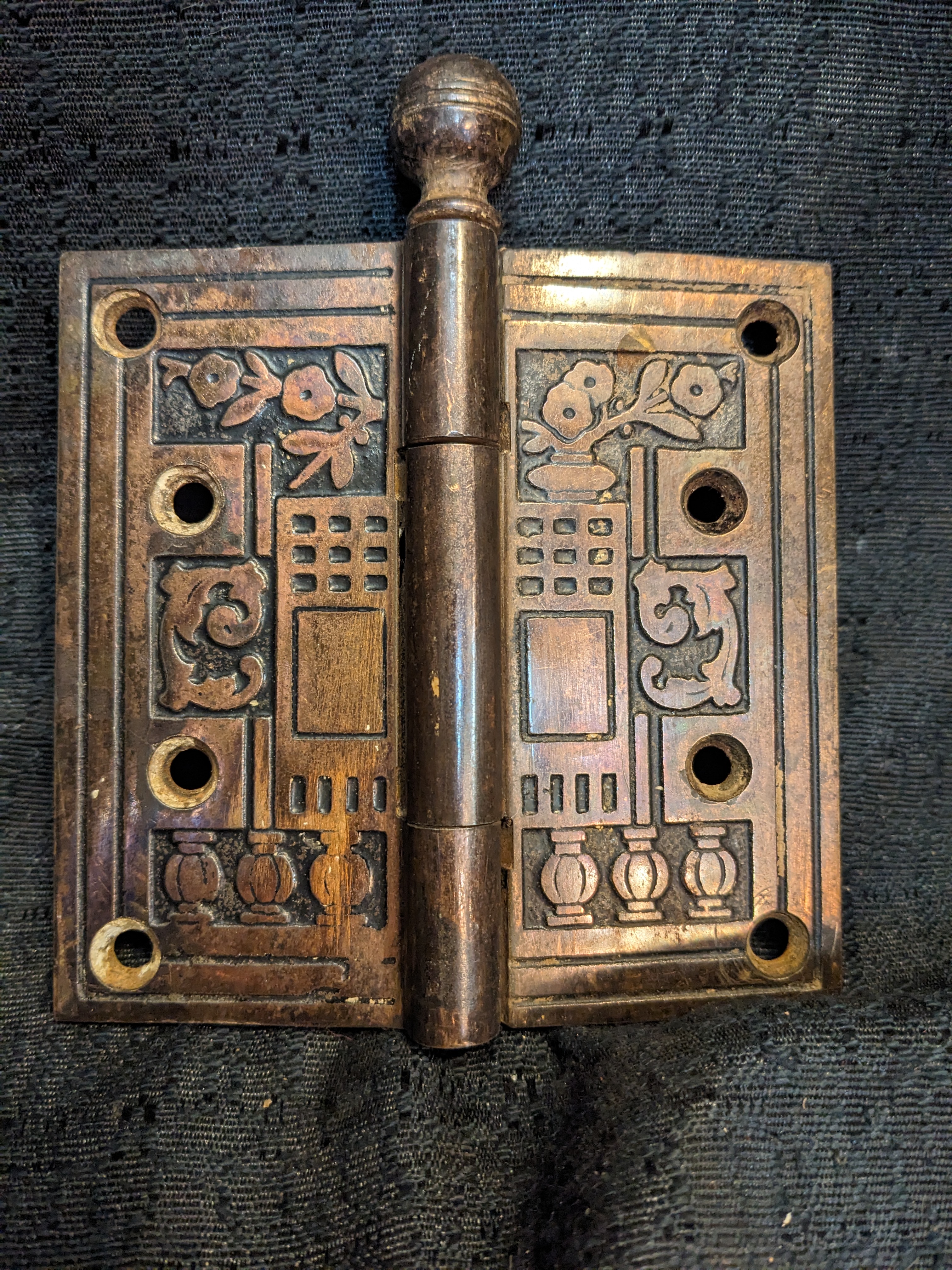 This Art Deco style hinge features a flower motif and measures 4 x 4. As Is