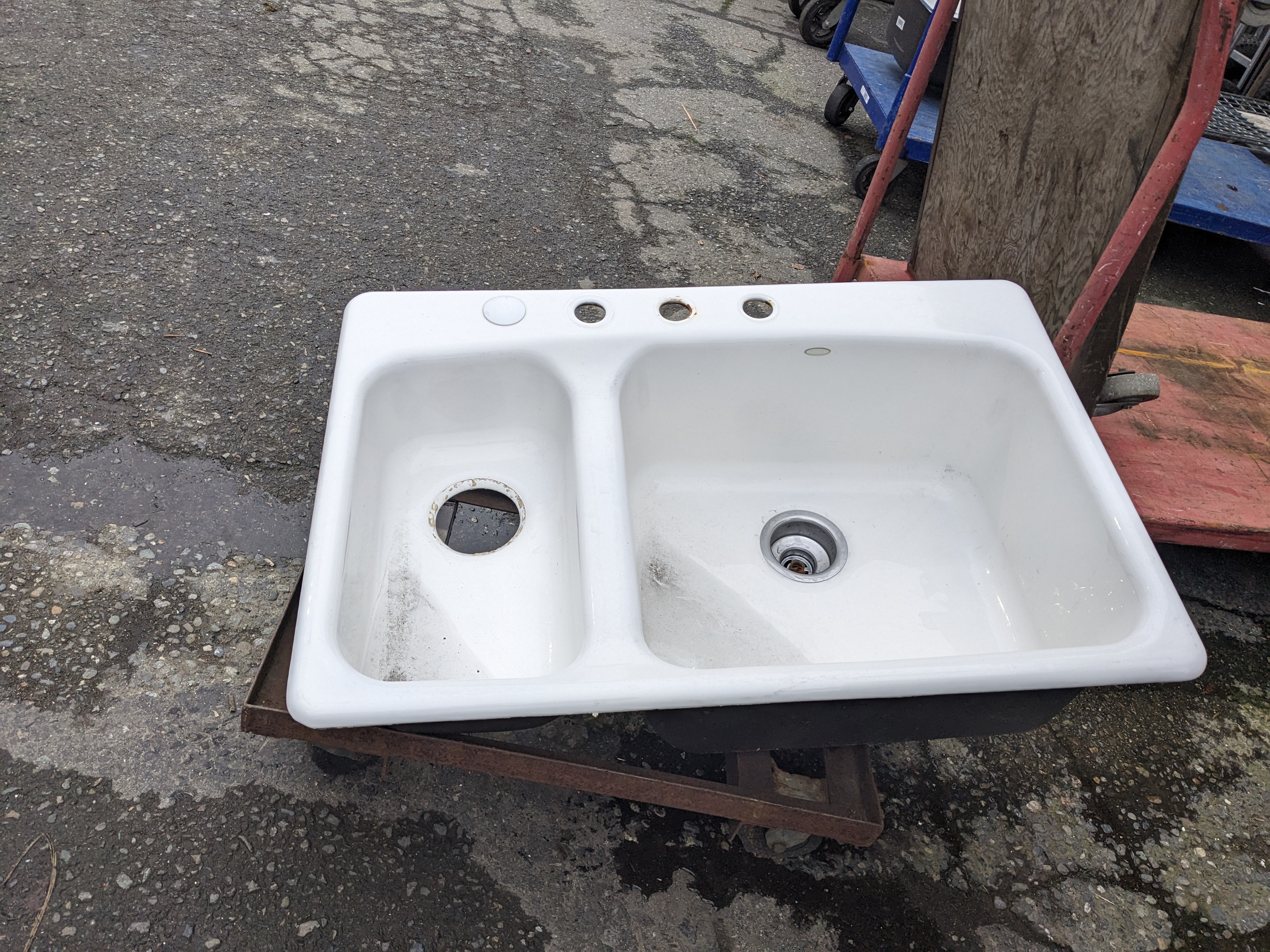 Beautiful 1/4 + 3/4 double sink made from cast iron topped with enamel. In fantastic shape.