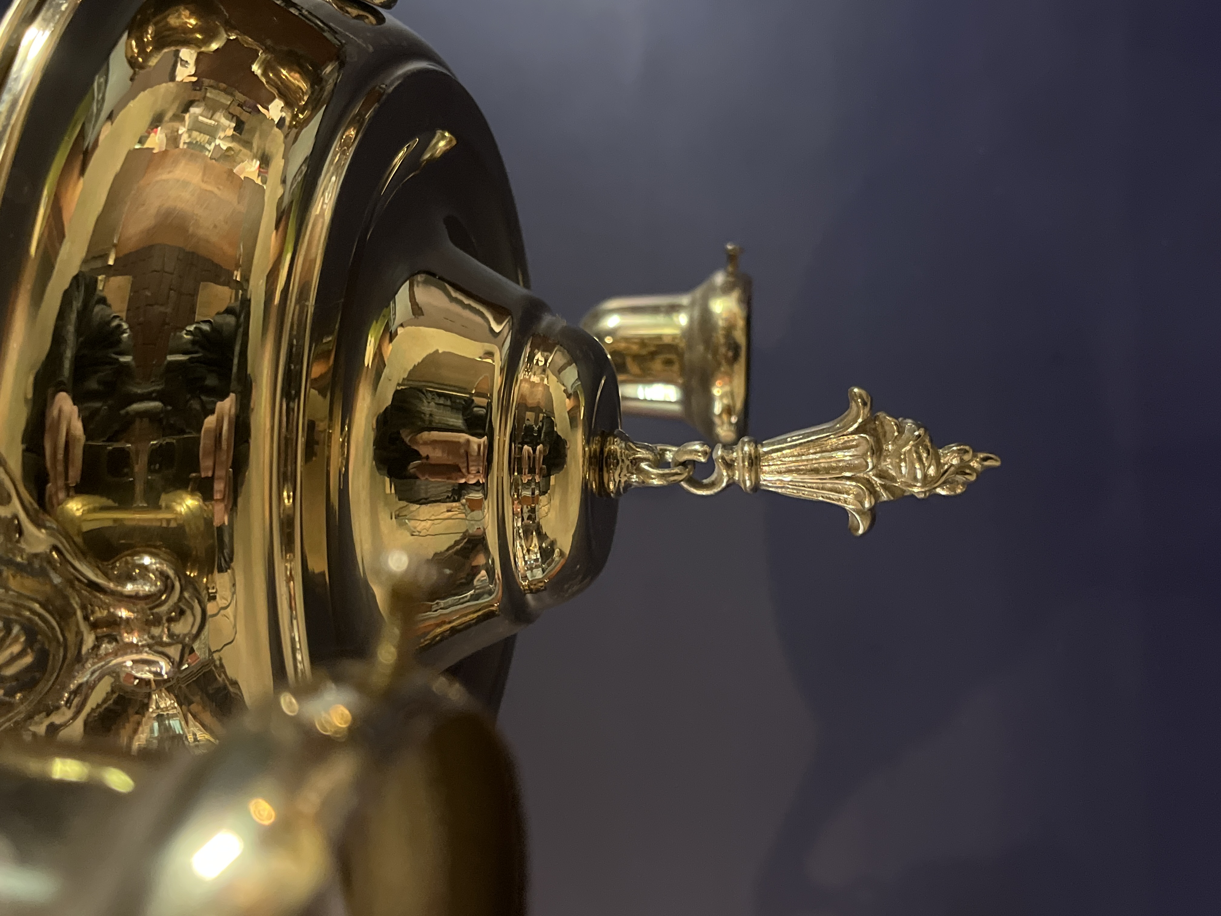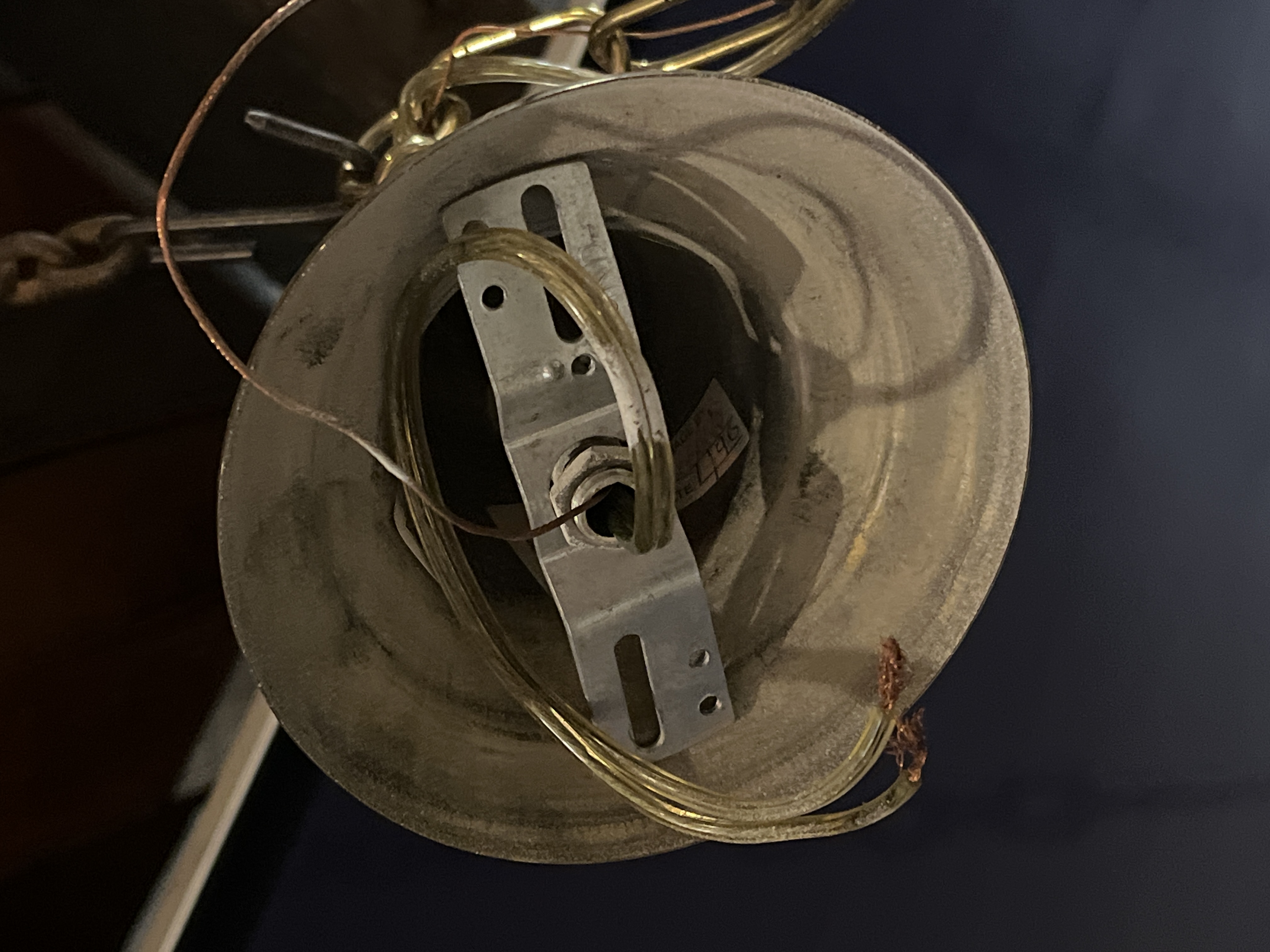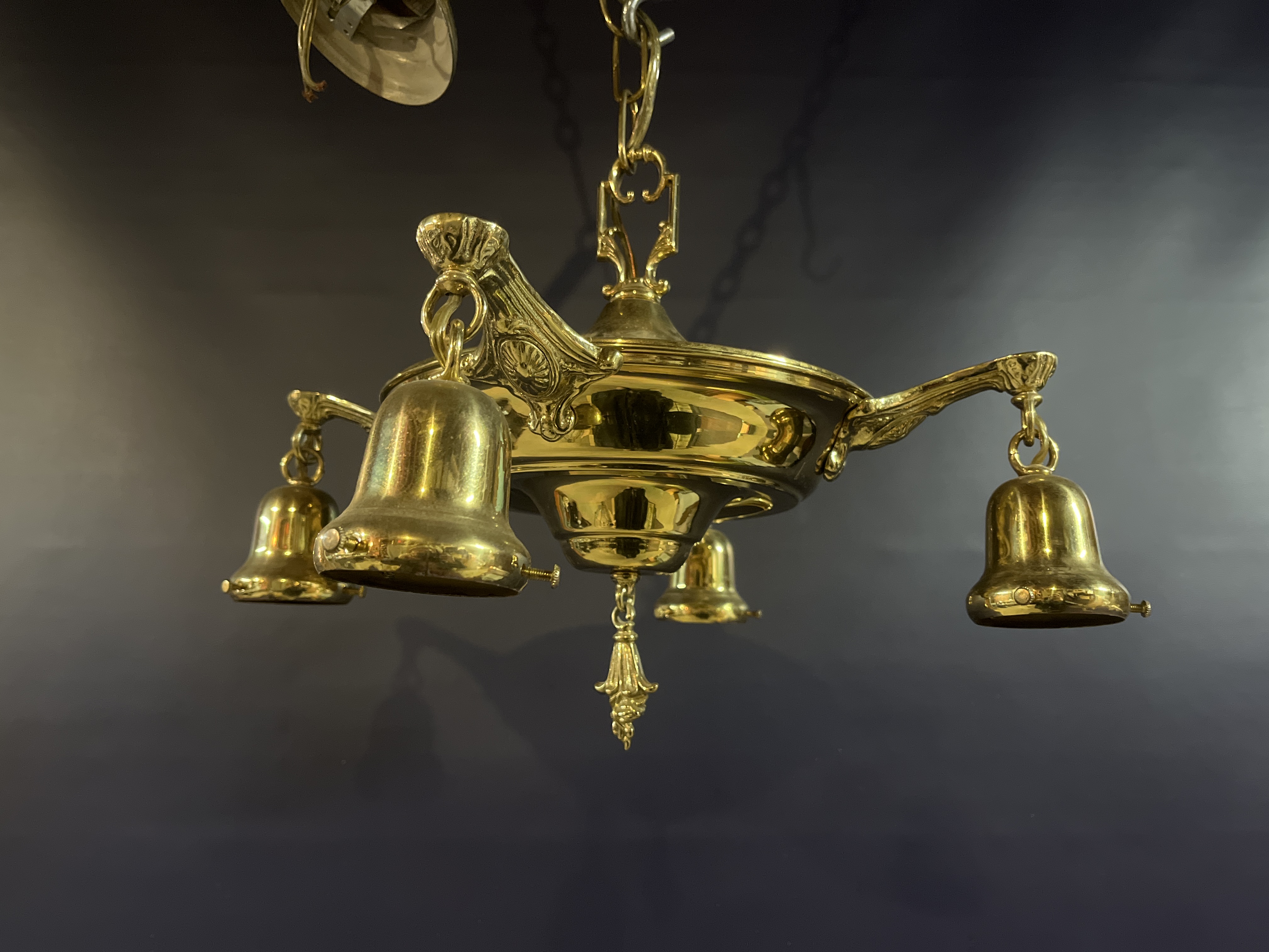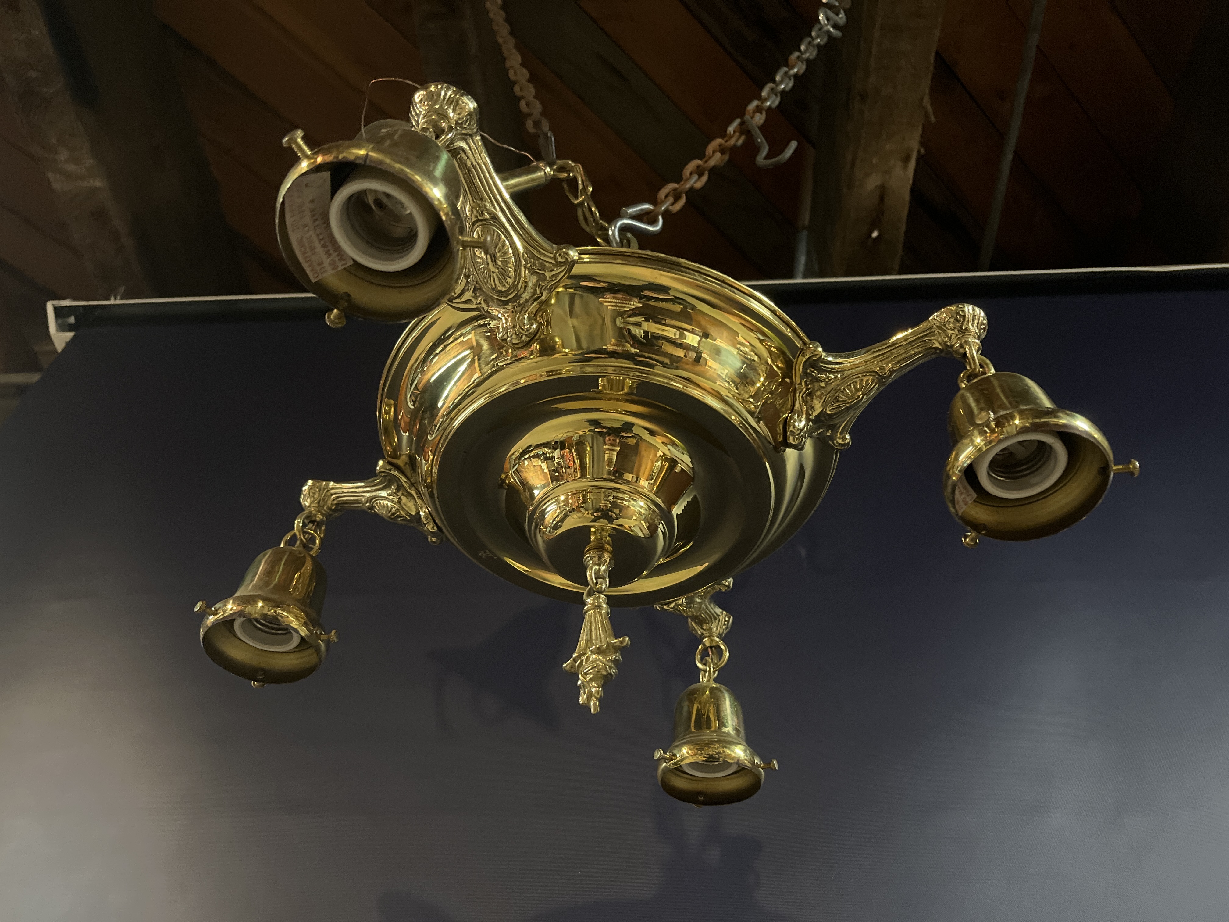 An all brass vintage style 4 bulb pan light from Rejuvenation. The light is styled after the original pan lights common in the early 20th century. It looks to be in pretty nice shape! Measures roughly 18 x 12.5 inches.