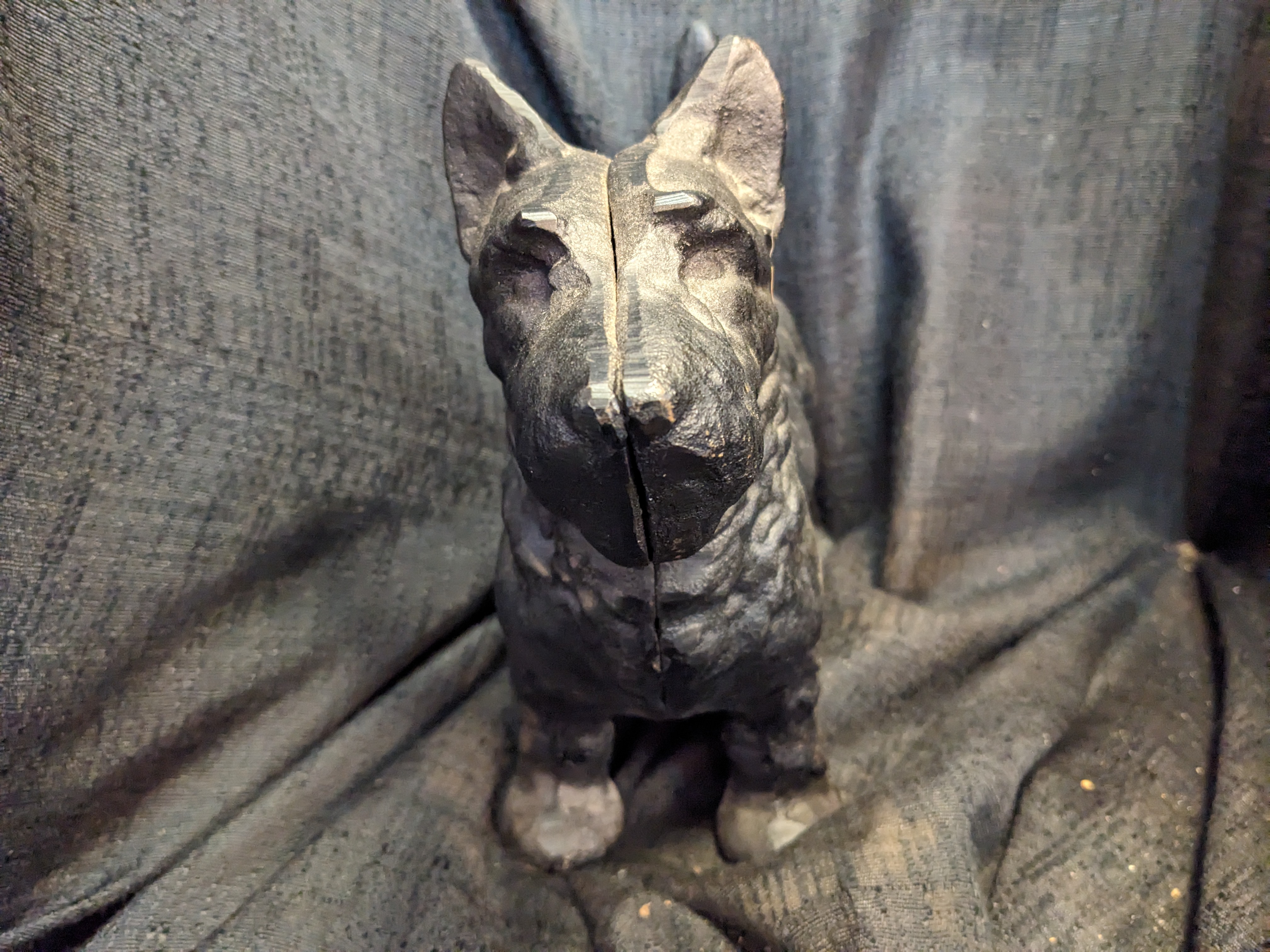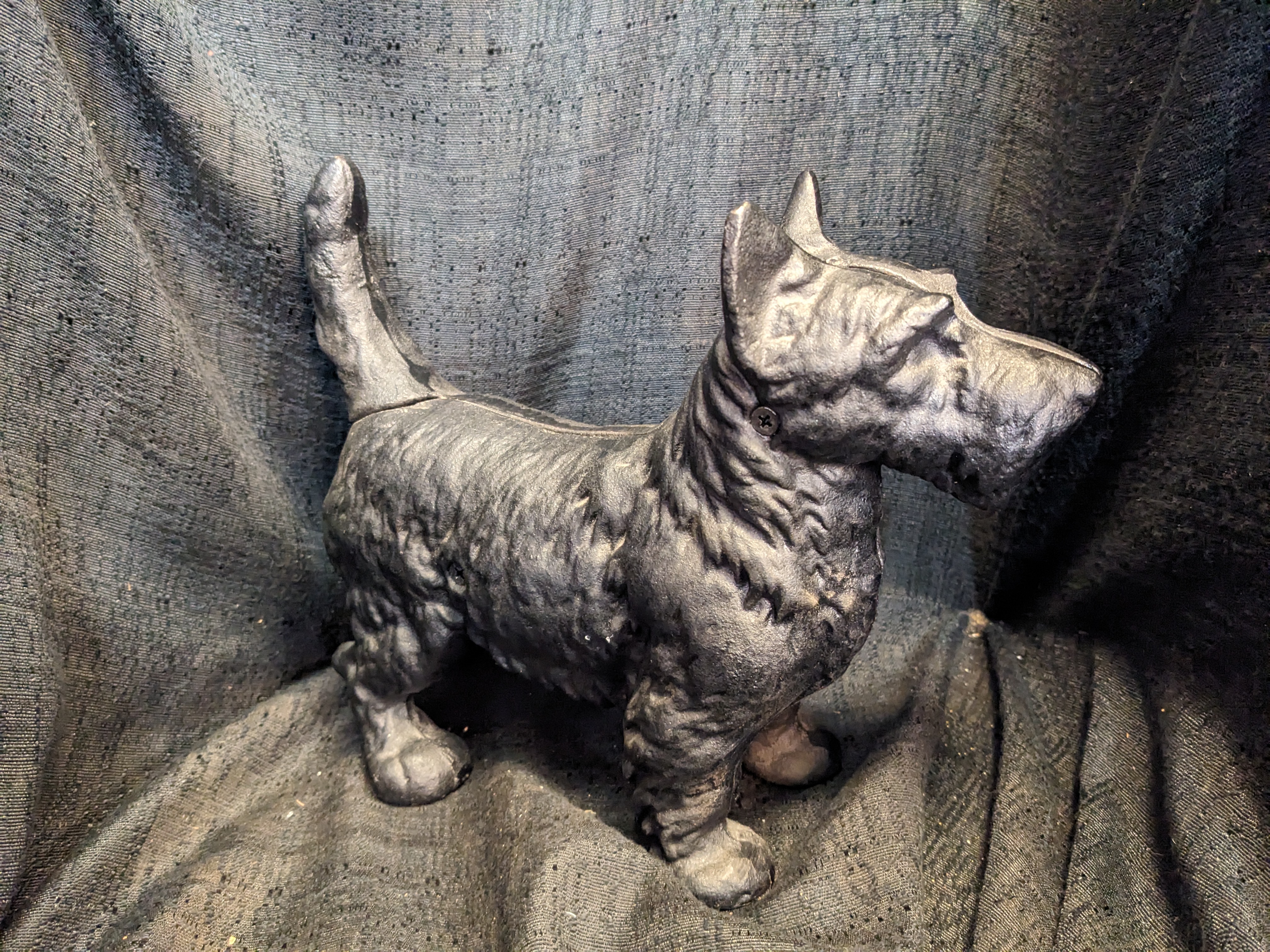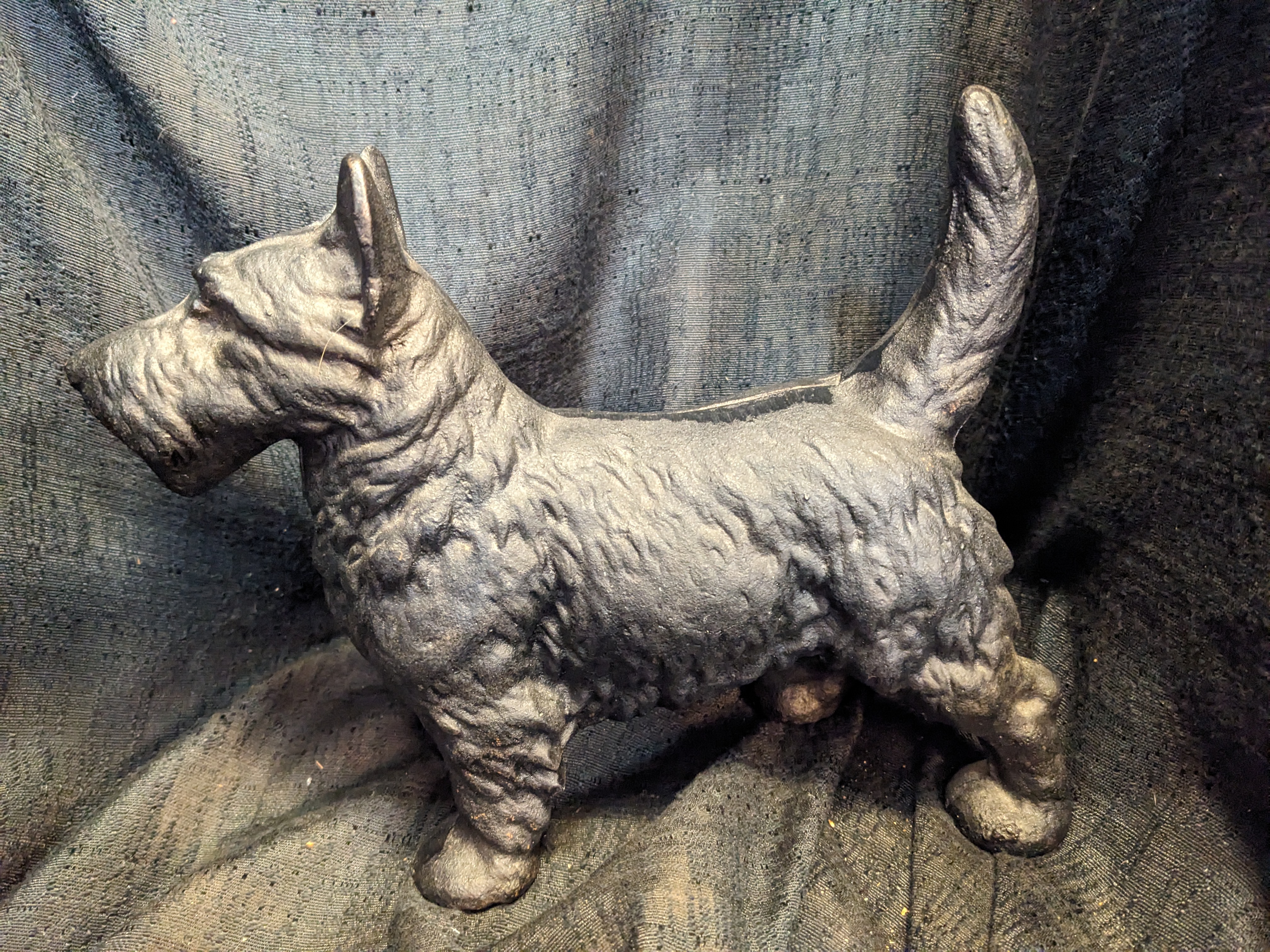 This quite heavy cast iron Scottish Terrier statue would make a great door stop or book end! Perfect for a Scottie loving household. It is in excellent condition with no signs of damage or miscoloration. 9.5 x 8 x 3