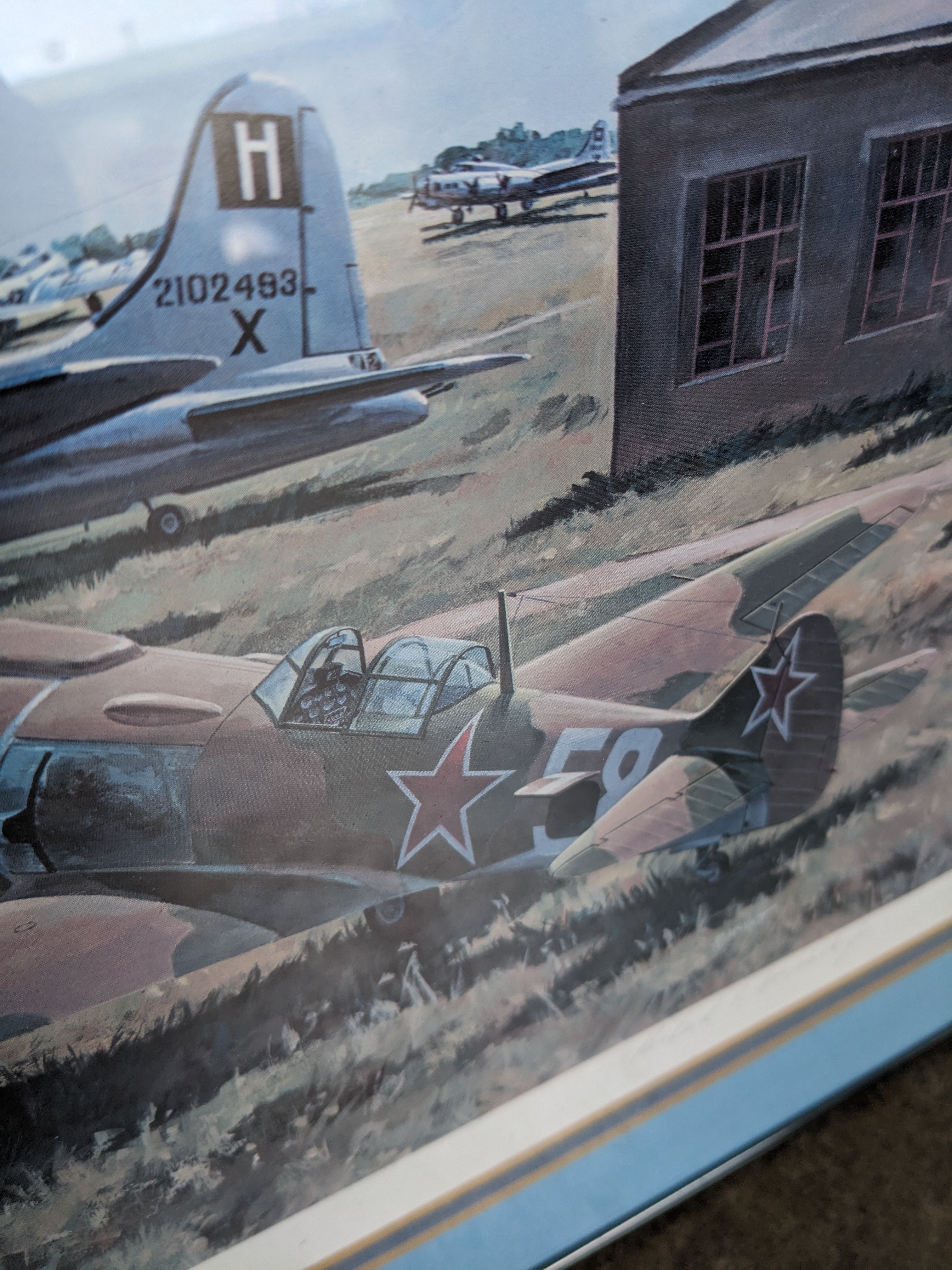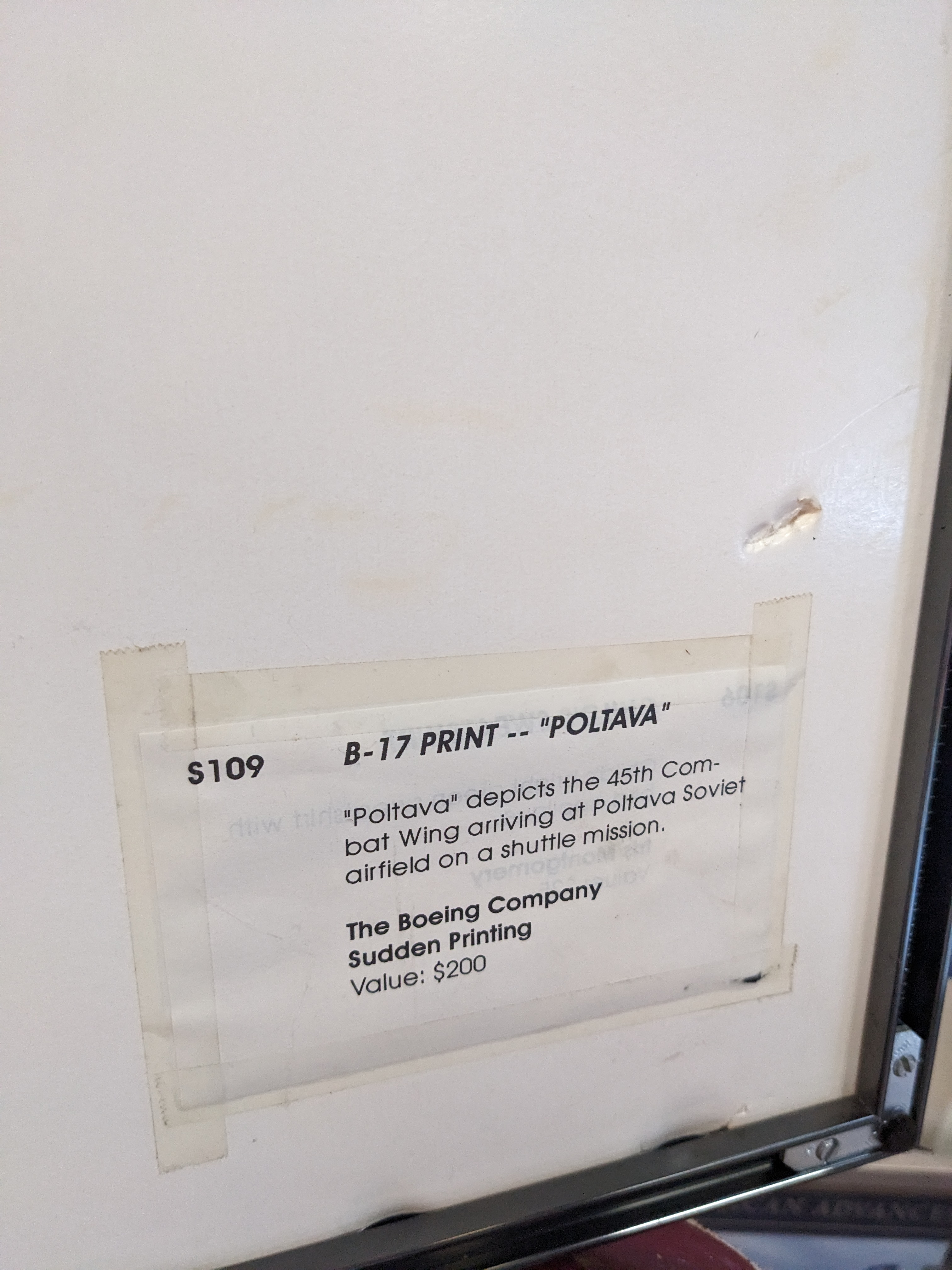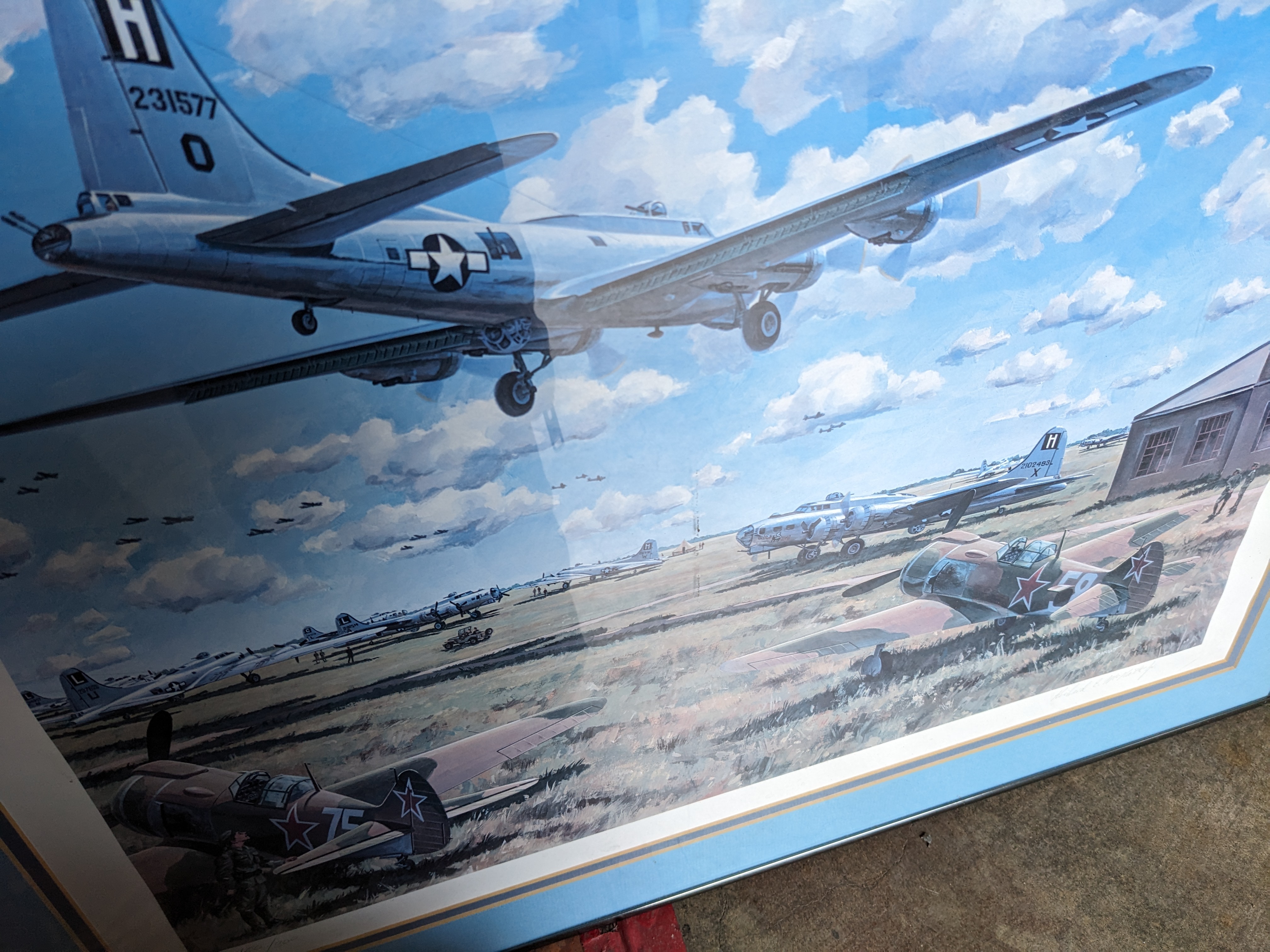 This framed Dick McNatt Open Edition Print "Poltava" B-17 WWII Dick McNatt Jr Signed in pencil Print "Poltava" is stunning and in good condition. Negotiations with the Russians allowed the USAAF to use their airfields for its bombers on shuttle missions. This painting depicts B-17s from the 45th Combat Wing arriving at Poltava. After a Luftwaffe bombing later that night, of the 73 that had arrived, only seven would still be flyable. A stunning signed print. 25.75 x 20.75