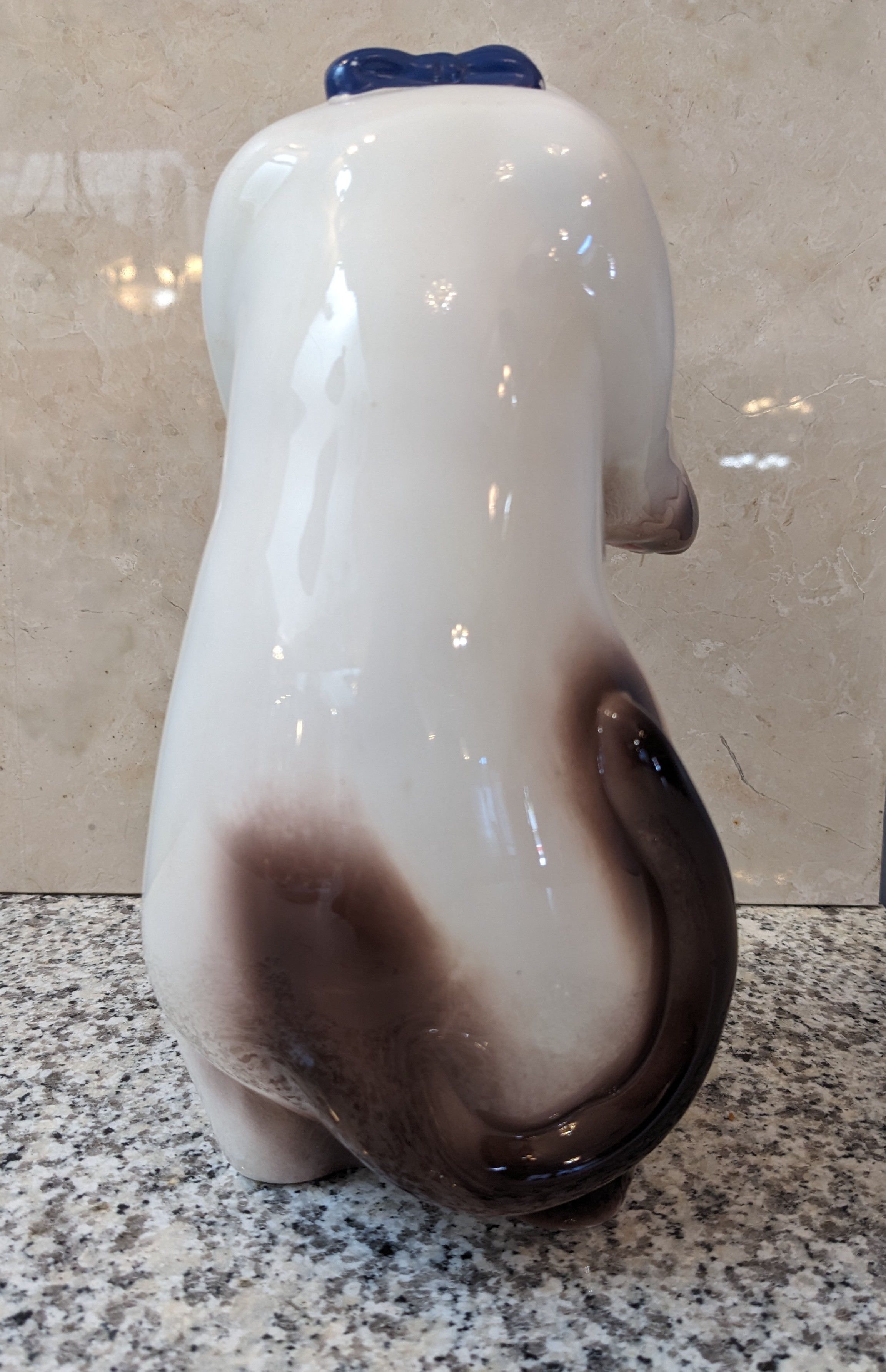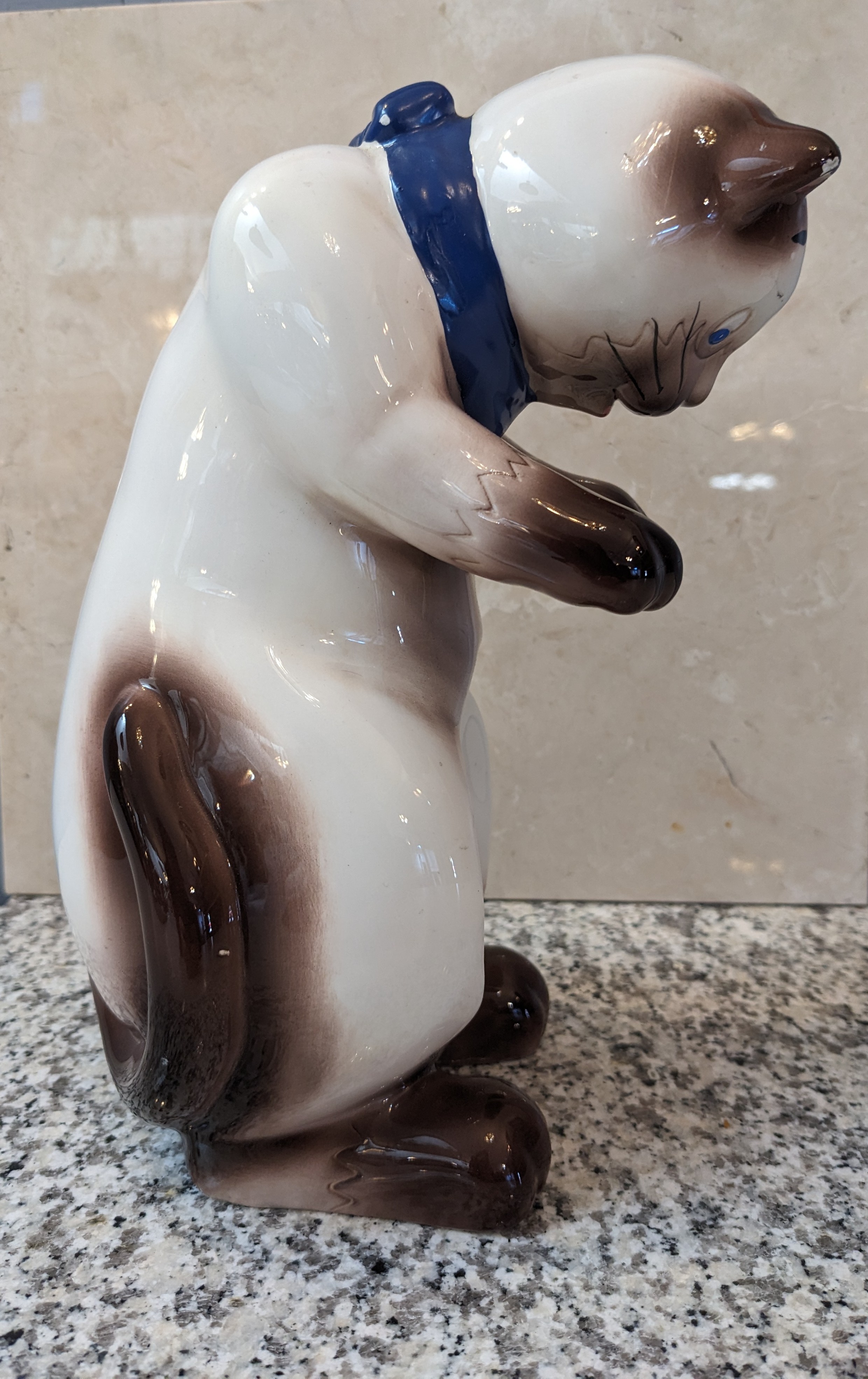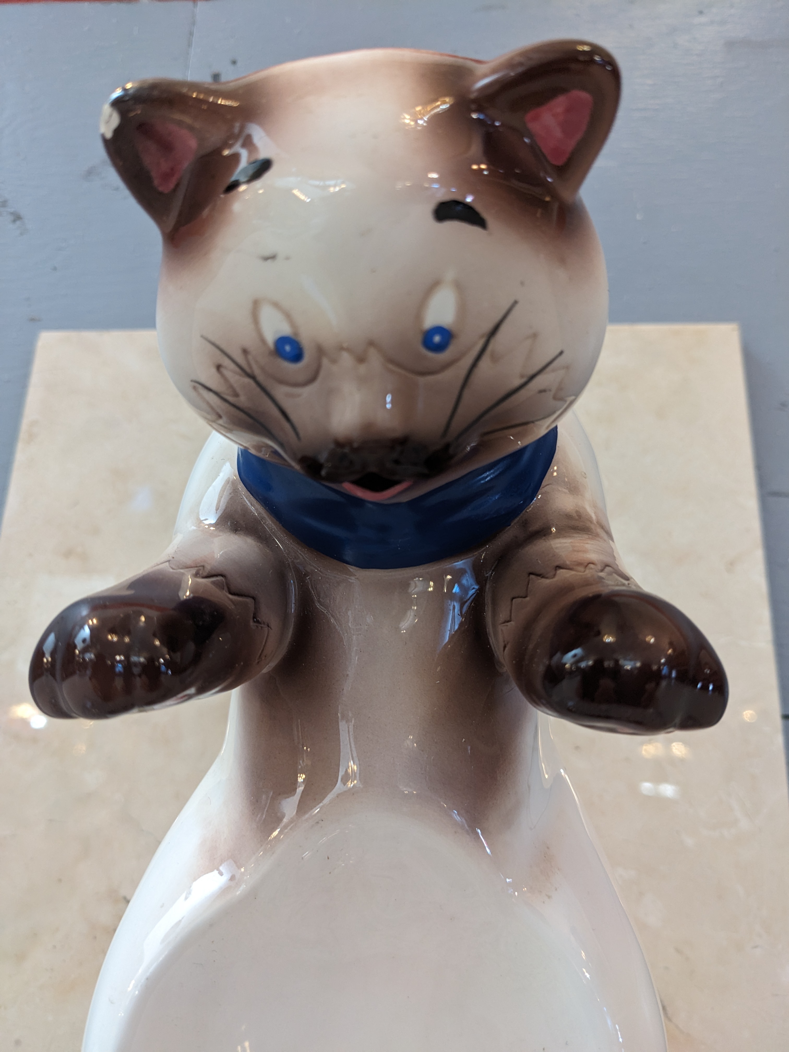 This cat isn't curious. He is Siamese and he is an obligated carnivore. Just look at his eyes and you know what he's thinking. he has a minor chip in the glaze on his left ear (probably from a junkyard brawl).