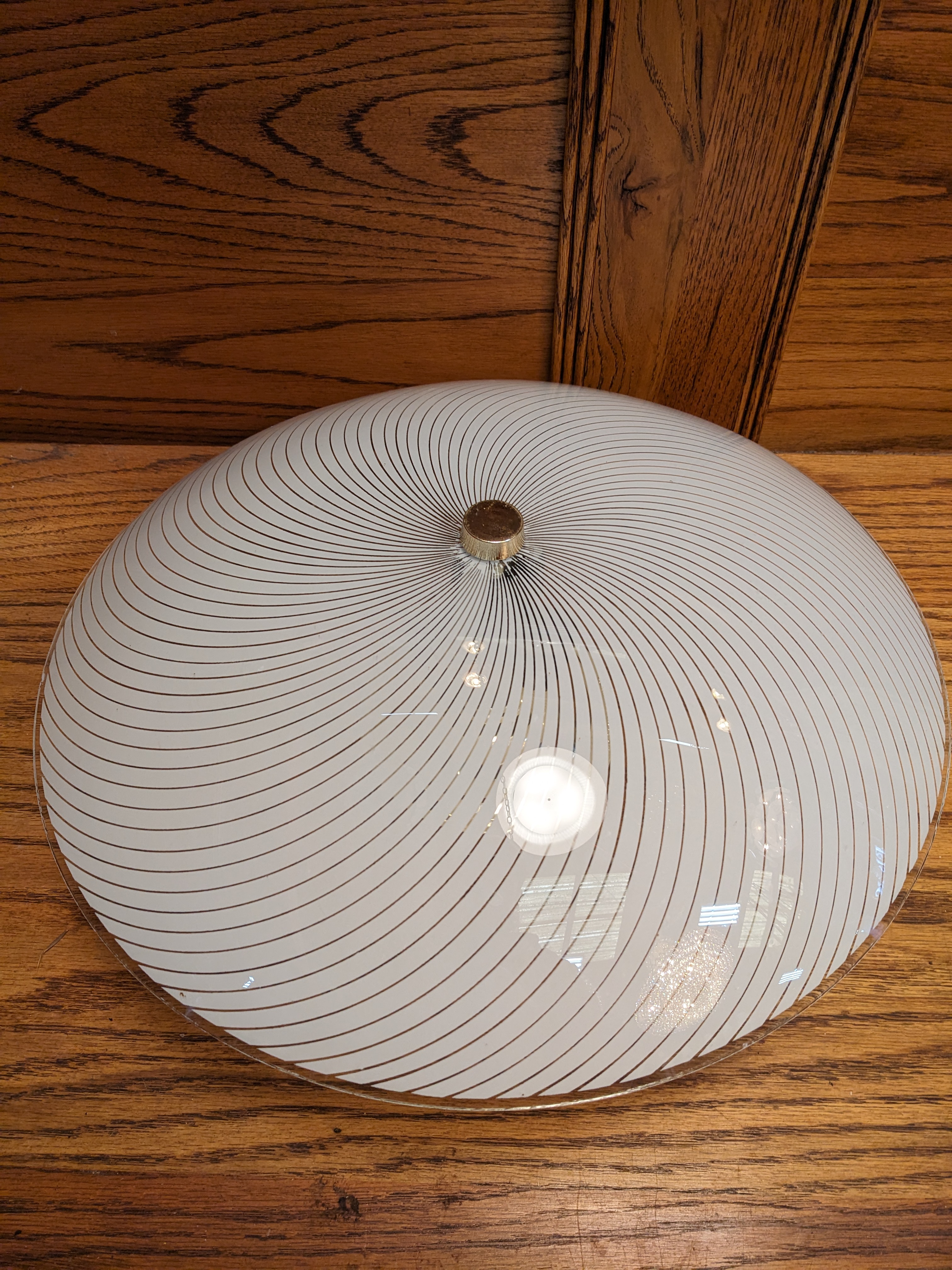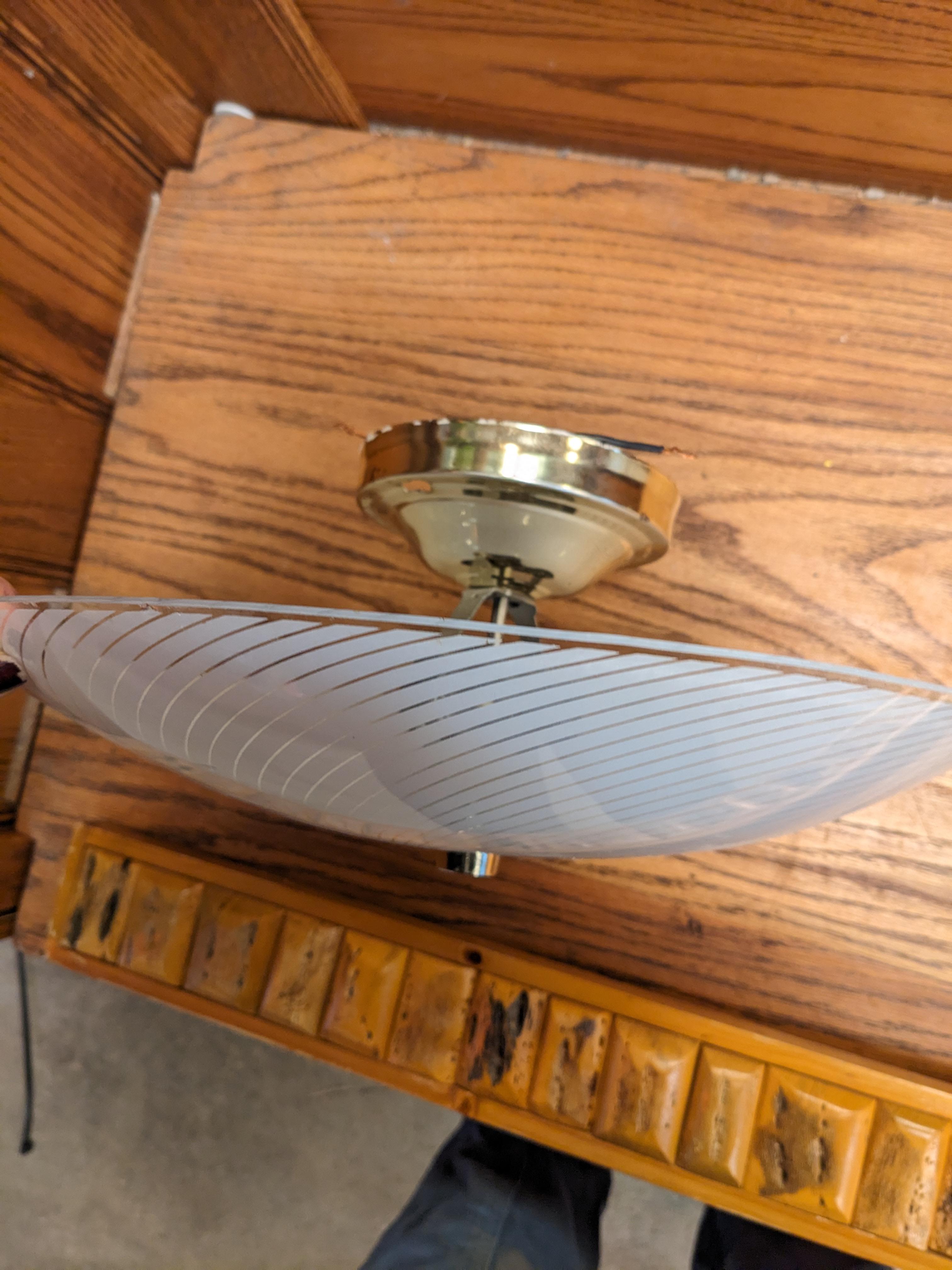 This swirl patterned glass saucer light fixture is flush mount and ready to installed in your home or buisness. In good condition with a gold fitter. 15 x 5.5. Pictures may be representative.