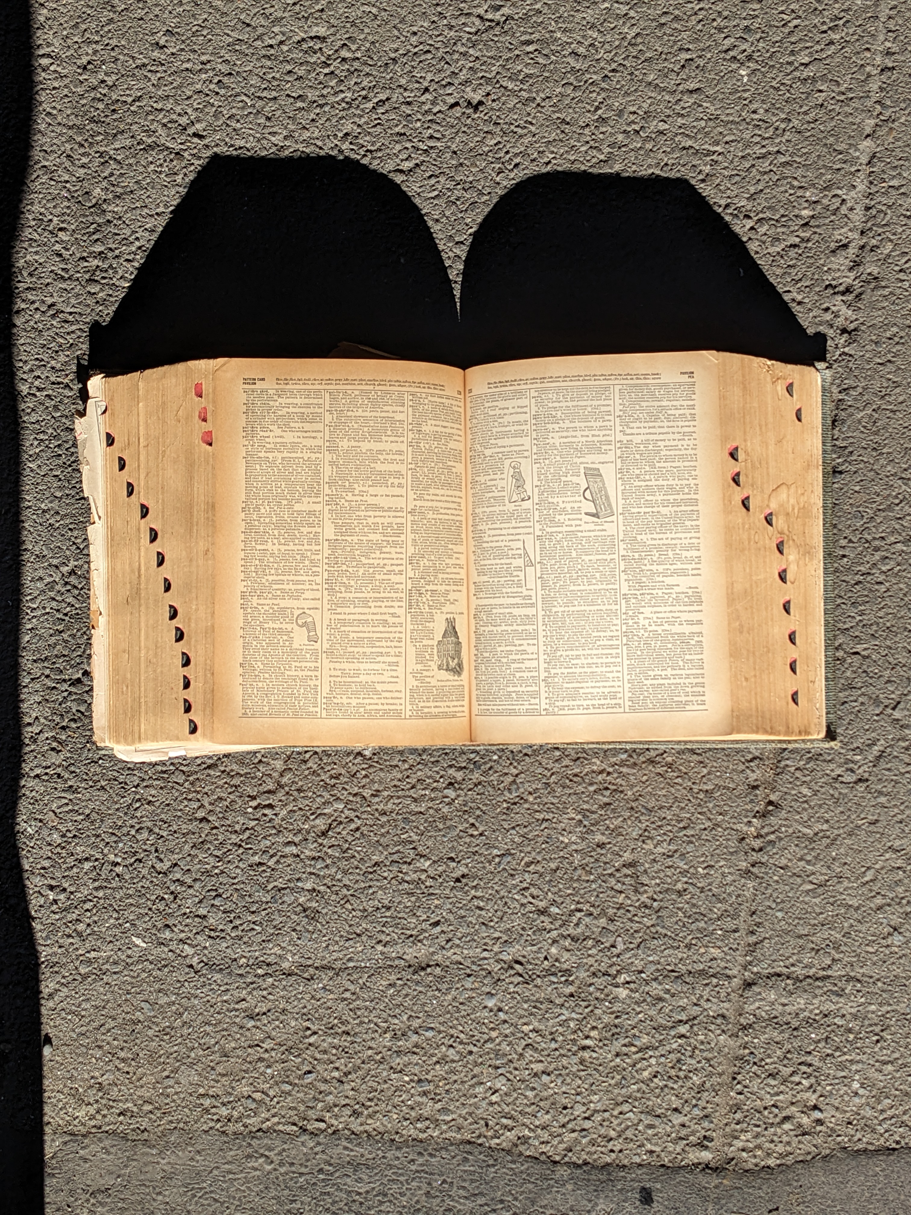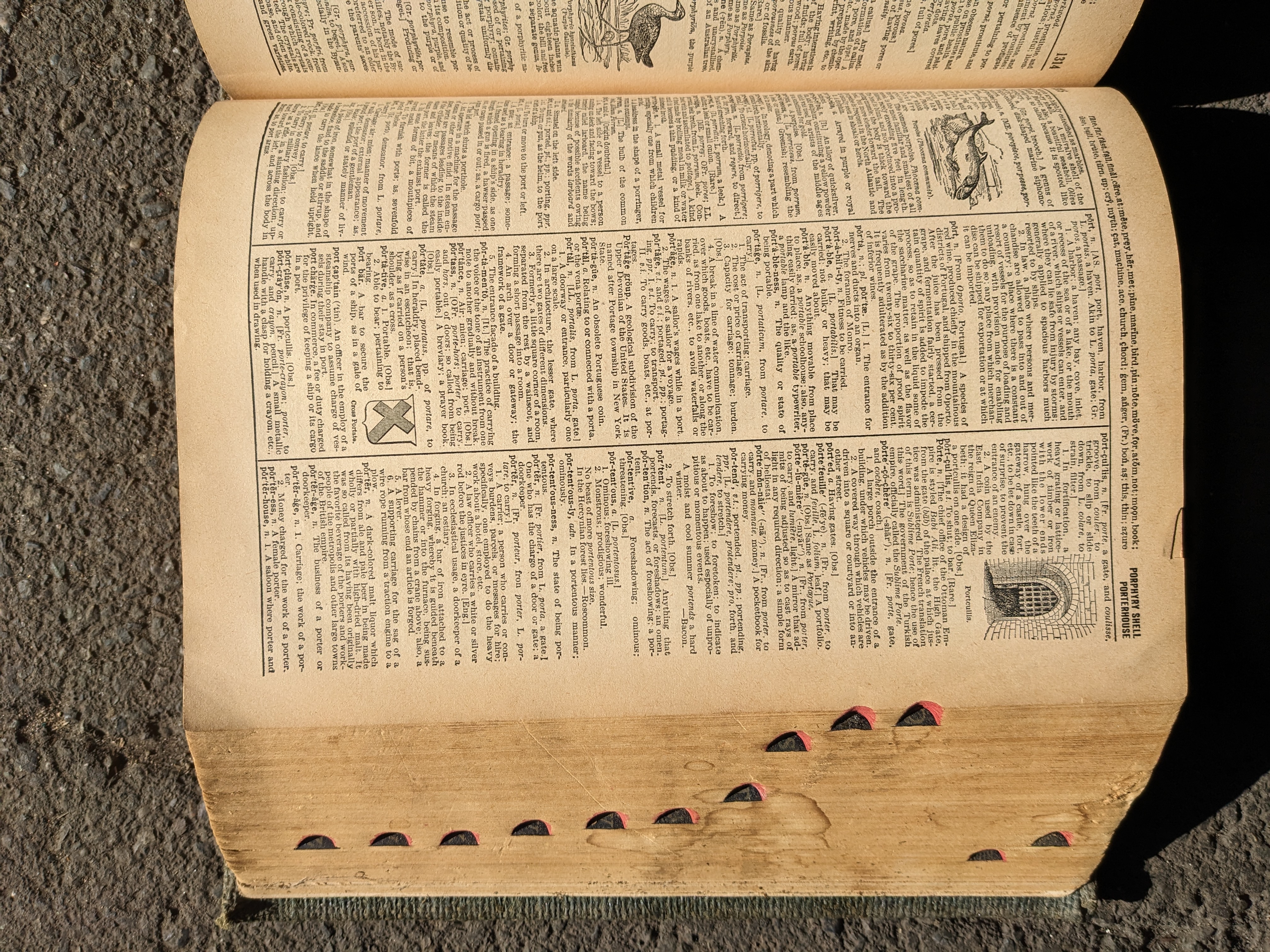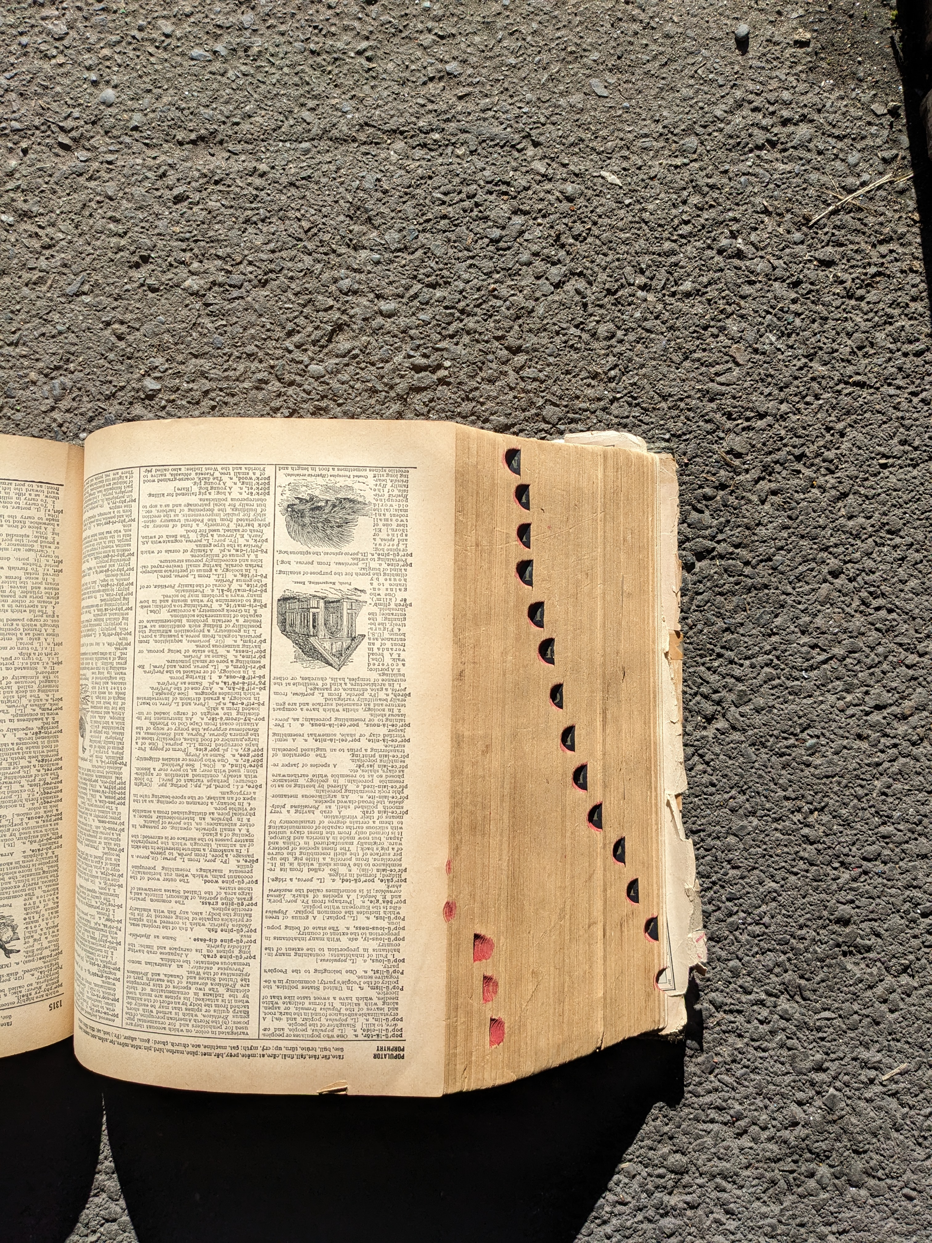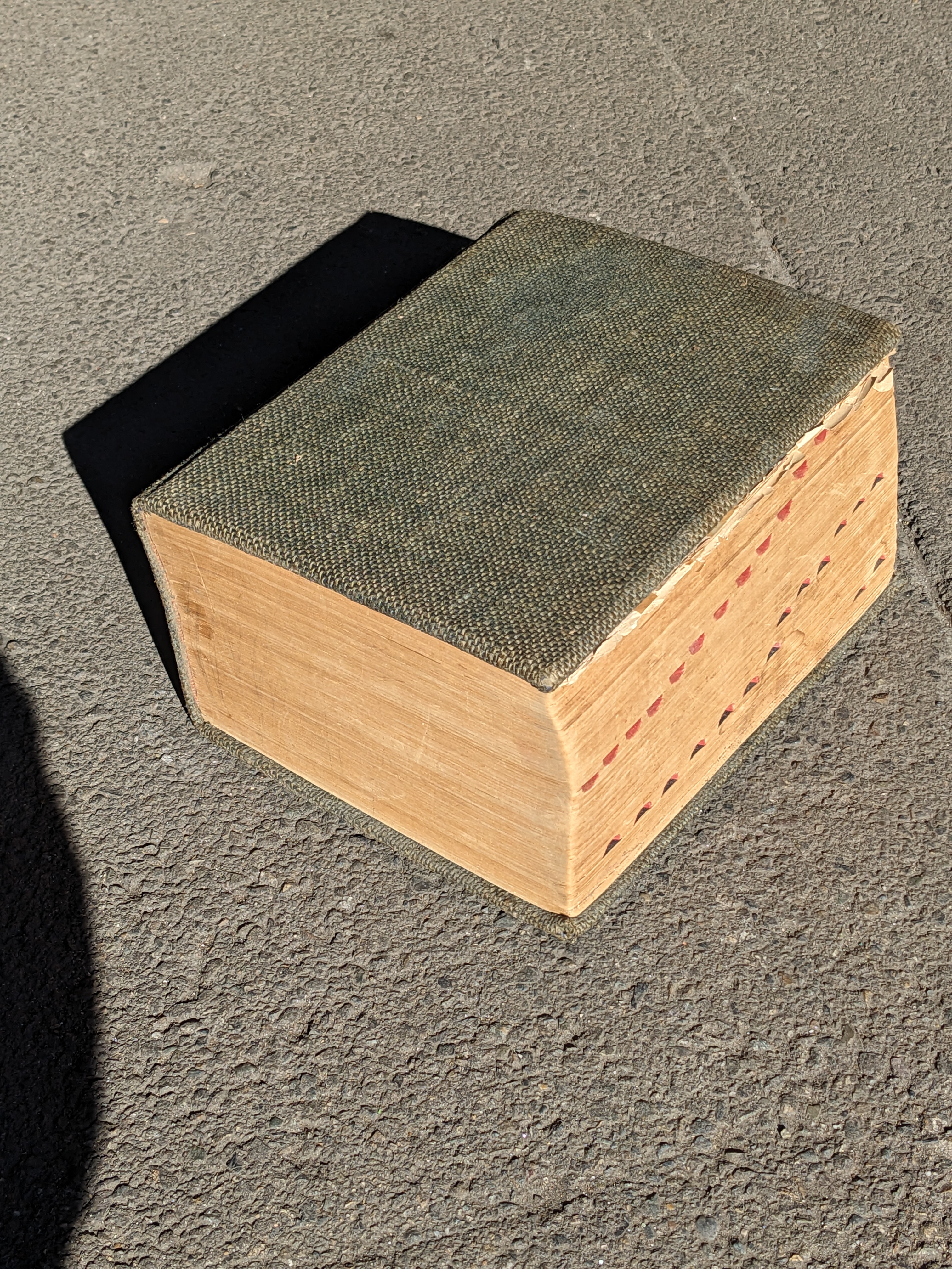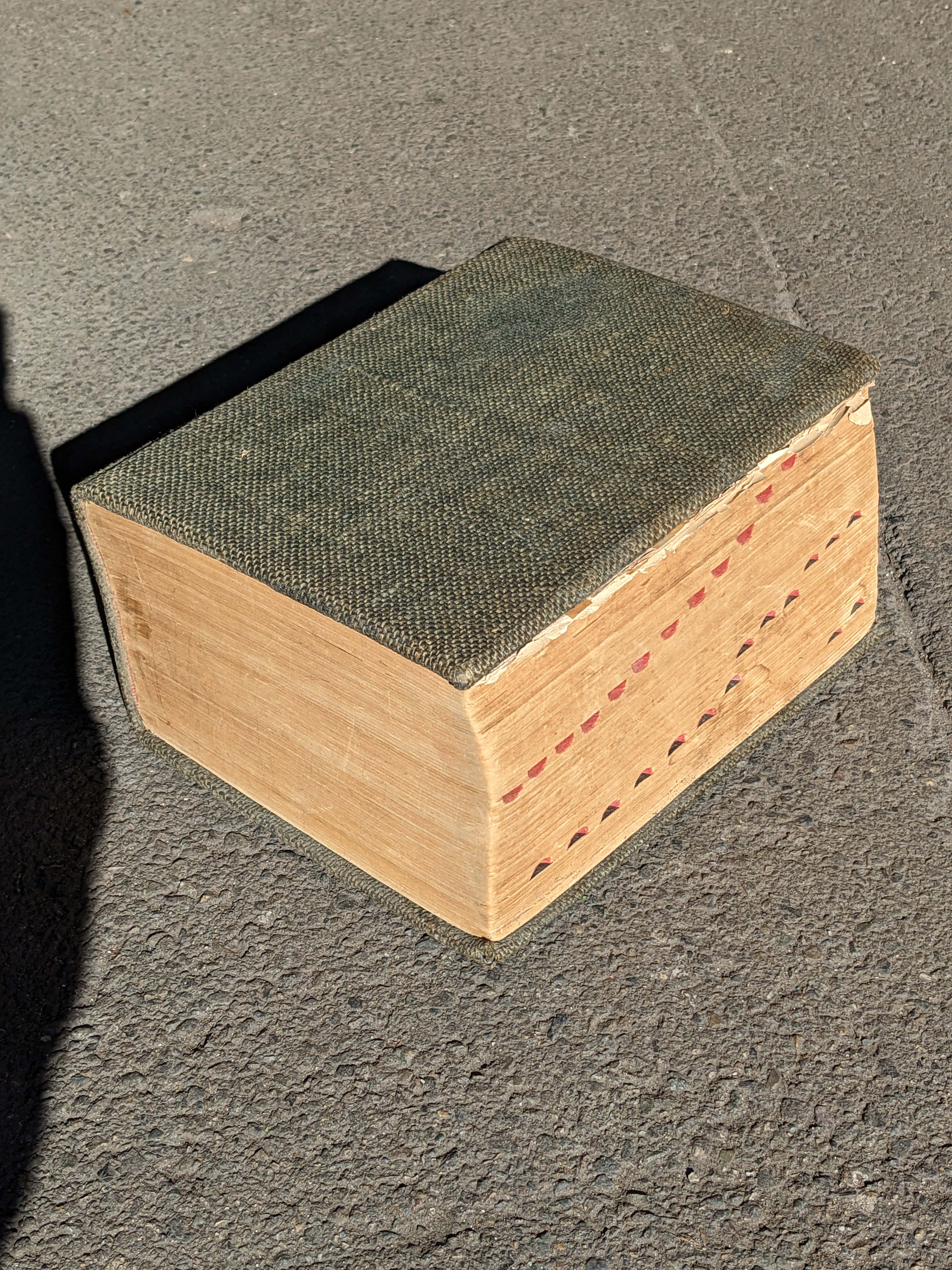 WWII era revision of Websteru2019s Imperial Dictionary. I'm going to guess the early 1940s?. Pages torn at the front and back make determining a specific year of publication difficult. A little light reading though tells me that WWI has happened, yet no mention of a second WW. The latest mentioned date I can find is of the consulting editor Harold Whitehall who served as a professor of English at Queens College and Guggenheim Fellow for English in the year 1939-1940. Id also say that the army green tweed cover is unoriginal due to its uncharacteristic nature of Webster dictionaries. Modern maps have been laid on the inner cover faces as well. This book may have had a few personalized touches over the years, but nevertheless it is an impressively massive collection of the modern English language. This book is huge - over 2000 pages - Dimensions: 8.75 x 11.25 x 5.5