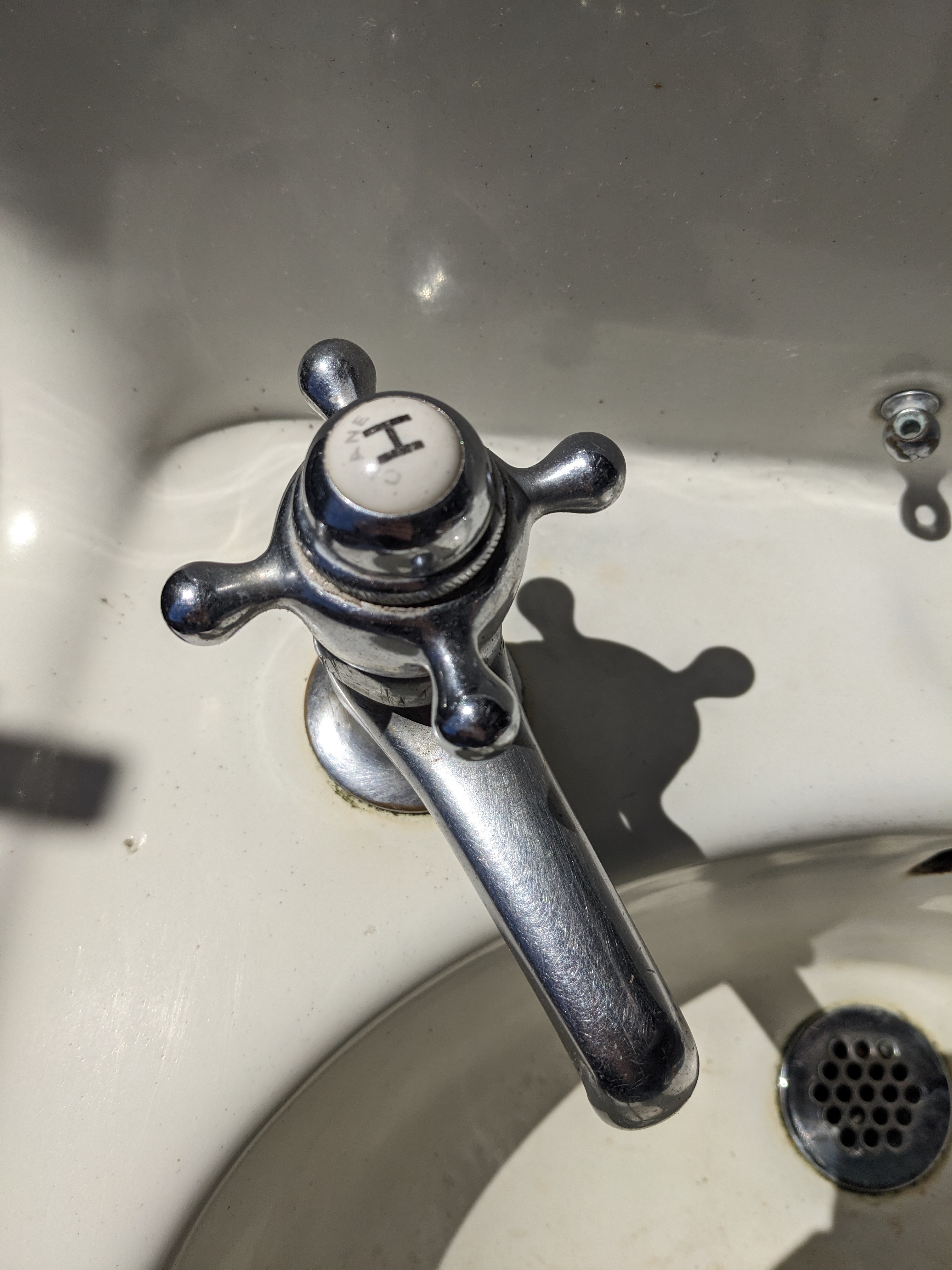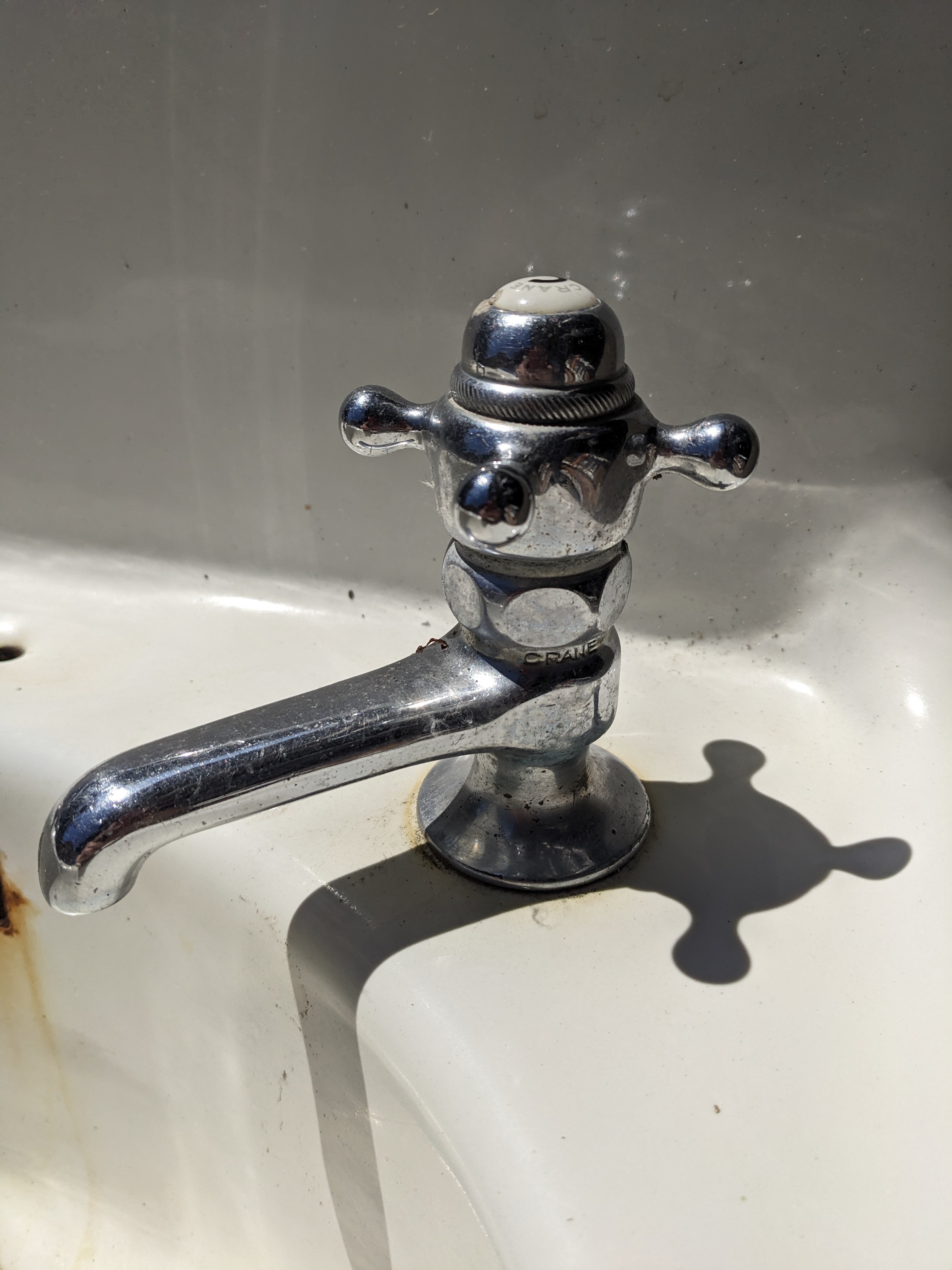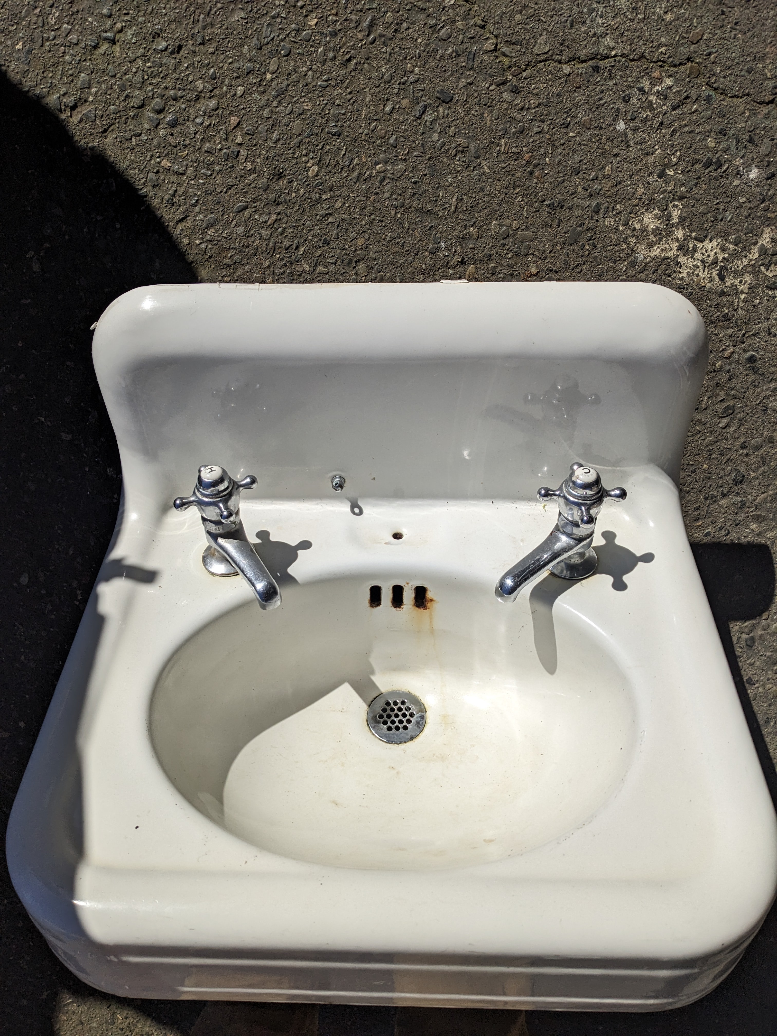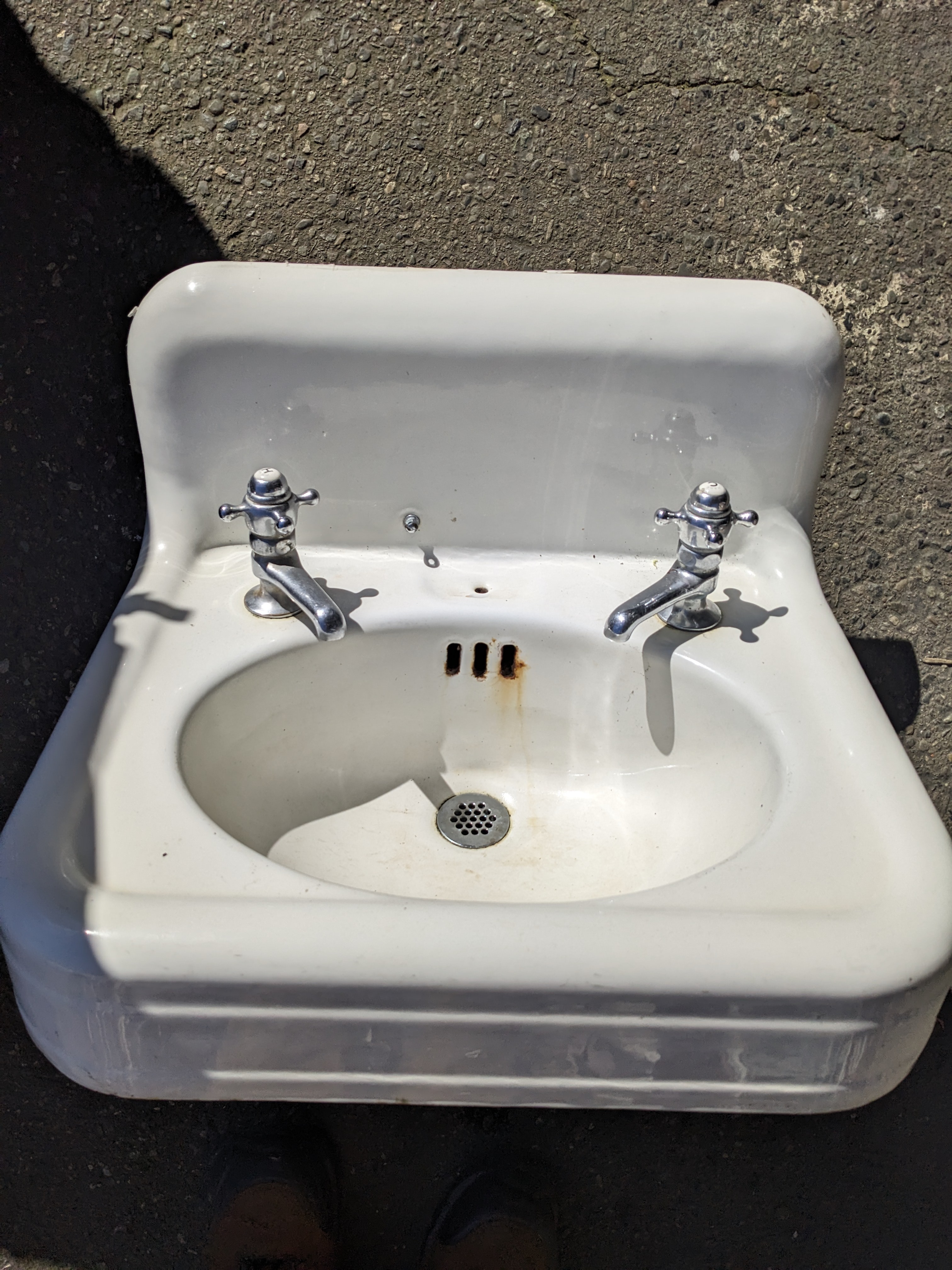 This vintage porcelain sink is in decent shape. Some surface rust is present.