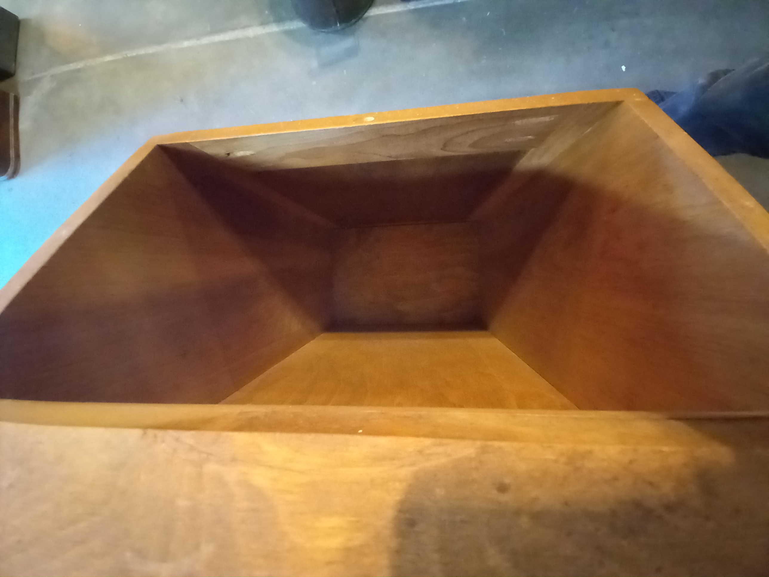 A great storage solution, laundry hamper, dog food storage, you name it. It has a few scuffs and scratches and looks nice as is but could be refinished with ease. It measures 18.75 x 13.25 x 34.25 inches.