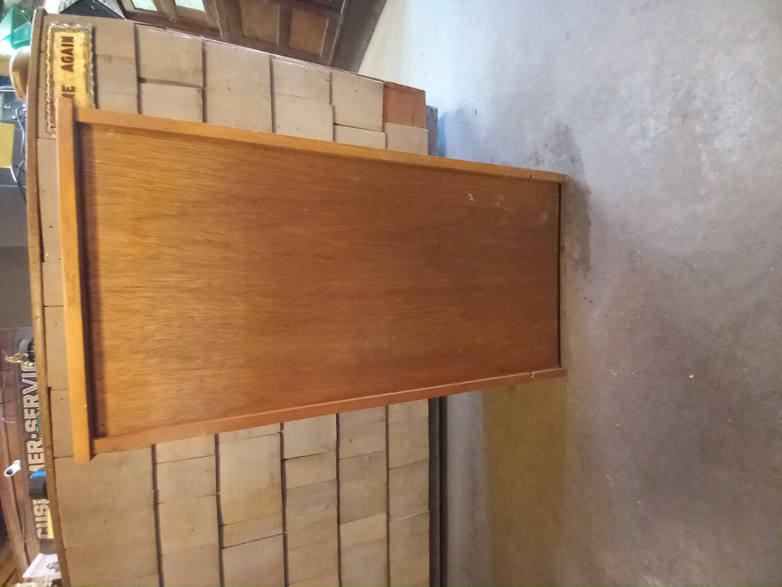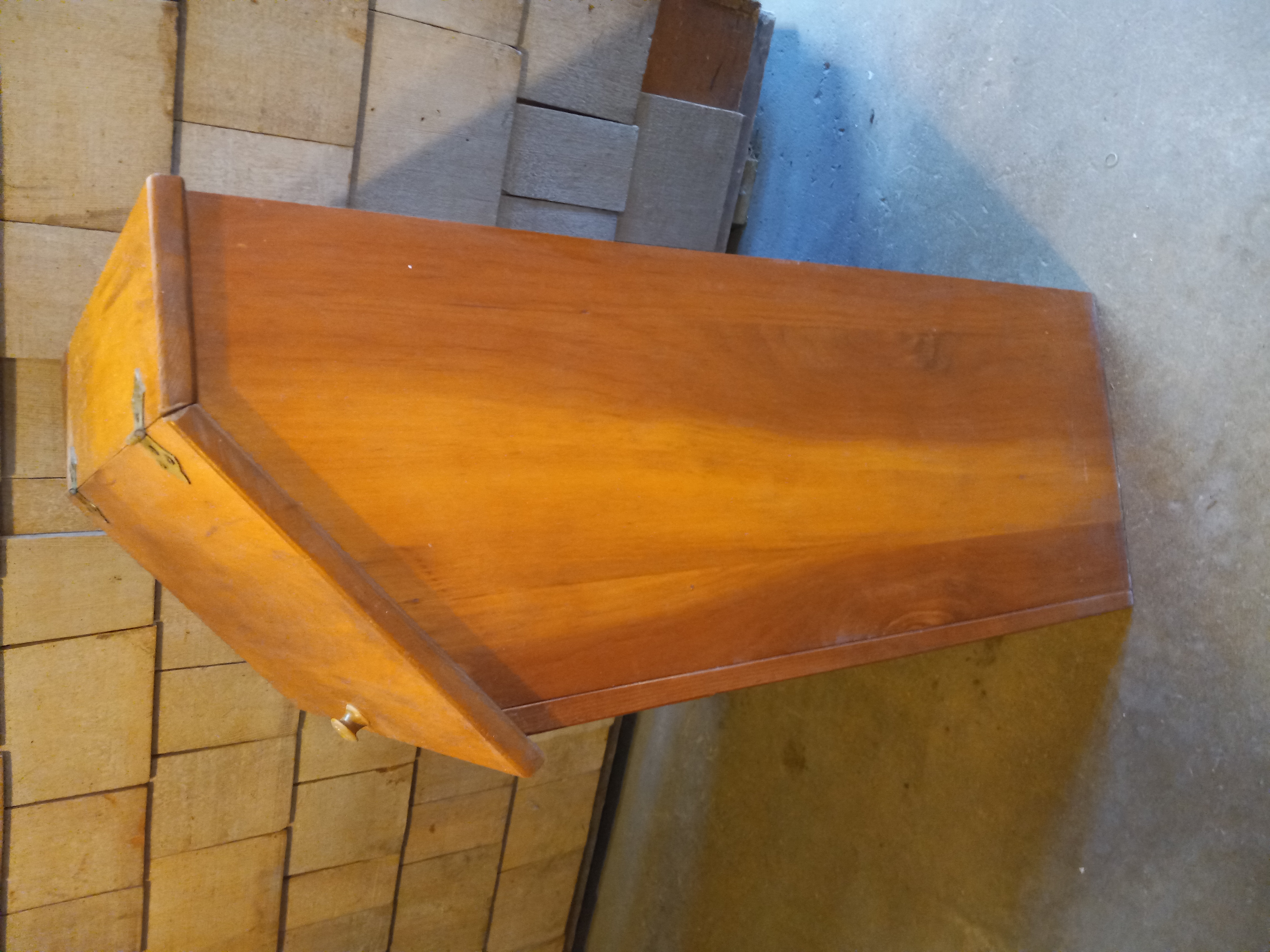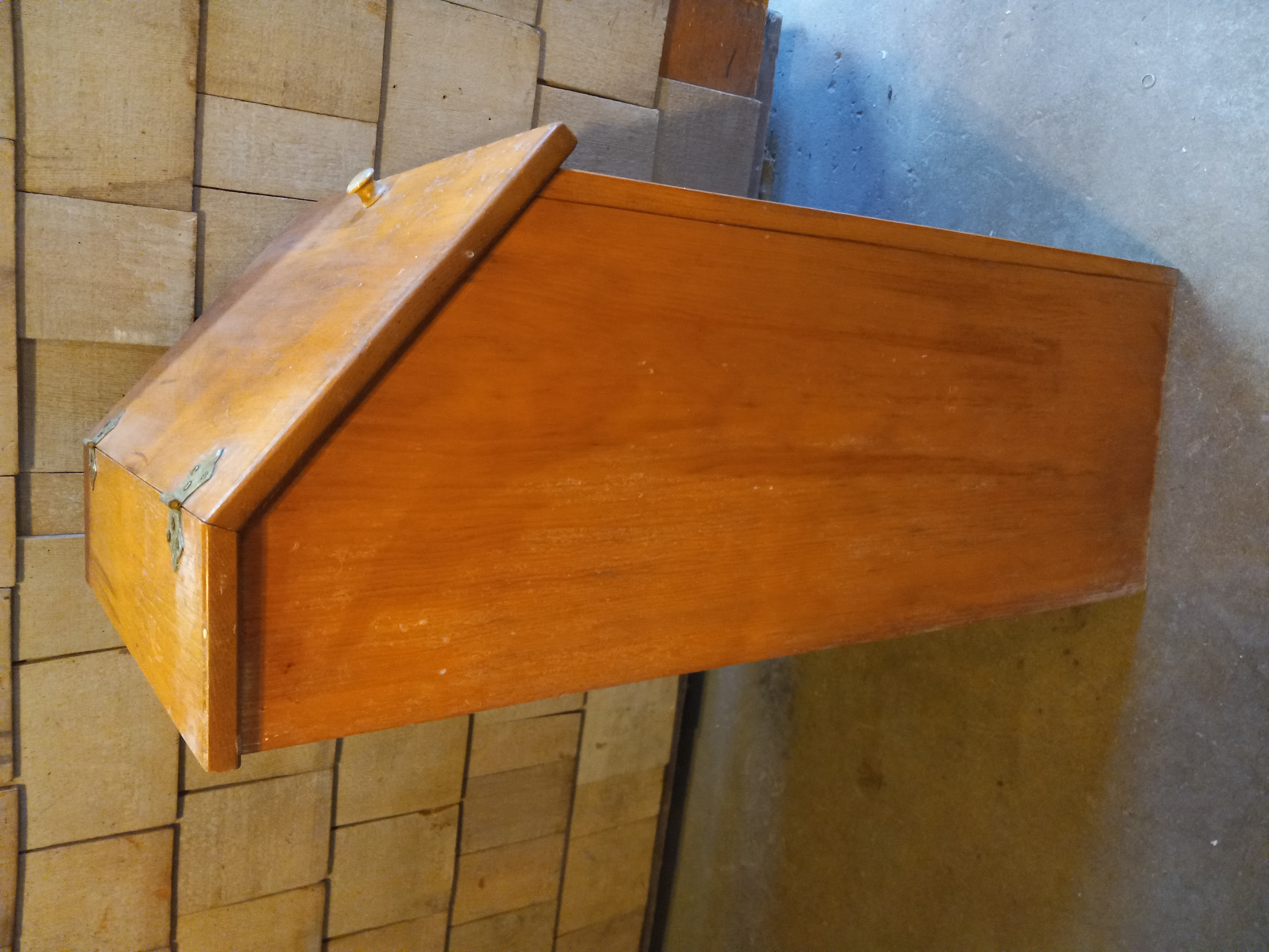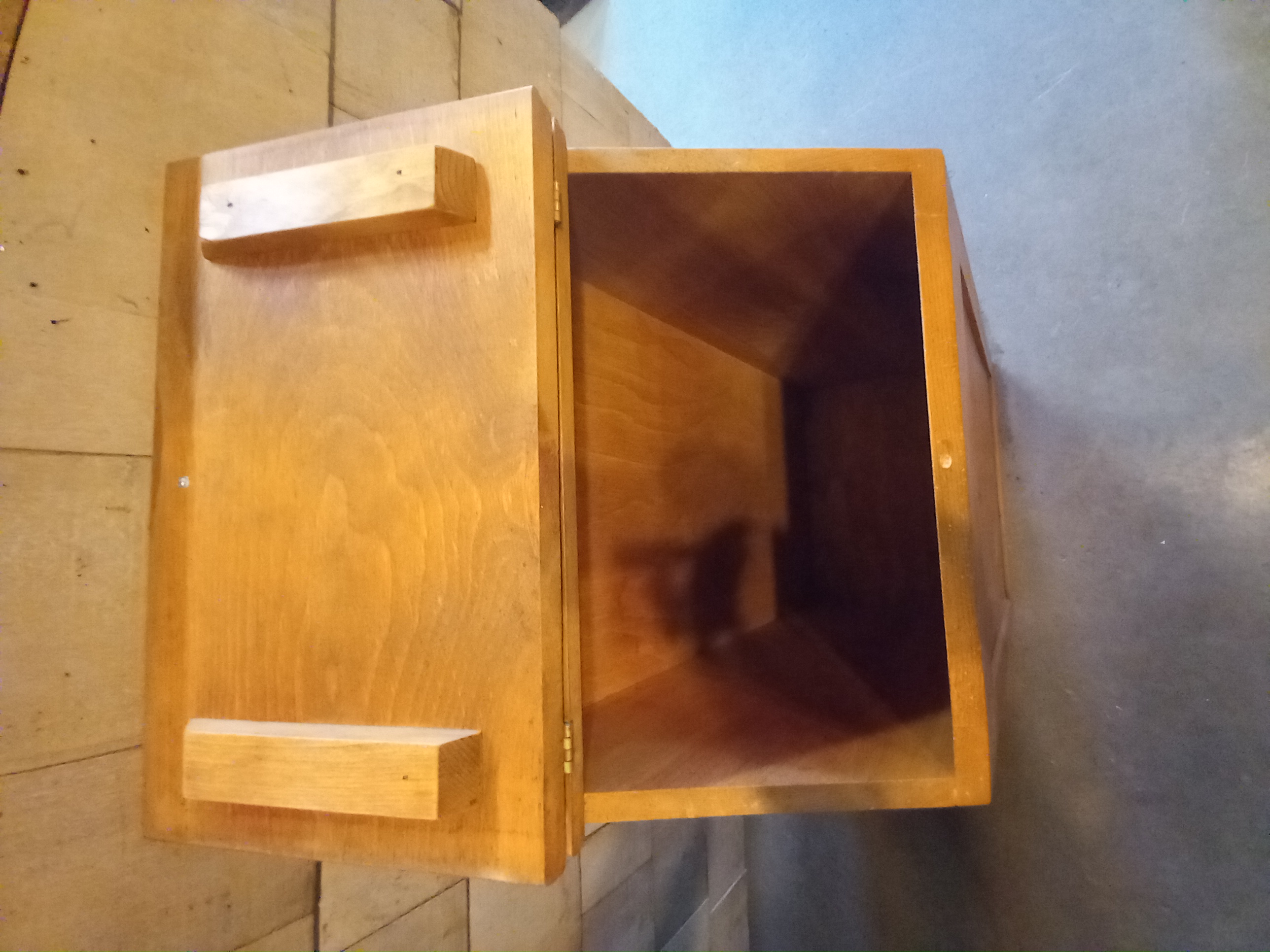 A mid century style wooden storage bid. This is in good condition and very clean inside. It is made out of Fir and has a lovely Mahogany veneer backing.