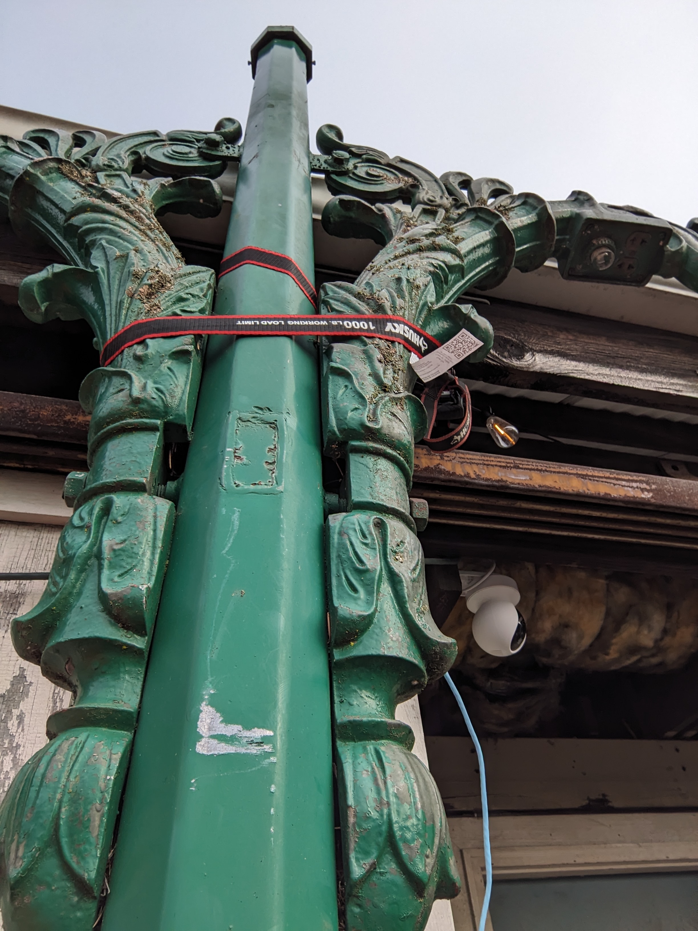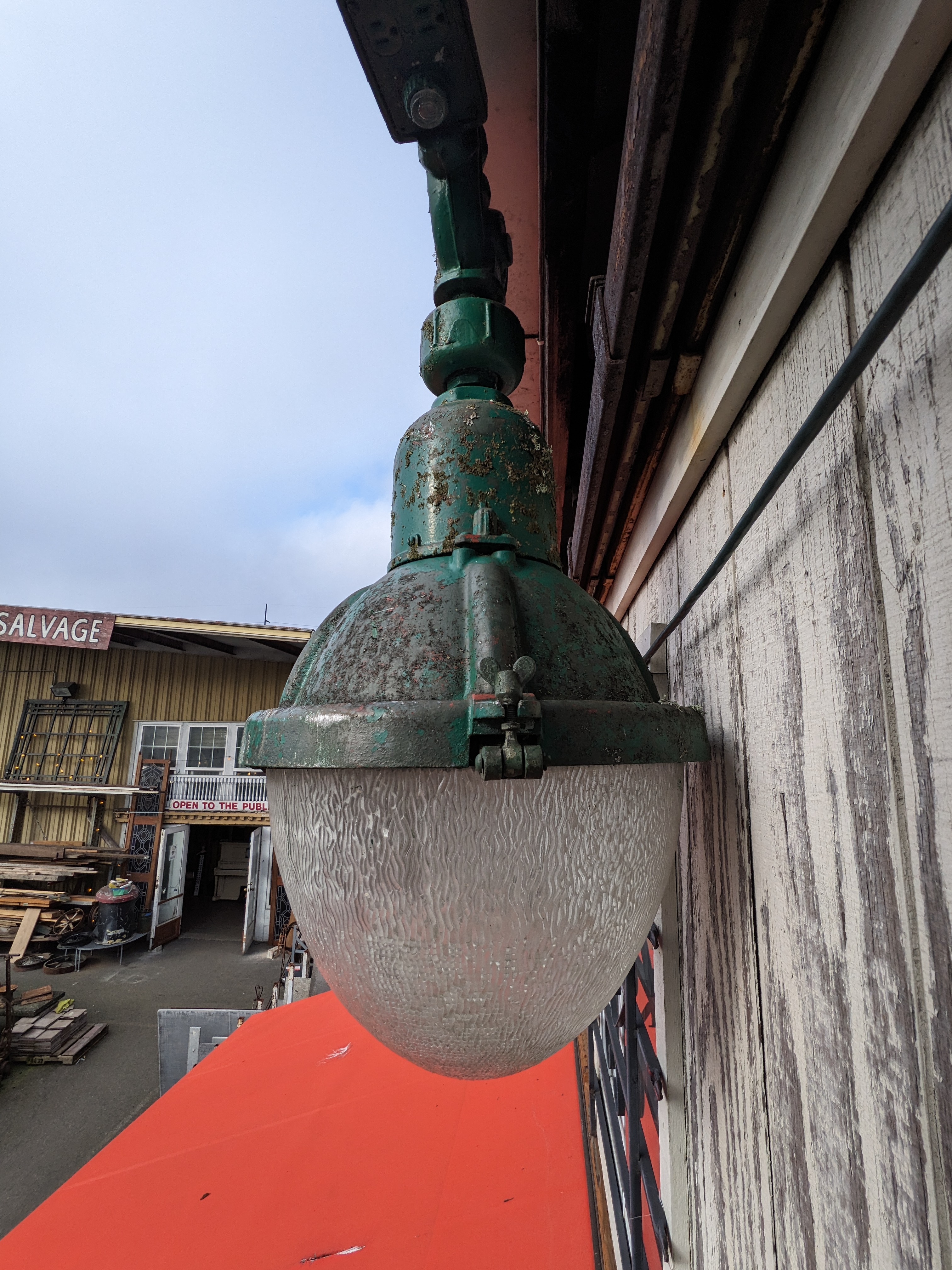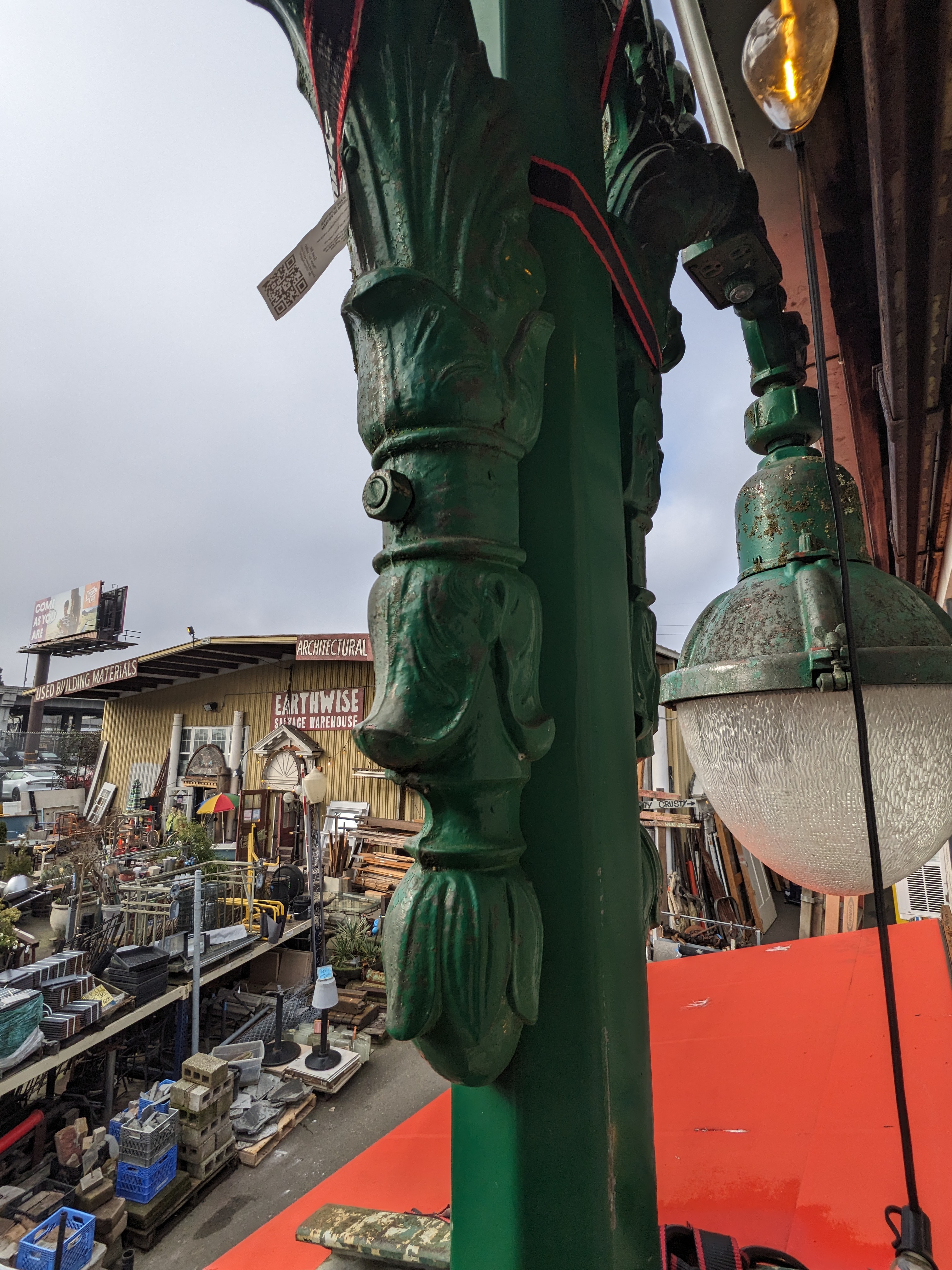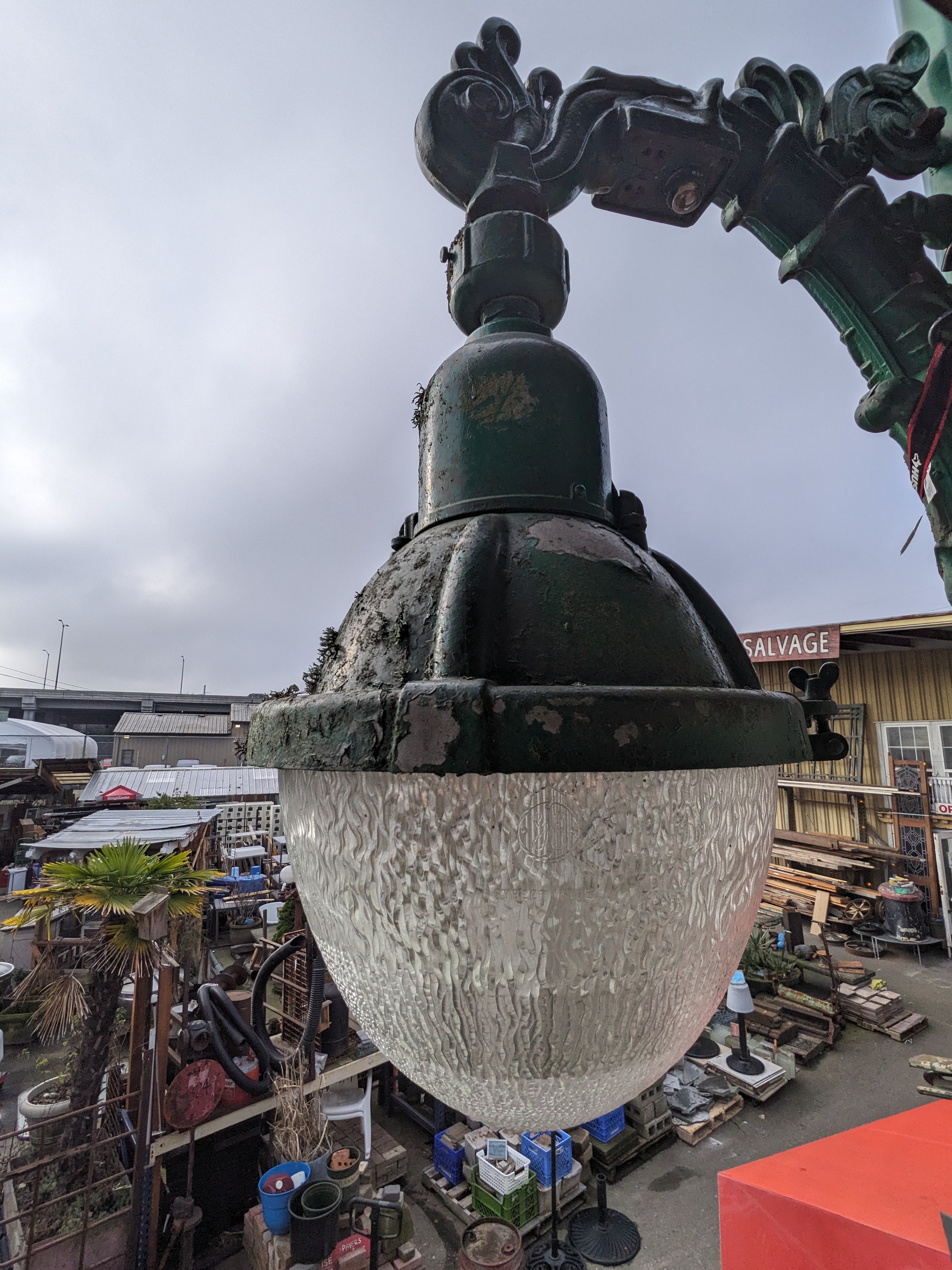 A lamp post from the turn of the century, in incredible condition. Adorned with intricate filigree along the top arching out to the individual lights. With the shades are textured and would look incredible lit up. This would be perfect for a variety of settings, from a backyard to a business, even for a storefront display. In good condition, easy access to the wiring as well. Stunning in its own right. Stop on by to take a look!
