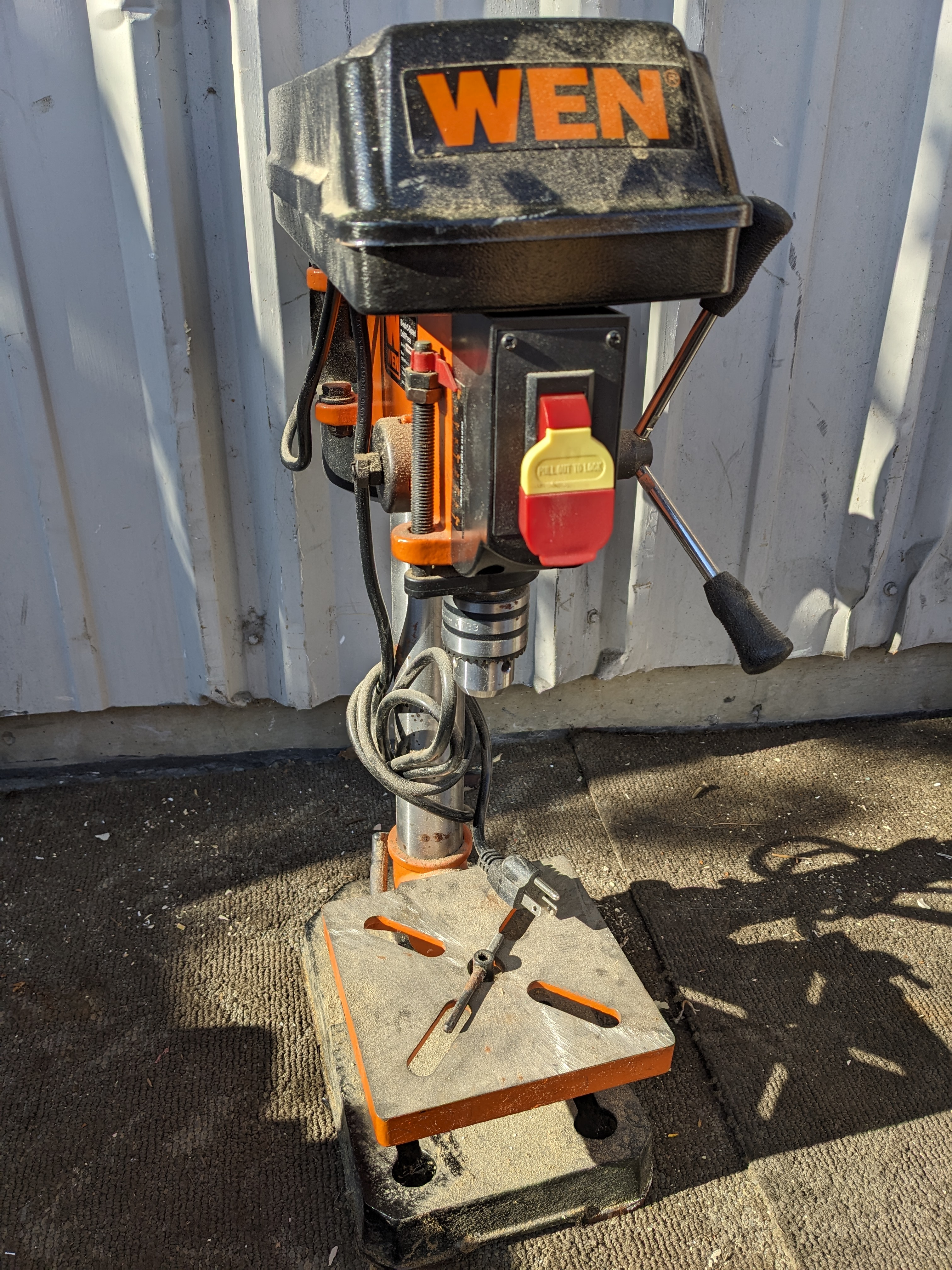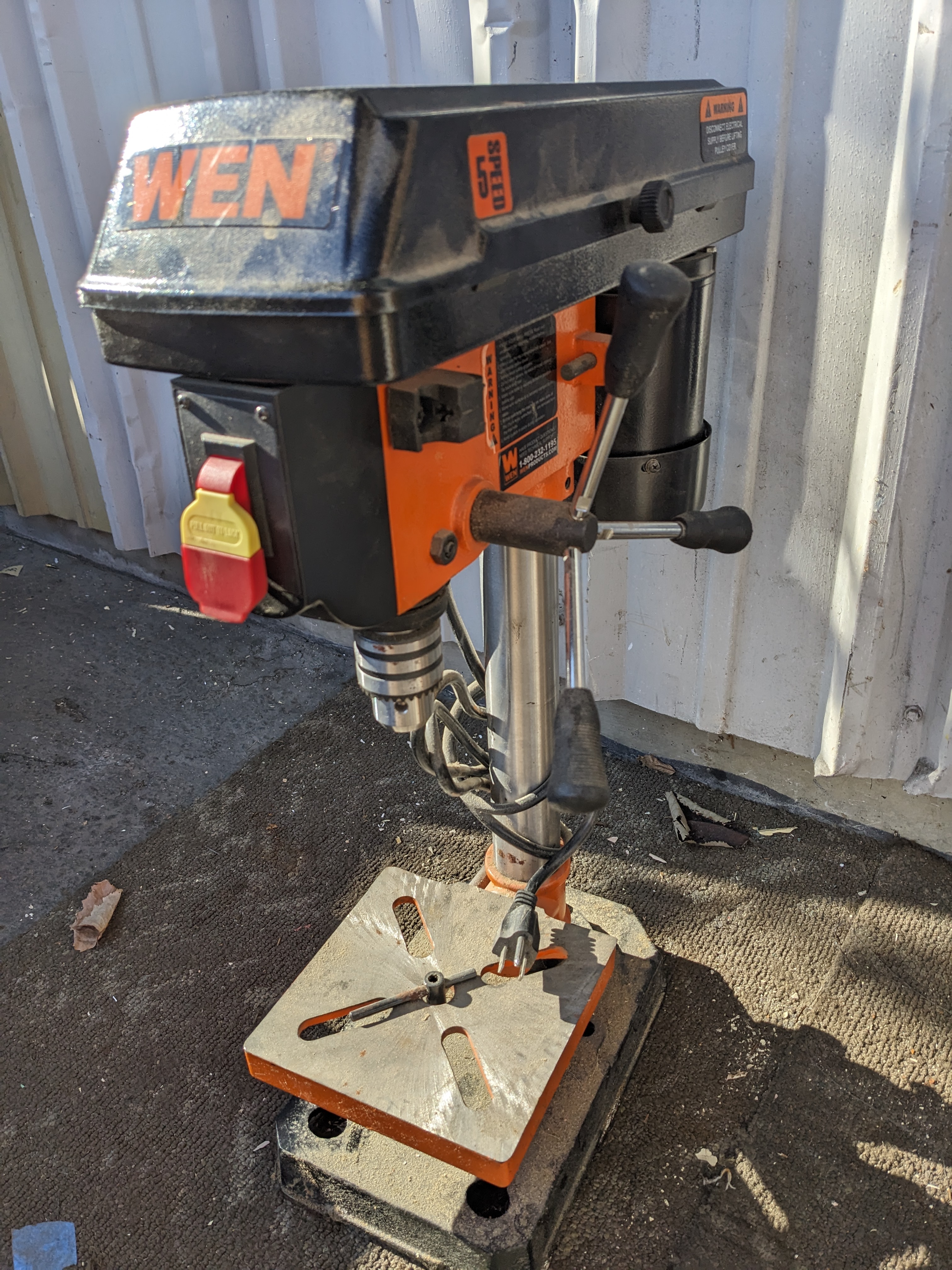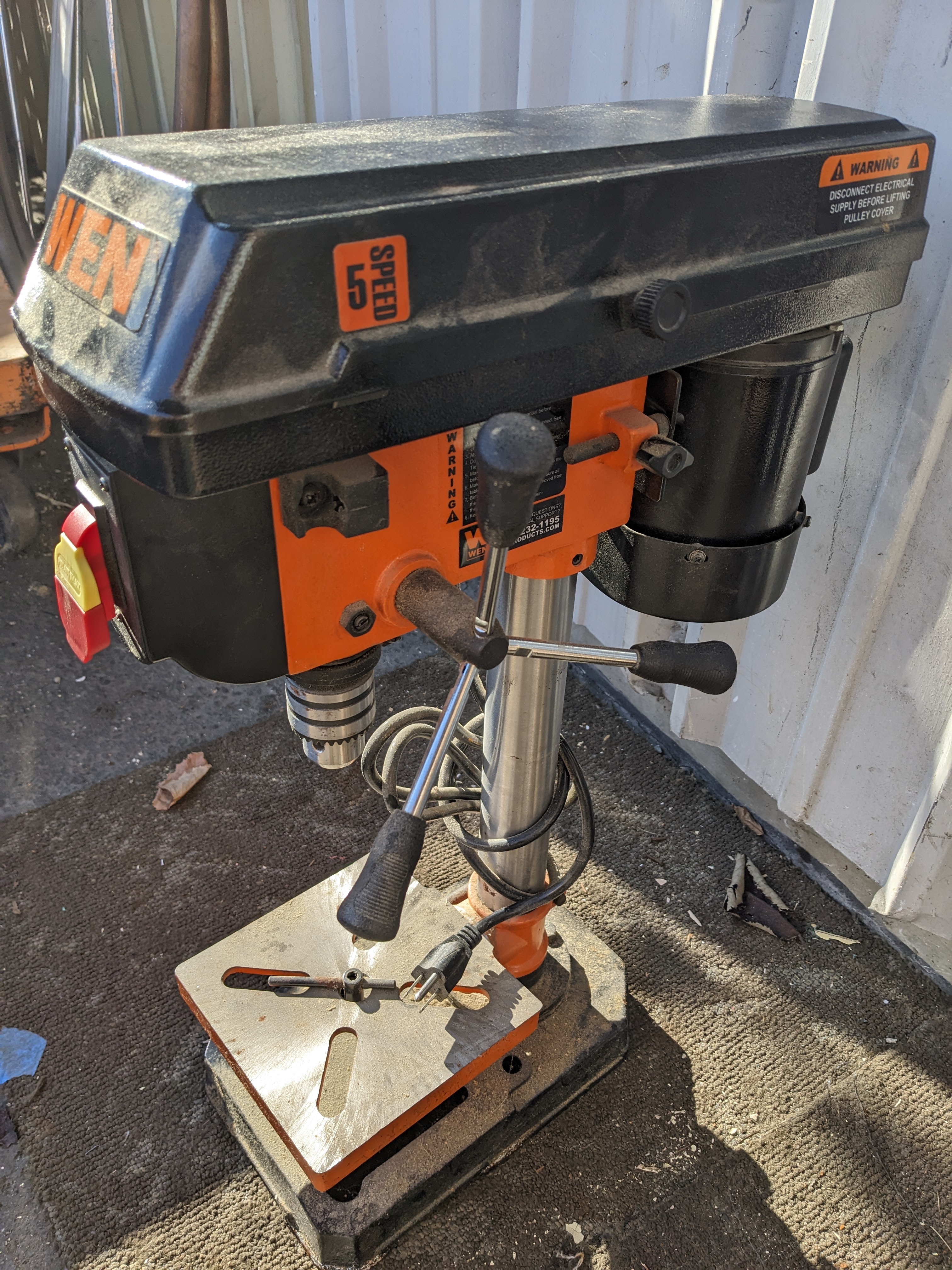 This drill press features a 2.3 Amp induction motor. It also has 5 operating speeds. Additionally it has a 6.5" x 6.5" table that bevels 45 degrees left or right.