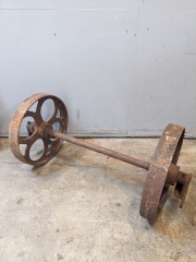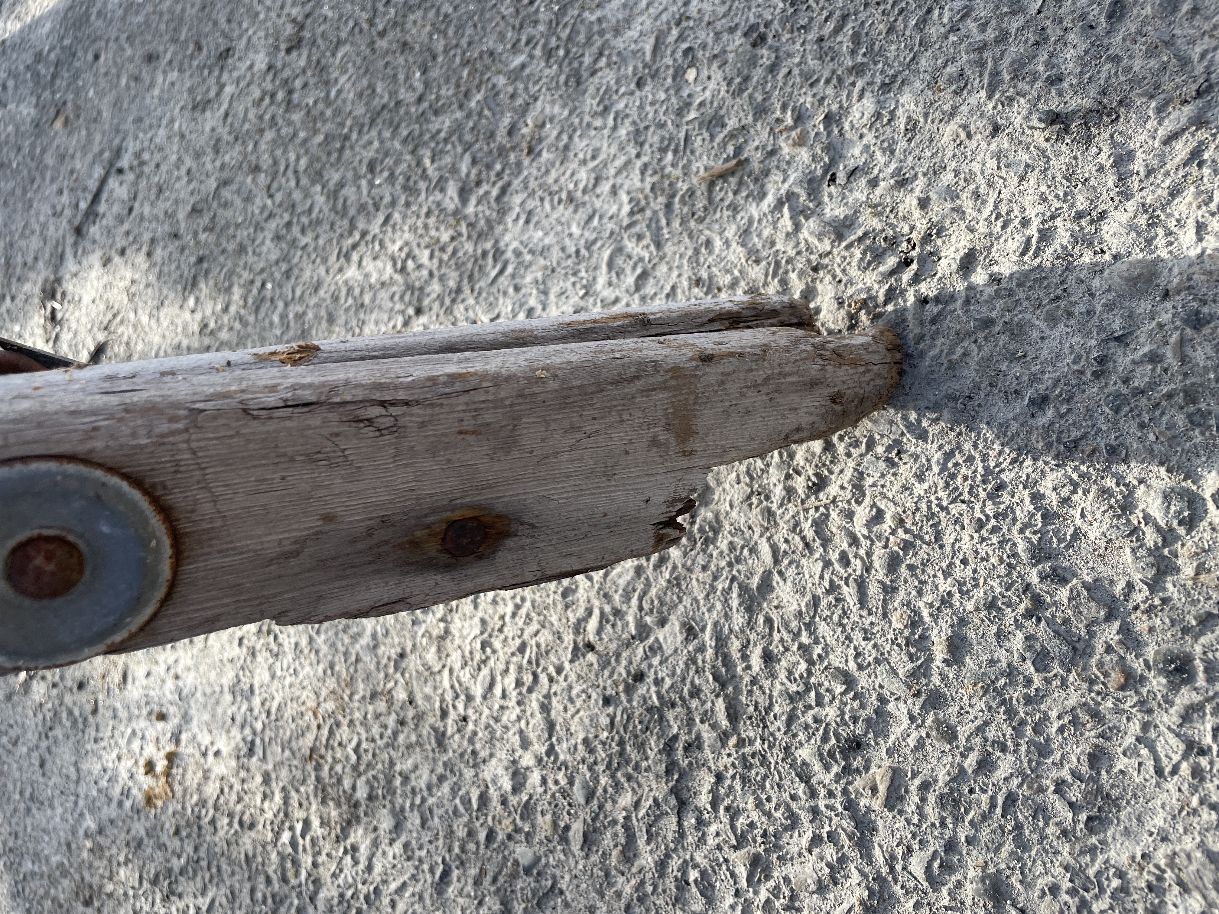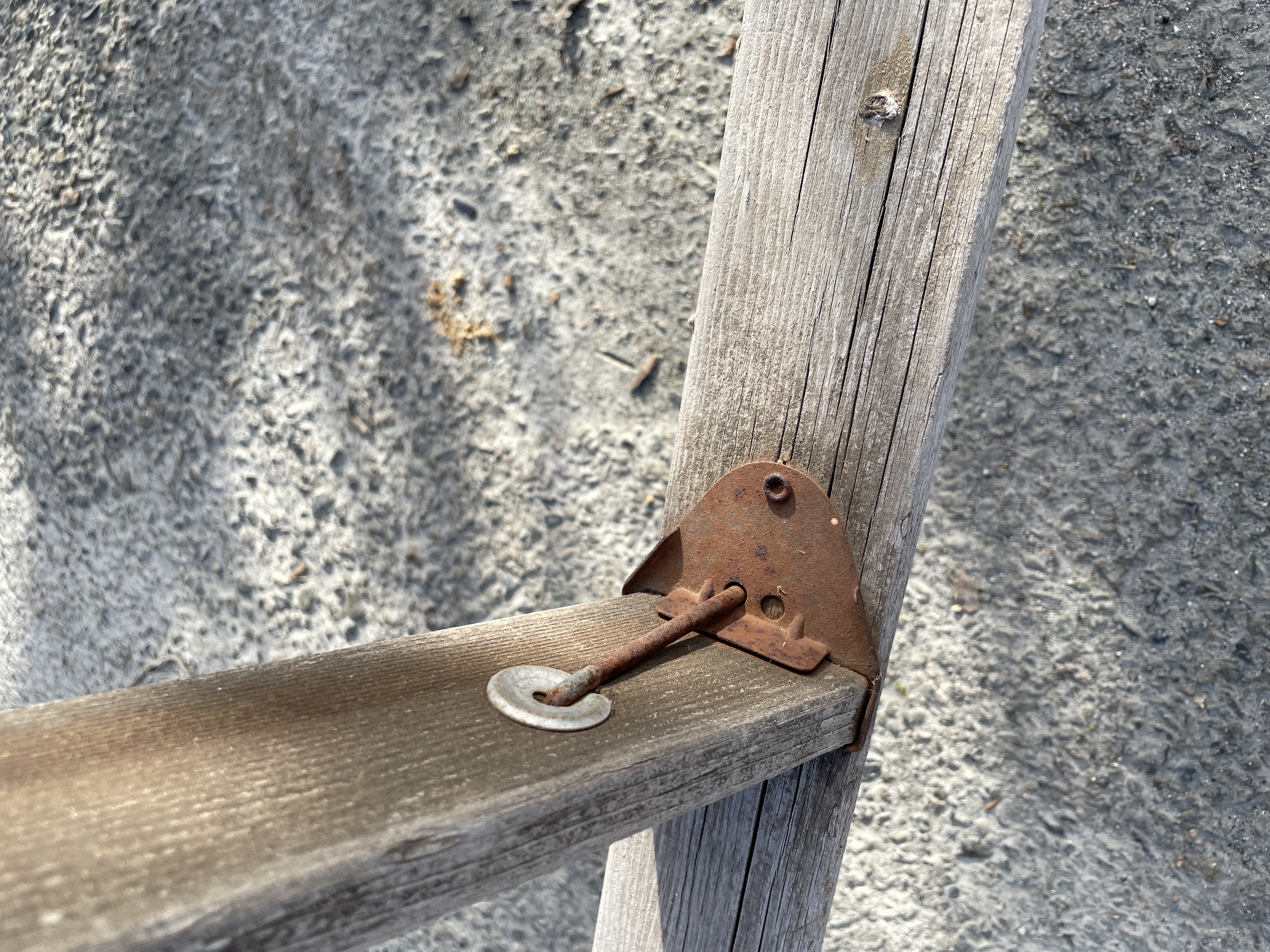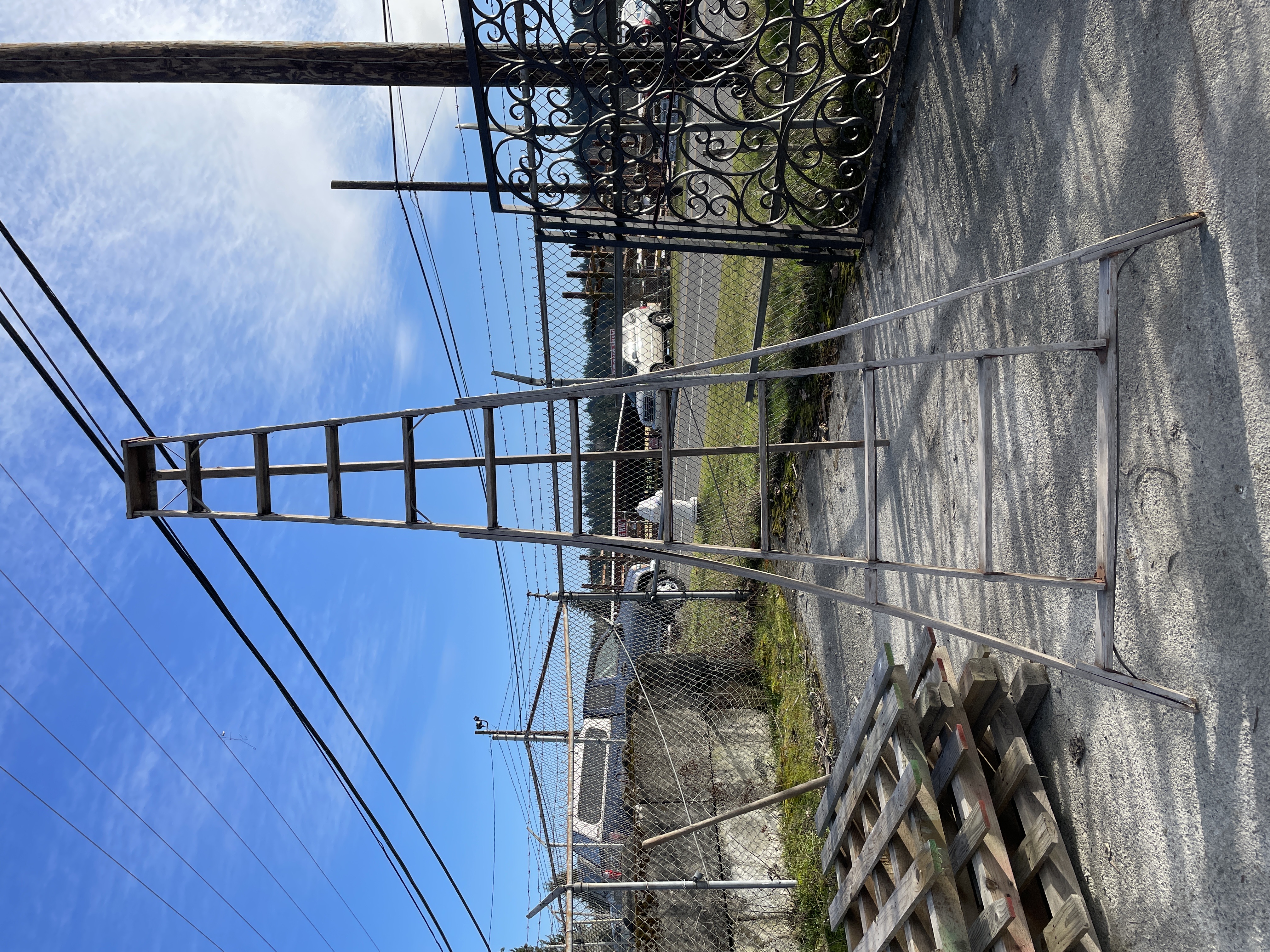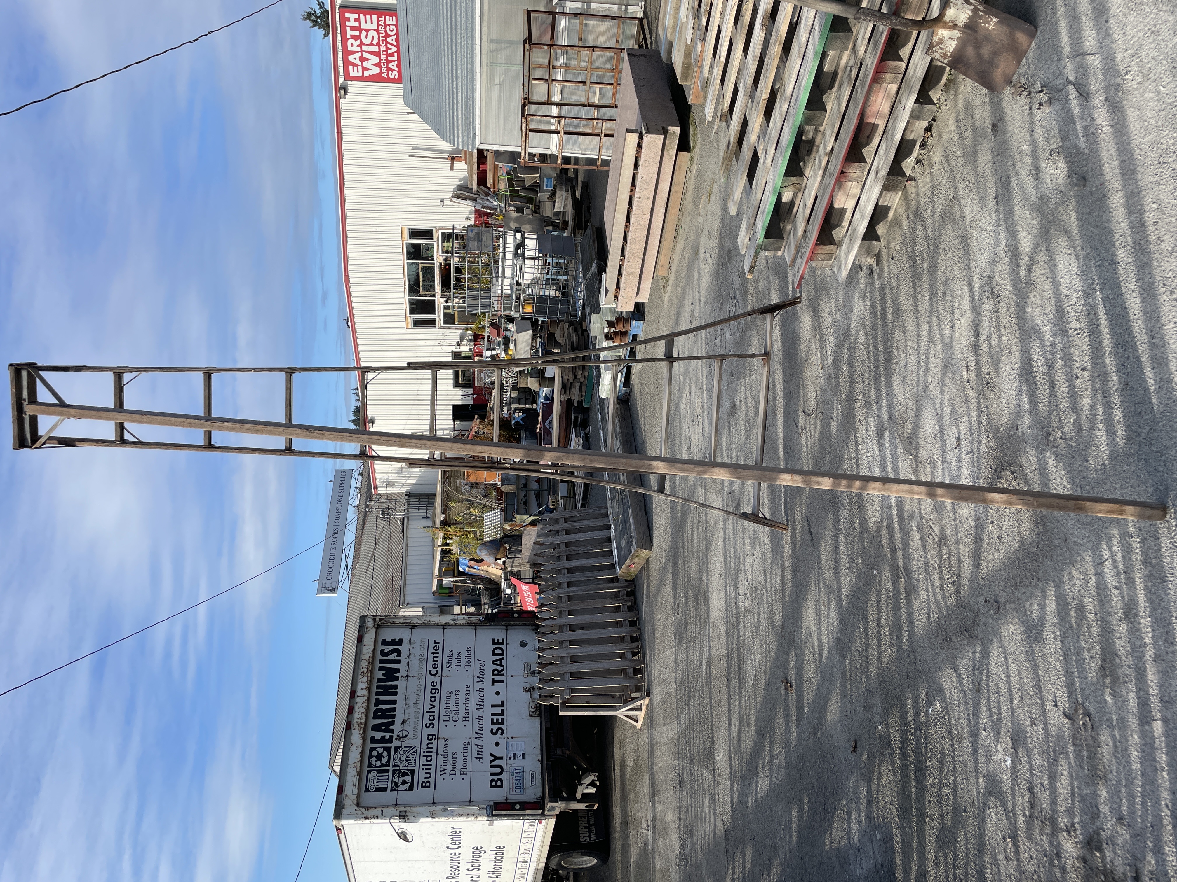 Dimensions: 50W x 12 feet tall. Made with wood and metal. Would be great in the yard. The bottom feet are broken and som metal is rusted.