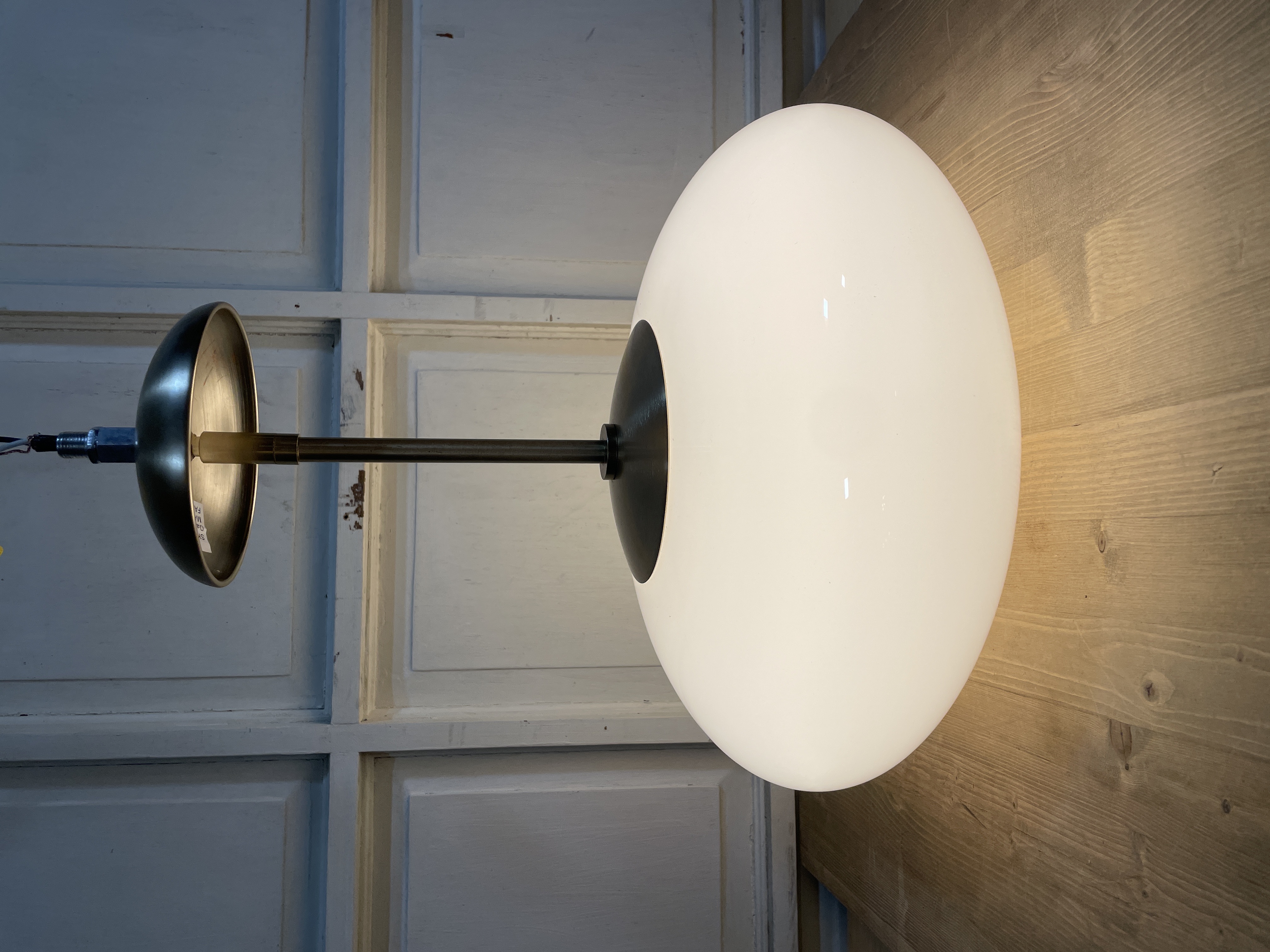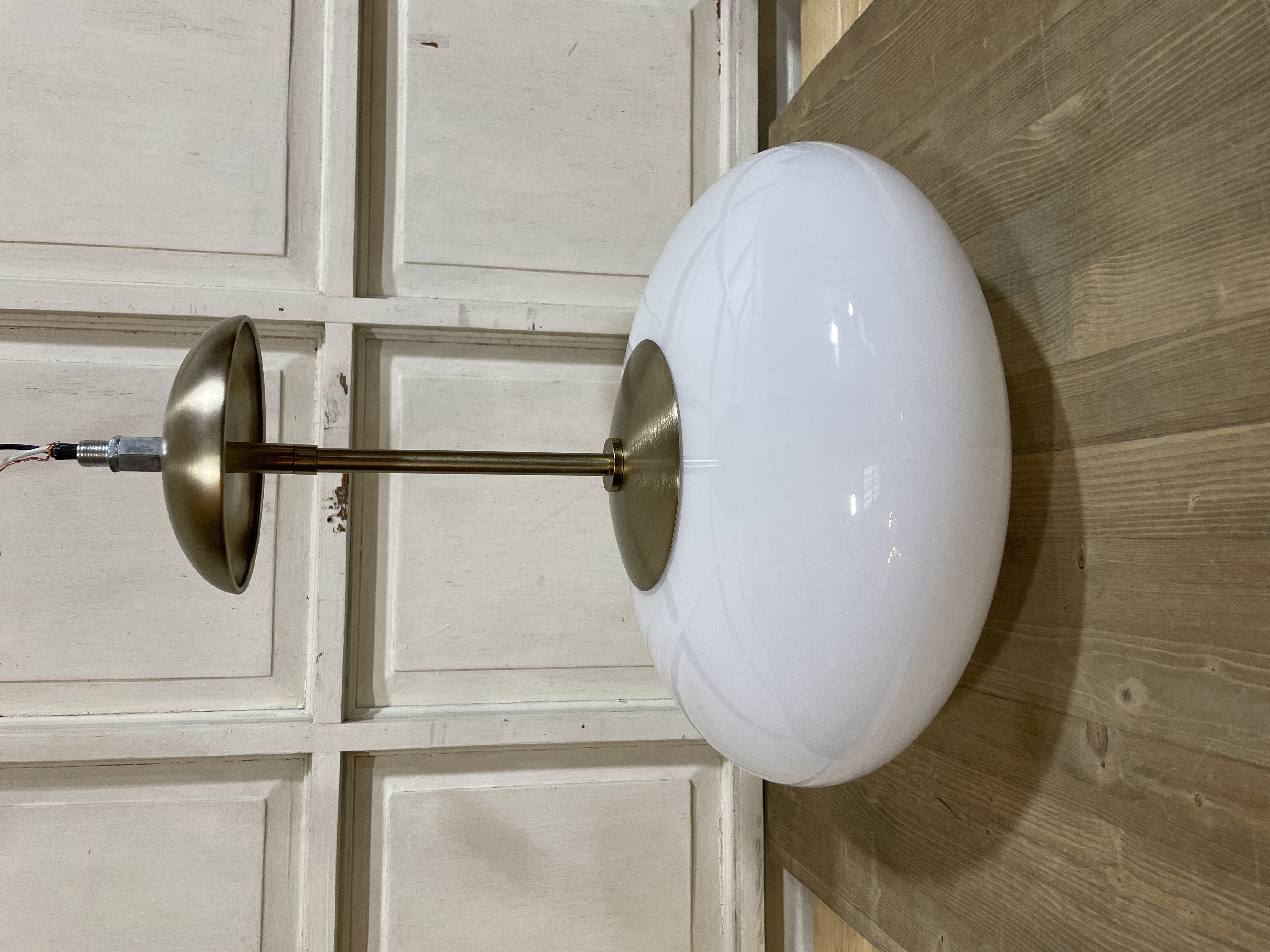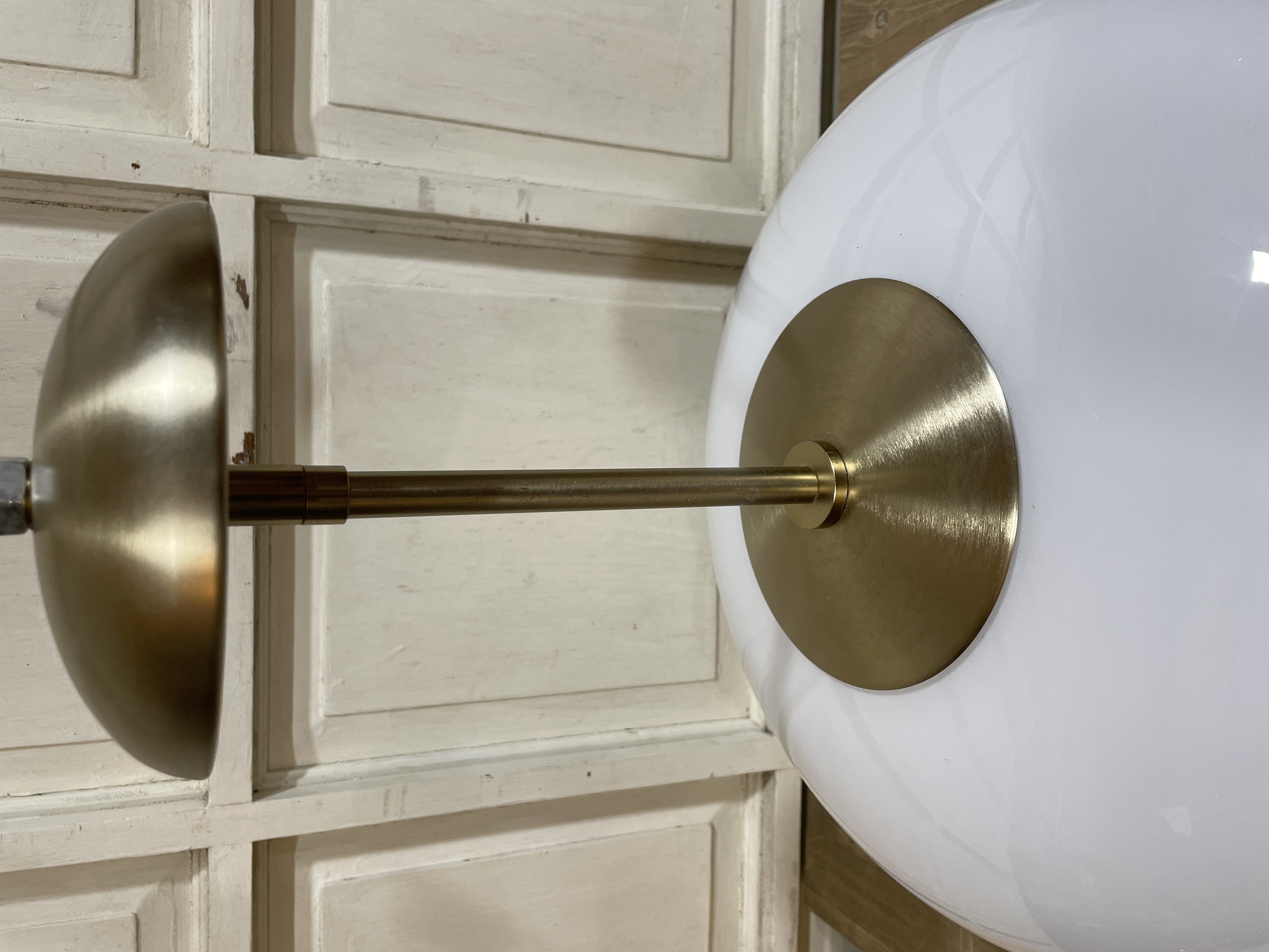Mushroom style white globe with gold hardware. No chips or cracks. In good condition.