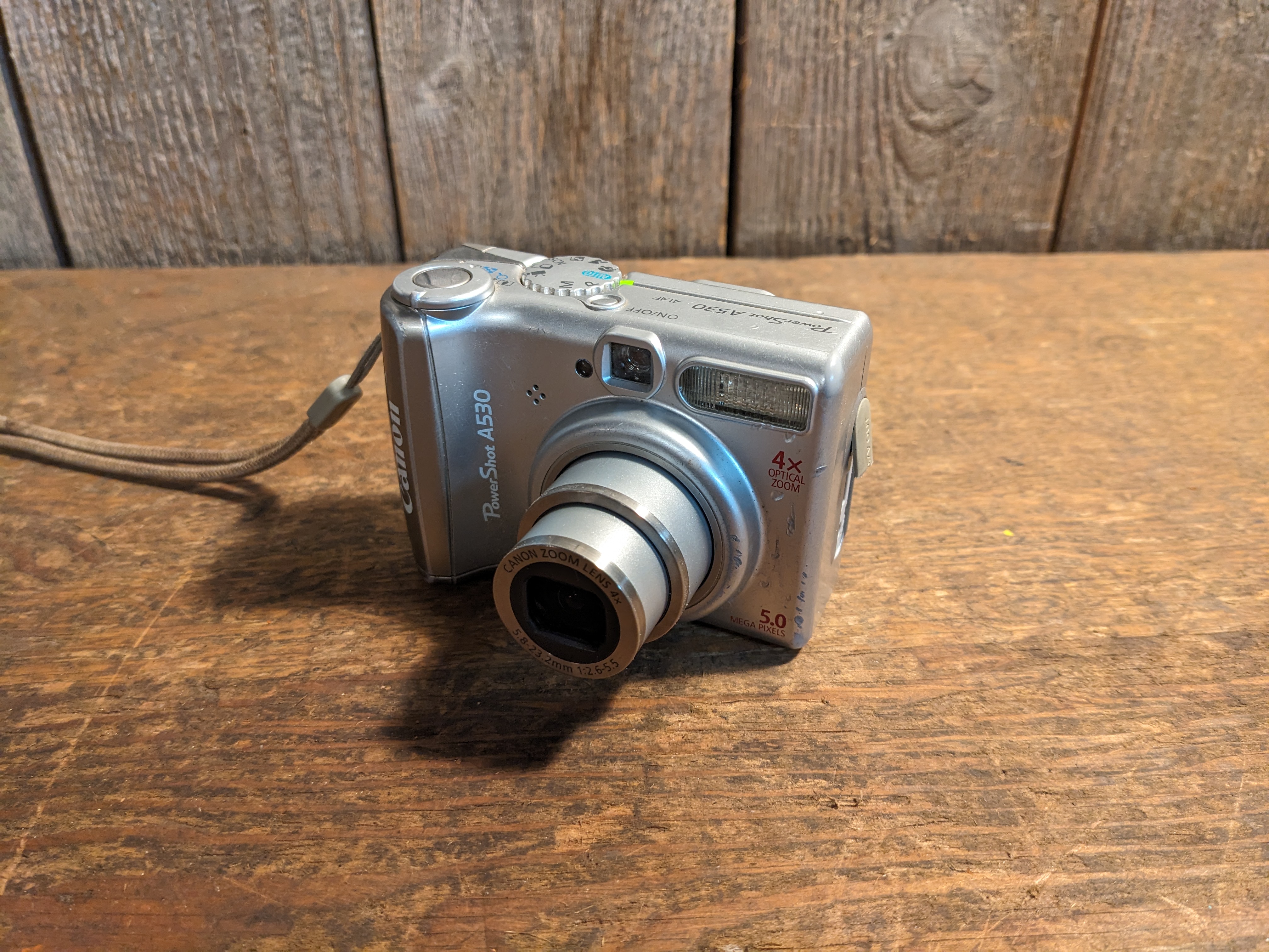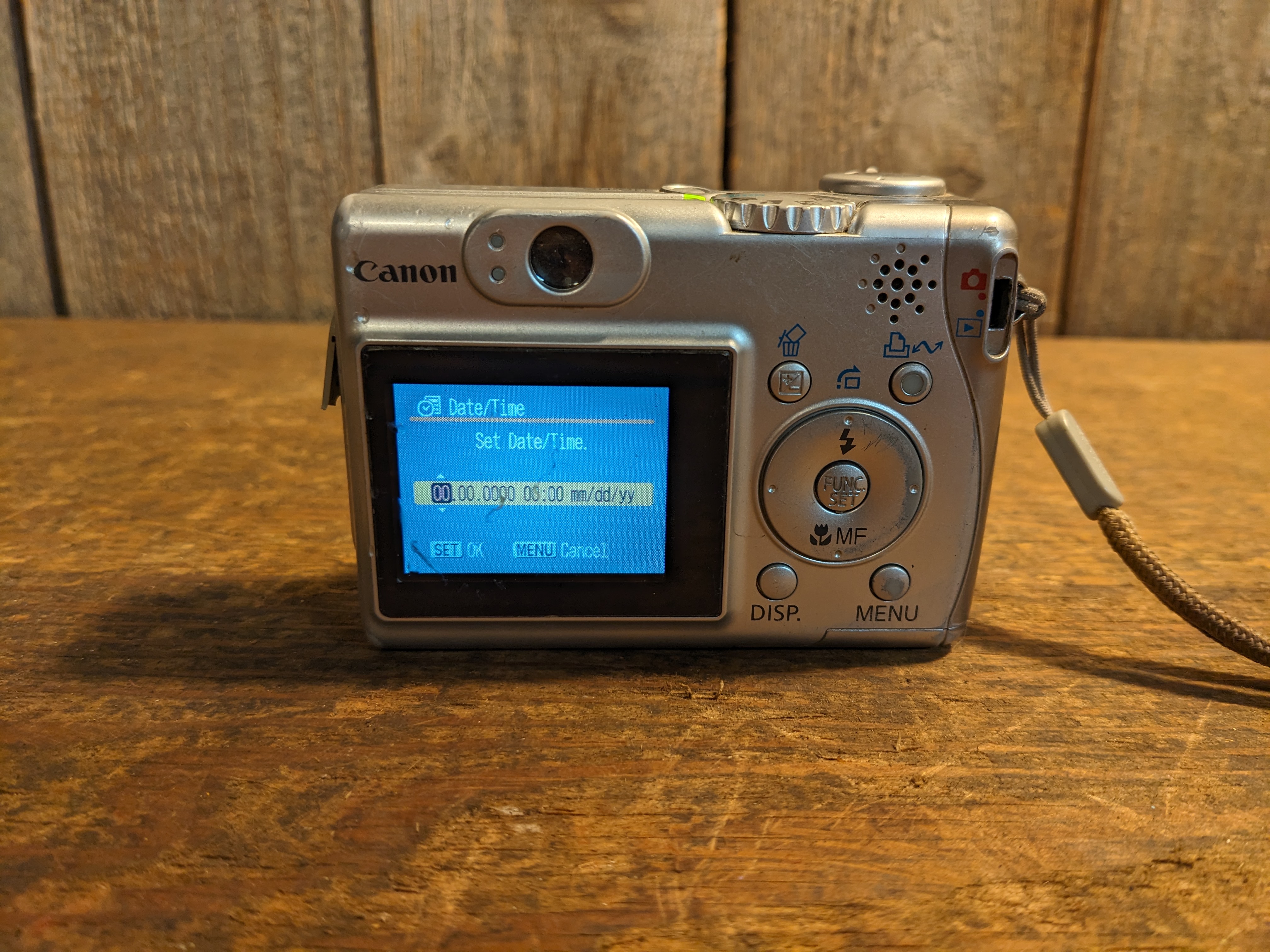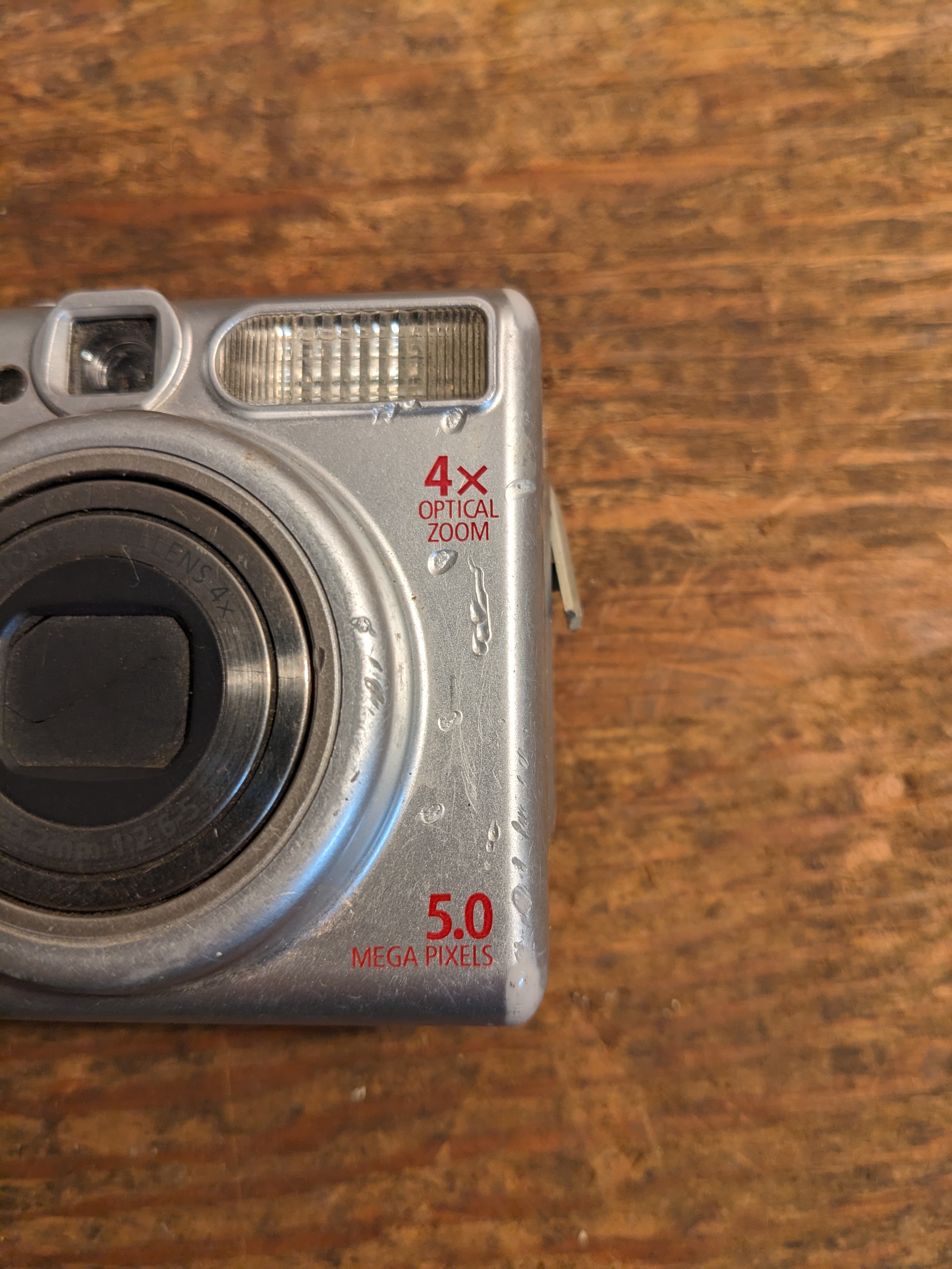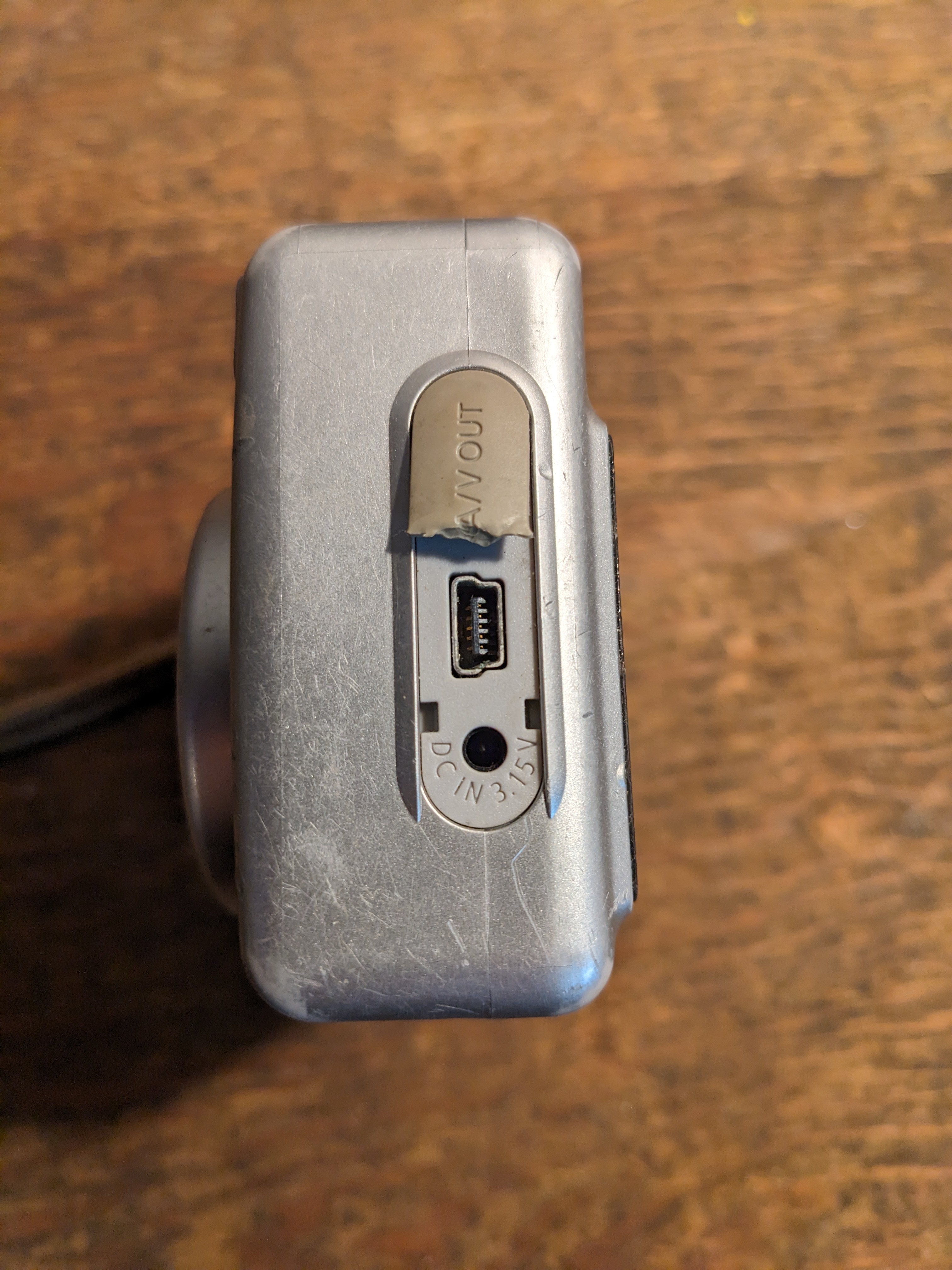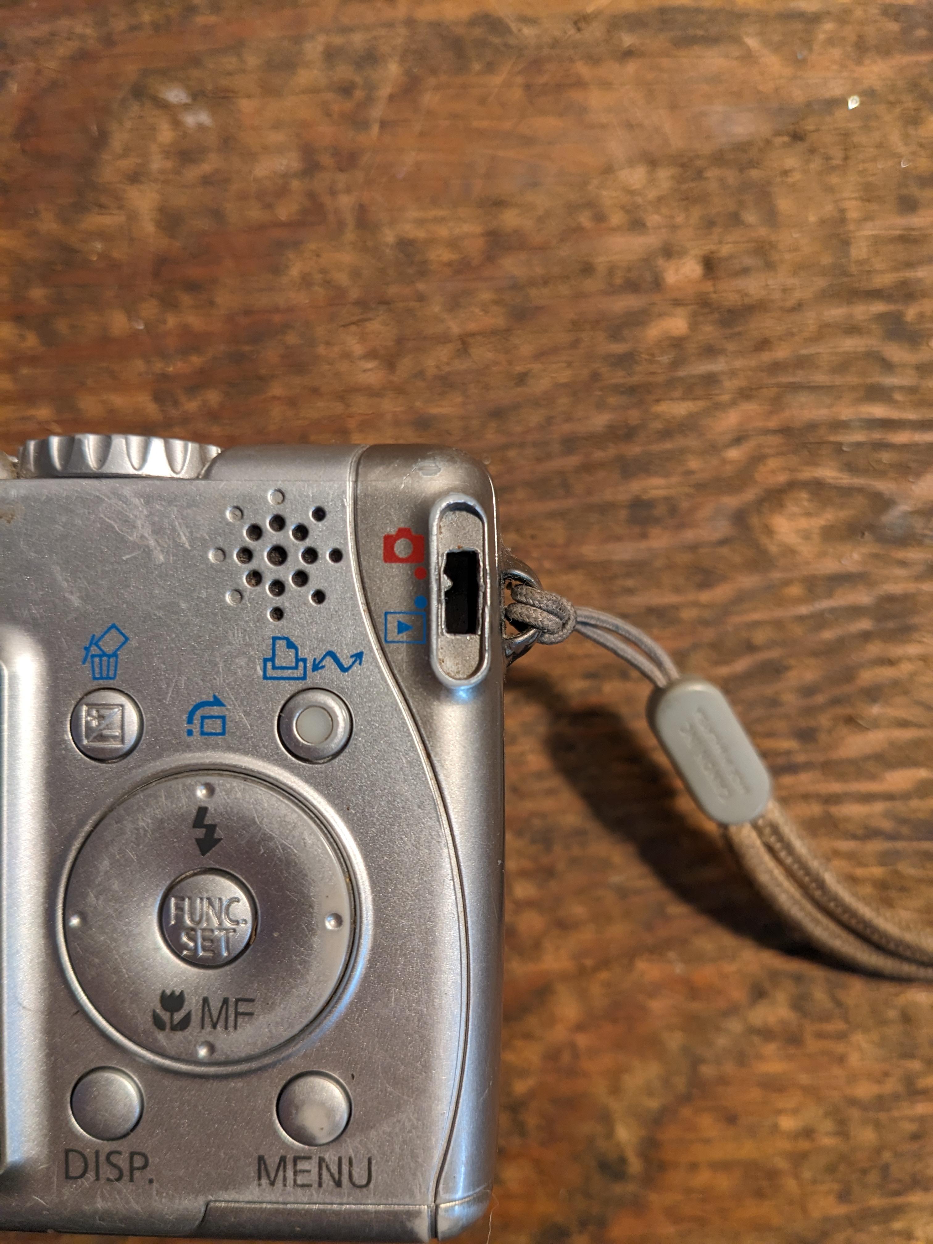 A blast from the Y2K past! This tiny digital camera still works, though the shutter has just a bit of trouble opening and closing by itself, and it needs a memory card. There's some marks in the plastic and the charger cover is broken off, but it's otherwise functional. It measures 3.5 x 2.5 x 1.5 inches.